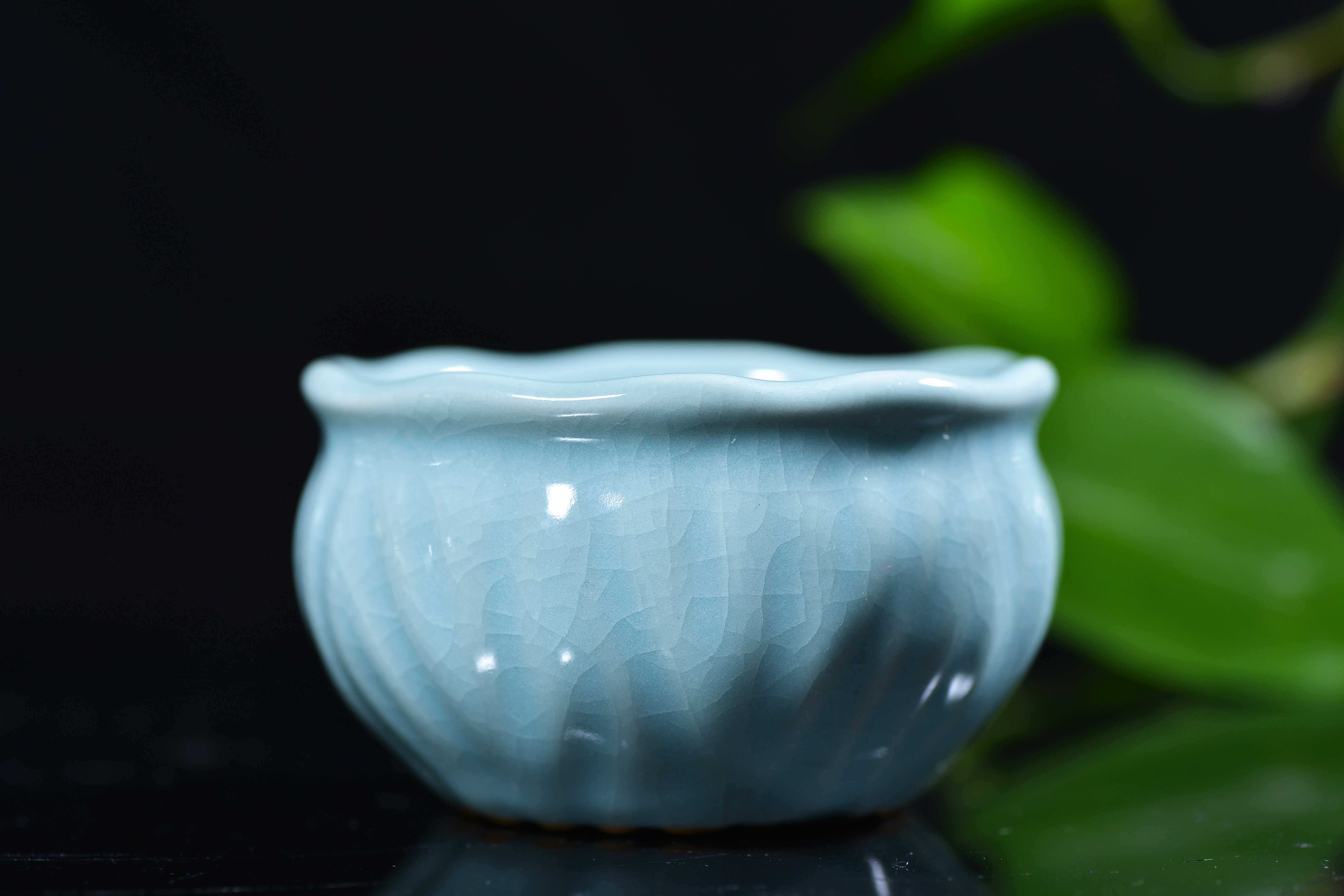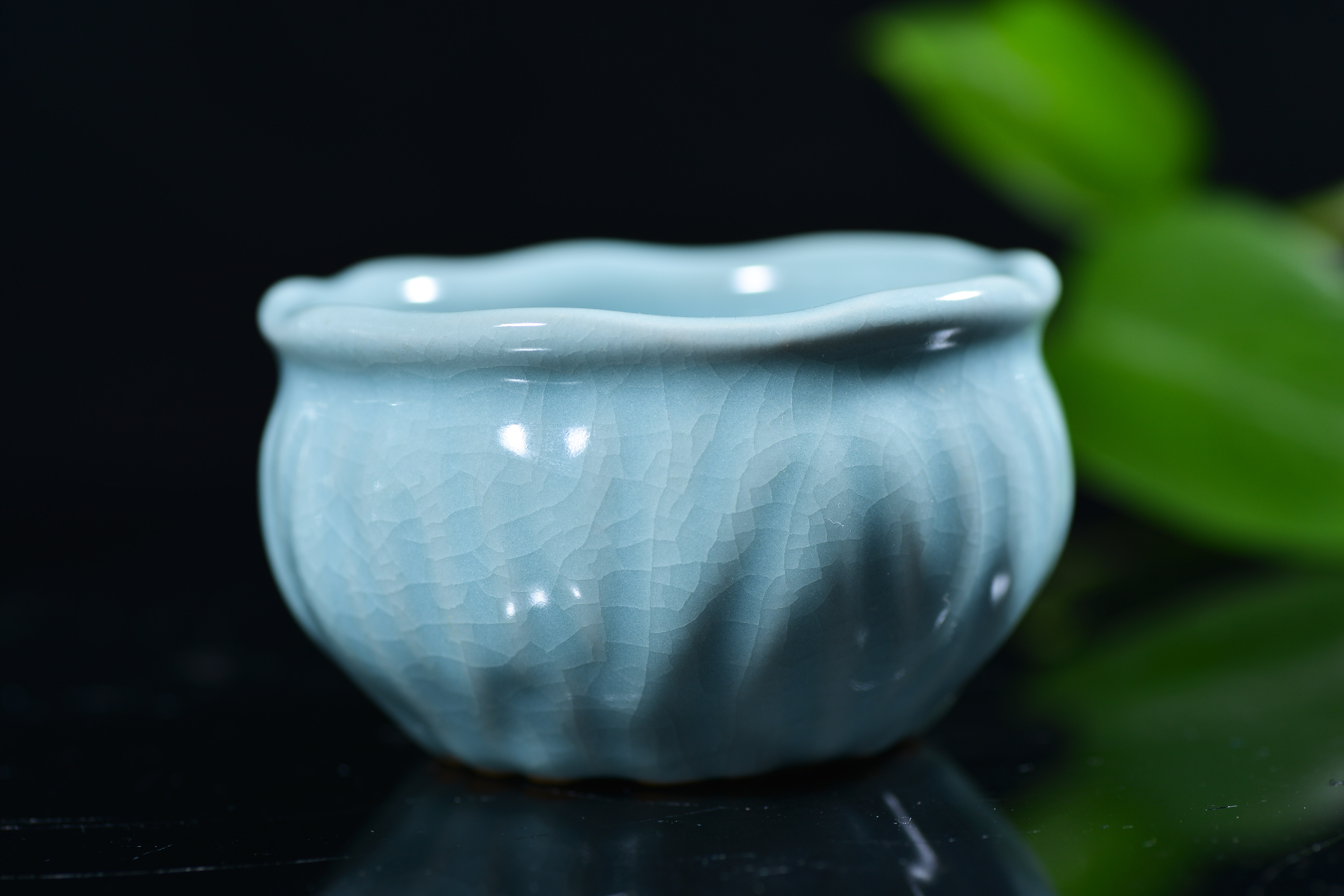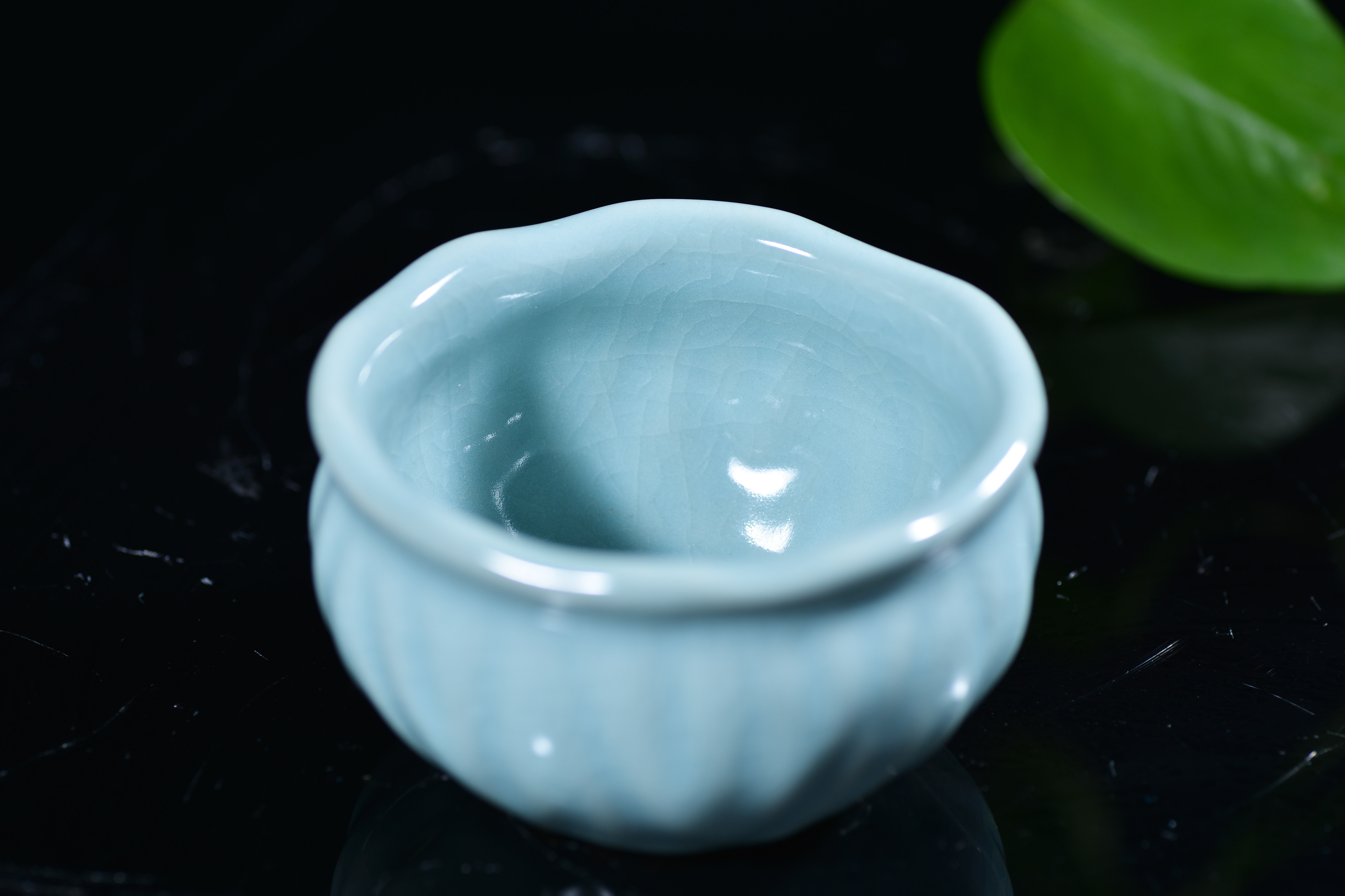 汝瓷 天晴釉主人杯 杨聚斌 直径8厘米 高4厘米 汝瓷—中国五大名瓷之一,创烧于北宋晚期,为宫廷御用瓷器。金灭北宋后,汝瓷也随之消亡。其开窑时间前后只有二十年,由于烧造时间短暂,传世亦不多,在南宋时,汝瓷已经非常稀有。现今存世的汝瓷,一般认为有65件,其中台北故宫博物院23件,北京故宫博物院17件,上海博物馆8件,英国戴维基金会7件,其他散藏于美、日等博物馆和私人收藏约10件。所以才有“家财万贯,不如汝瓷一片”。 作者杨聚斌出生于1962年2月,因为父亲在陵头陶瓷厂工作,因此杨聚斌自幼受父亲耳濡目染,从少