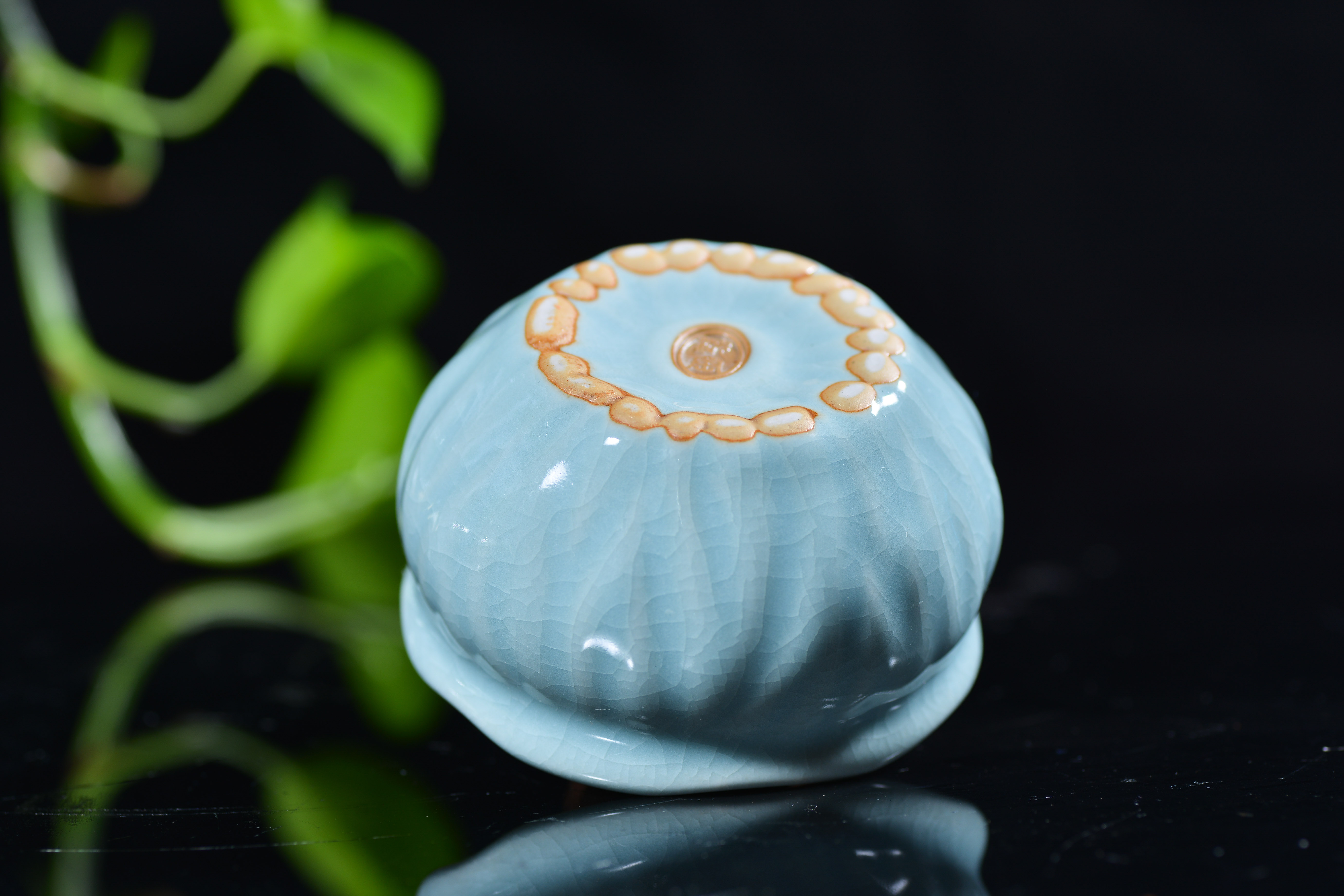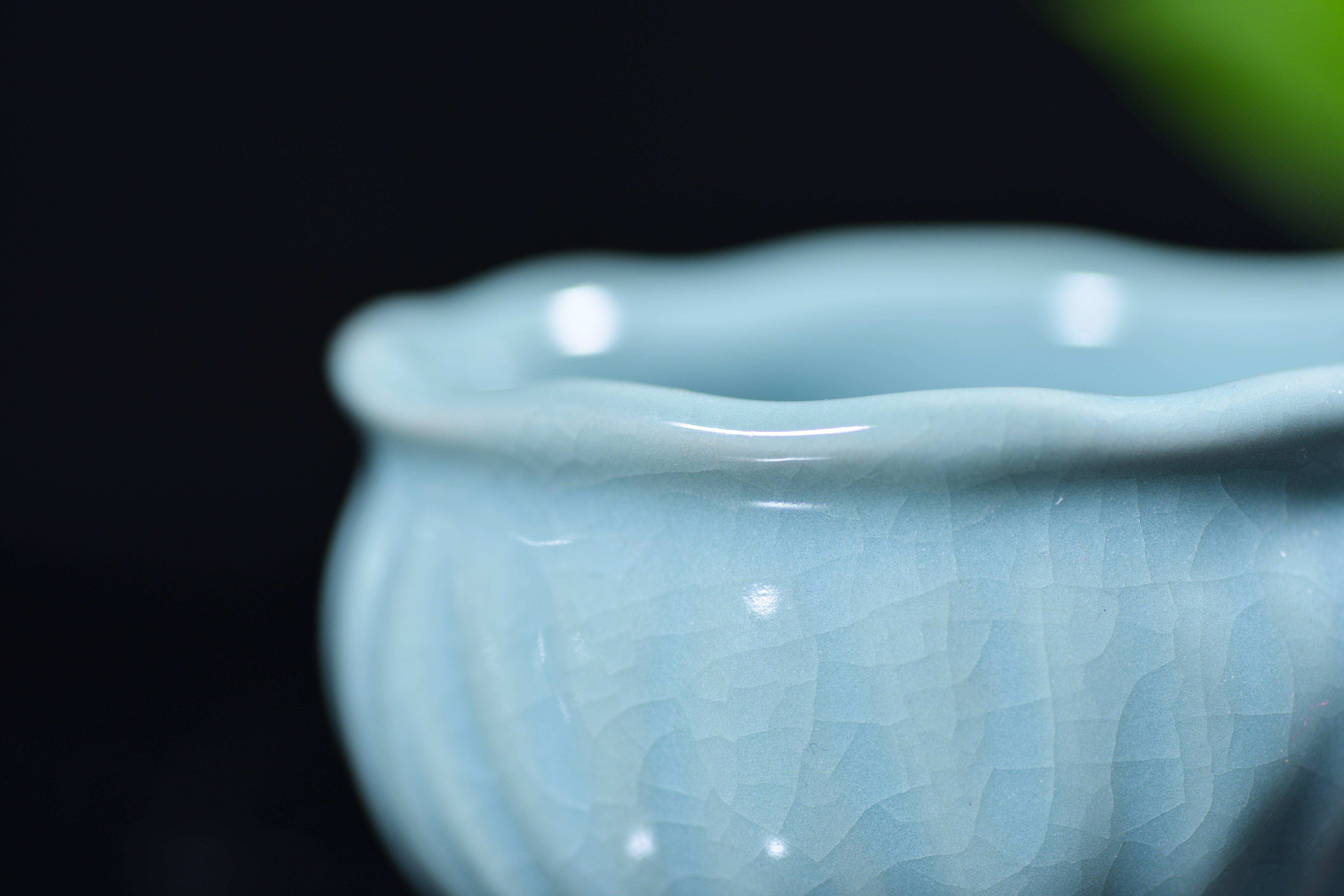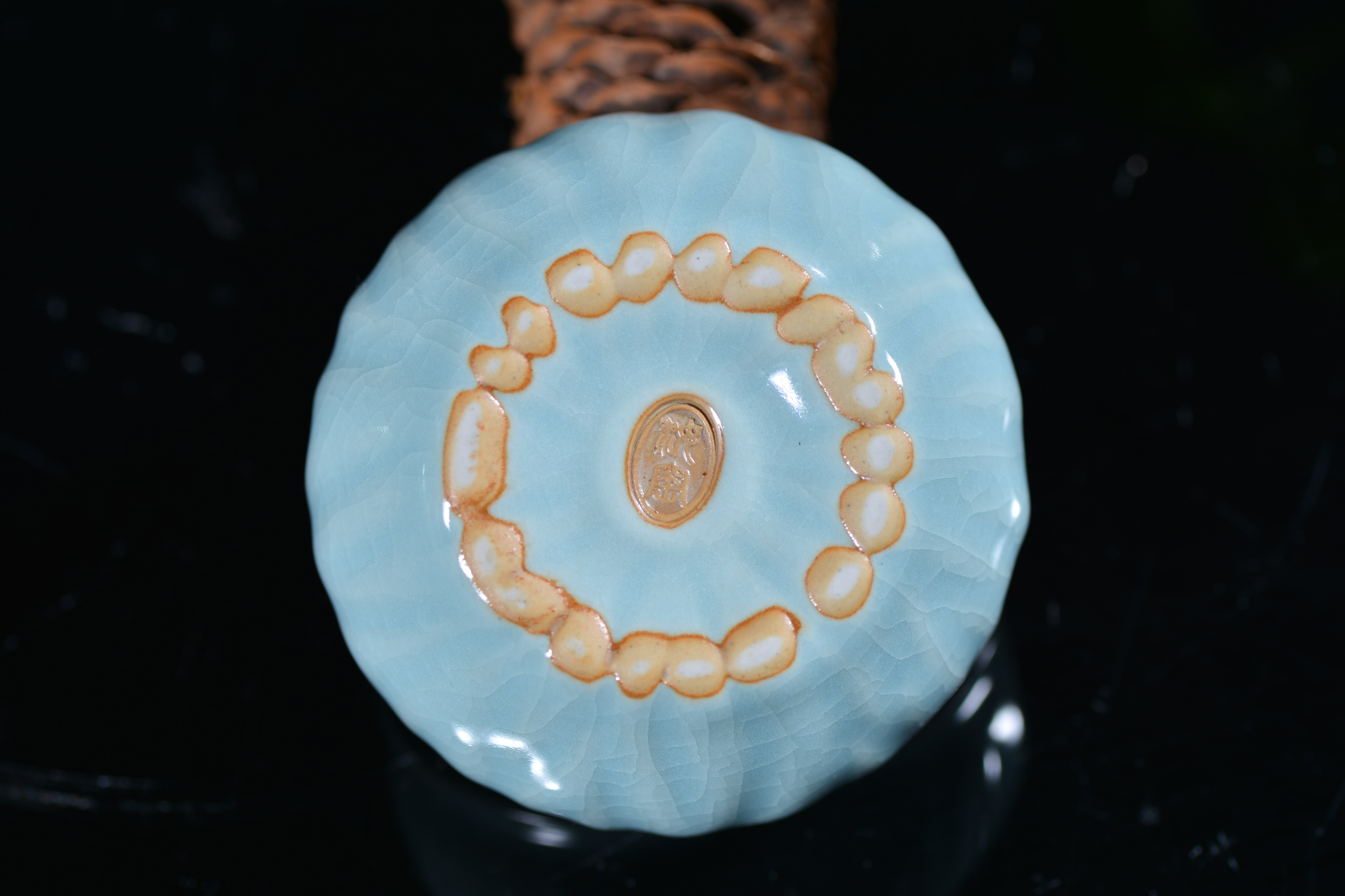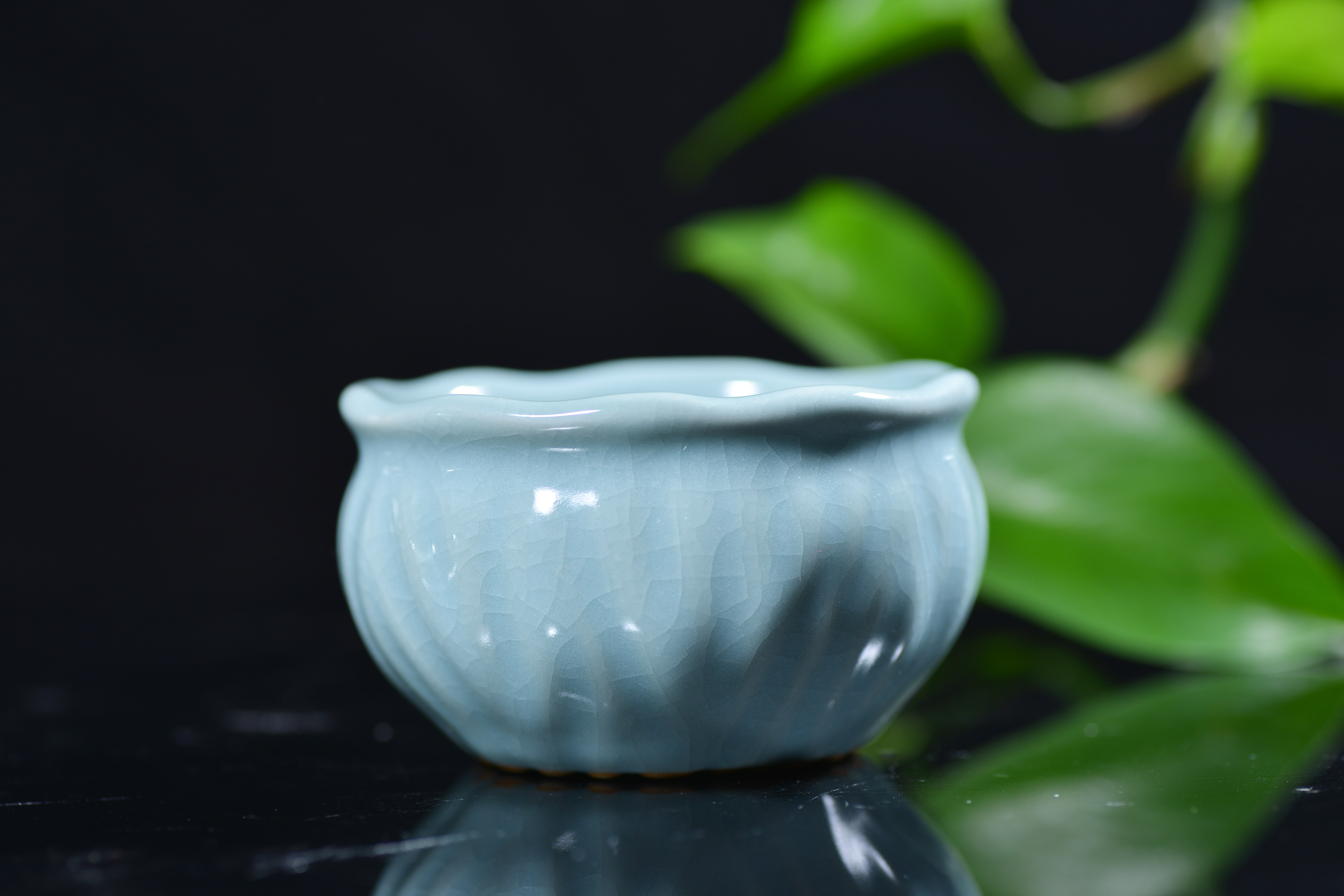汝瓷 天晴釉主人杯 杨聚斌 直径8厘米 高4厘米 汝瓷—中国五大名瓷之一,创烧于北宋晚期,为宫廷御用瓷器。金灭北宋后,汝瓷也随之消亡。其开窑时间前后只有二十年,由于烧造时间短暂,传世亦不多,在南宋时,汝瓷已经非常稀有。现今存世的汝瓷,一般认为有65件,其中台北故宫博物院23件,北京故宫博物院17件,上海博物馆8件,英国戴维基金会7件,其他散藏于美、日等博物馆和私人收藏约10件。所以才有“家财万贯,不如汝瓷一片”。 作者杨聚斌出生于1962年2月,因为父亲在陵头陶瓷厂工作,因此杨聚斌自幼受父亲耳濡目染,从少