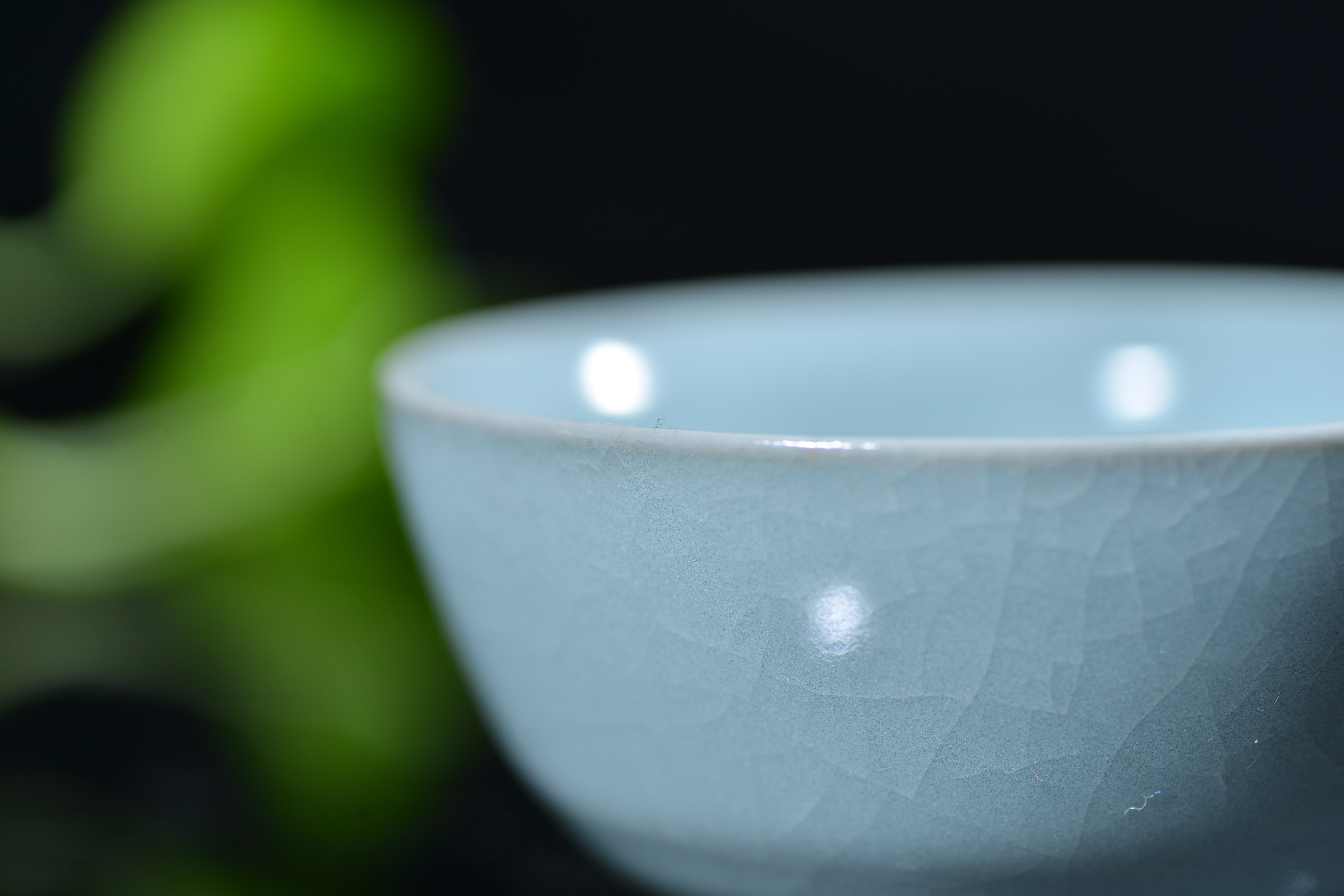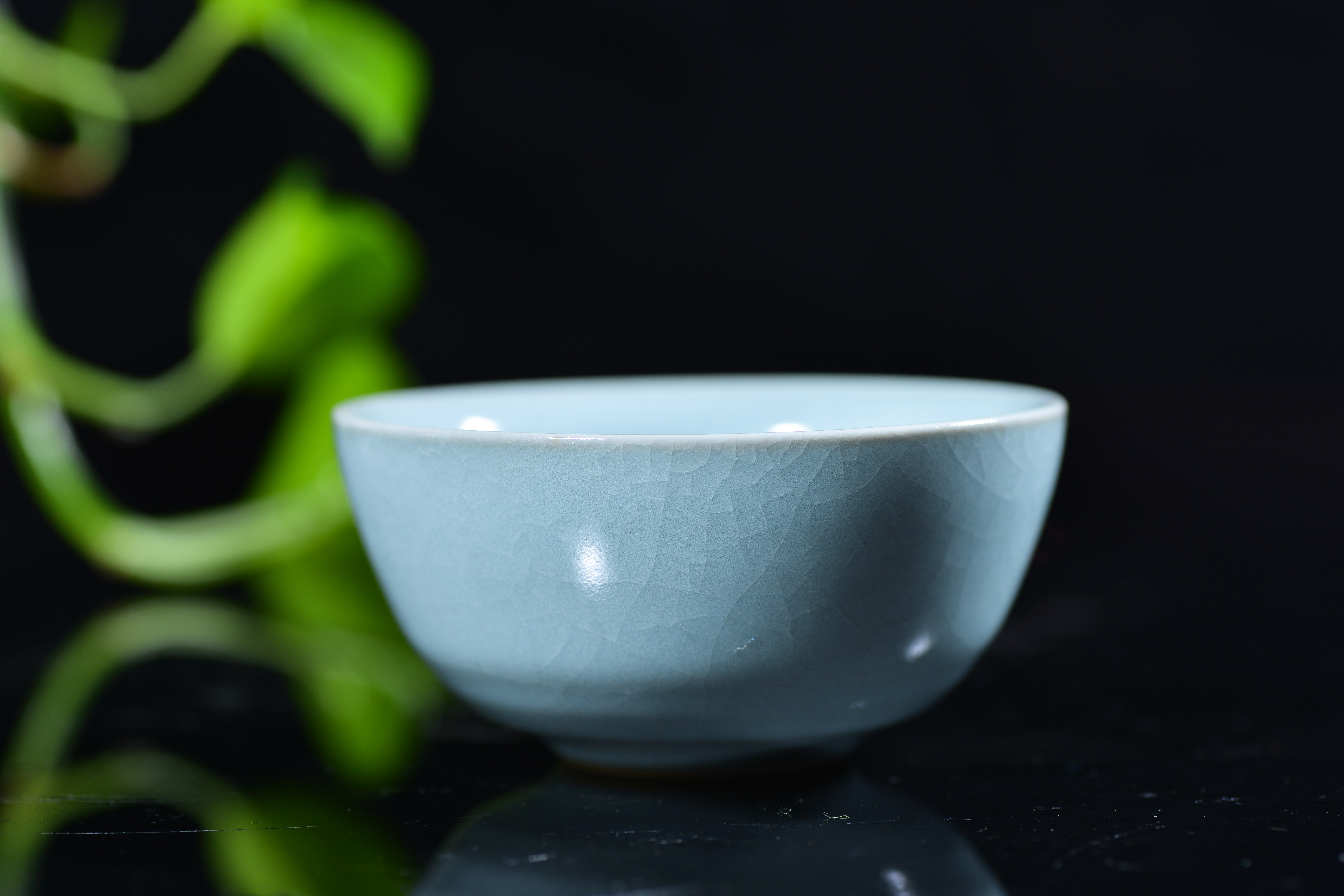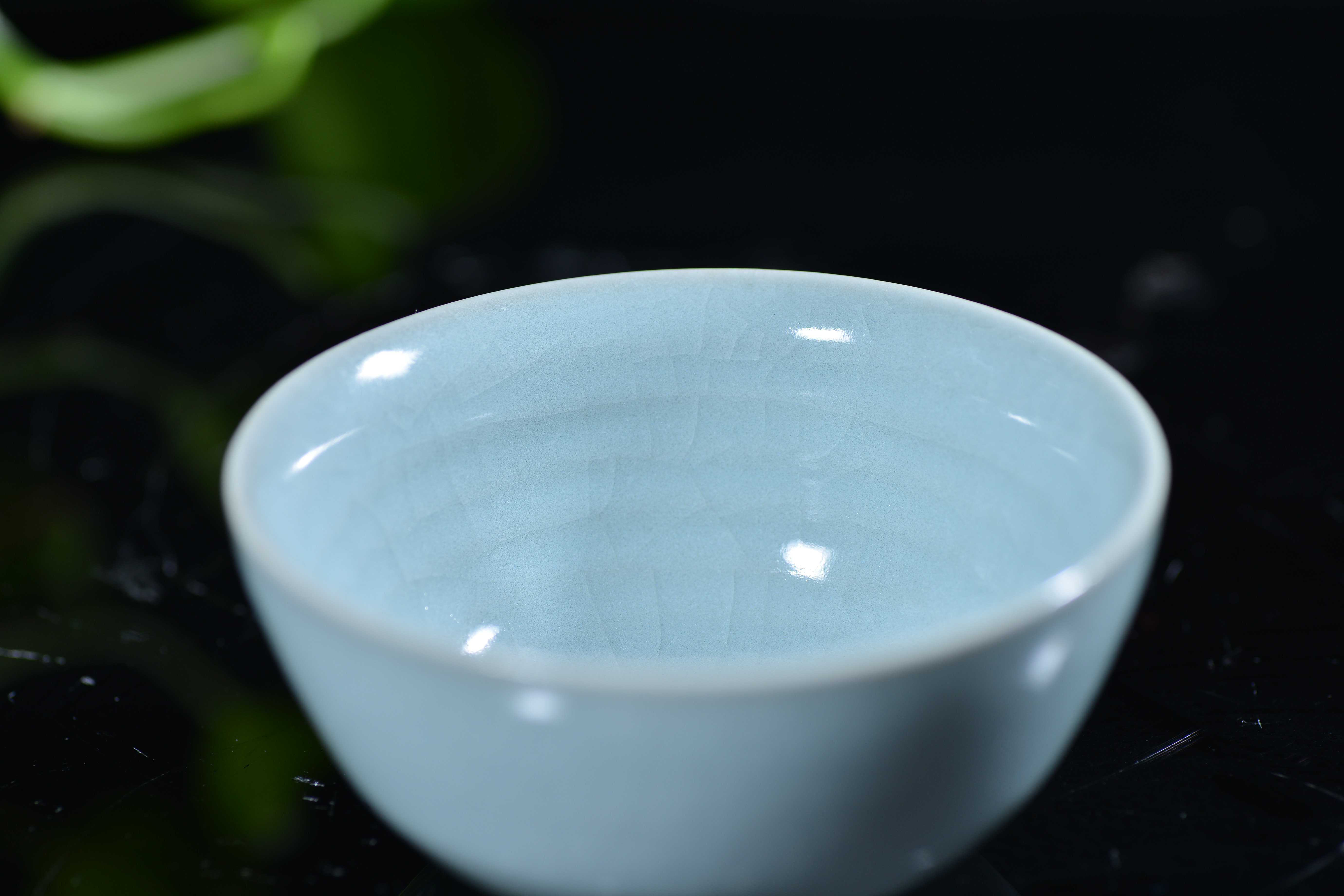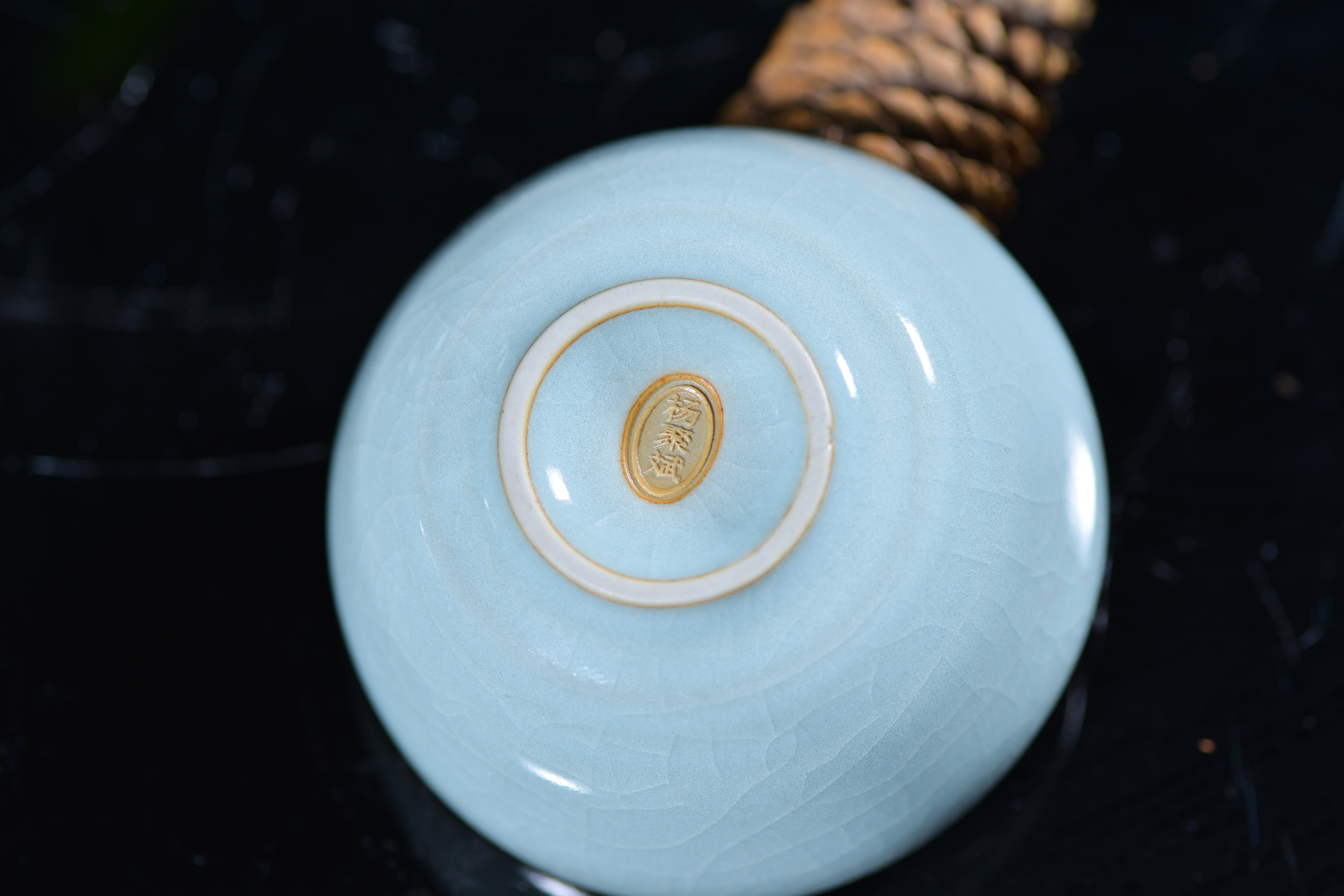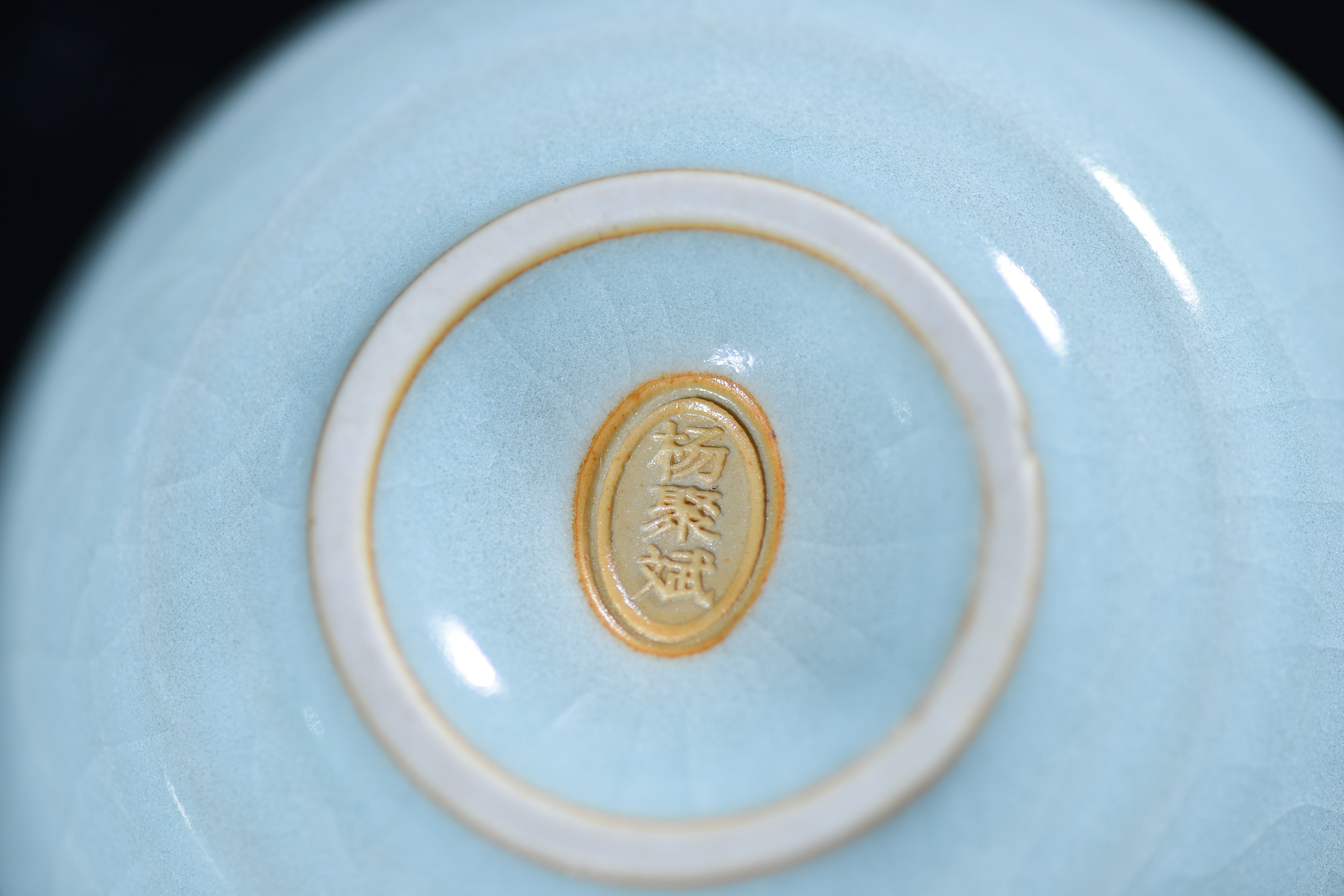 汝瓷 玄纹主人杯 杨聚斌 尺寸9*4.5厘米 汝瓷—中国五大名瓷之一,创烧于北宋晚期,为宫廷御用瓷器。金灭北宋后,汝瓷也随之消亡。其开窑时间前后只有二十年,由于烧造时间短暂,传世亦不多,在南宋时,汝瓷已经非常稀有。现今存世的汝瓷,一般认为有65件,其中台北故宫博物院23件,北京故宫博物院17件,上海博物馆8件,英国戴维基金会7件,其他散藏于美、日等博物馆和私人收藏约10件。所以才有“家财万贯,不如汝瓷一片”。 作者杨聚斌出生于1962年2月,因为父亲在陵头陶瓷厂工作,因此杨聚斌自幼受父亲耳濡目染,从少年时