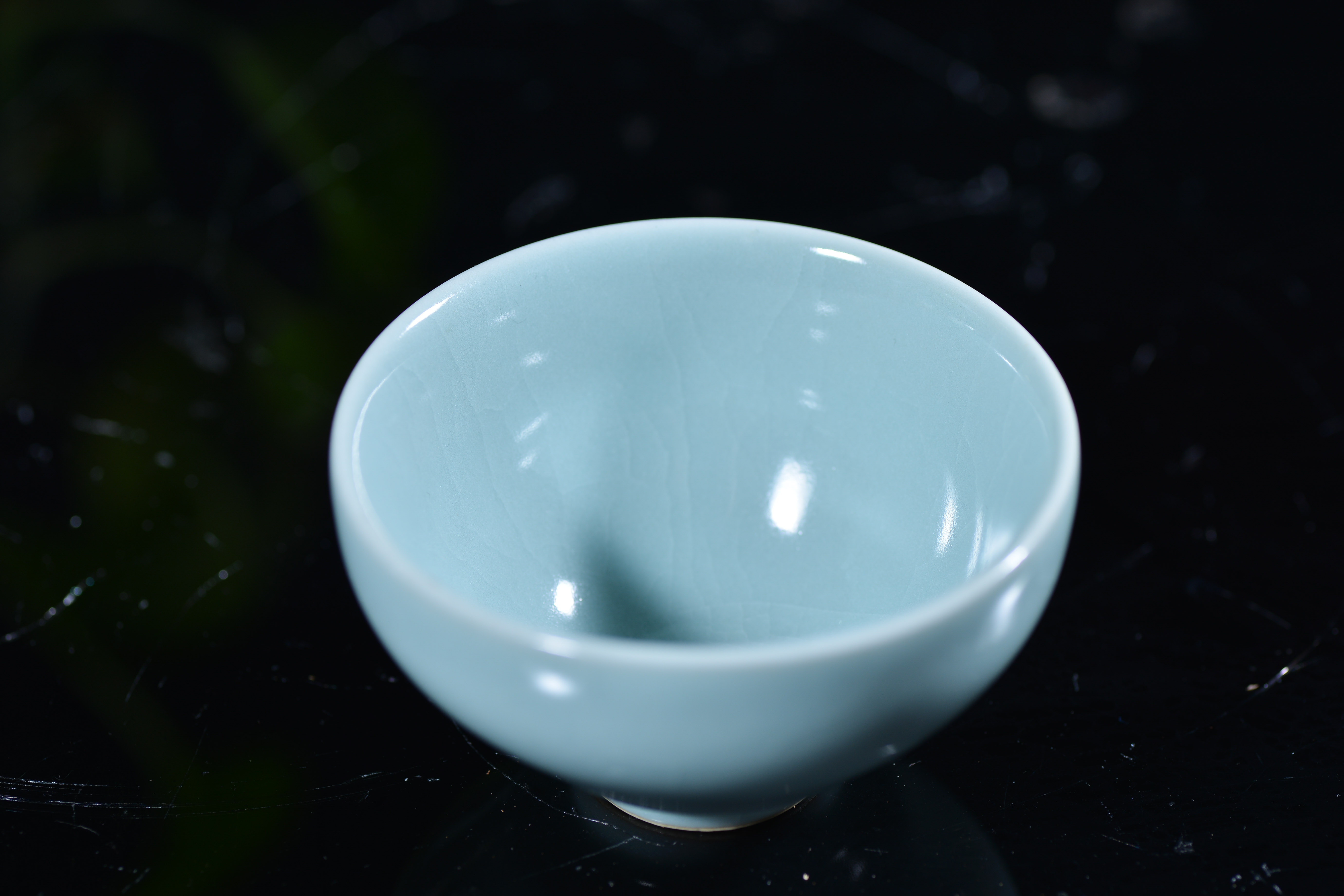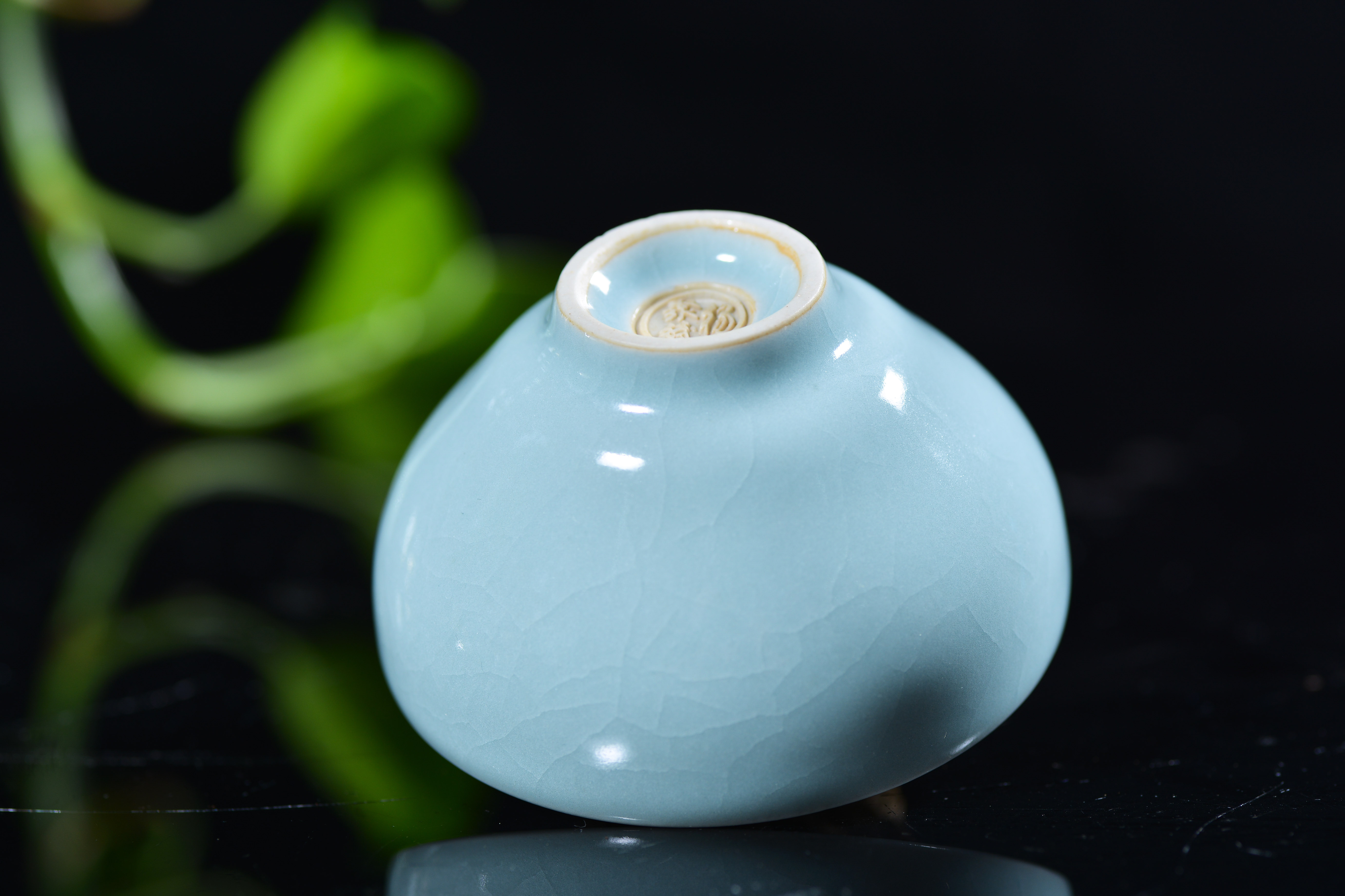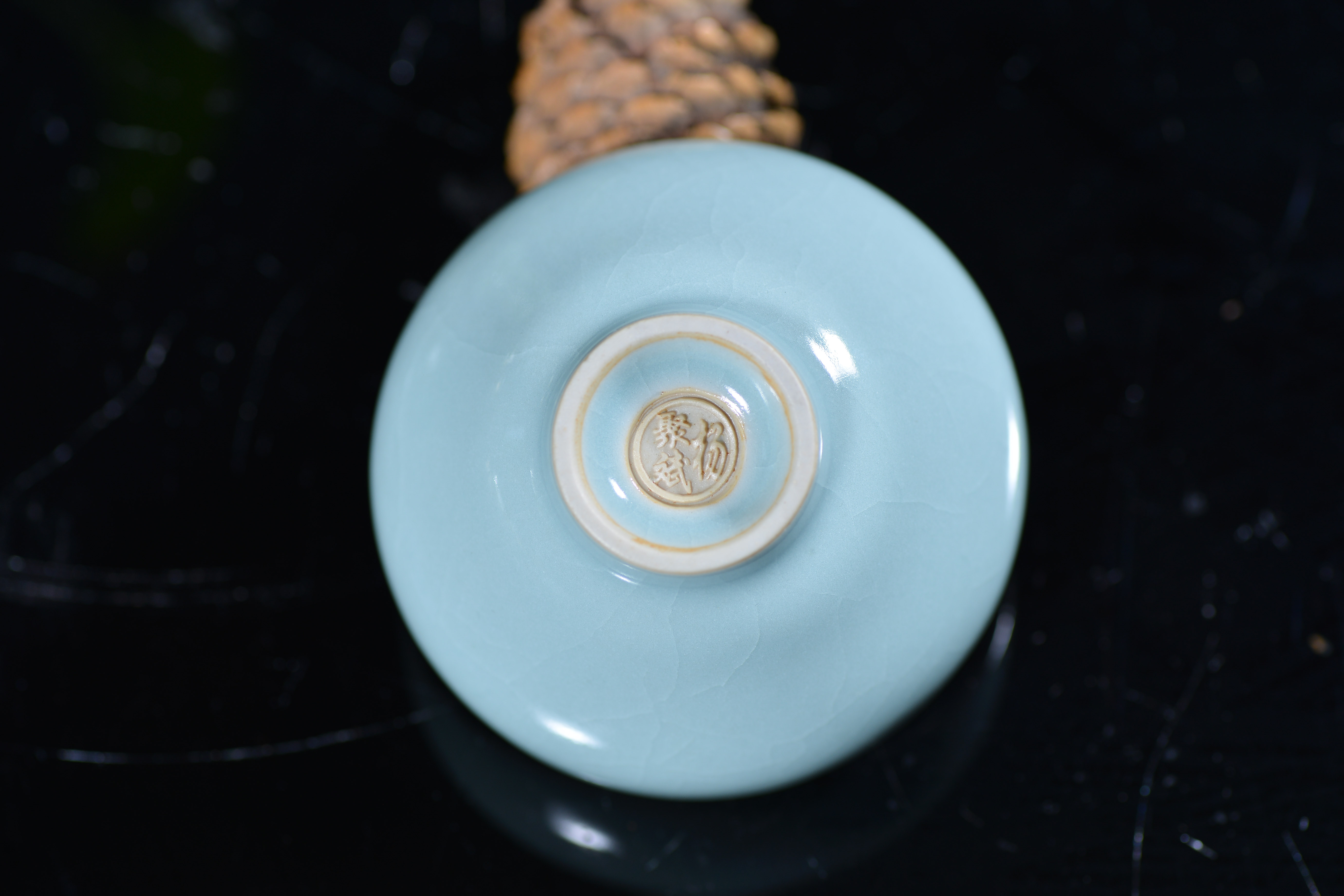 汝瓷 灵秀主人杯 杨聚斌 尺寸7.8*4.2厘米,汝瓷—中国五大名瓷之一,创烧于北宋晚期,为宫廷御用瓷器。金灭北宋后,汝瓷也随之消亡。其开窑时间前后只有二十年,由于烧造时间短暂,传世亦不多,在南宋时,汝瓷已经非常稀有。现今存世的汝瓷,一般认为有65件,其中台北故宫博物院23件,北京故宫博物院17件,上海博物馆8件,英国戴维基金会7件,其他散藏于美、日等博物馆和私人收藏约10件。所以才有“家财万贯,不如汝瓷一片”。 作者杨聚斌出生于1962年2月,因为父亲在陵头陶瓷厂工作,因此杨聚斌自幼受父亲耳濡目染,从少