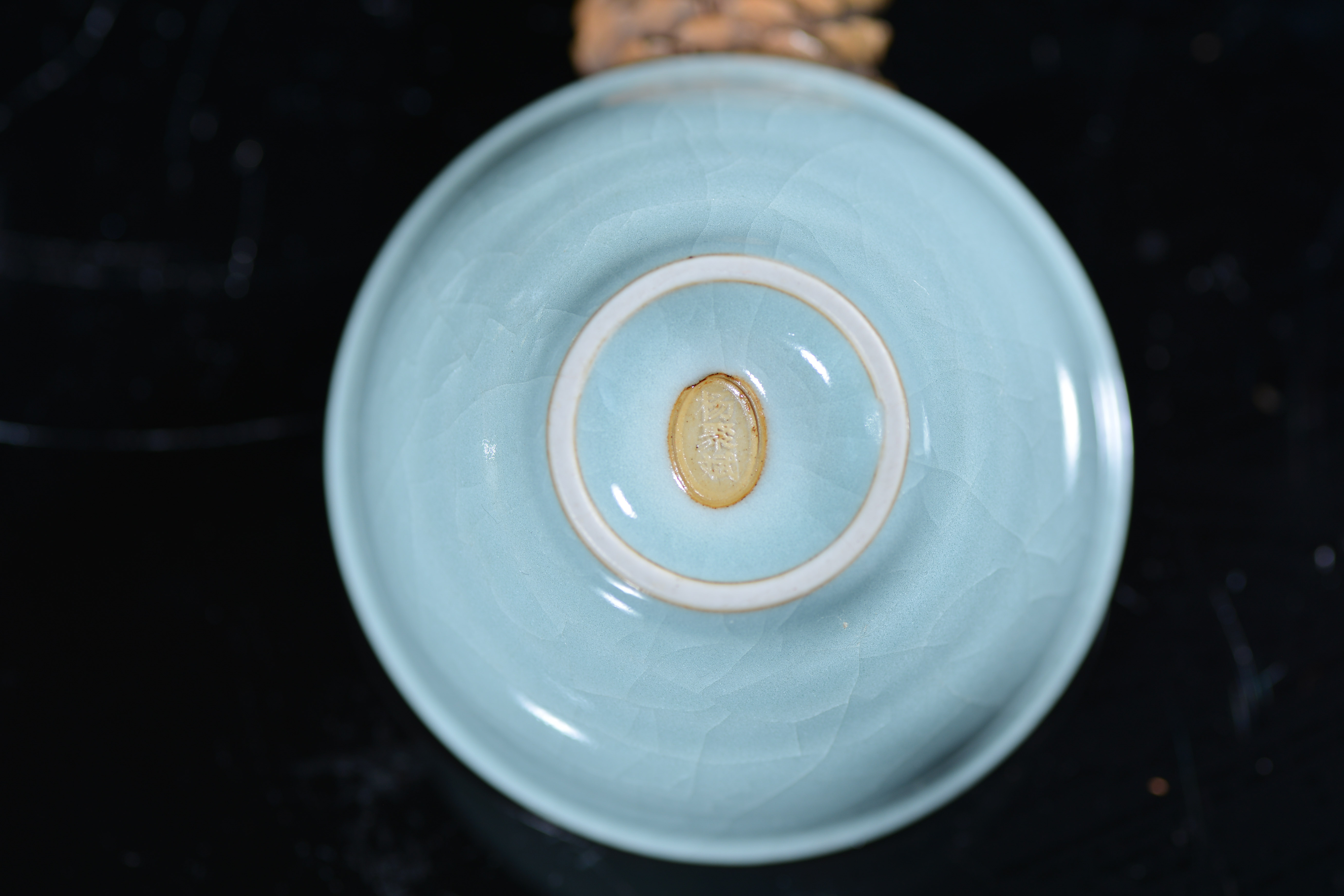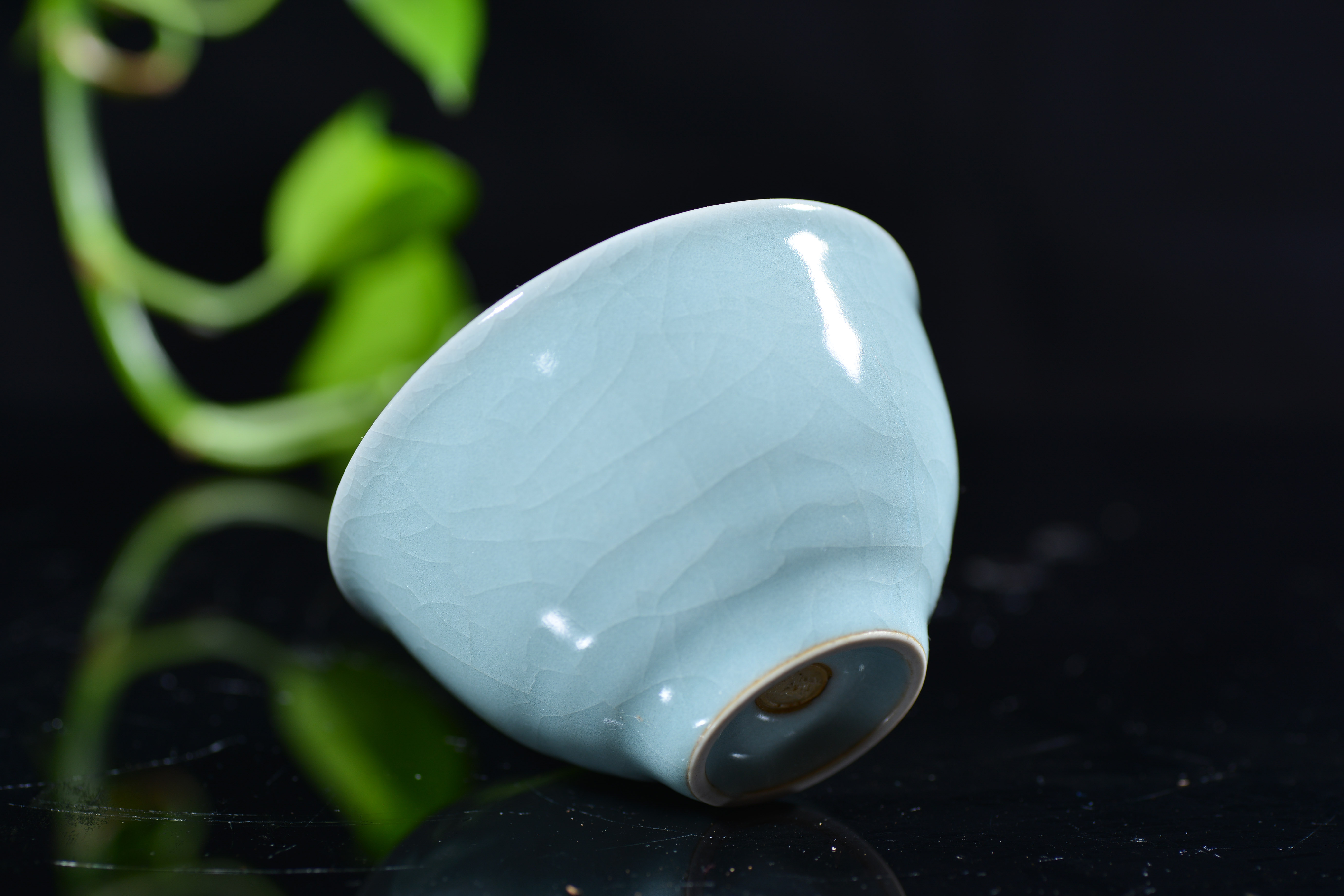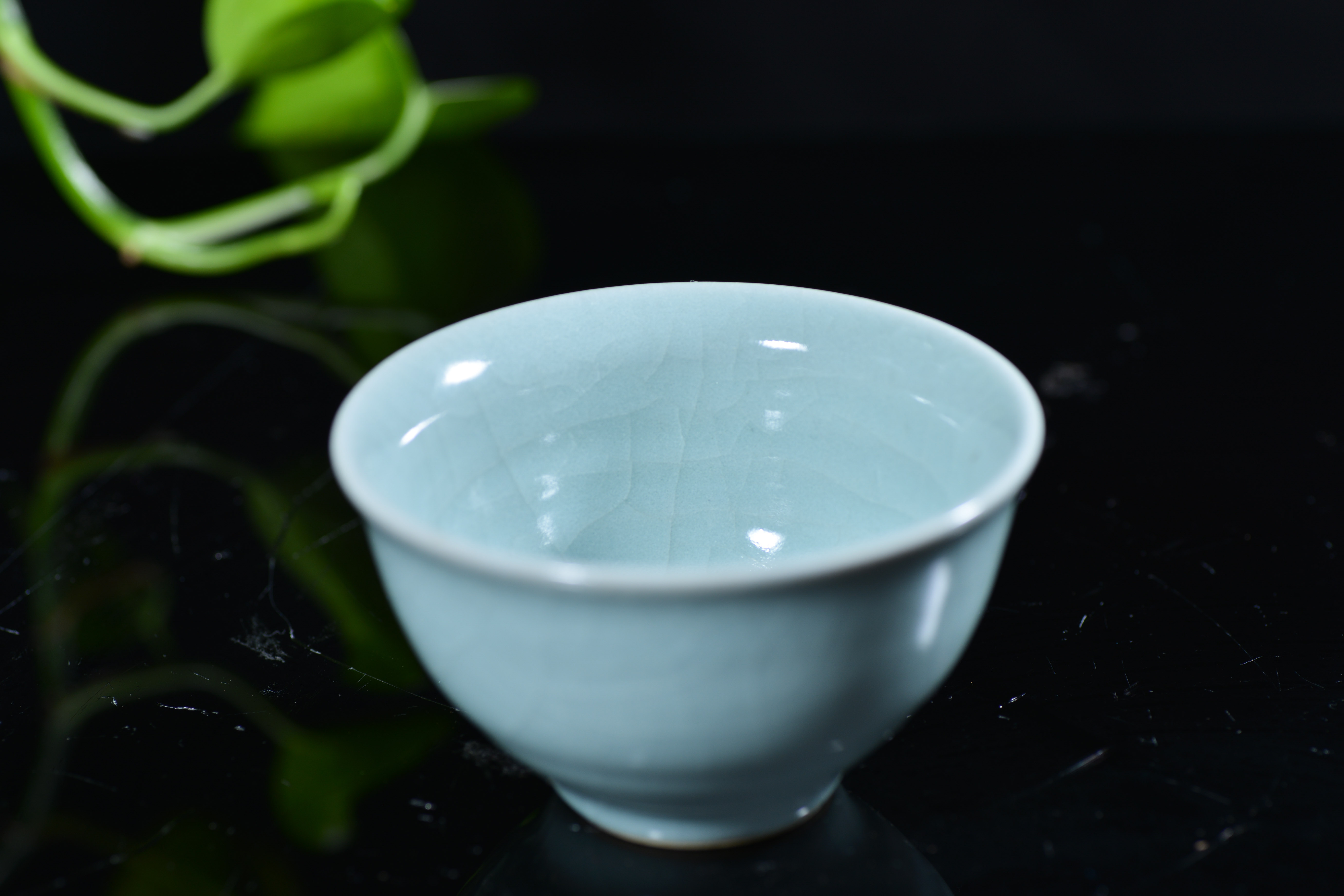 汝瓷 玄纹主人杯 杨聚斌 9*5.5厘,汝瓷—中国五大名瓷之一,创烧于北宋晚期,为宫廷御用瓷器。金灭北宋后,汝瓷也随之消亡。其开窑时间前后只有二十年,由于烧造时间短暂,传世亦不多,在南宋时,汝瓷已经非常稀有。现今存世的汝瓷,一般认为有65件,其中台北故宫博物院23件,北京故宫博物院17件,上海博物馆8件,英国戴维基金会7件,其他散藏于美、日等博物馆和私人收藏约10件。所以才有“家财万贯,不如汝瓷一片”。 作者杨聚斌出生于1962年2月,因为父亲在陵头陶瓷厂工作,因此杨聚斌自幼受父亲耳濡目染,从少年时代就形