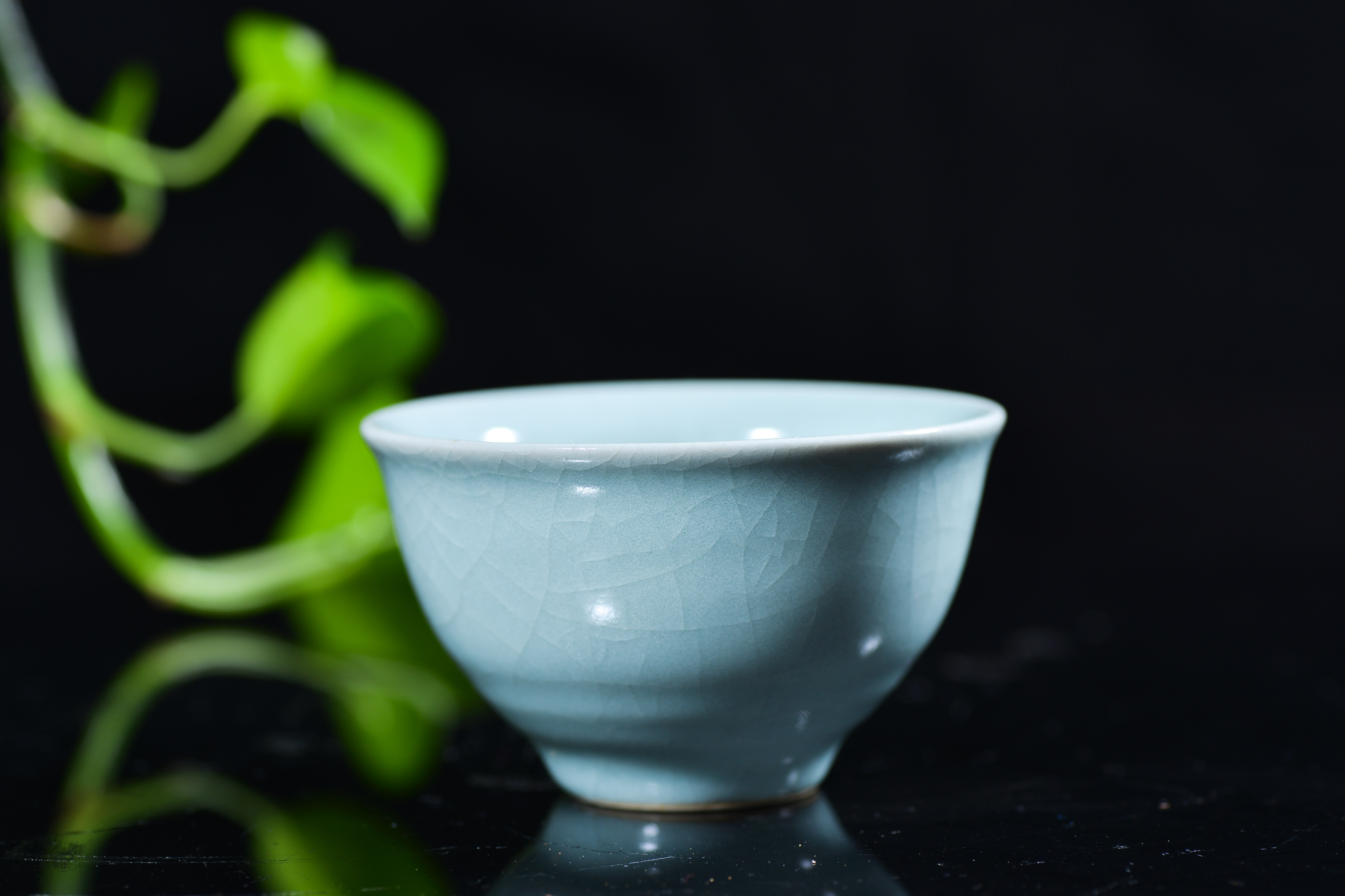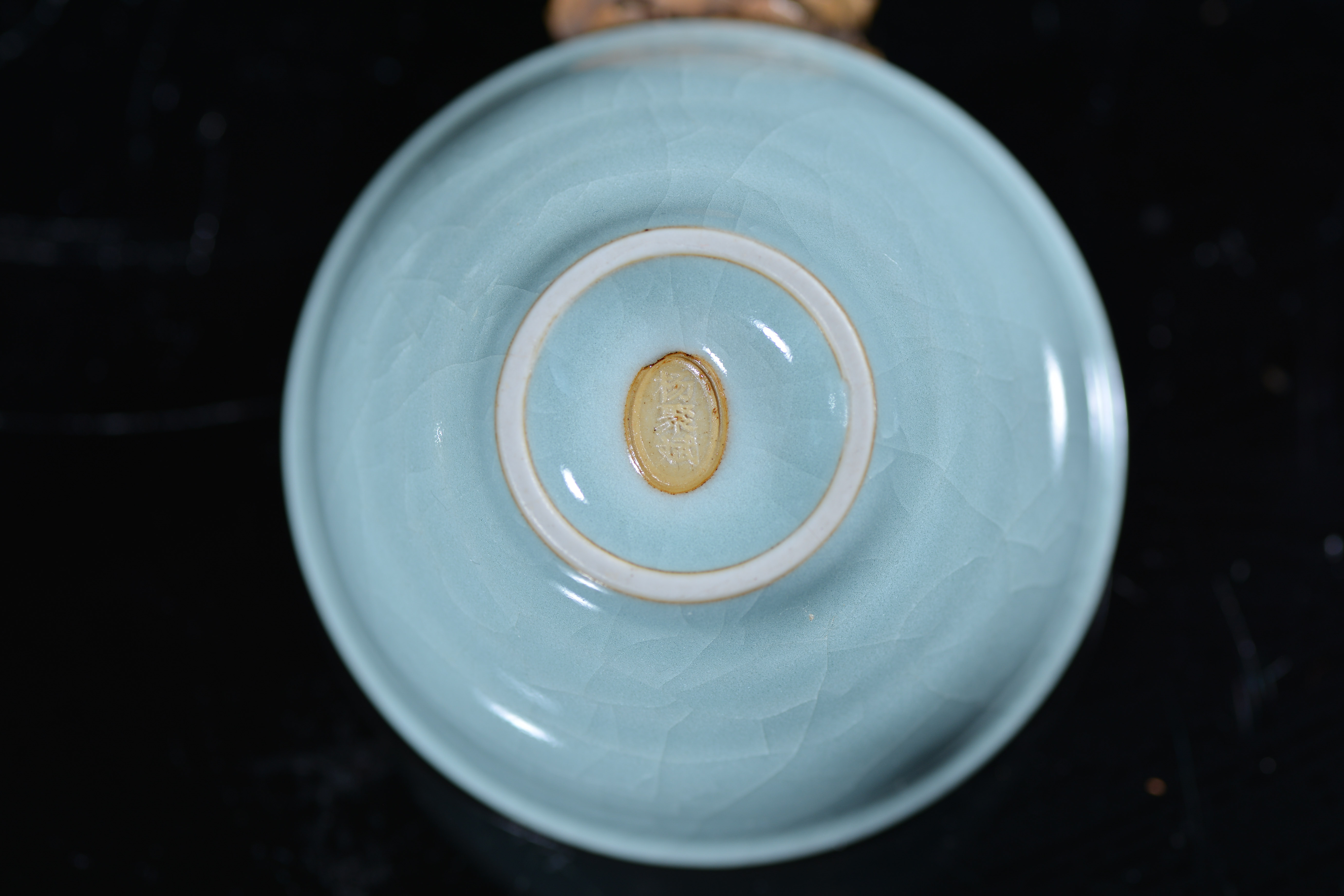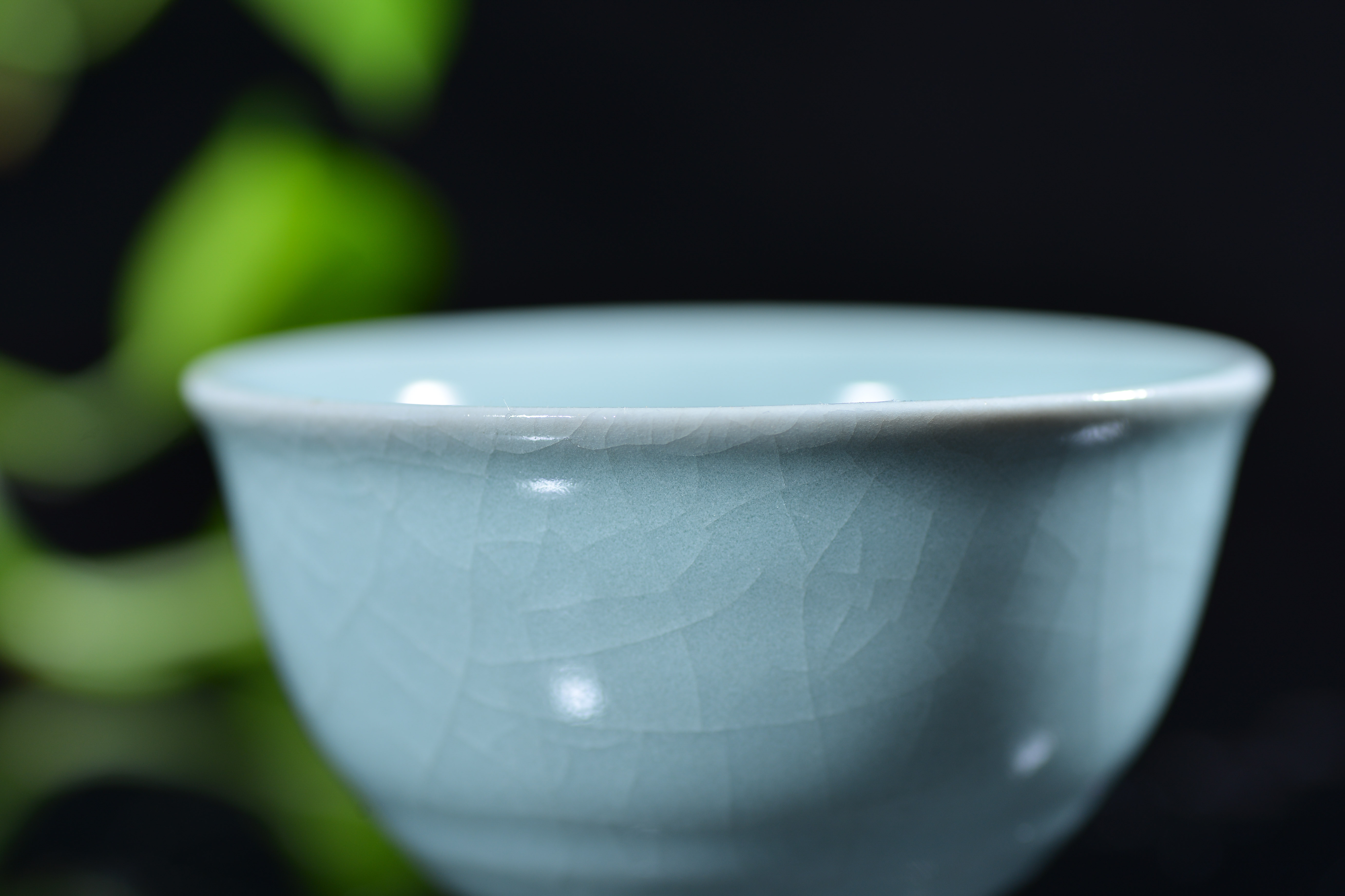 汝瓷 玄纹主人杯 杨聚斌 9*5.5厘,汝瓷—中国五大名瓷之一,创烧于北宋晚期,为宫廷御用瓷器。金灭北宋后,汝瓷也随之消亡。其开窑时间前后只有二十年,由于烧造时间短暂,传世亦不多,在南宋时,汝瓷已经非常稀有。现今存世的汝瓷,一般认为有65件,其中台北故宫博物院23件,北京故宫博物院17件,上海博物馆8件,英国戴维基金会7件,其他散藏于美、日等博物馆和私人收藏约10件。所以才有“家财万贯,不如汝瓷一片”。 作者杨聚斌出生于1962年2月,因为父亲在陵头陶瓷厂工作,因此杨聚斌自幼受父亲耳濡目染,从少年时代就形