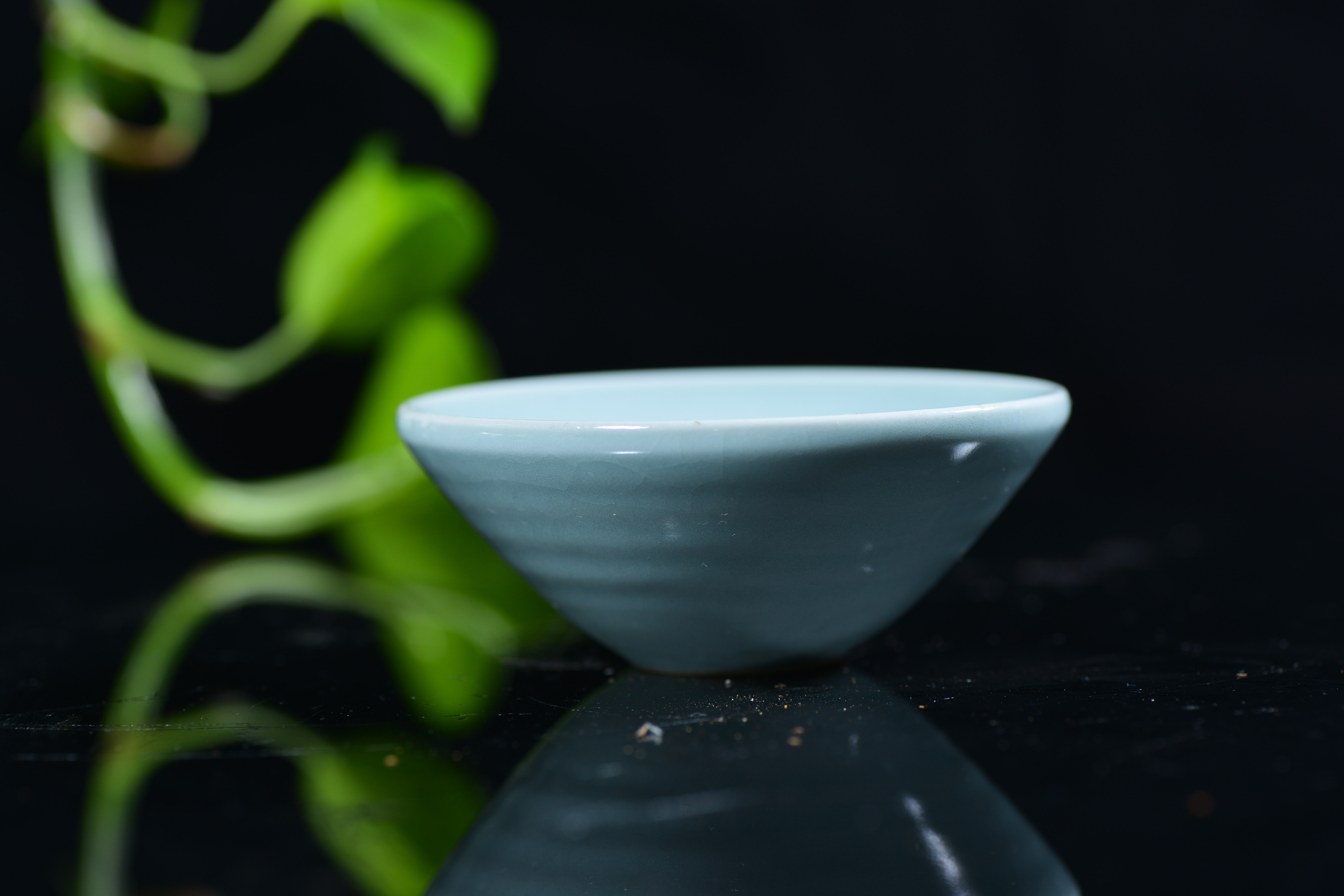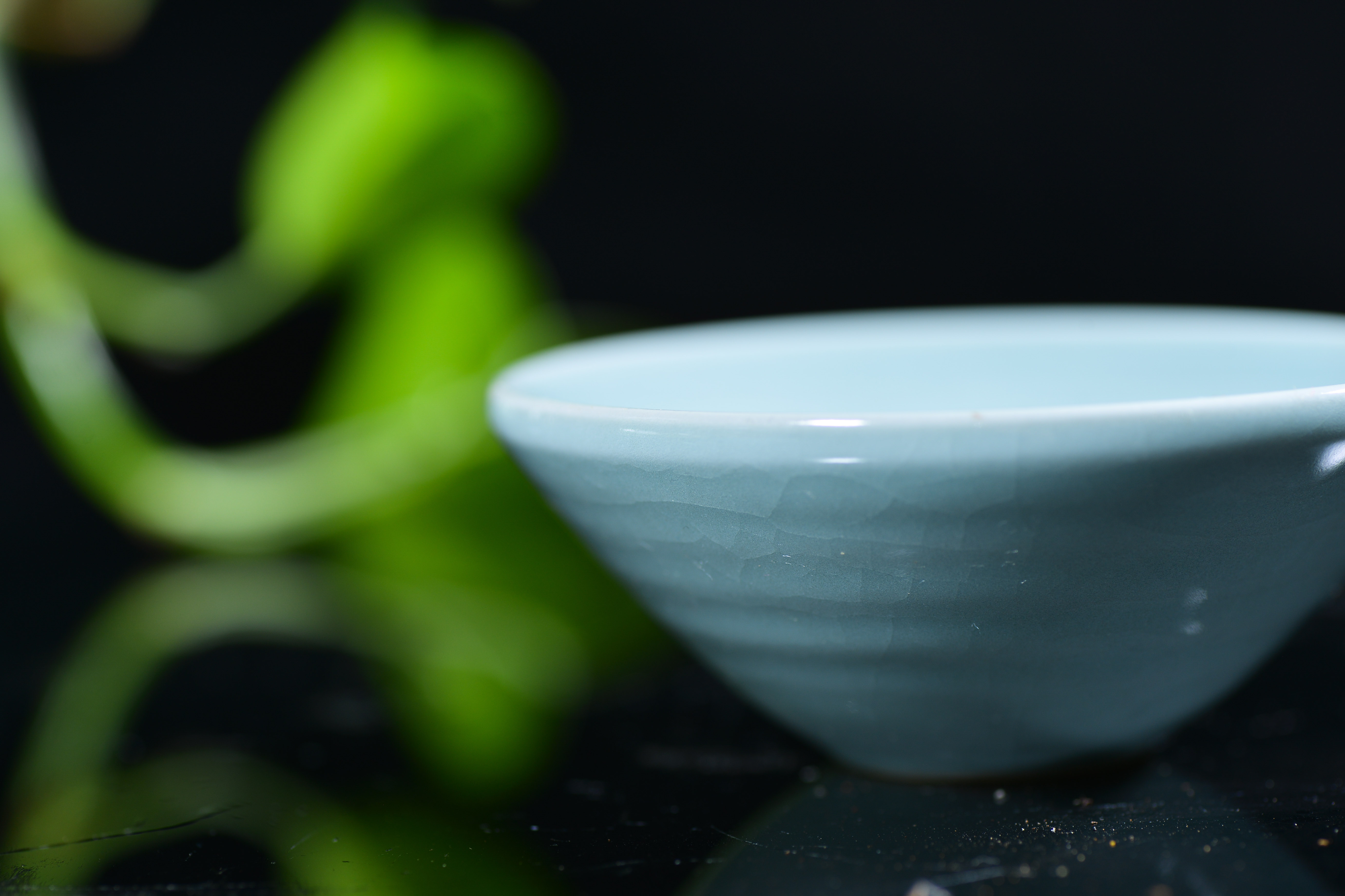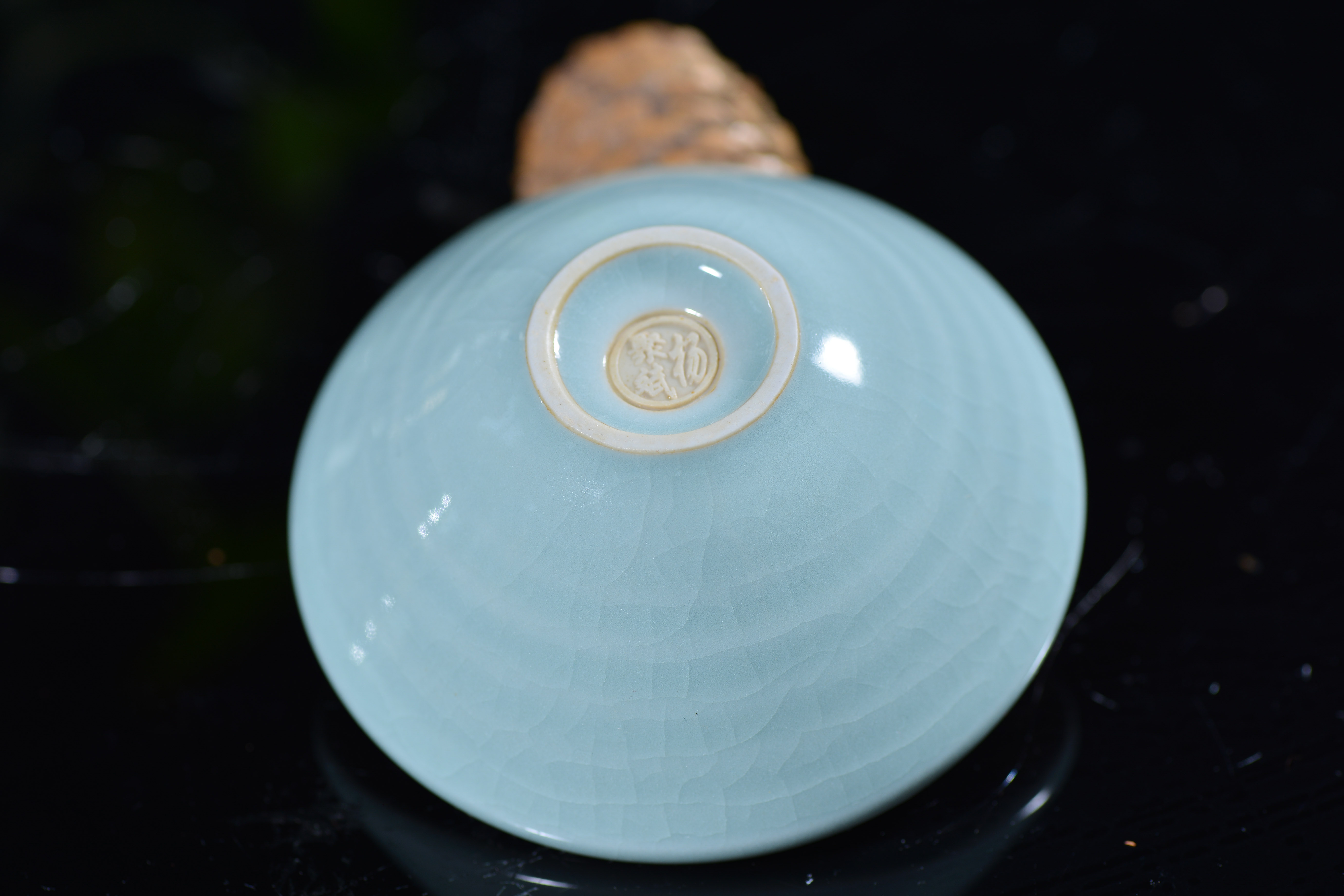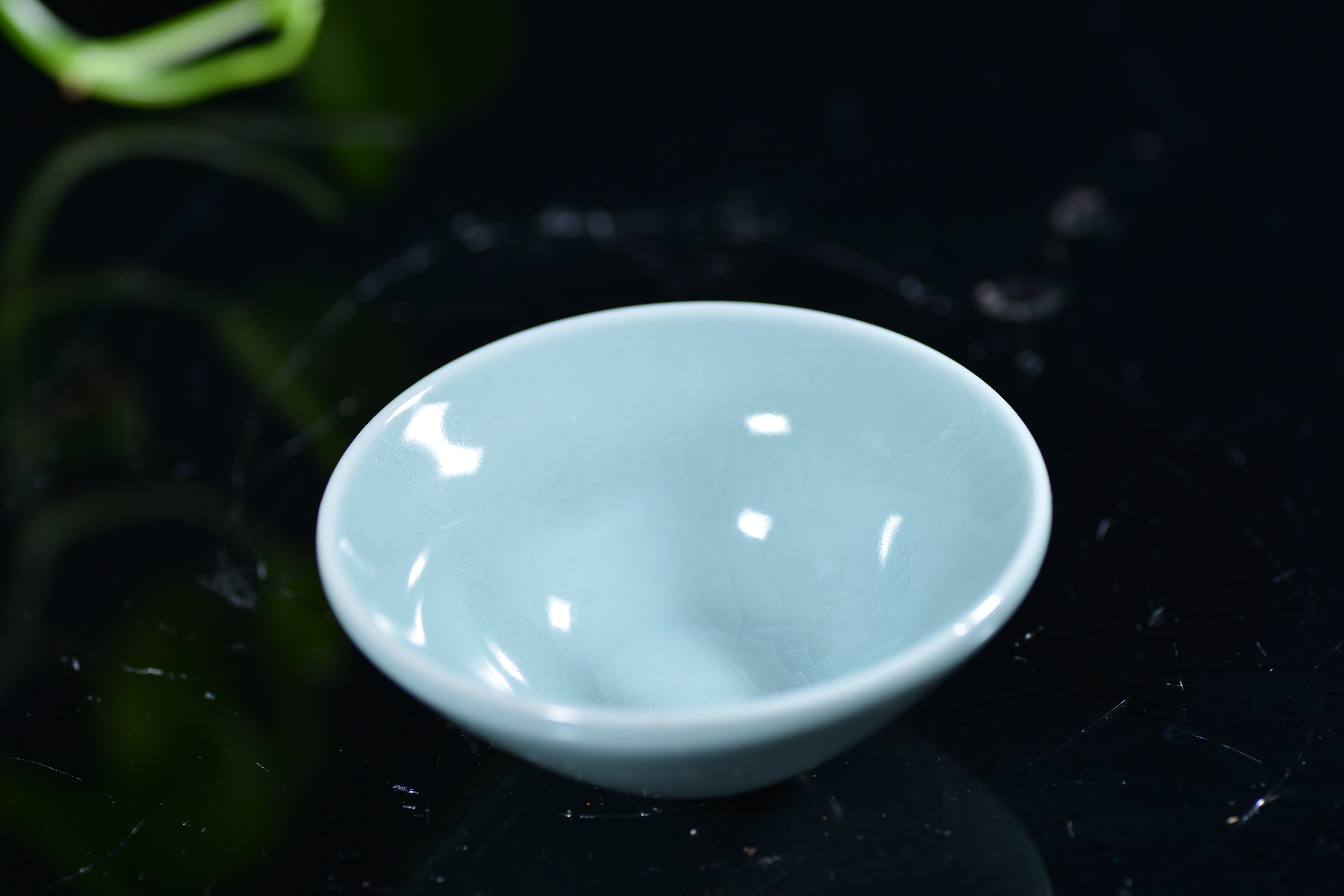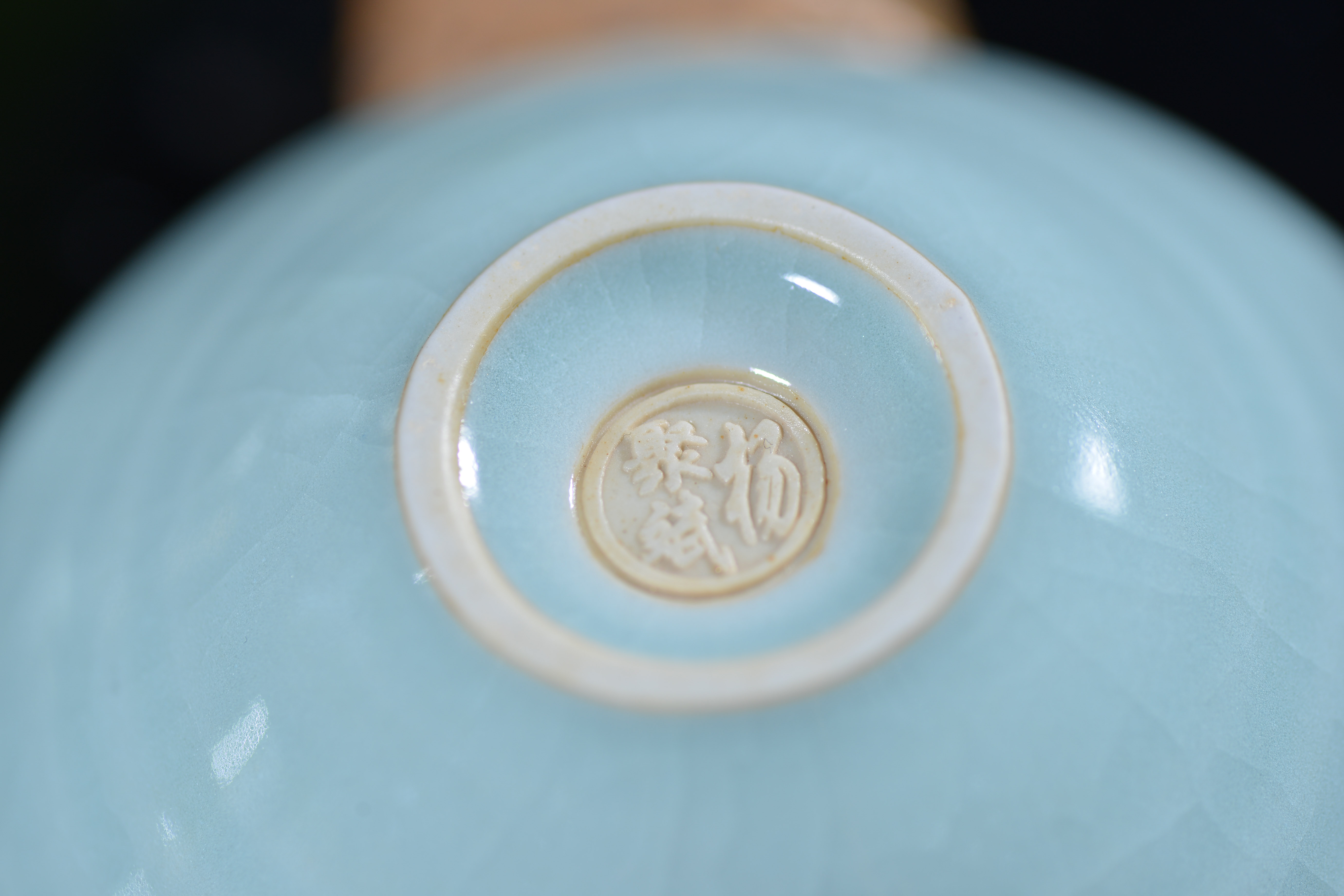 汝瓷 复古小盏 杨聚斌 尺寸9*3.5厘米 汝瓷—中国五大名瓷之一,创烧于北宋晚期,为宫廷御用瓷器。金灭北宋后,汝瓷也随之消亡。其开窑时间前后只有二十年,由于烧造时间短暂,传世亦不多,在南宋时,汝瓷已经非常稀有。现今存世的汝瓷,一般认为有65件,其中台北故宫博物院23件,北京故宫博物院17件,上海博物馆8件,英国戴维基金会7件,其他散藏于美、日等博物馆和私人收藏约10件。所以才有“家财万贯,不如汝瓷一片”。 作者杨聚斌出生于1962年2月,因为父亲在陵头陶瓷厂工作,因此杨聚斌自幼受父亲耳濡目染,从少年时代