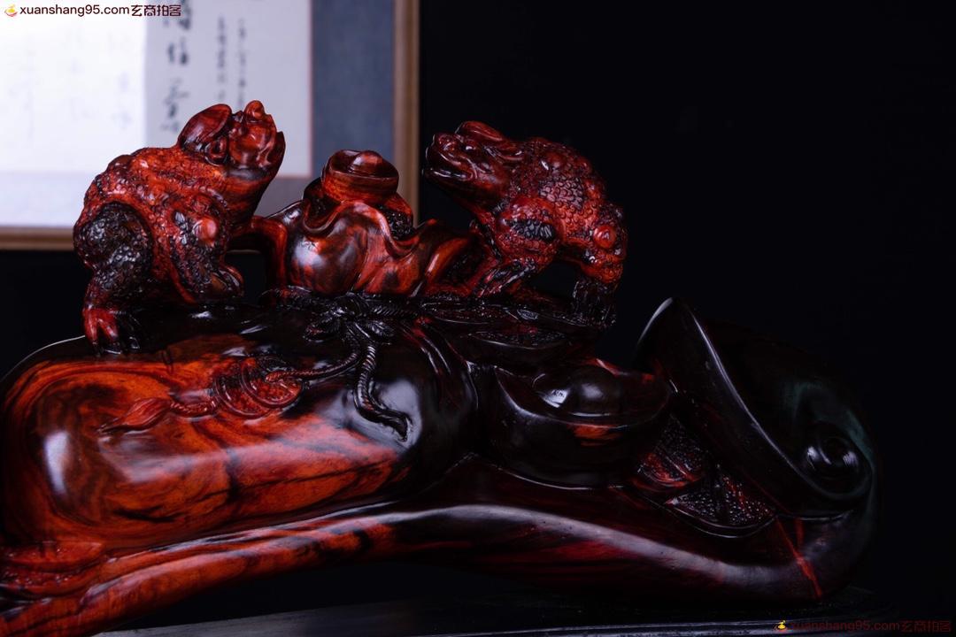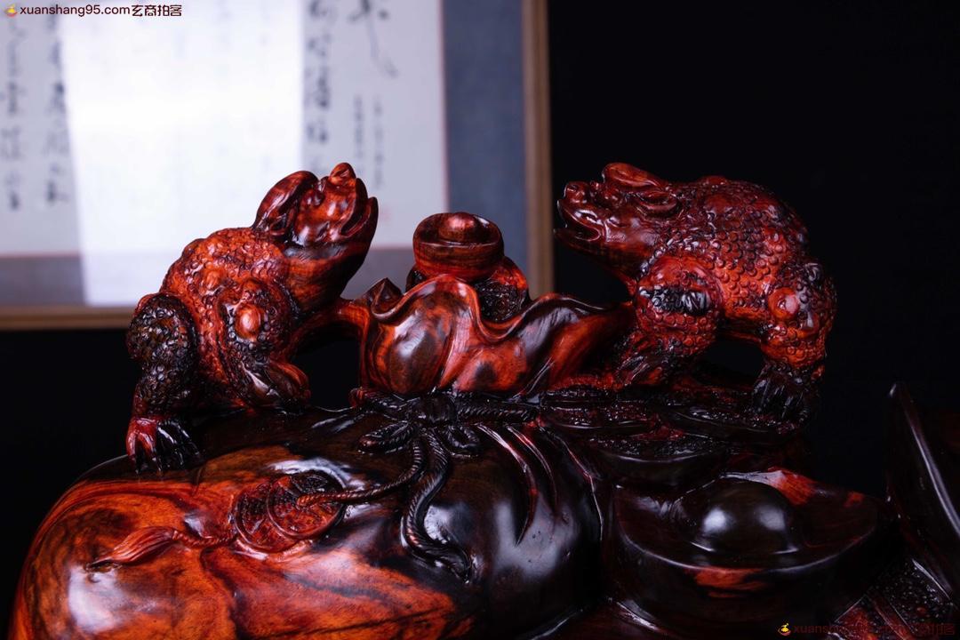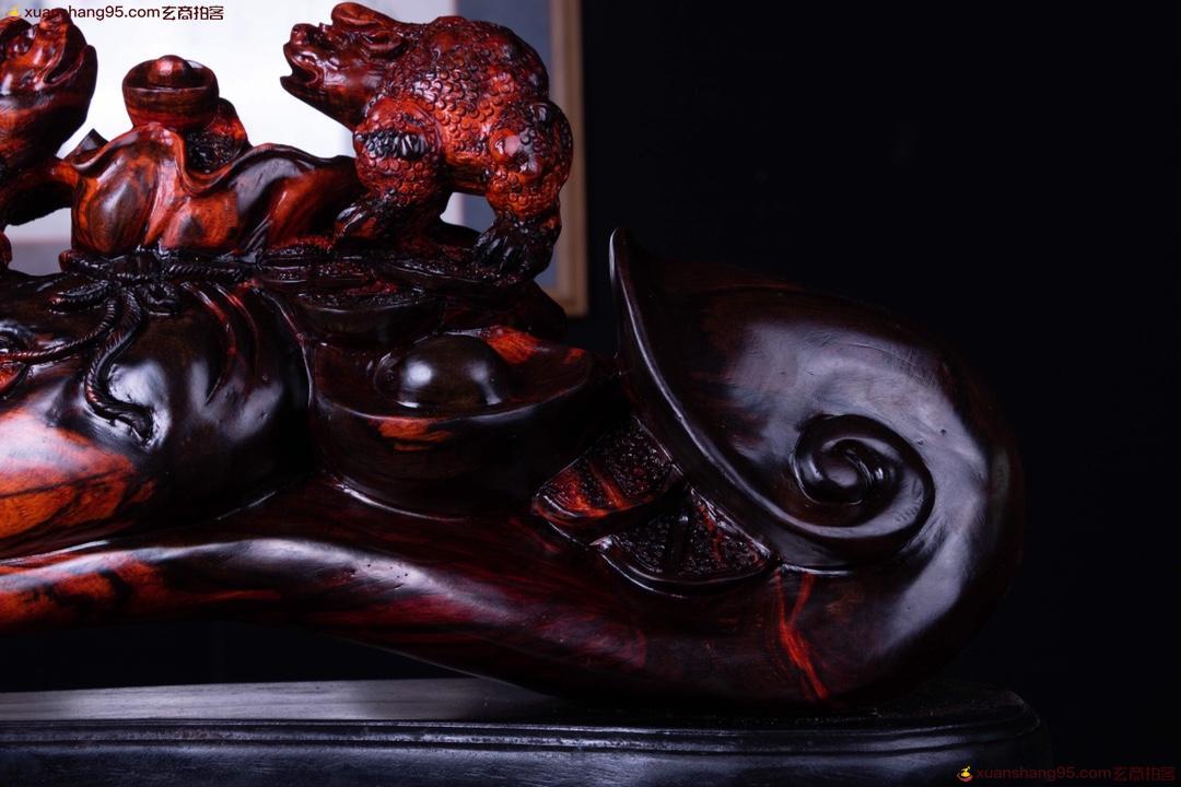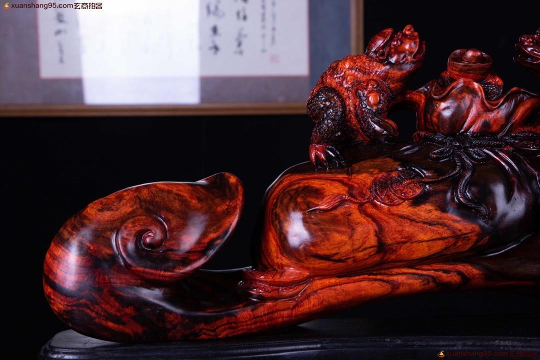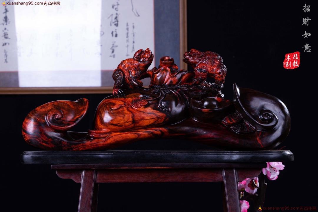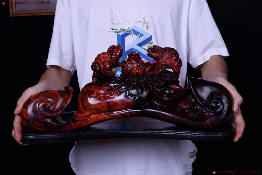 老挝大红酸枝 招财如意,高密度老料,整料立体精雕而成,非常耗料耗工,红黑相间的纹理,很是漂亮,造型优美,无瑕疵,精品,长47.5cm,宽9.5cm,高19.5cm,重4.91斤。