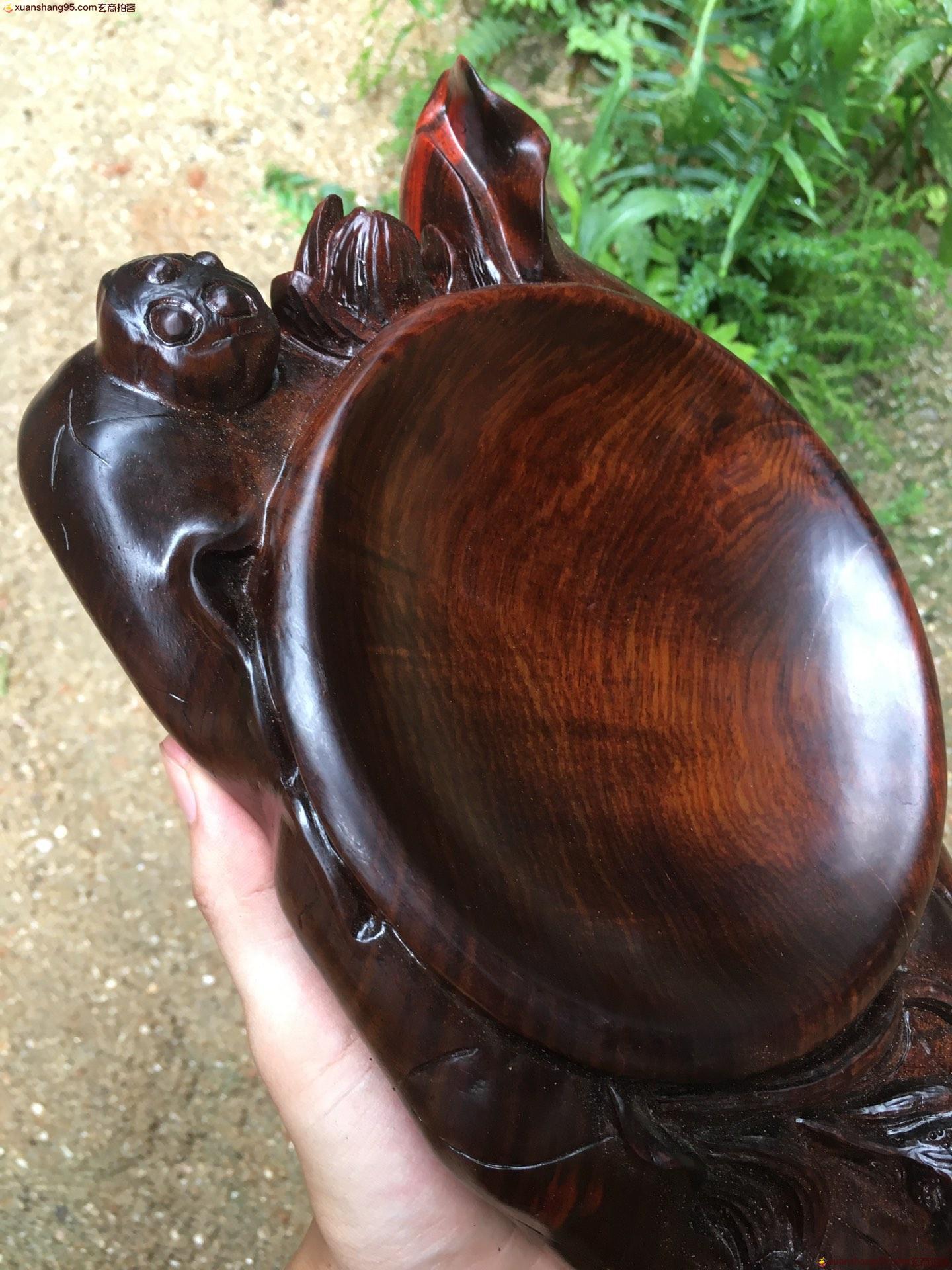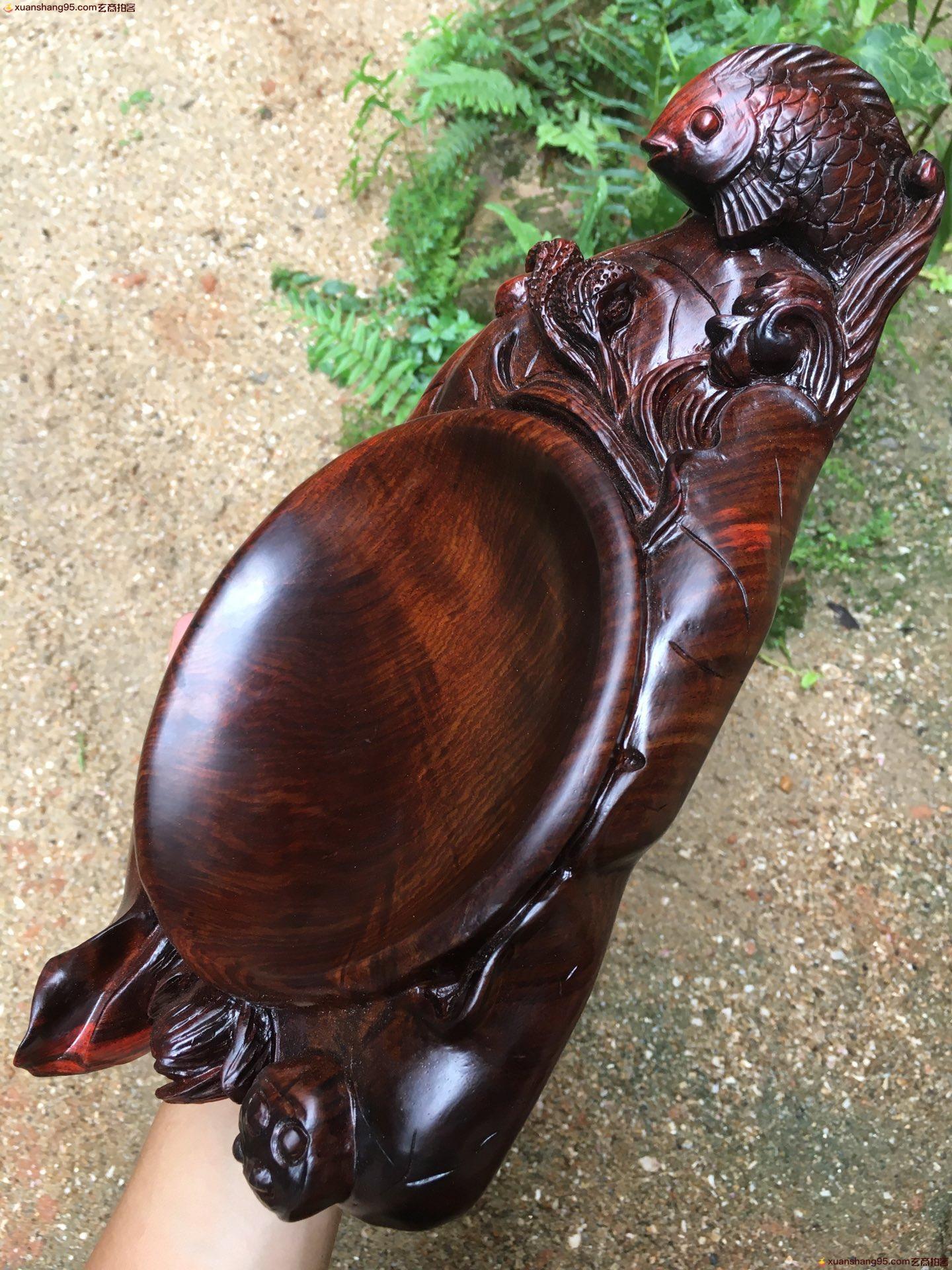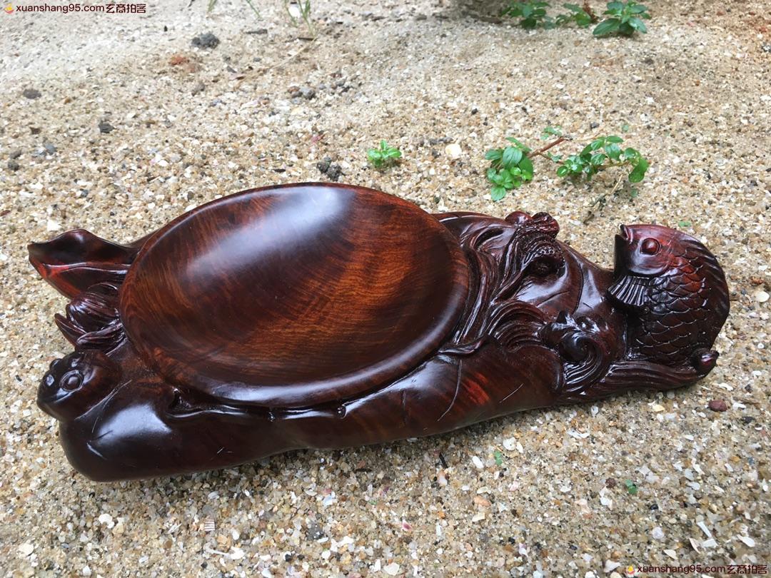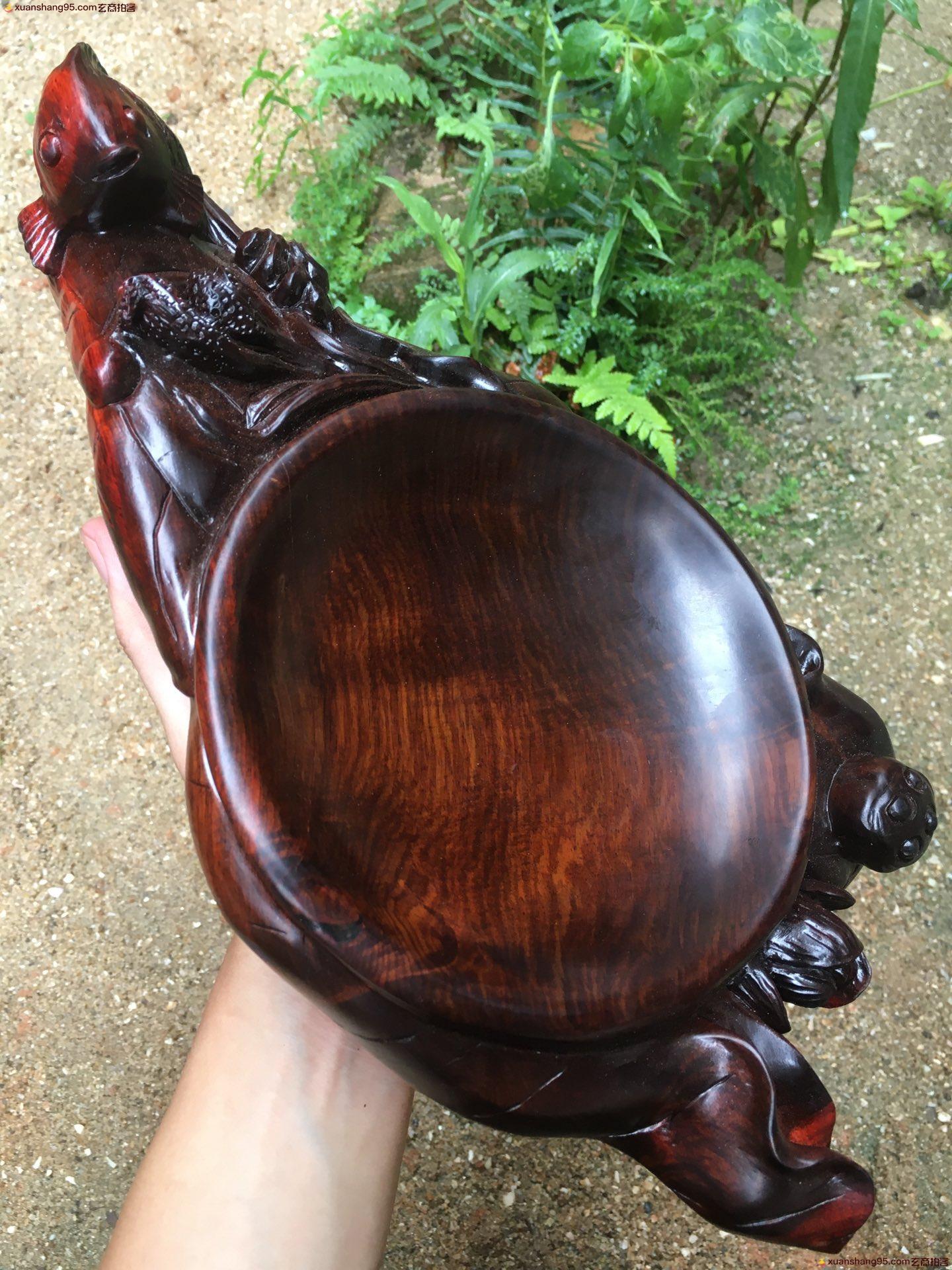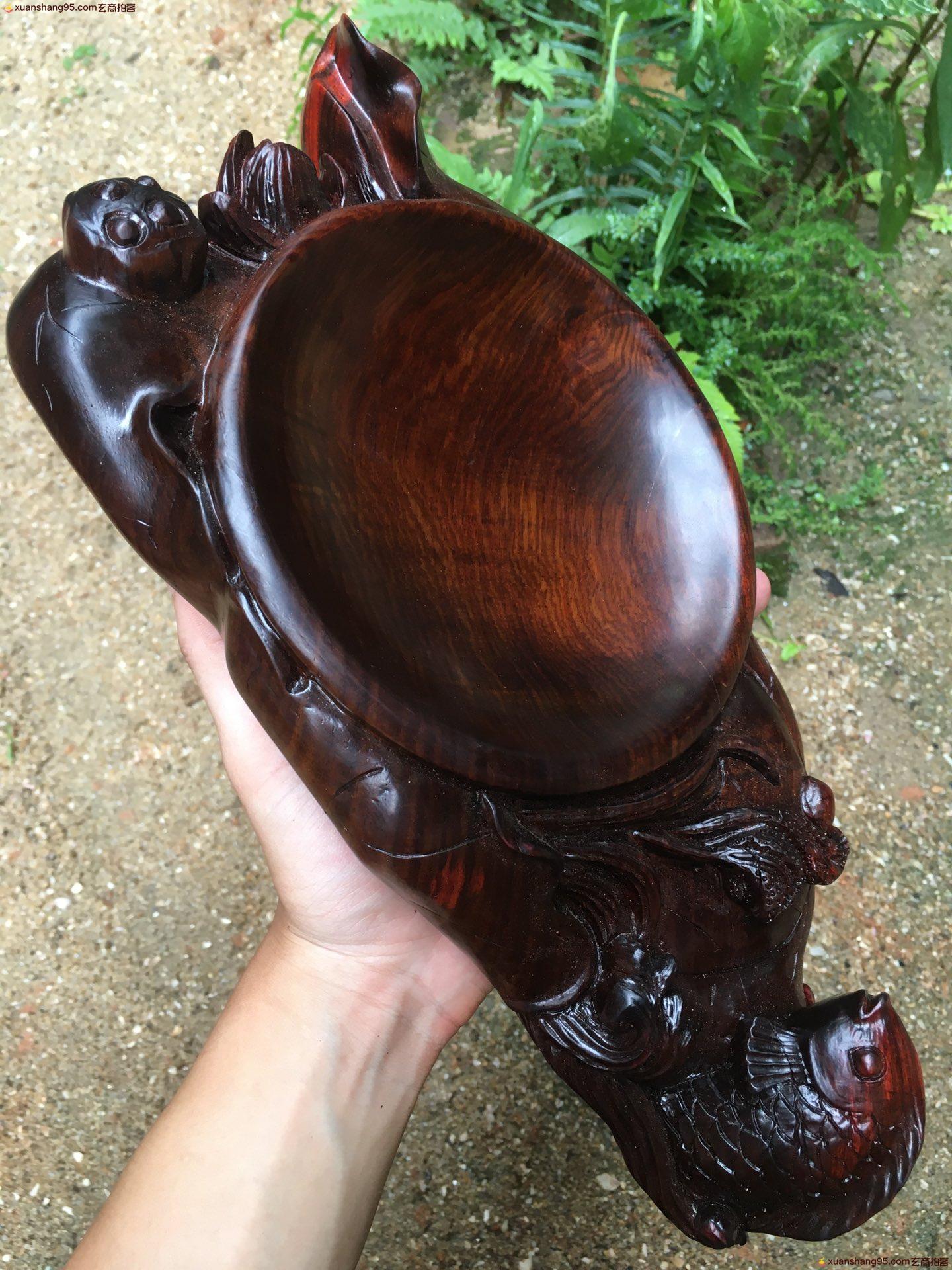 老挝大红酸枝 年年有鱼 果盘,带水波,全实心板料,整料立体深挖雕刻而成,造型漂亮,无瑕疵,精品,长34.5cm,宽17cm,高6cm,重2.46斤。