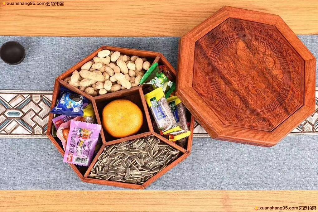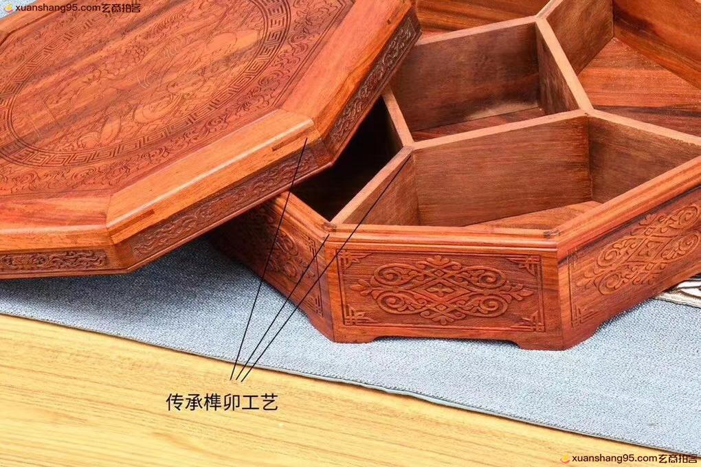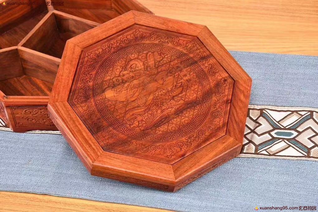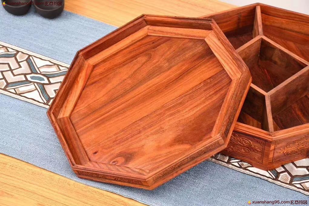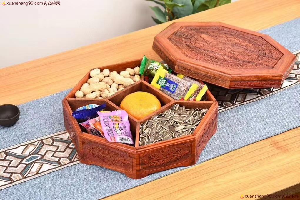 赞比亚 血檀 年年有余 五格盘 规格:28*28*10cm 雕花果盘,外观精美,连接处采用榫头结构,容量大,可放置各种干果、小点心,配礼品袋。