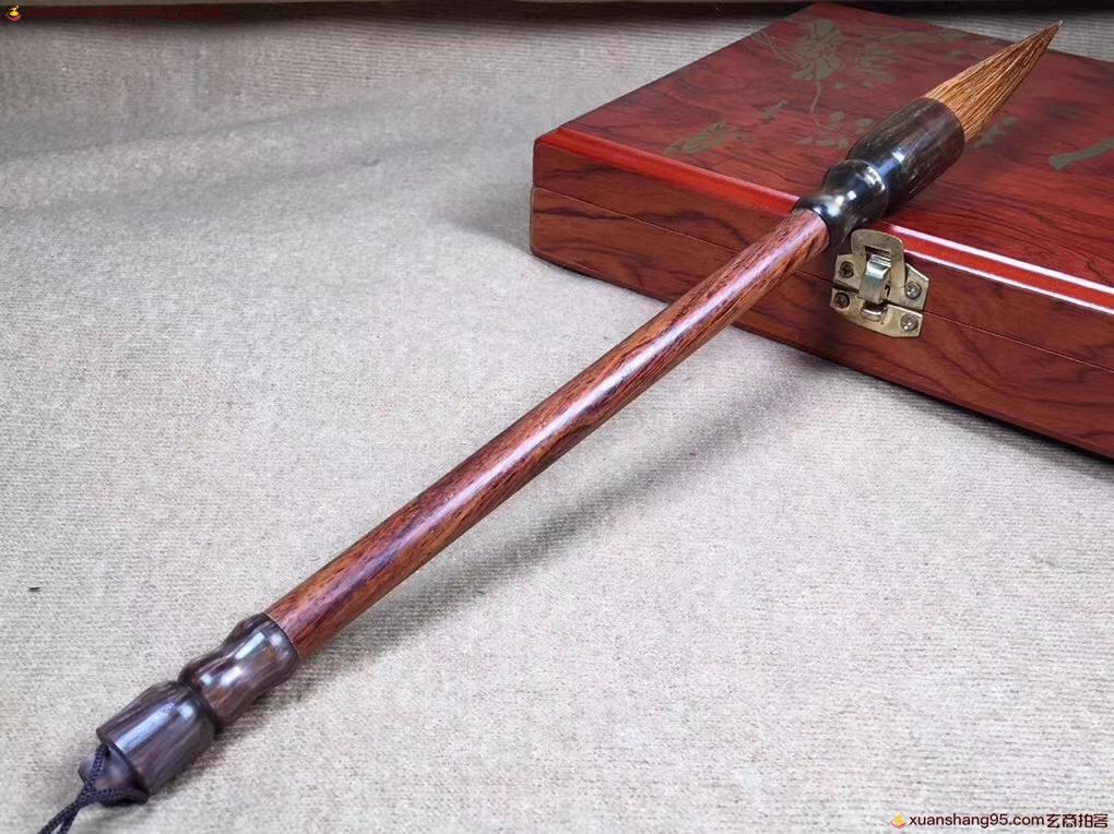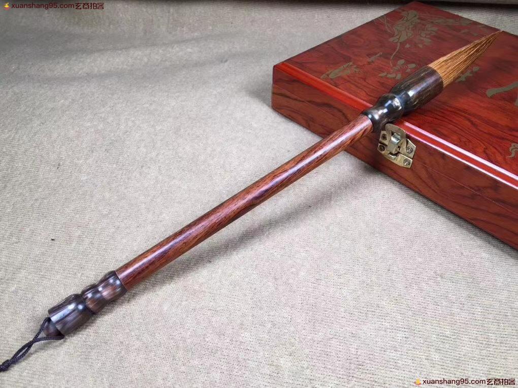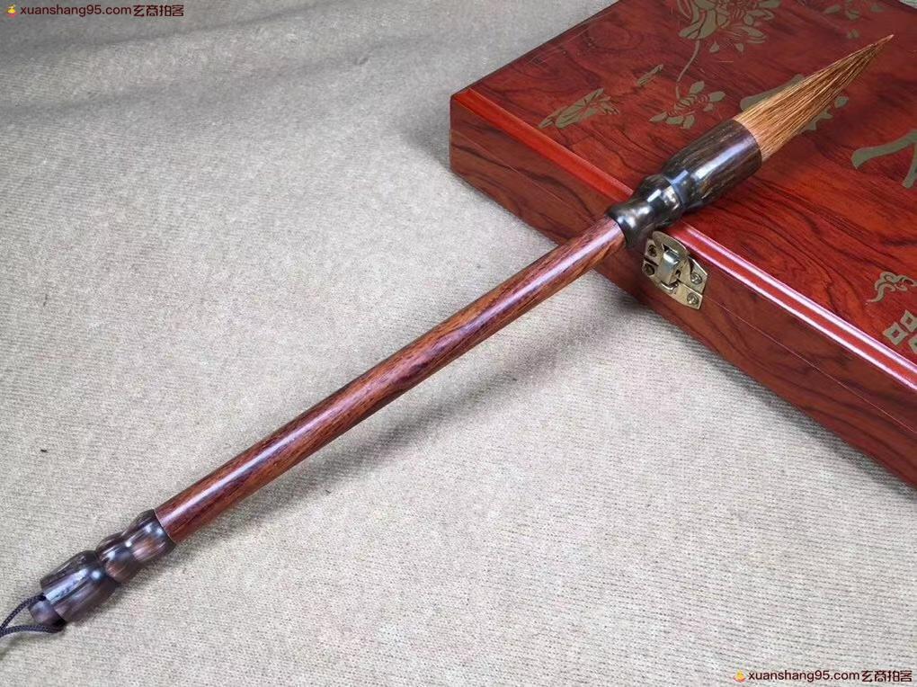 海南黄花梨 毛笔 精选海南黄花梨老料,笔头选用高端狼毫,无形中透着海黄的高贵,给你的书法艺术增添永无止境的灵感,直径1.2厘米 长31厘米。