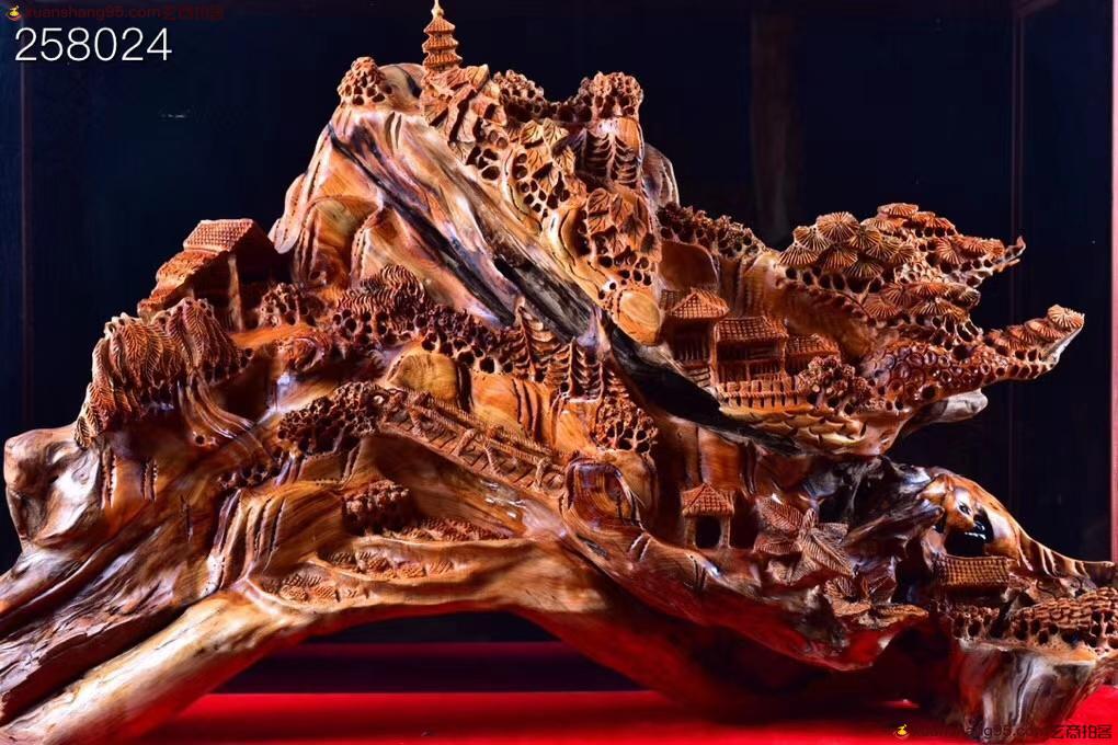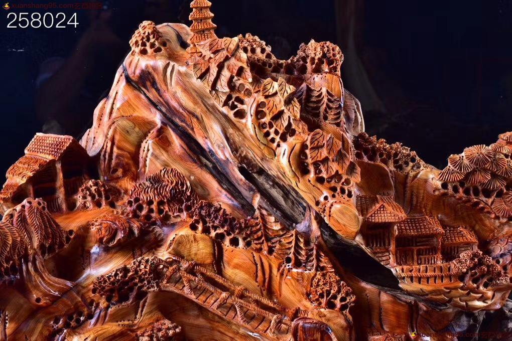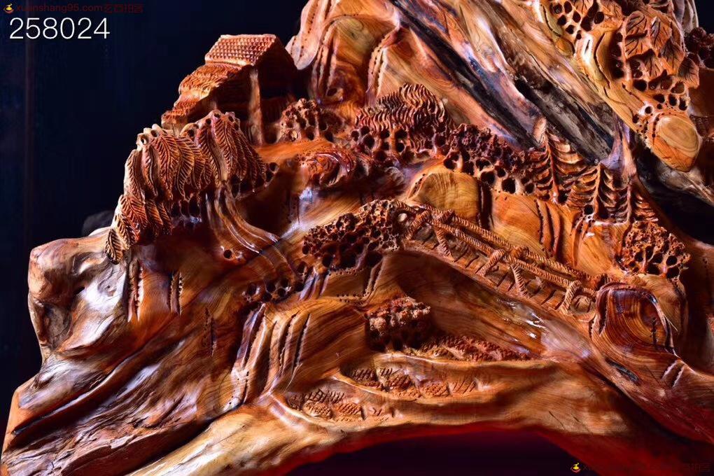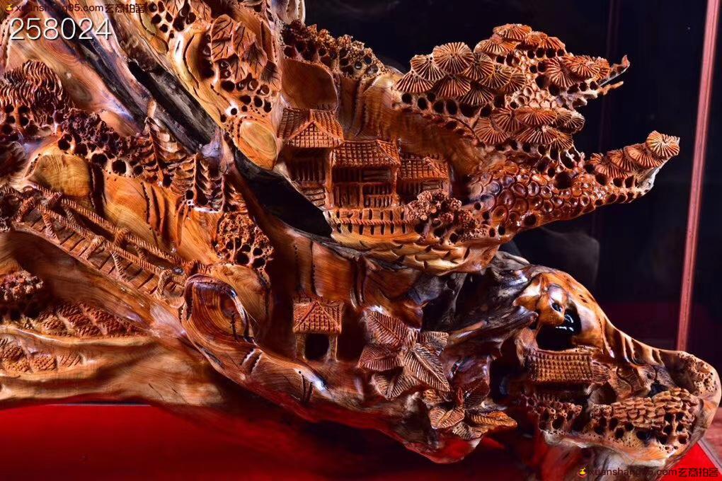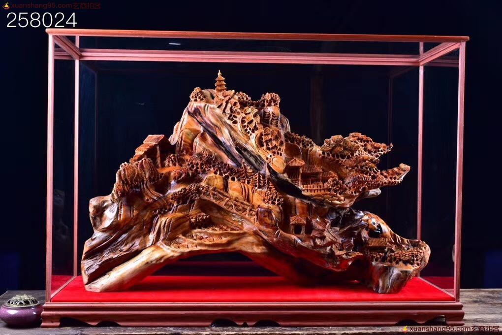 《山里人家》崖柏,雕刻精雕细琢动态十足、唯美如斯传世珍品。长宽高96/51/66厘米重79斤、送玻璃展柜。