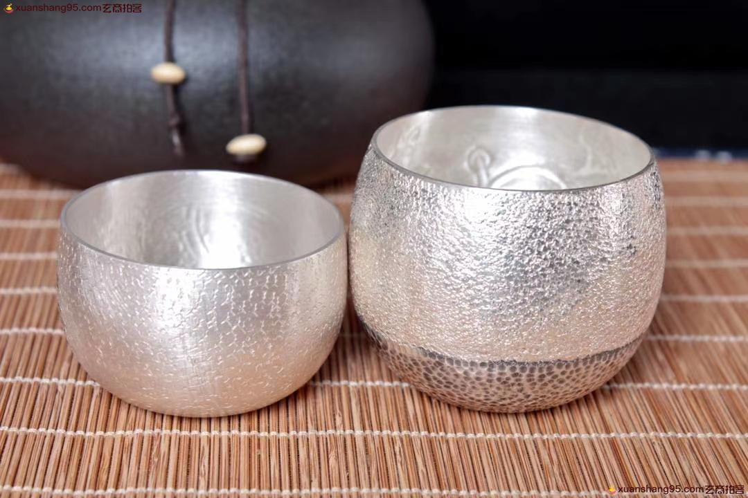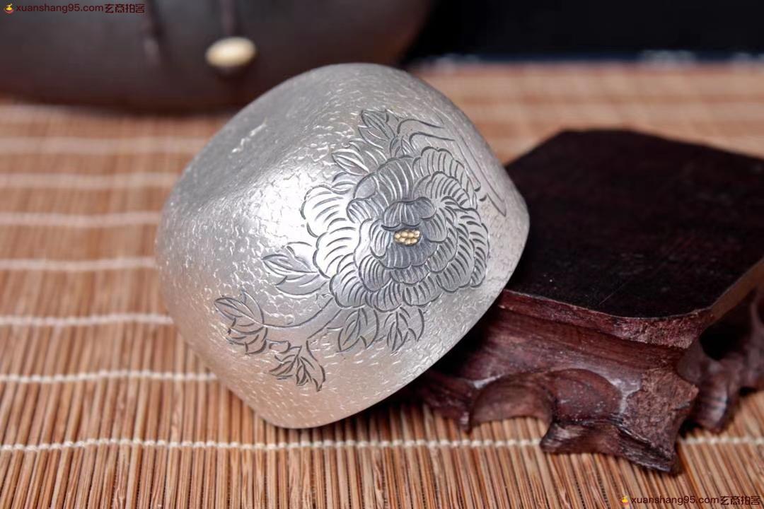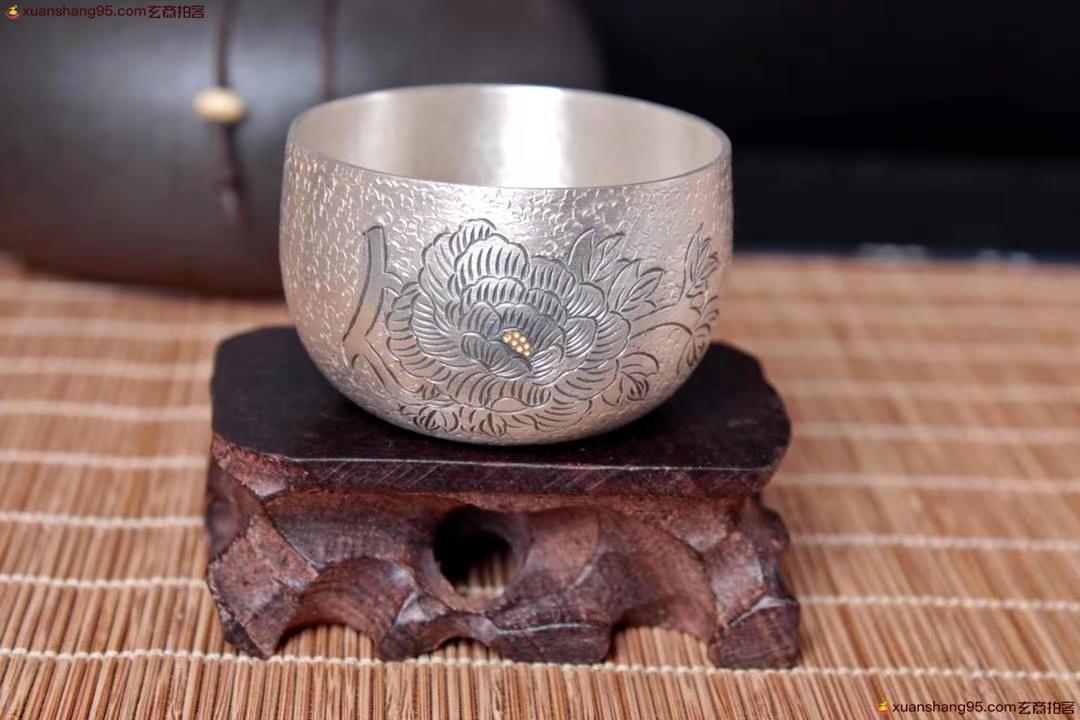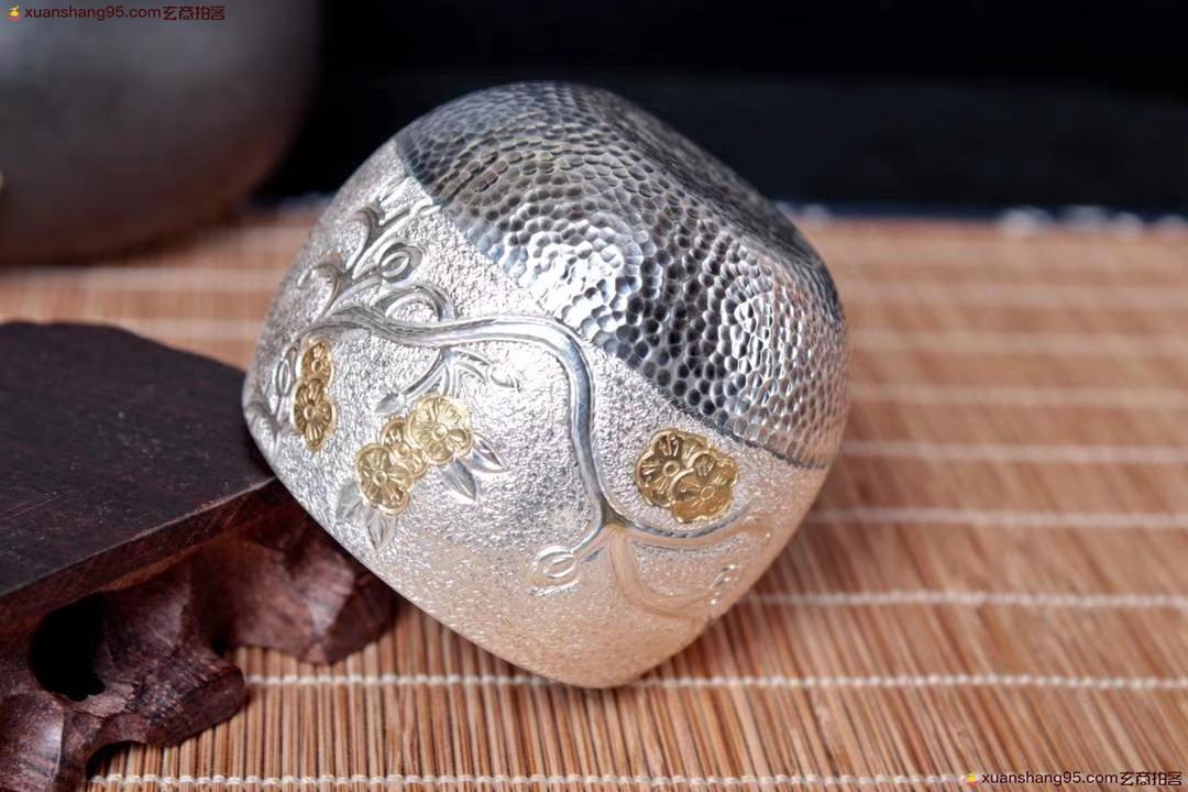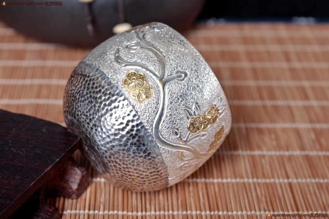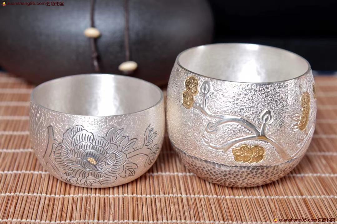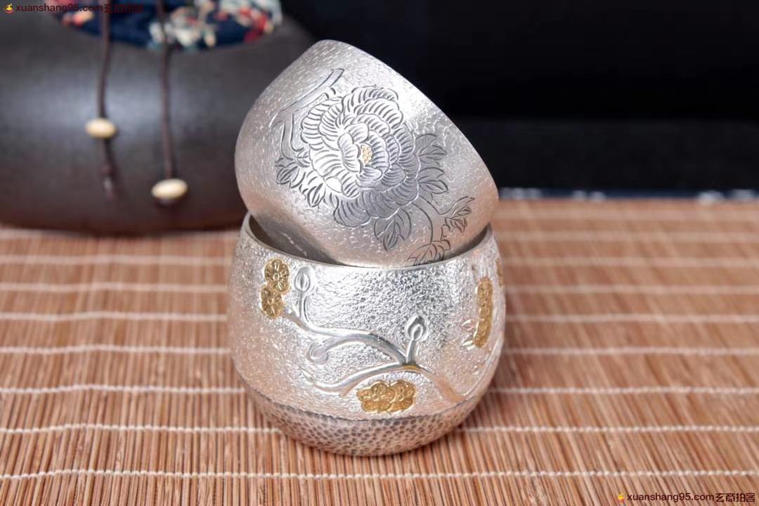 丽江雪花银 花开富贵和梅花茶杯 鎏金工艺 可食用银 纯手工打造 工艺精湛,打磨到位,实用收藏佳品。花开富贵尺寸3.3*4.7厘米 重量62克, 梅花茶杯尺寸5.3*5.9厘米 重量71克。