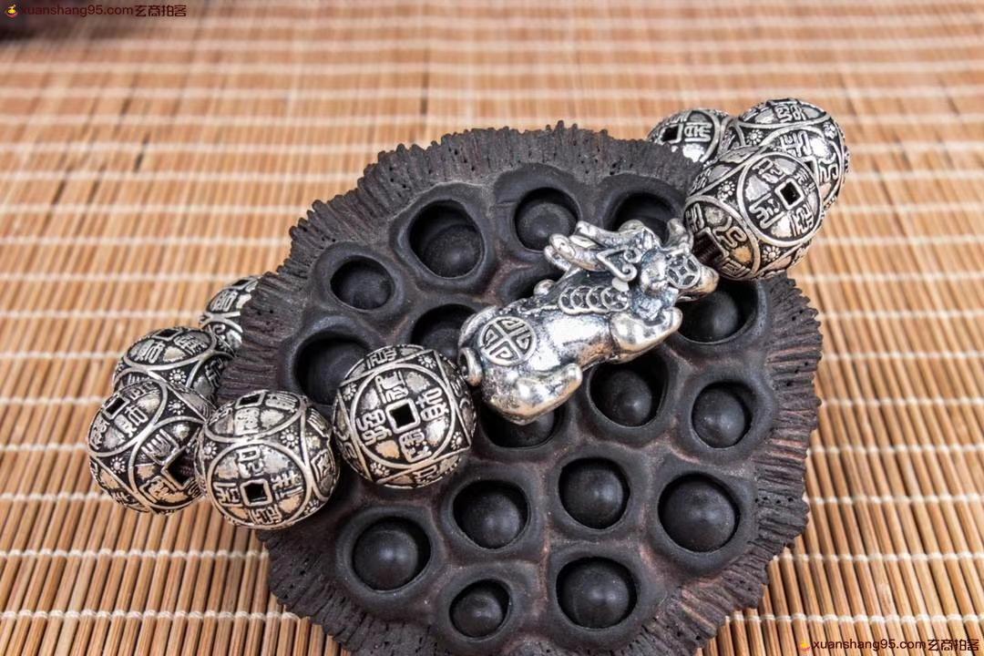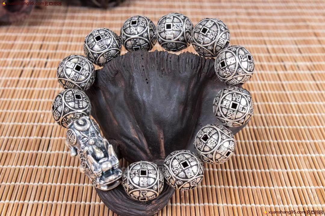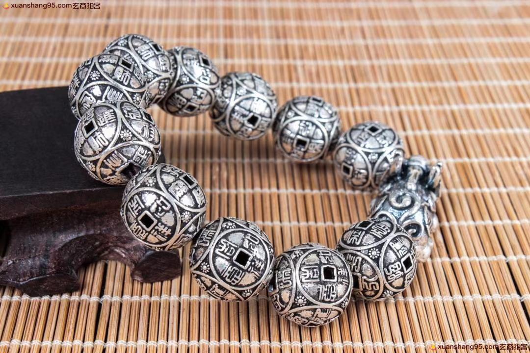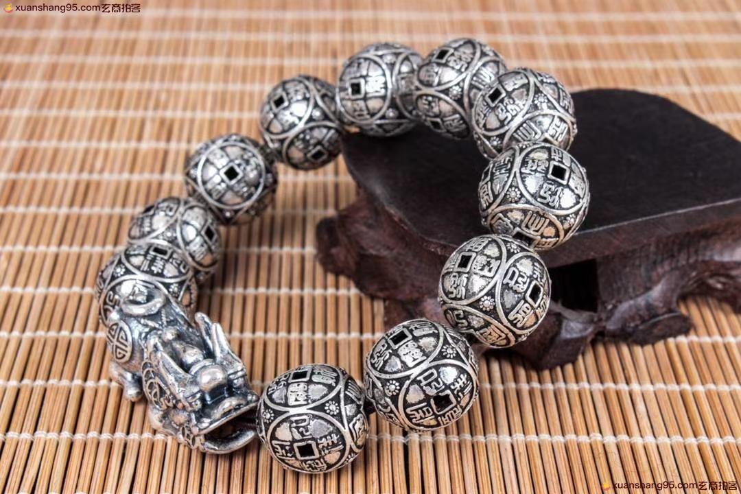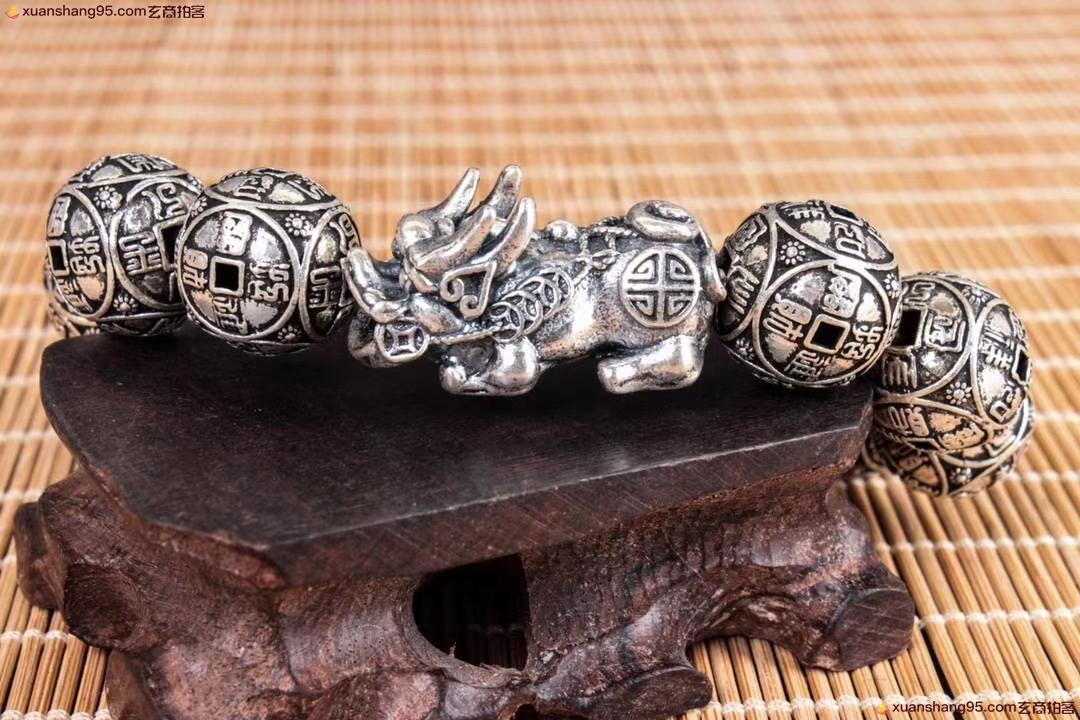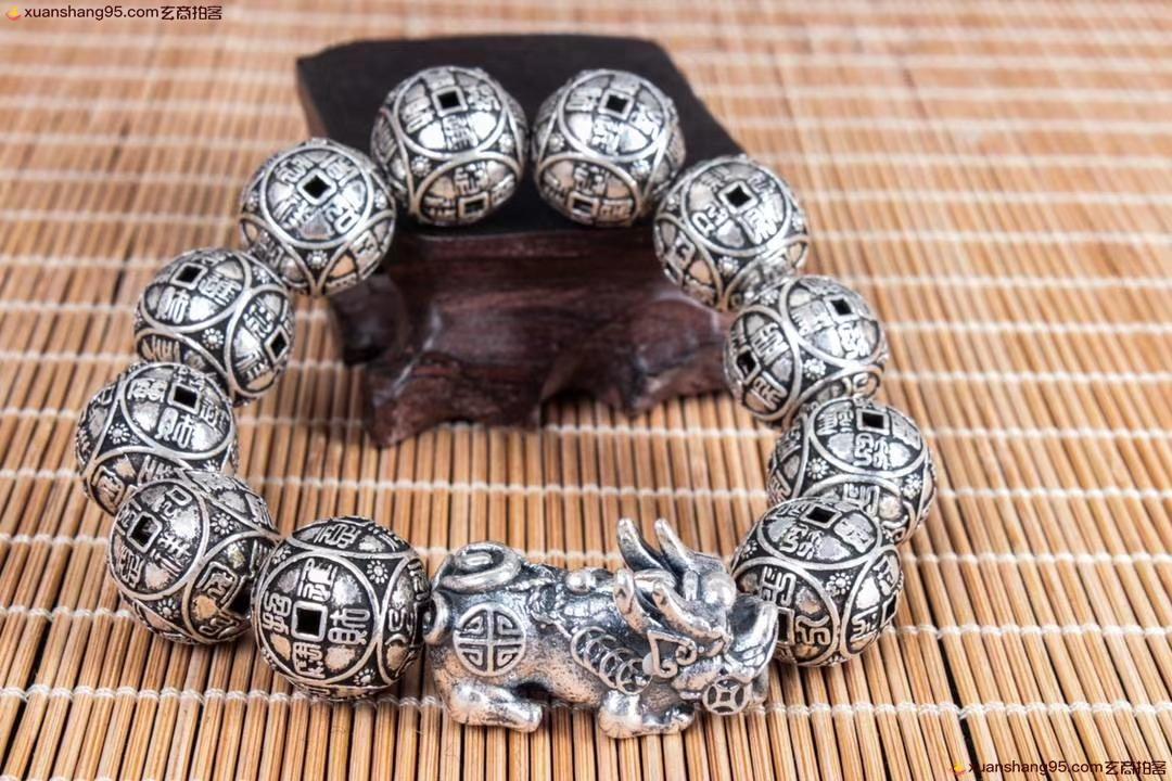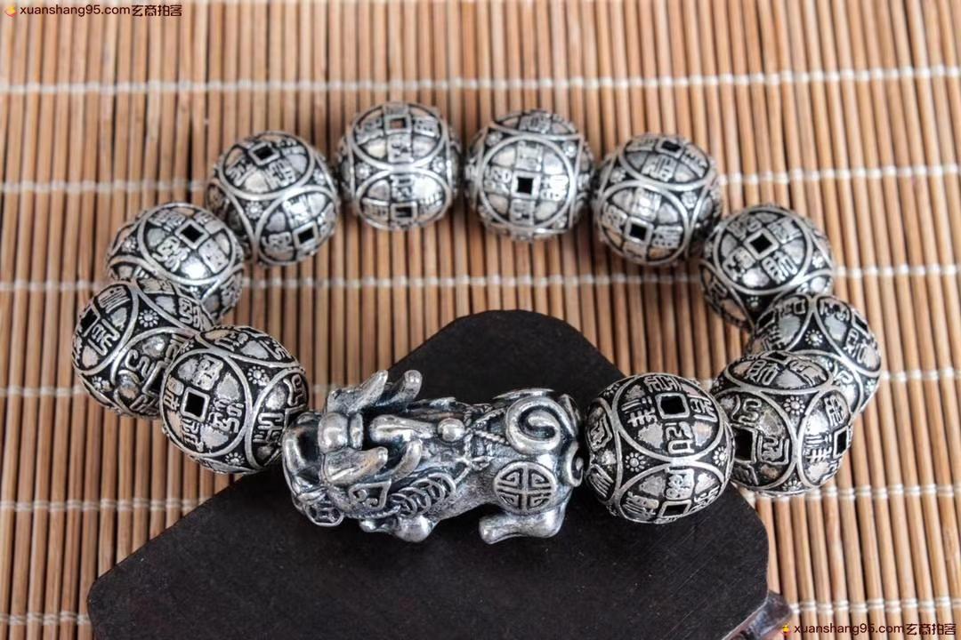 丽江雪花银 招财貔貅 手串 纯银手串 可食用银 精工打造 招财貔貅,做旧工艺。尺寸1.7厘米 重量67克。