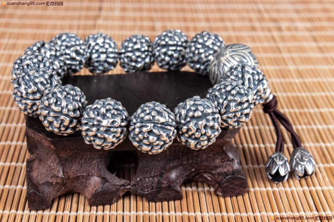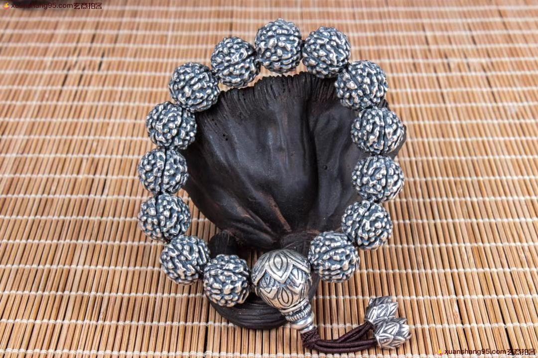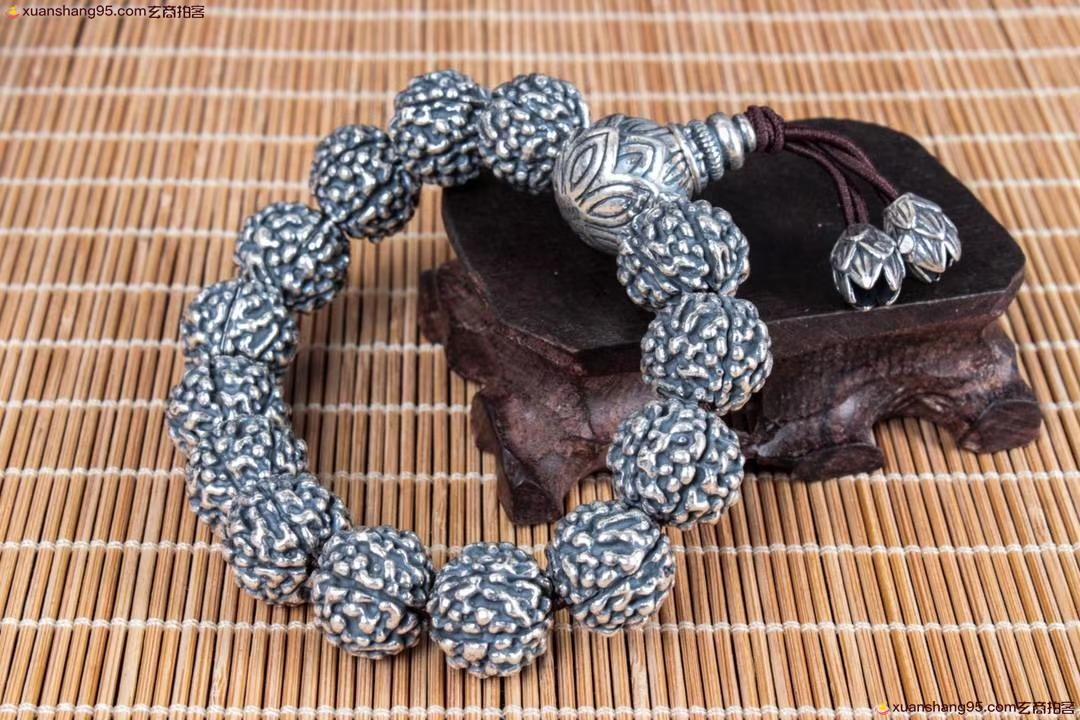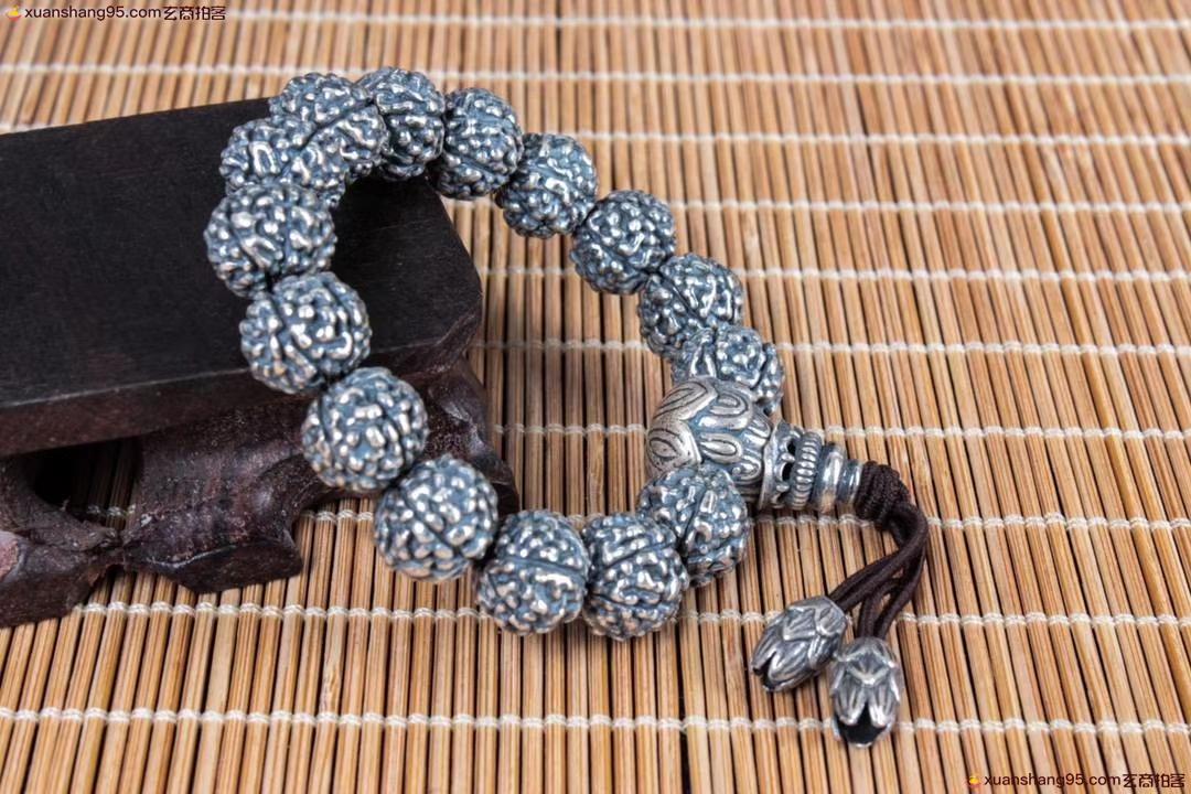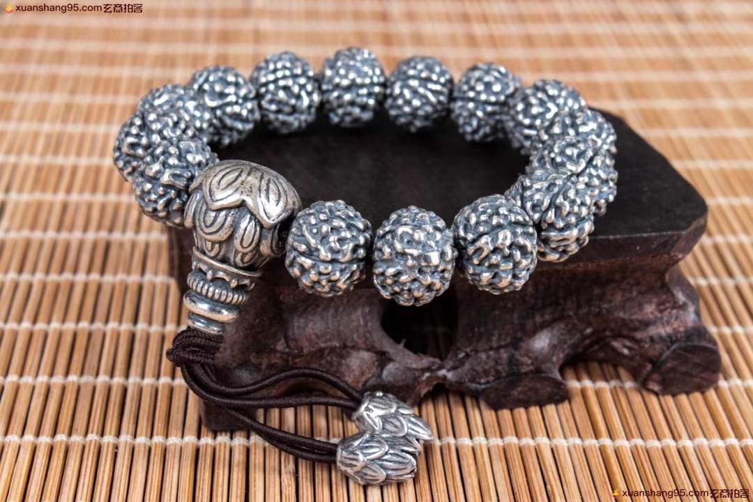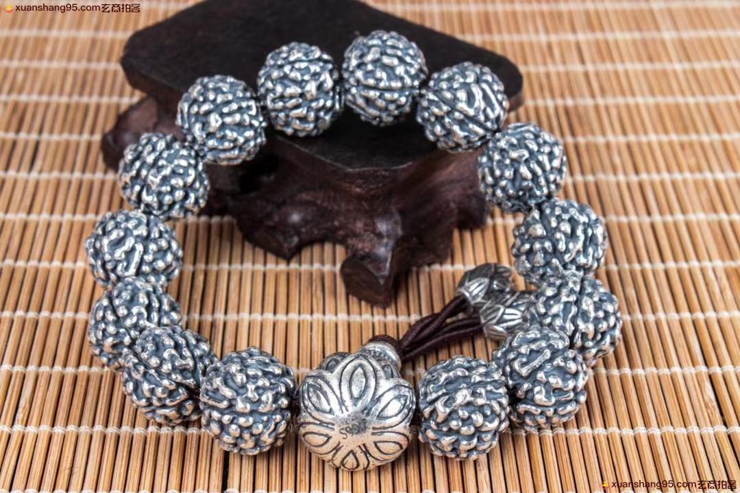 丽江雪花银 金钢佛头 手串 纯手工打造 工艺精湛,打磨到位,实用收藏佳品。尺寸1.2厘米 重量73克。