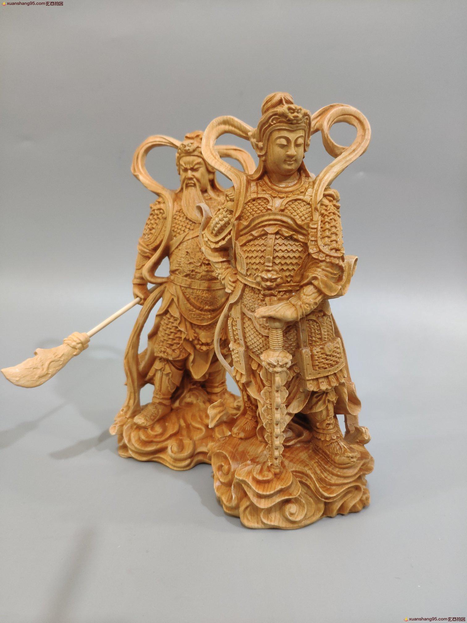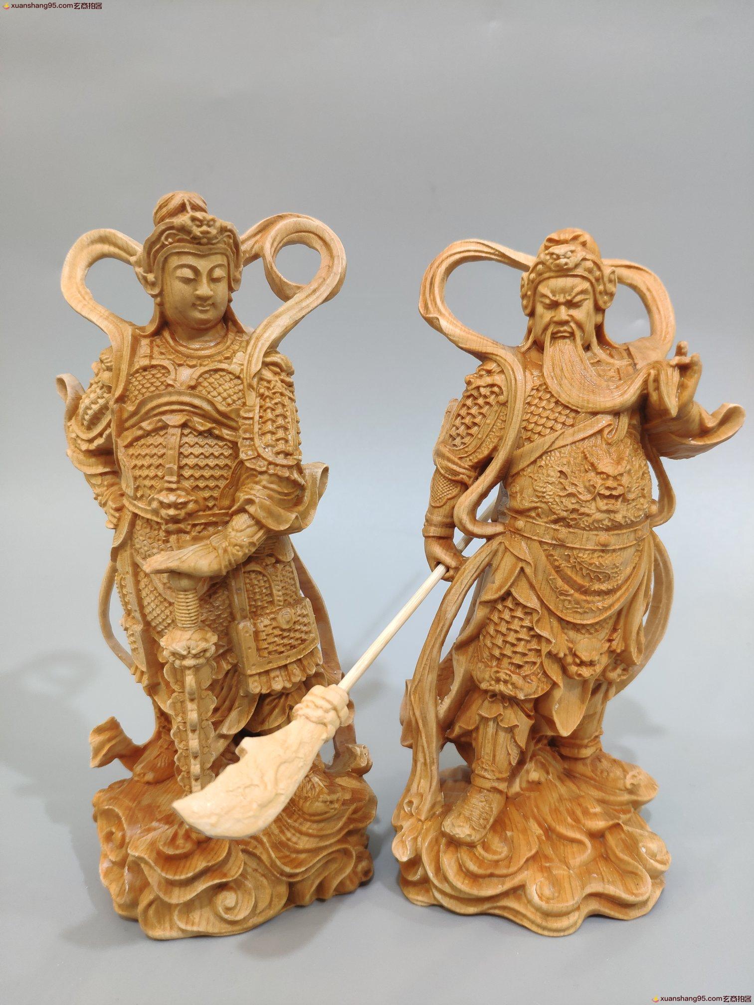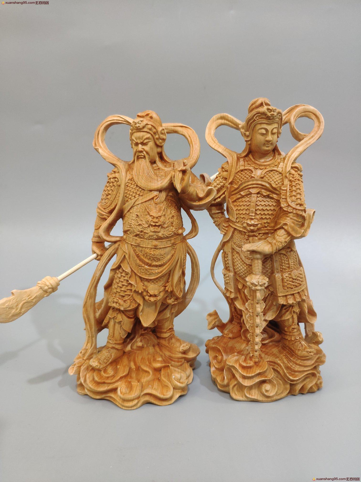 崖柏 左右护法 韦陀尊者 关公伽蓝菩萨 * 镇宅门神 精工雕刻 礼盒包装。高17厘米。