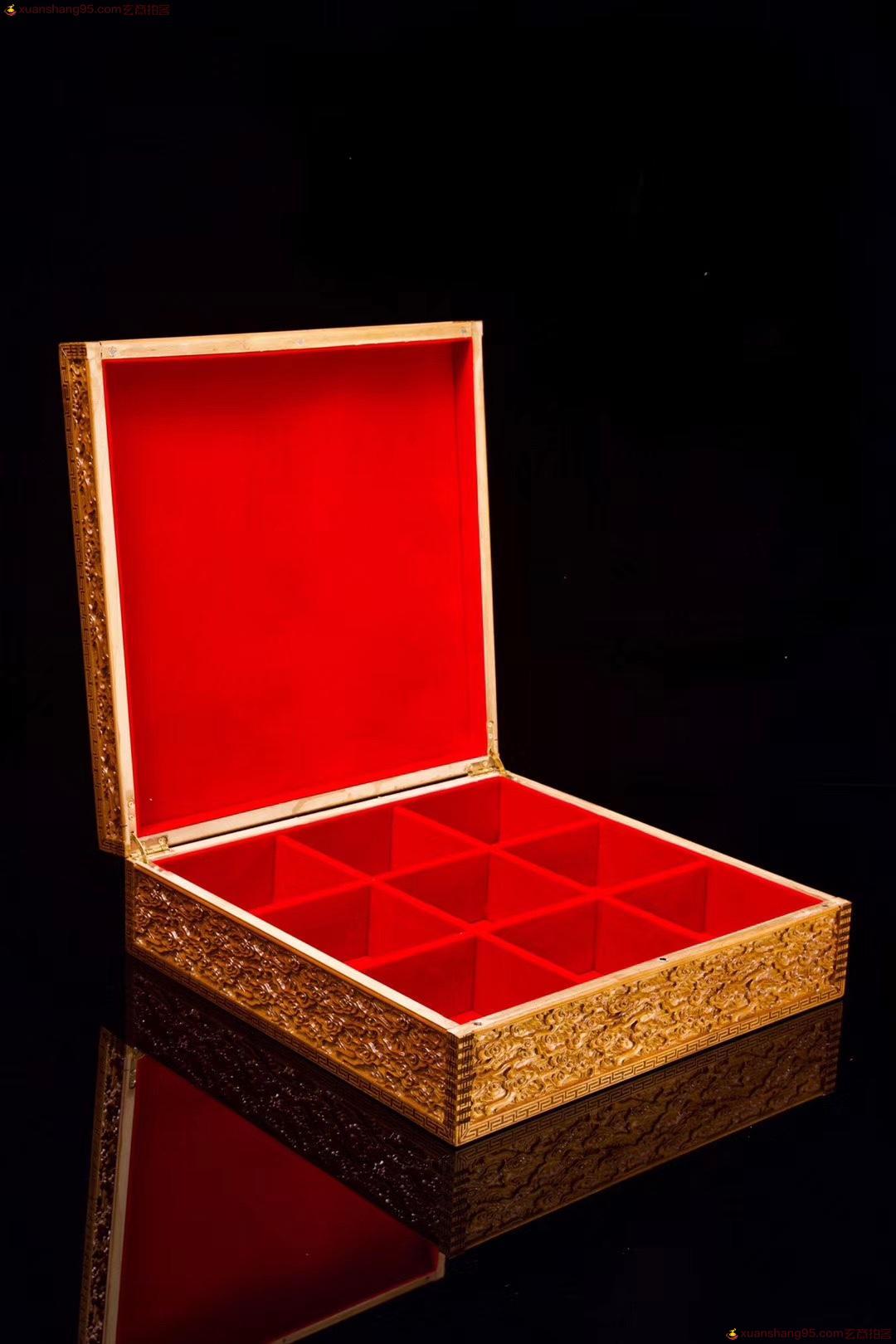 金丝楠木 满雕九龙至尊盒 精工细作 榫卯结构 浮雕九龙戏珠 对应内设九格 描金线,大气蓬勃,收藏实用佳品。尺寸36*36*10厘米。