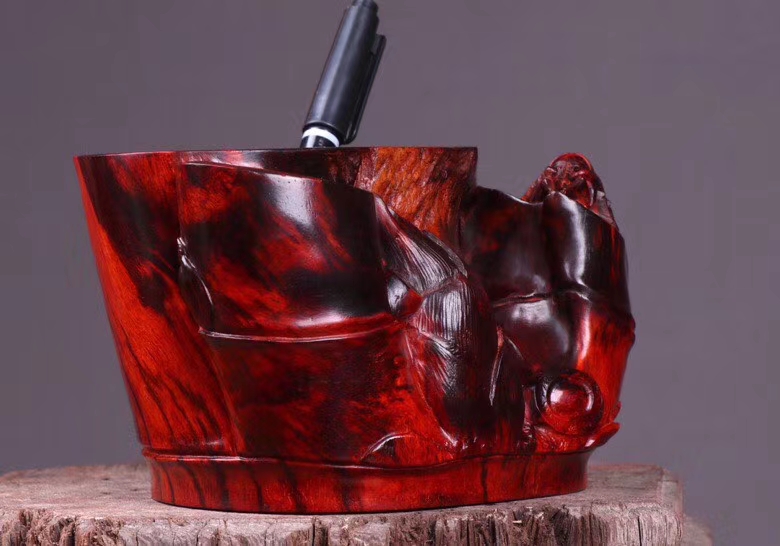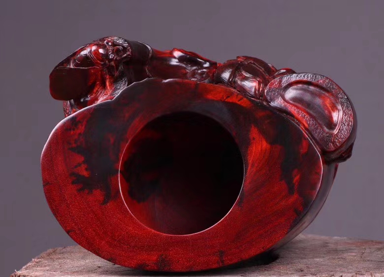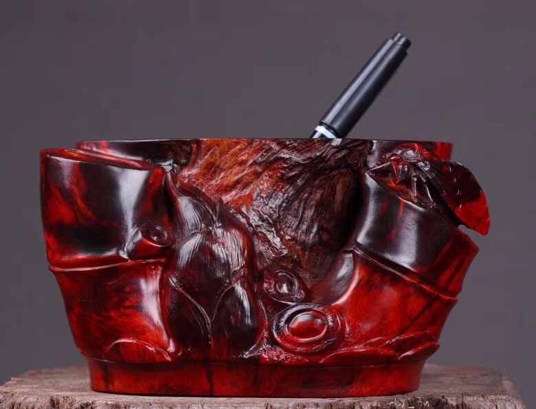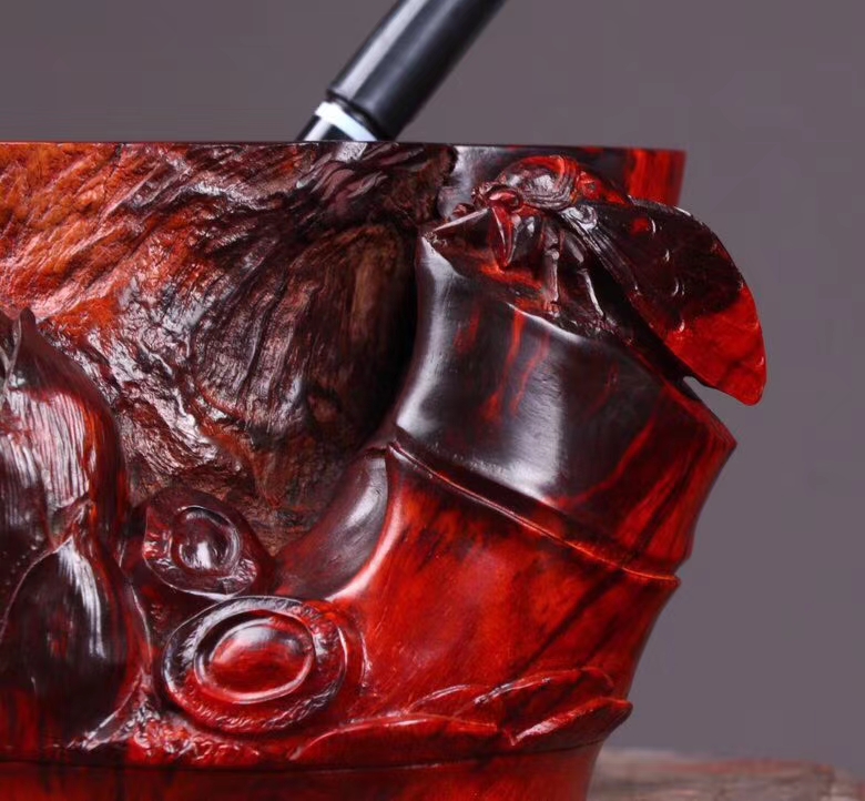 印度小叶紫檀 知足常乐 笔筒 实木挖制、无拼接,尺寸16/11/9.5cm 净重2斤。