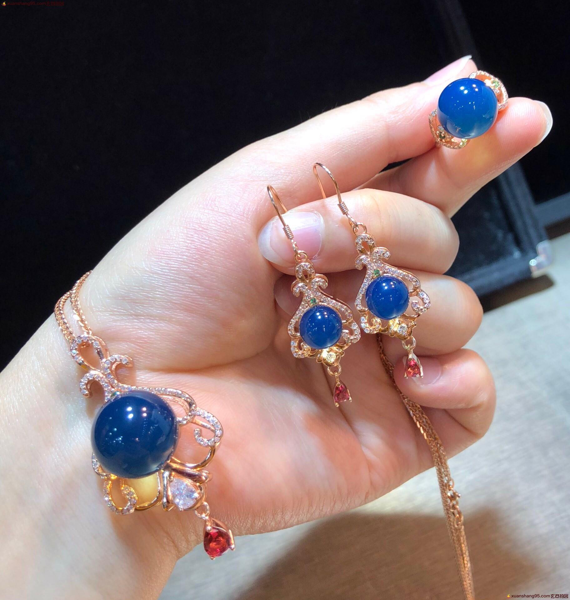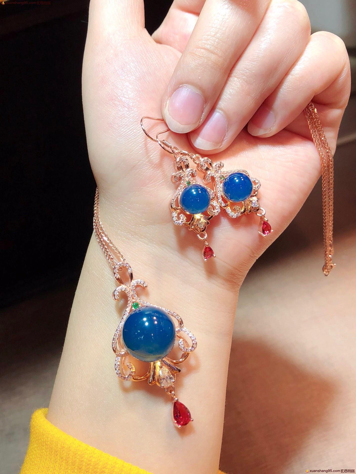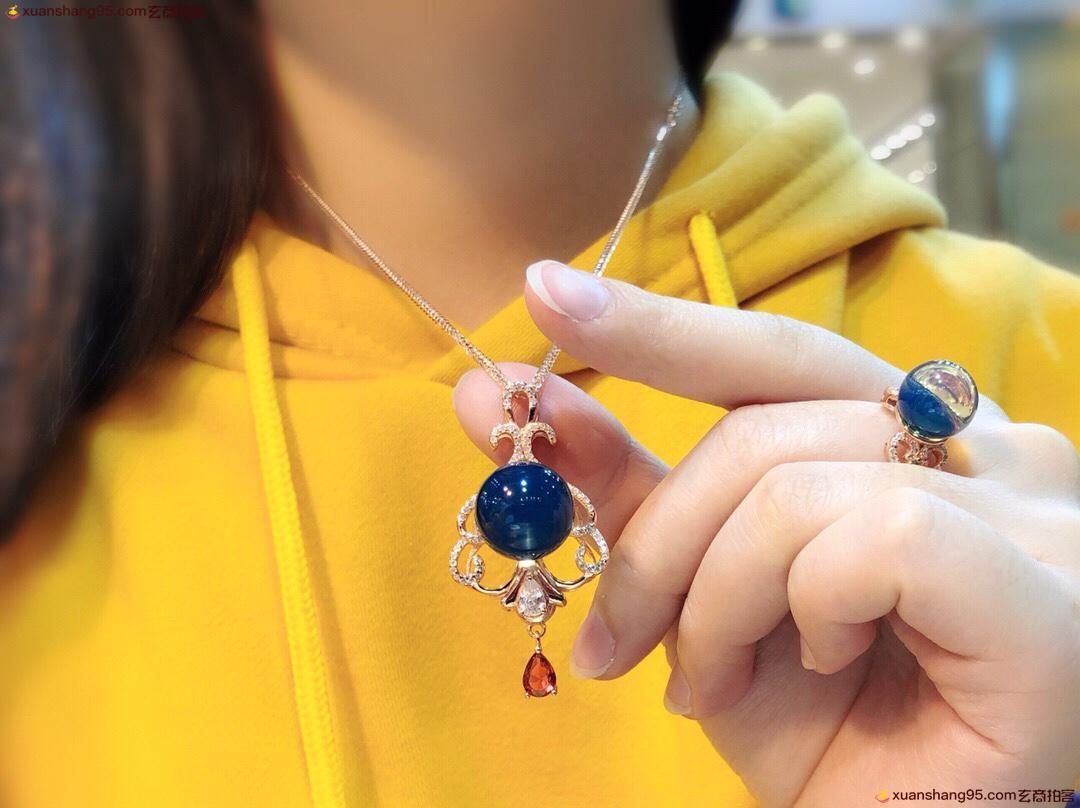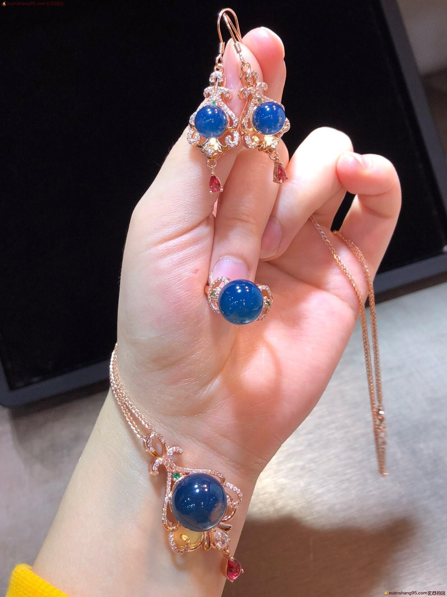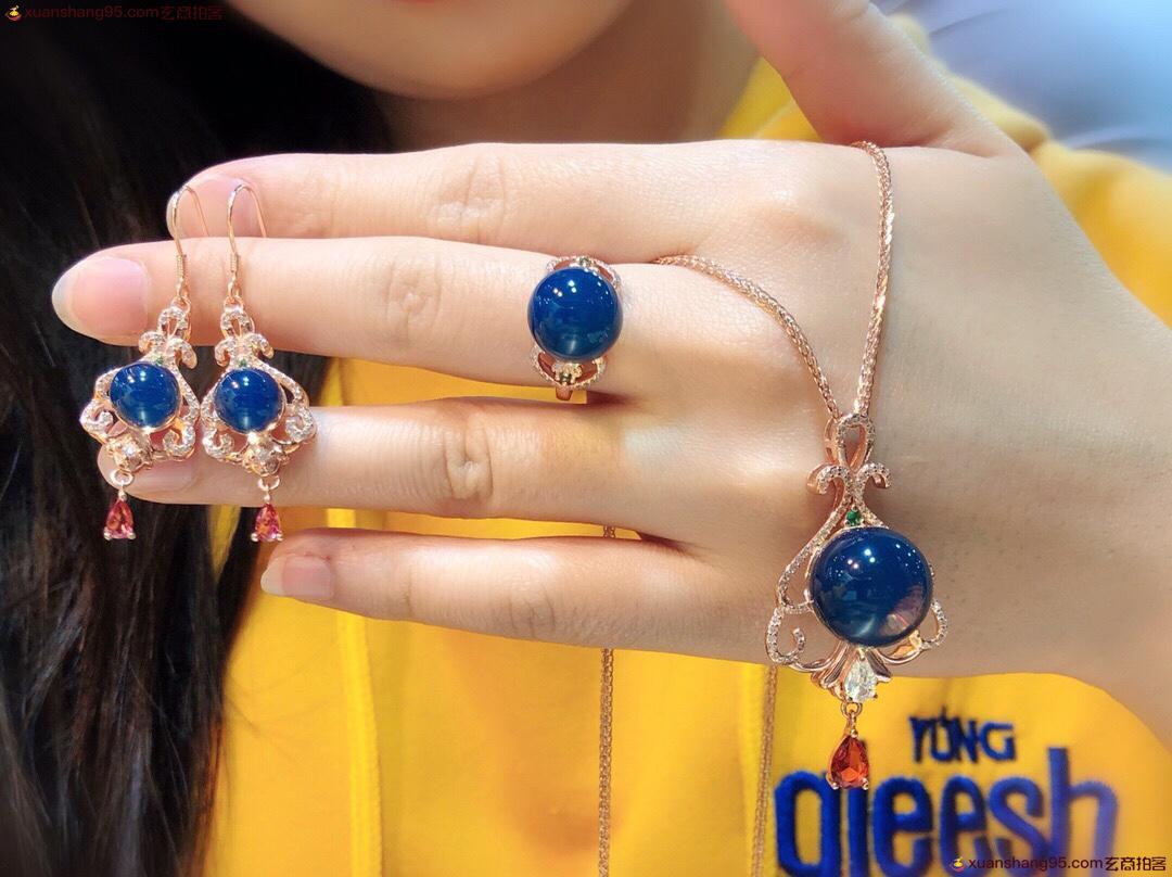 *品 墨西哥蓝珀 三件套 顺茵镶嵌 玫瑰金 大气奢华 女神款 吊坠尺寸14毫米 耳钉8毫米 戒指11毫米。