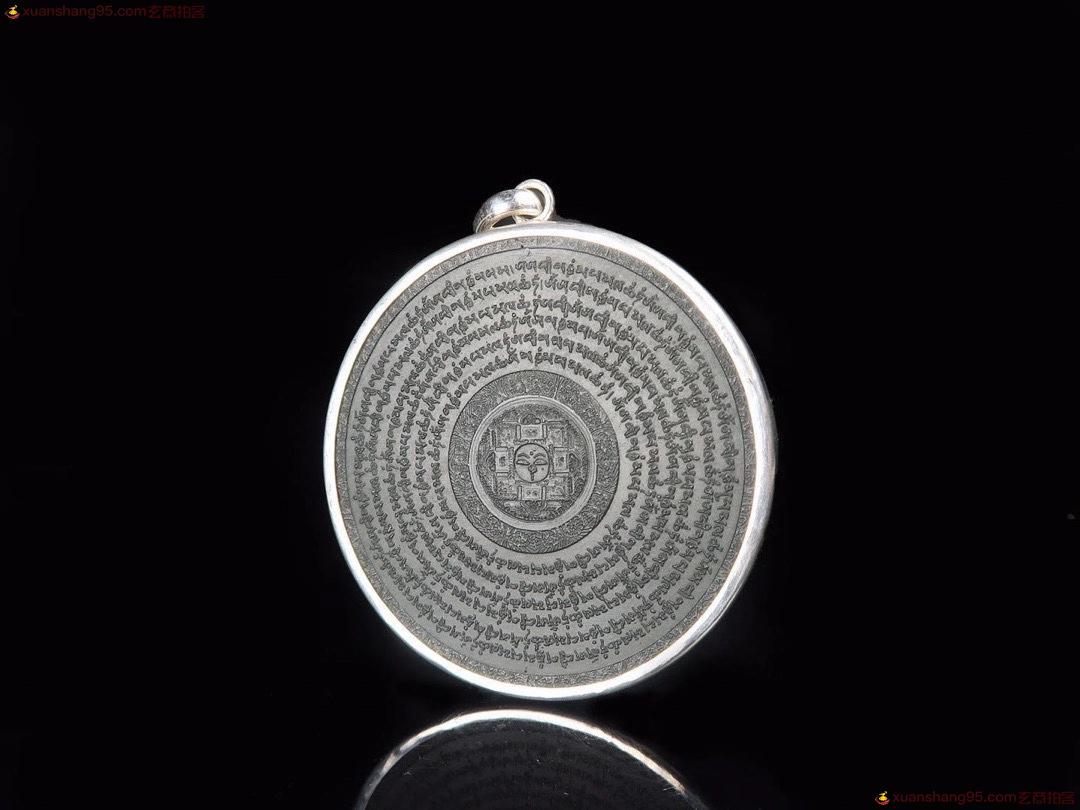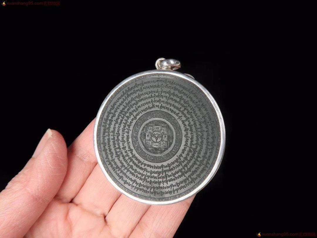 和田玉 青玉 坦城 藏语称“吉廓”,坦城作为象征于正*结构的本源,纯银镶嵌,料子细腻 *致雕,字字如丝。 尺寸50*6毫米 重量40克。