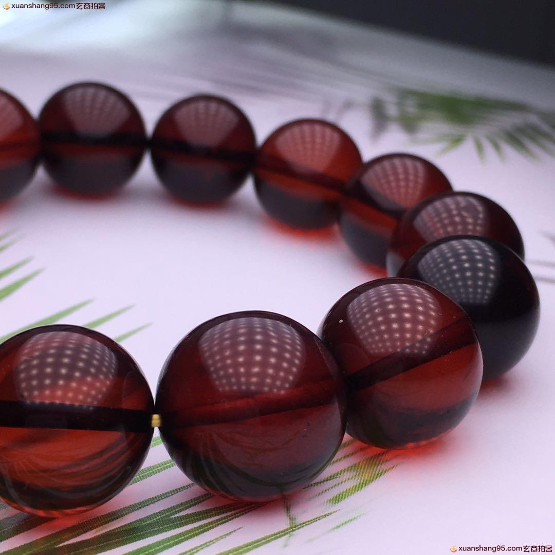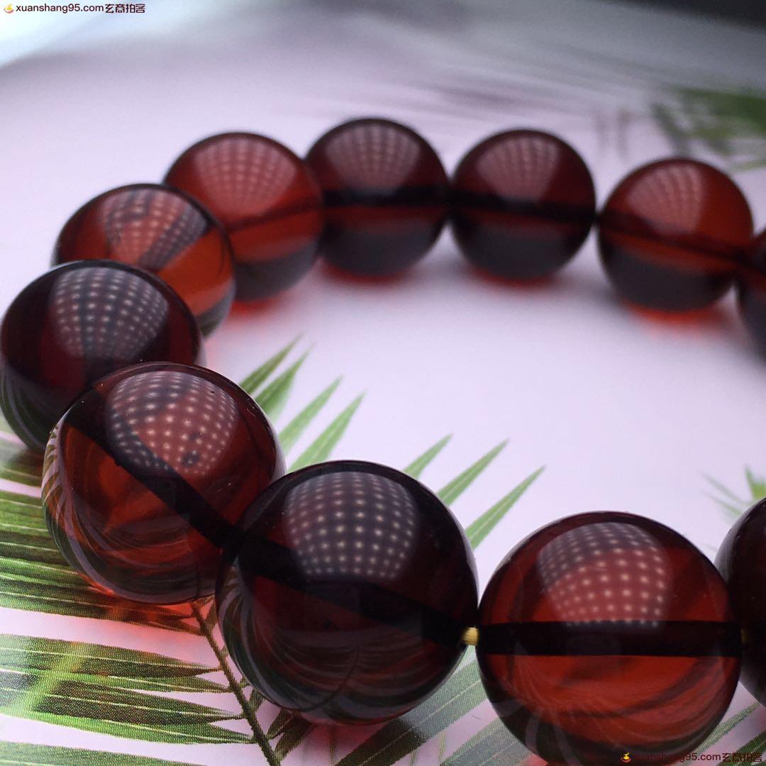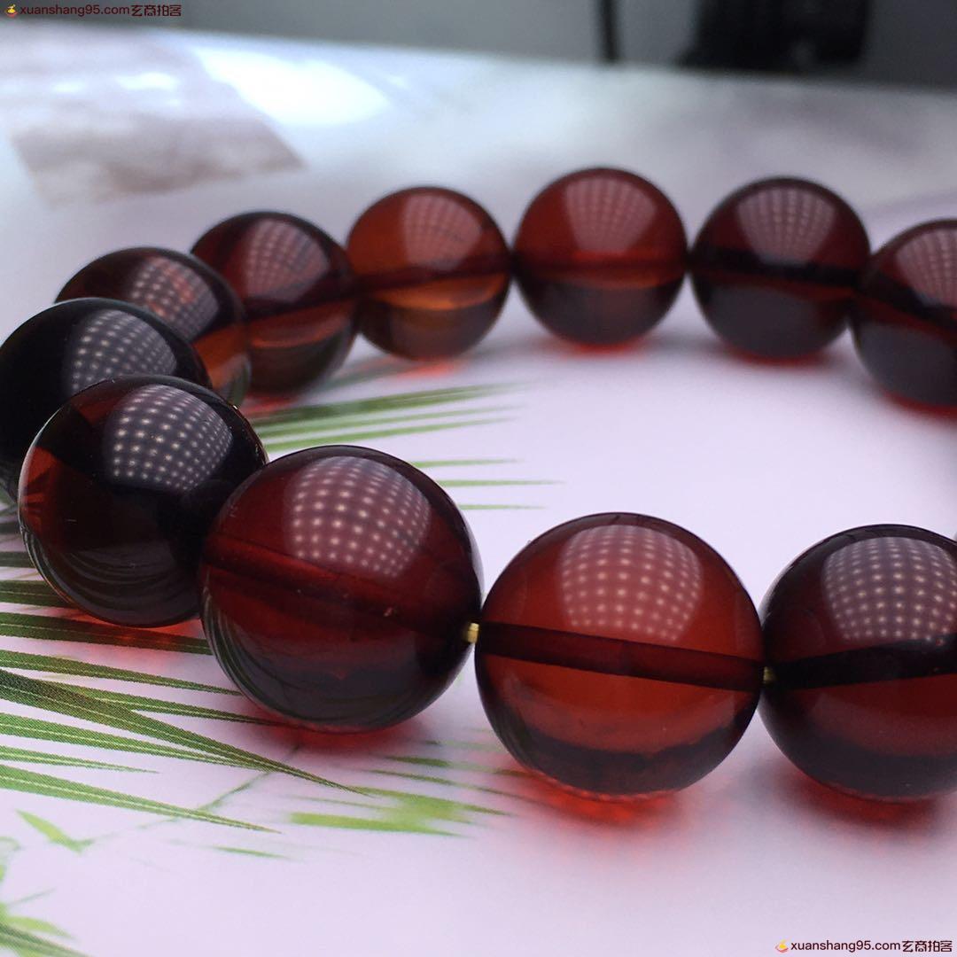 *品 酒红色 血珀手串 净水通透 颜色靓丽 天然原矿 品质如图 尺寸16毫米 重量34克。