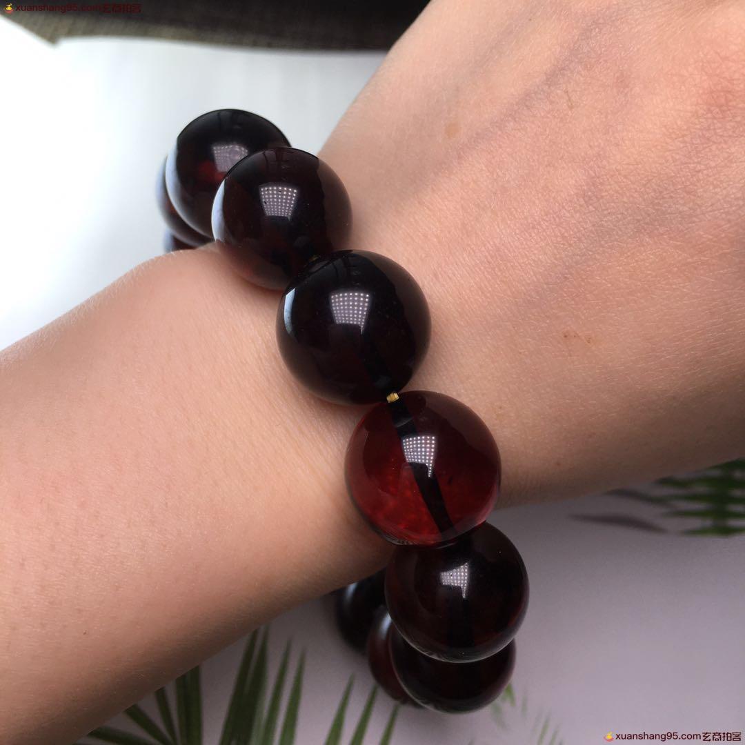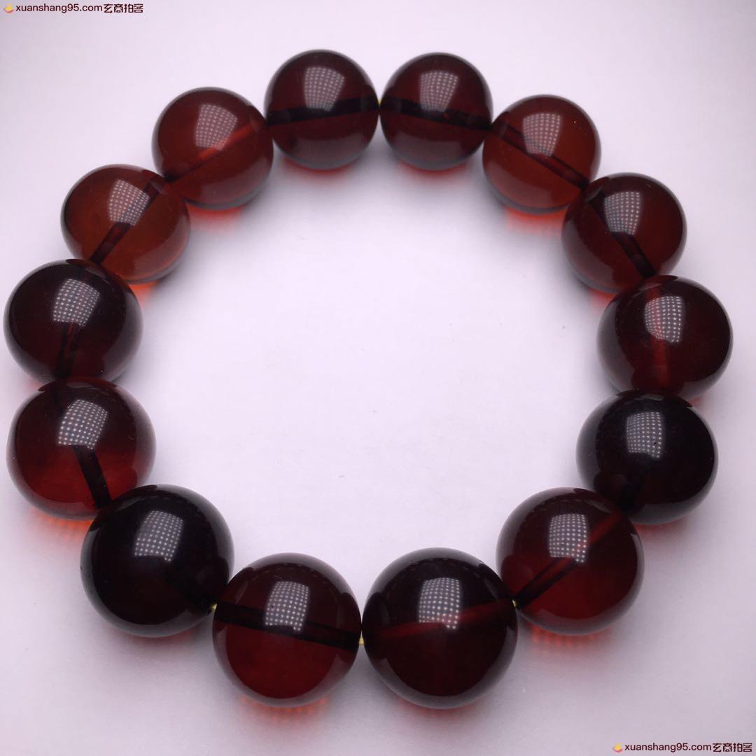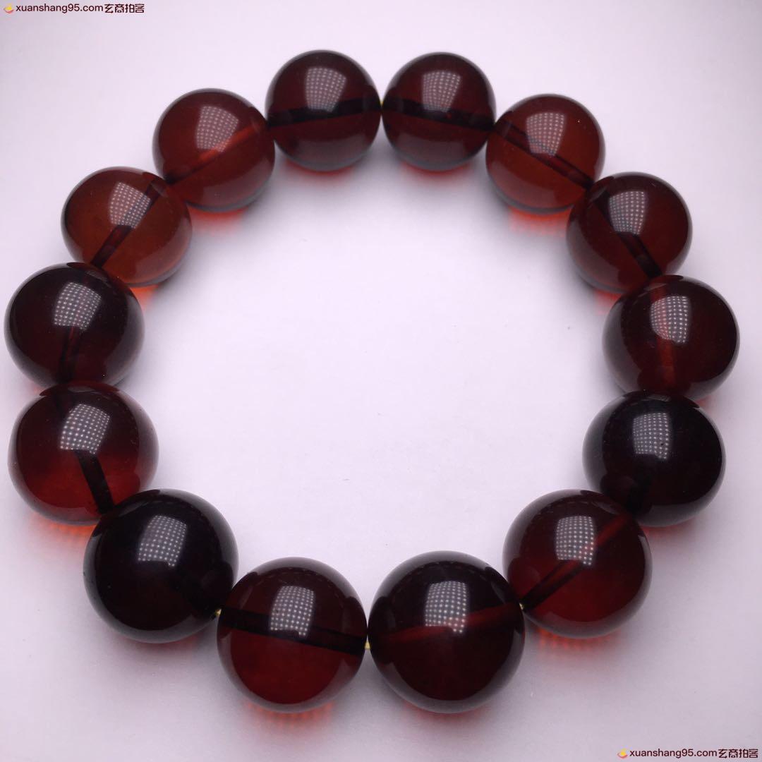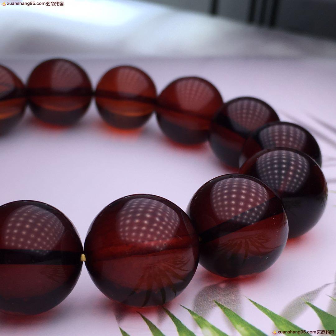 *品 酒红色 血珀手串 净水通透 颜色靓丽 天然原矿 品质如图 尺寸16毫米 重量34克。