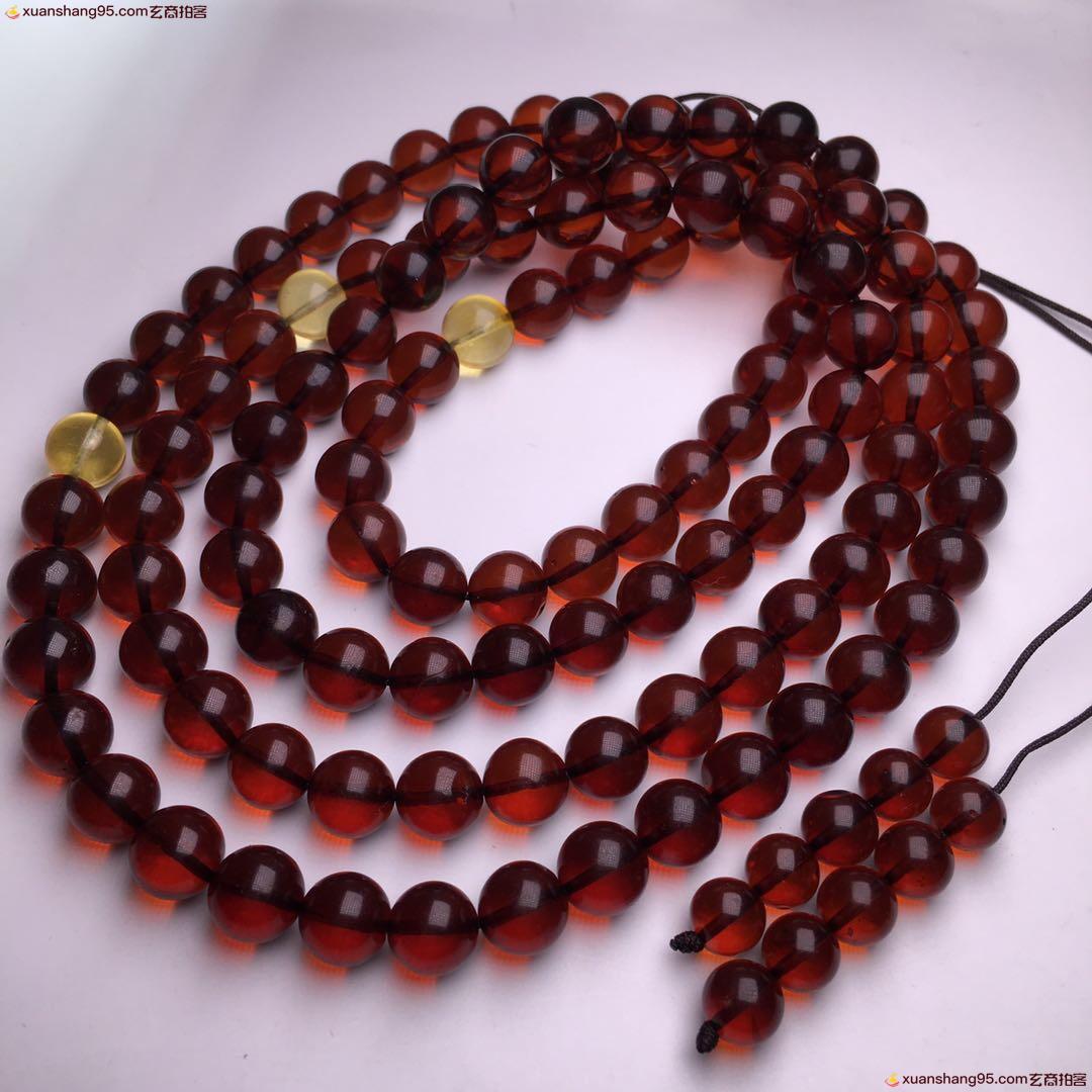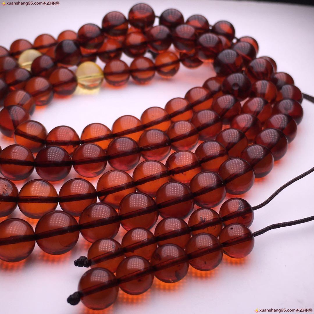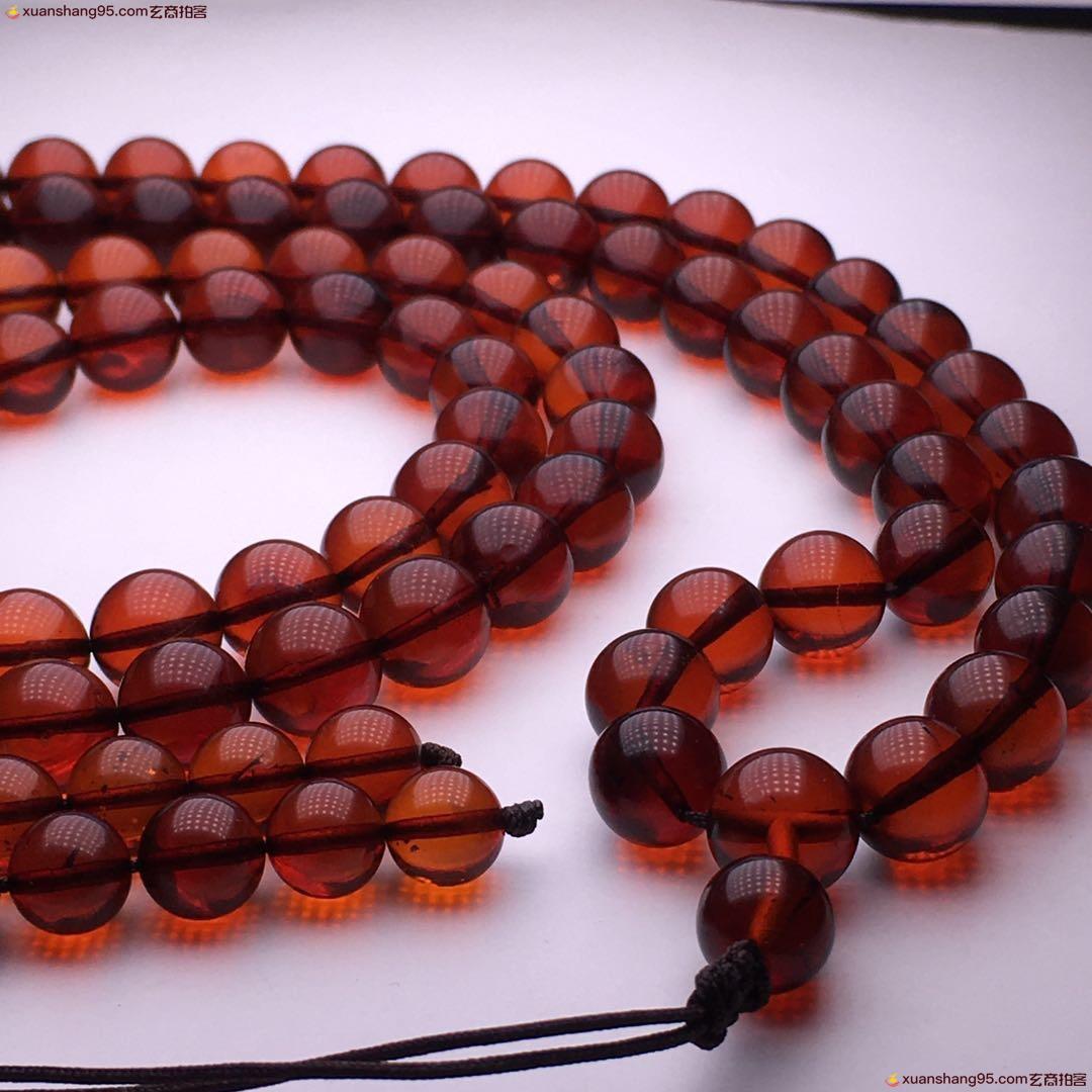 *品 酒红色 血珀108佛珠 净水通透 颜色靓丽 天然原矿 品质如图 尺寸9毫米 重量51克。