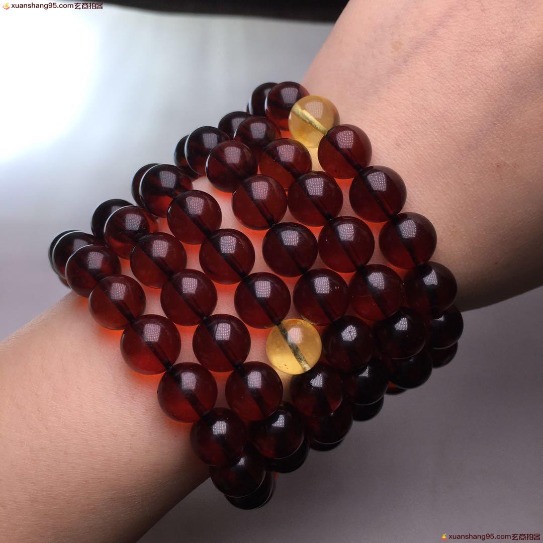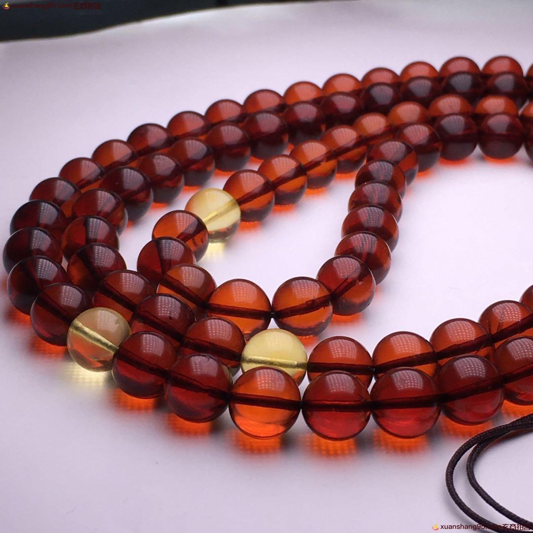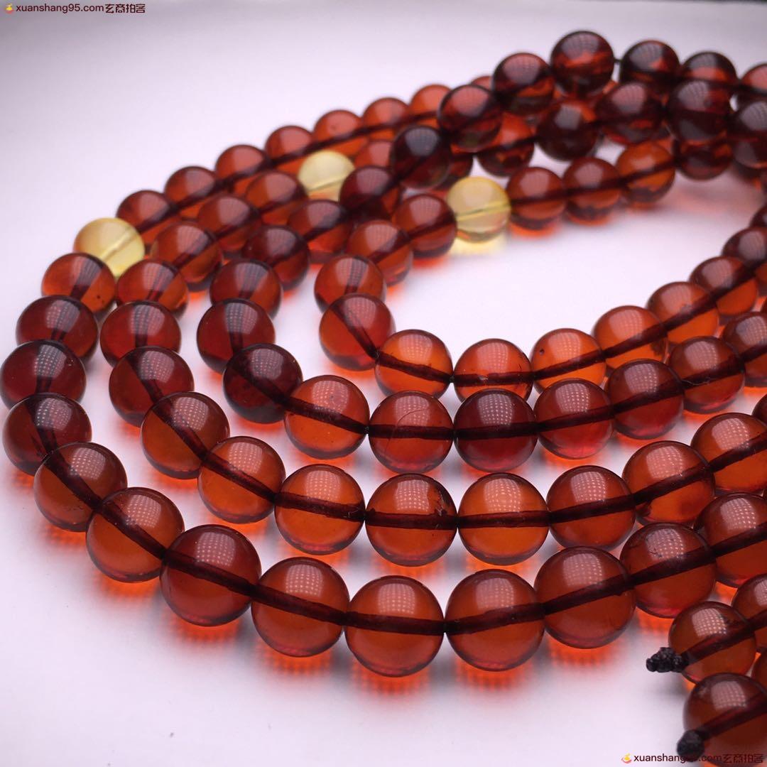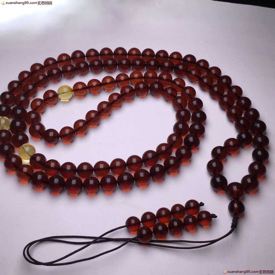 *品 酒红色 血珀108佛珠 净水通透 颜色靓丽 天然原矿 品质如图 尺寸9毫米 重量51克。