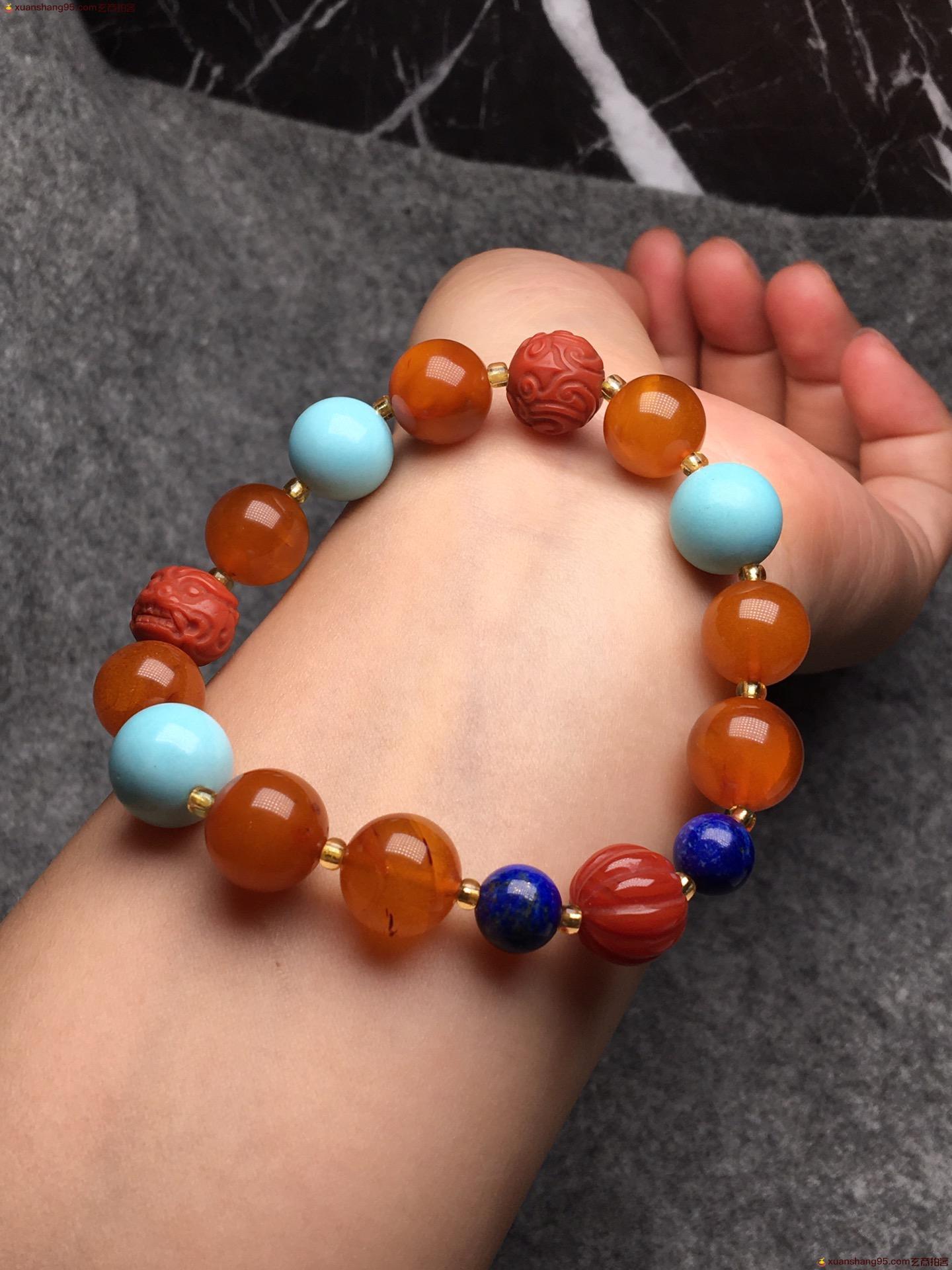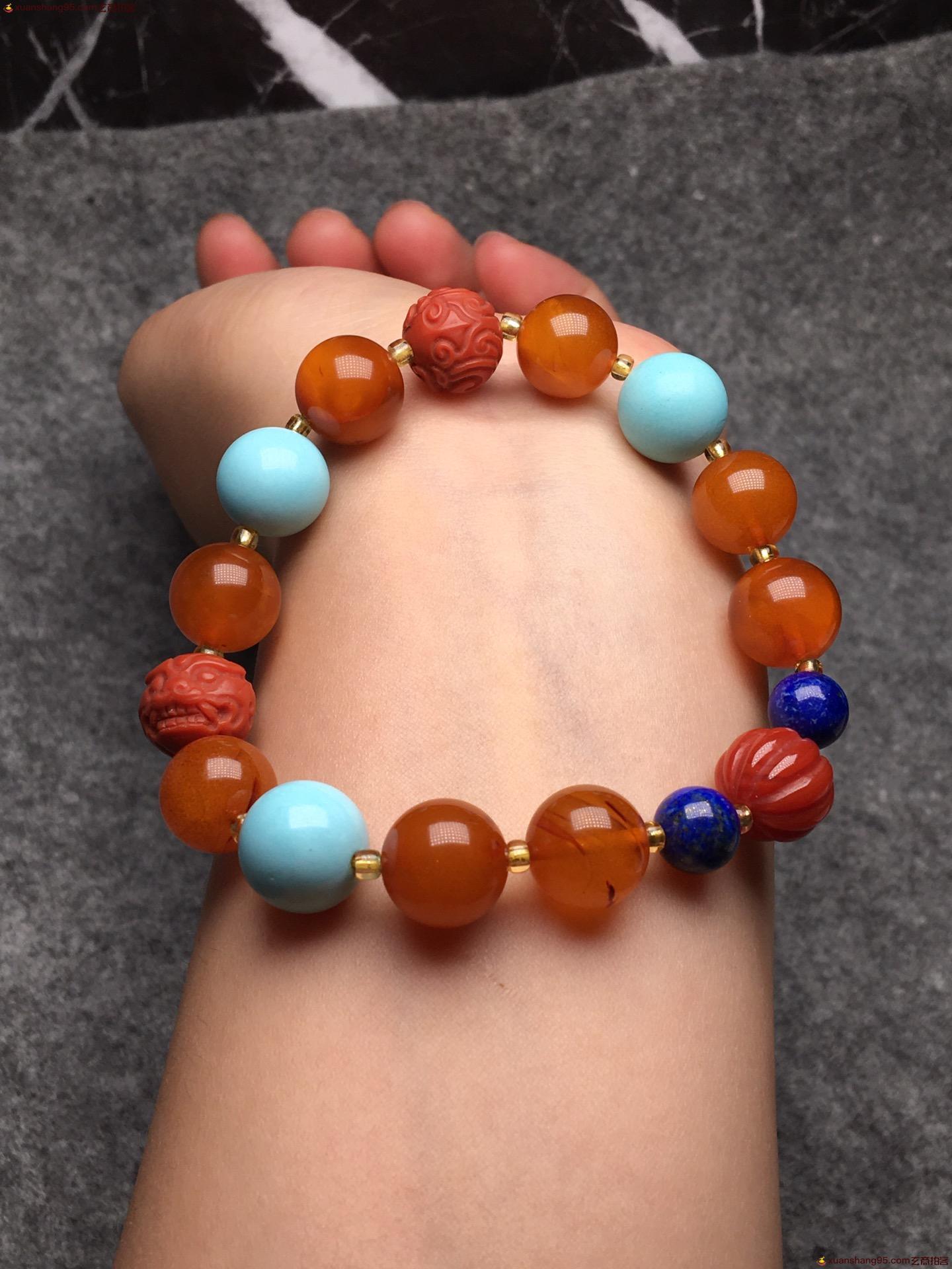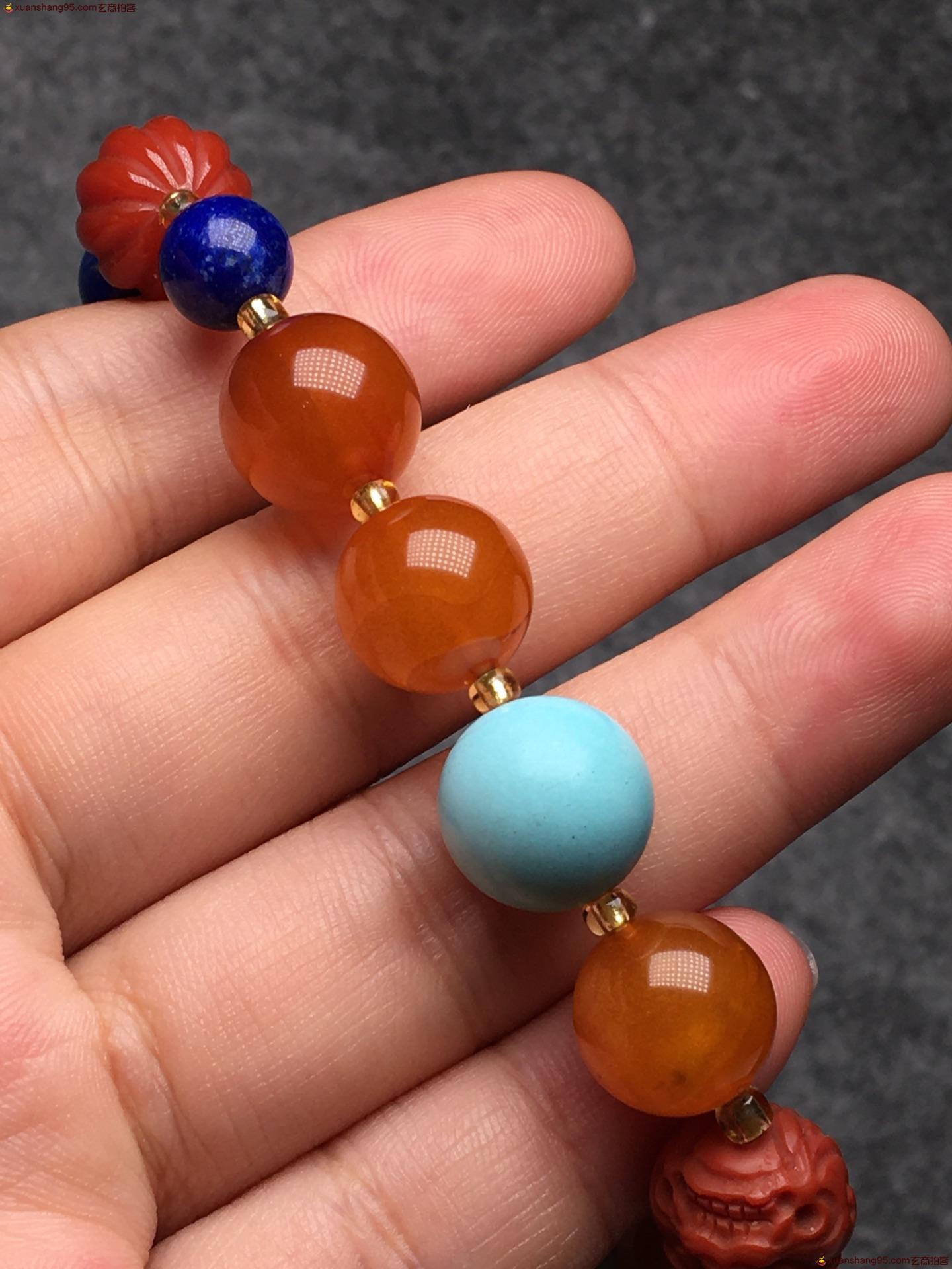 *品 橘皮 多宝手串 纯天然蜜蜡 搭戴纯天然南红 青金石 绿松石 ,尺寸11毫米 重量21克。