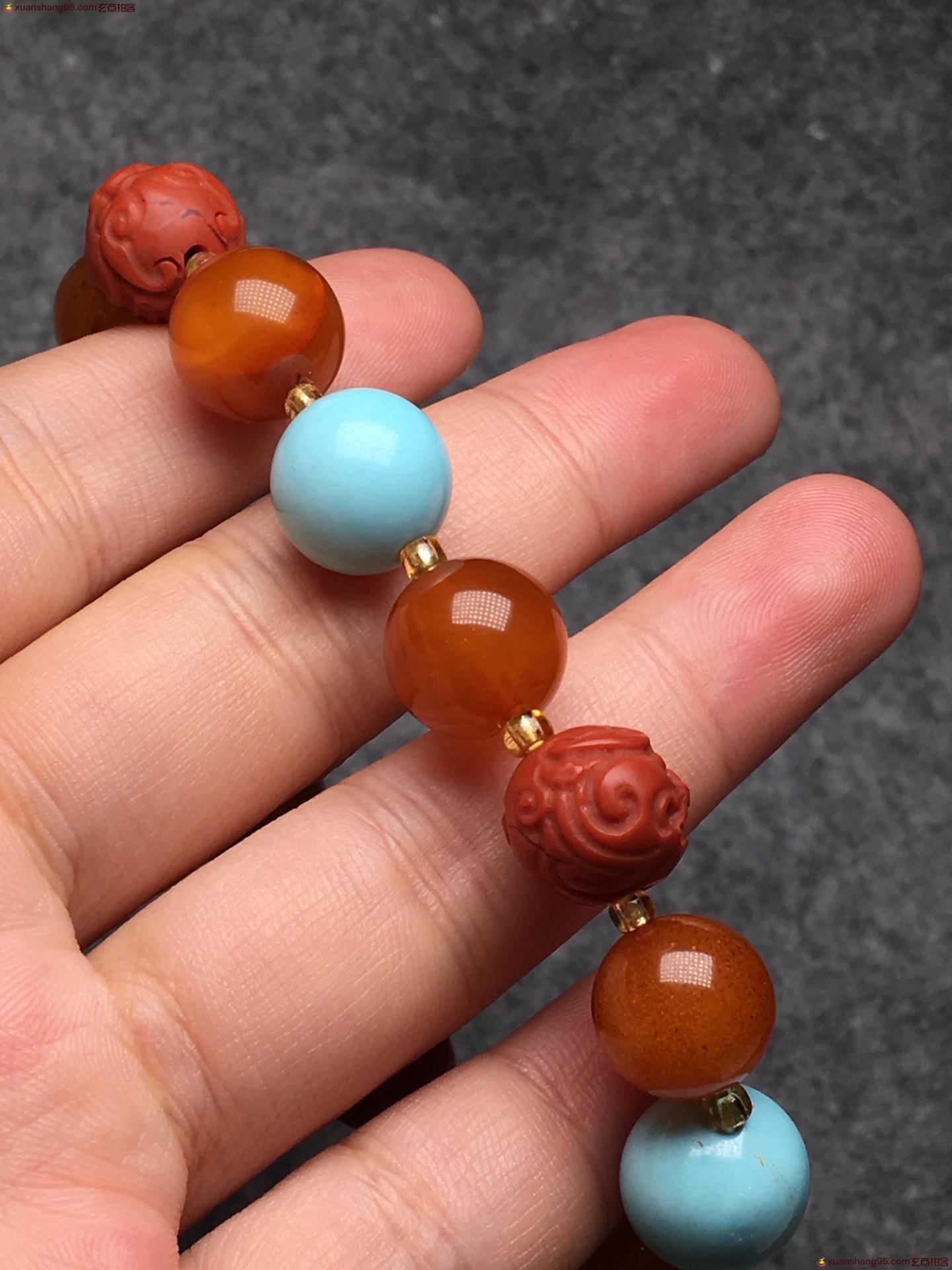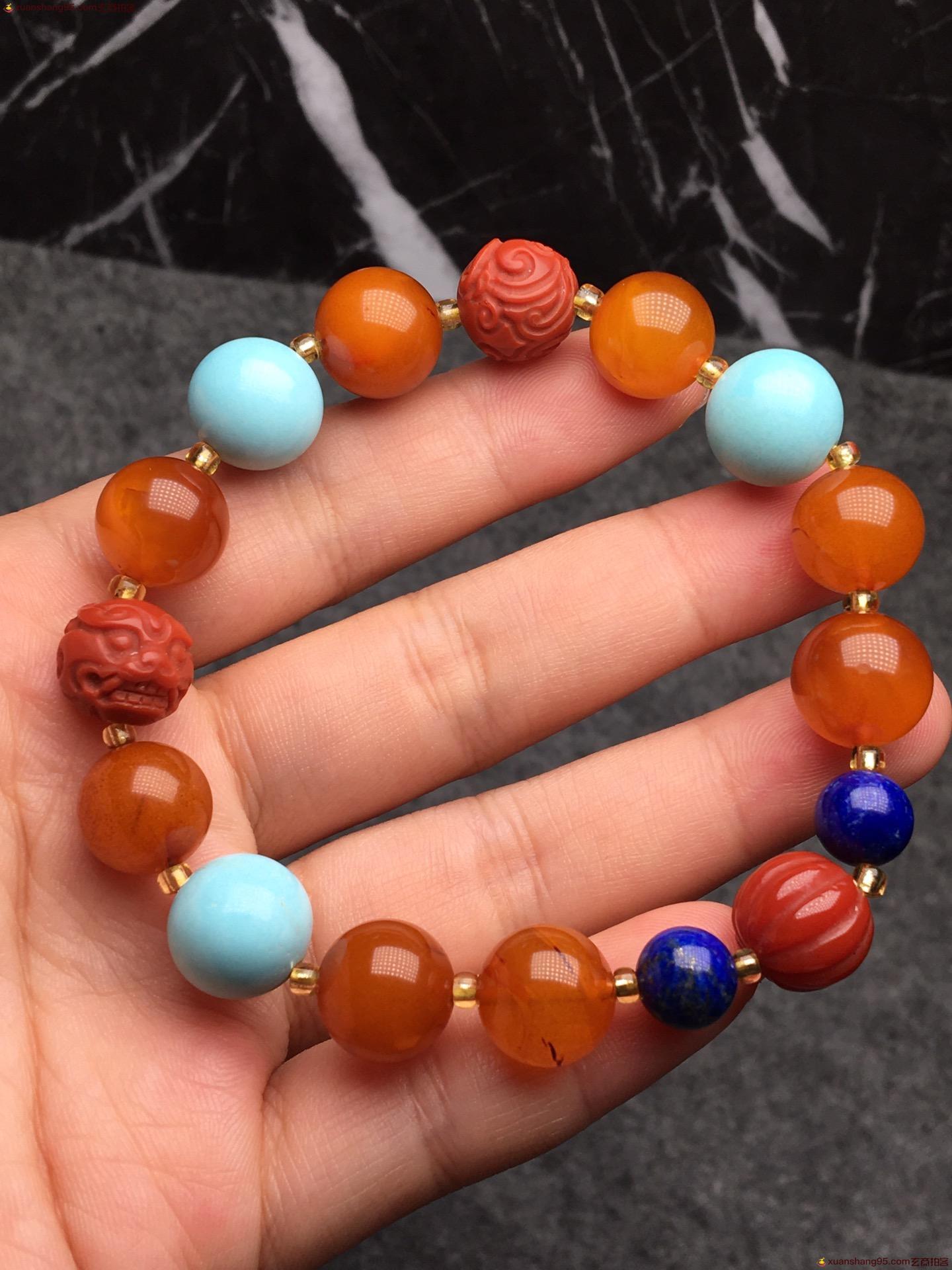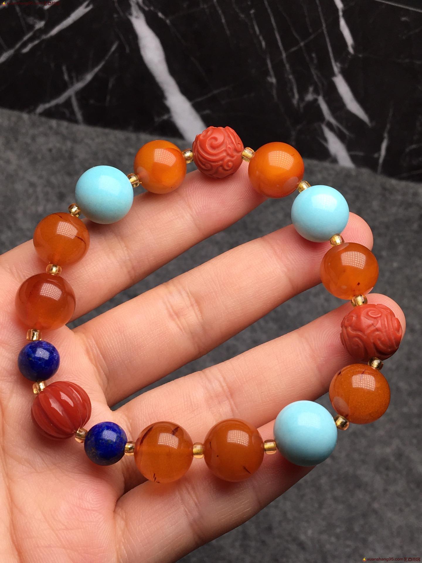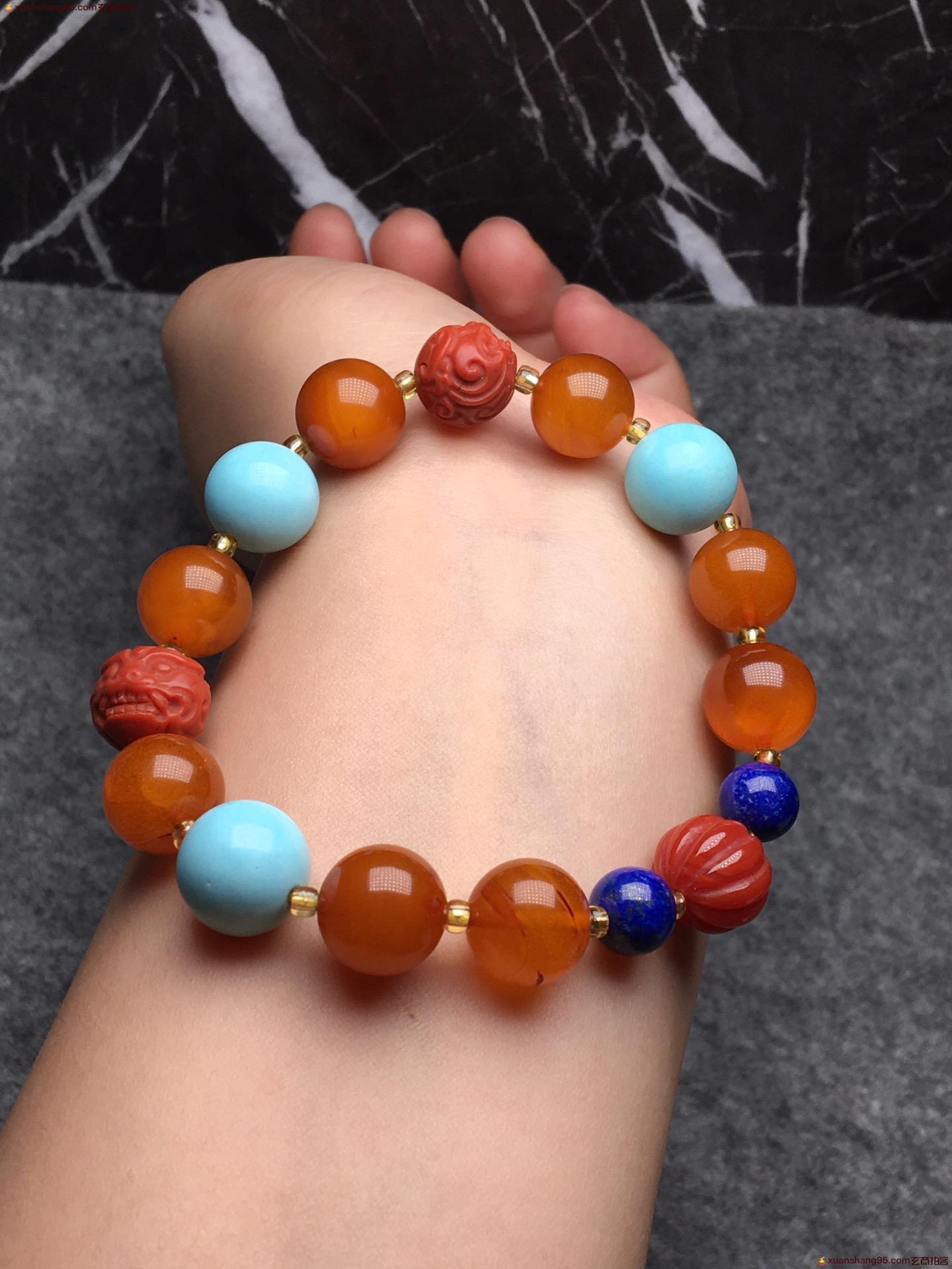 *品 橘皮 多宝手串 纯天然蜜蜡 搭戴纯天然南红 青金石 绿松石 ,尺寸11毫米 重量21克。