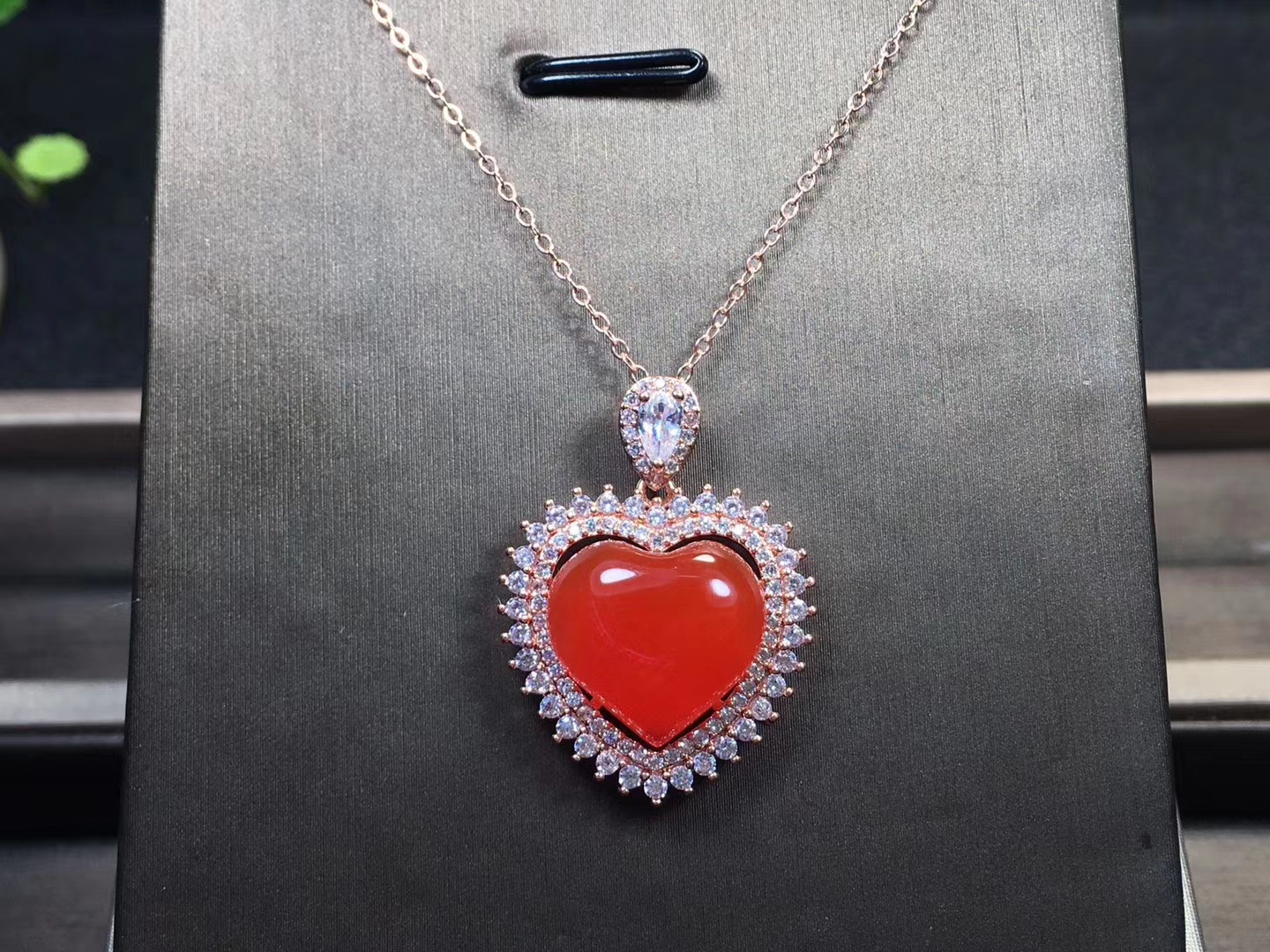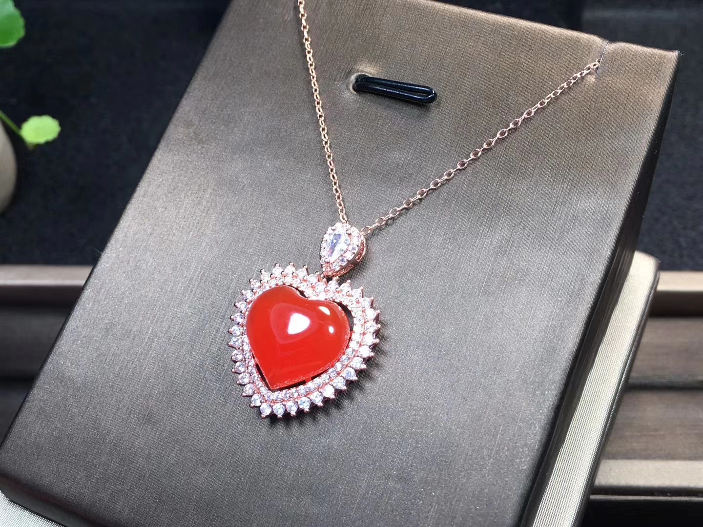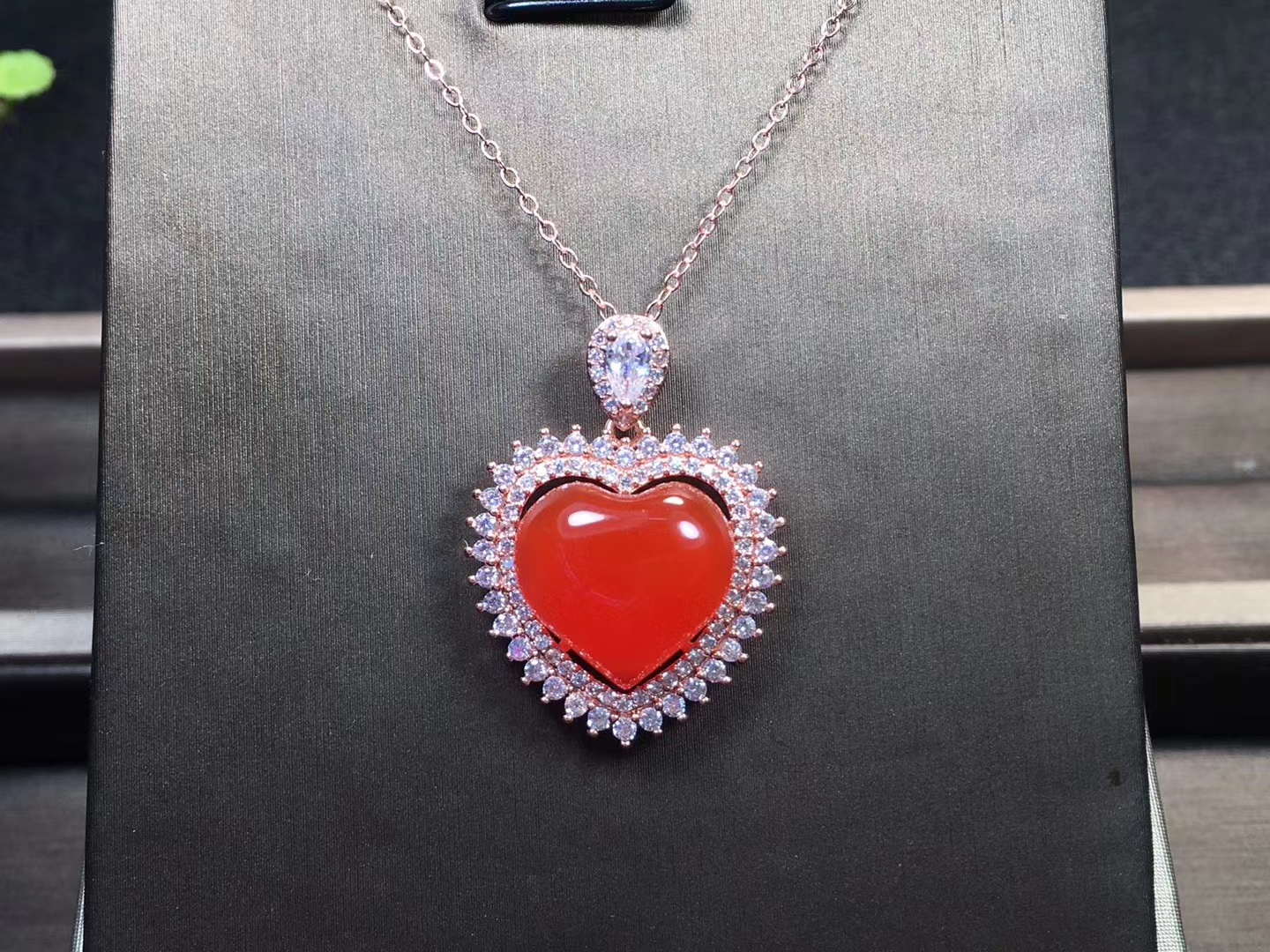 *品 冰红心形吊坠 S925银玫瑰金镶嵌,带钻,荧光强,成色红润,上身漂亮。尺寸13.6×14.4毫米,收藏佩戴佳品。