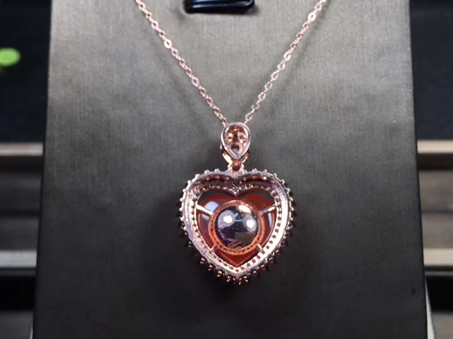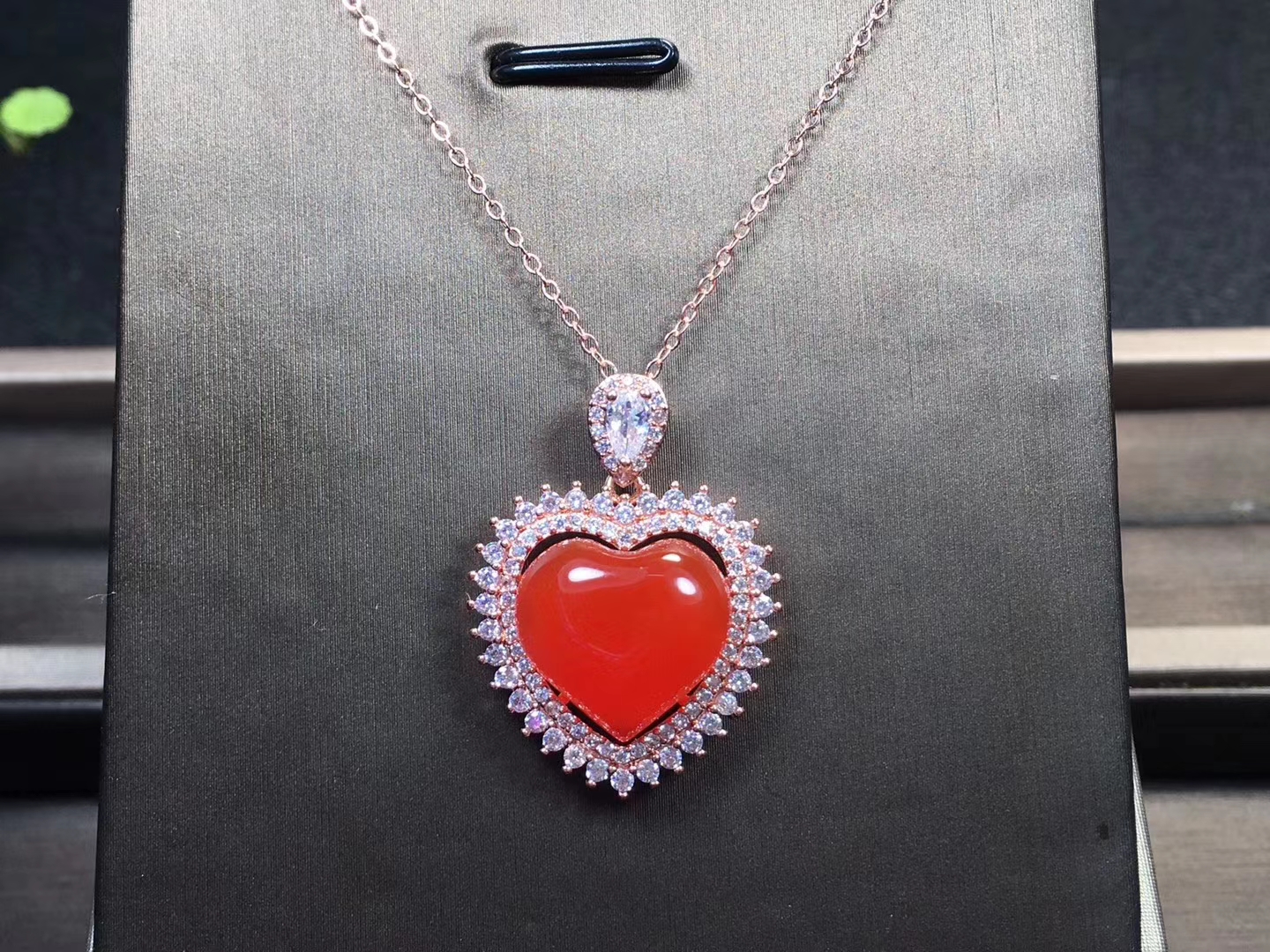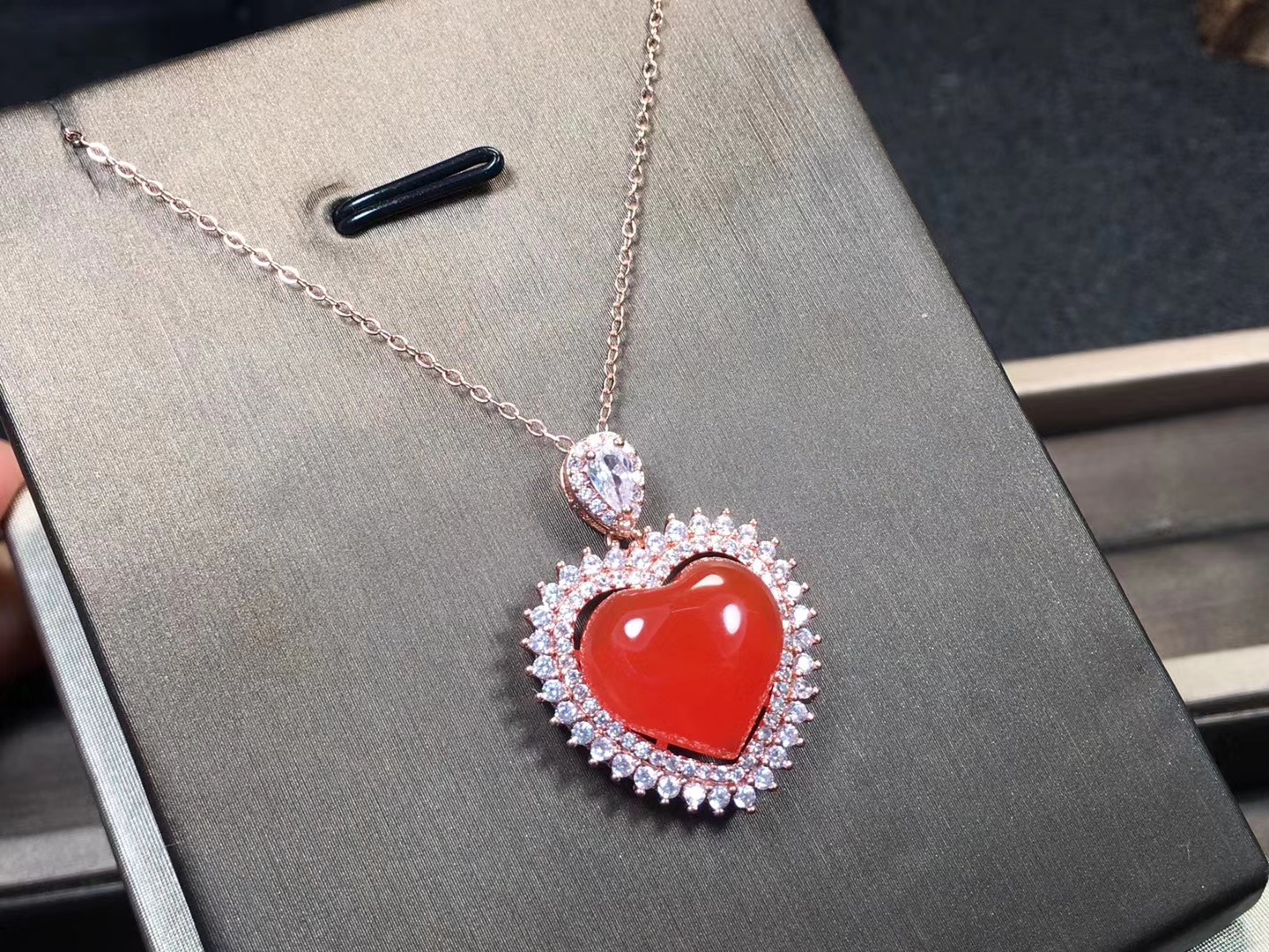 *品 冰红心形吊坠 S925银玫瑰金镶嵌,带钻,荧光强,成色红润,上身漂亮。尺寸13.6×14.4毫米,收藏佩戴佳品。