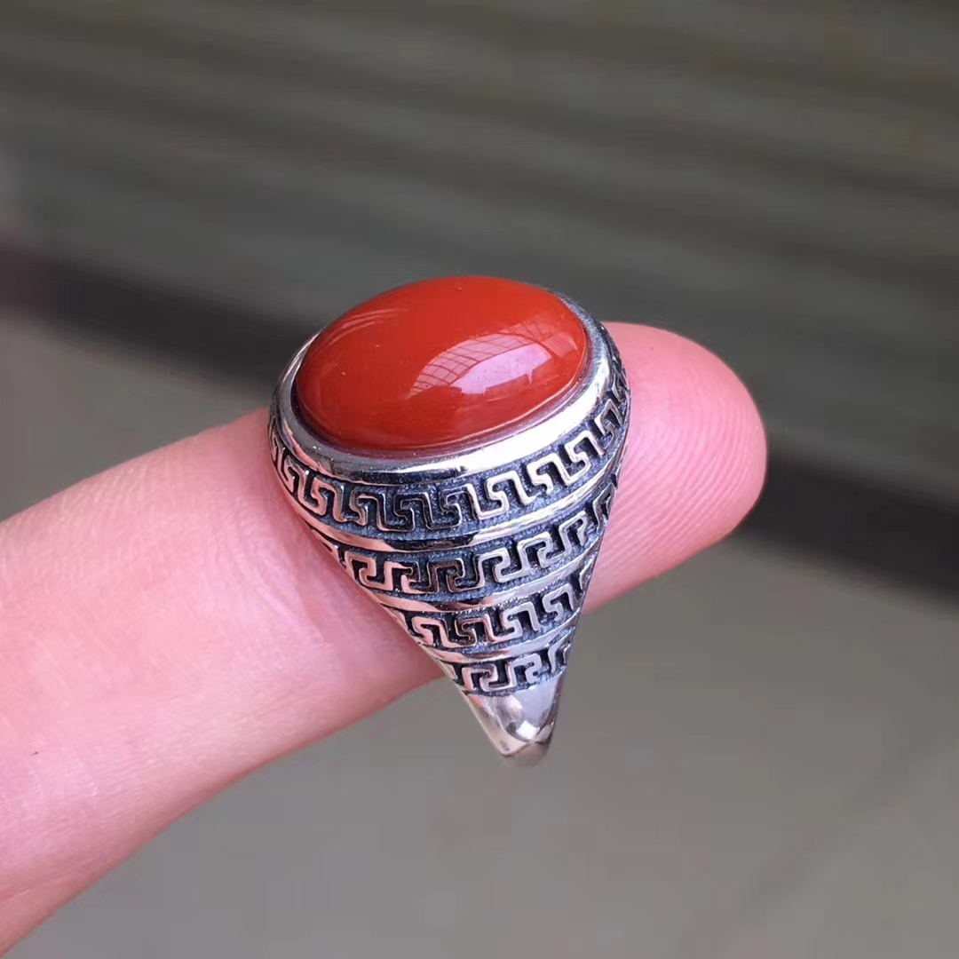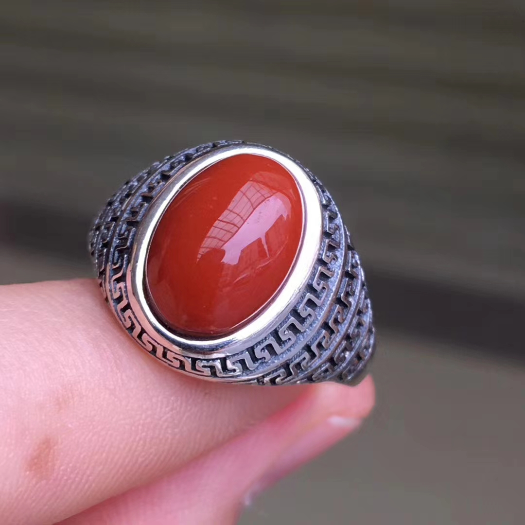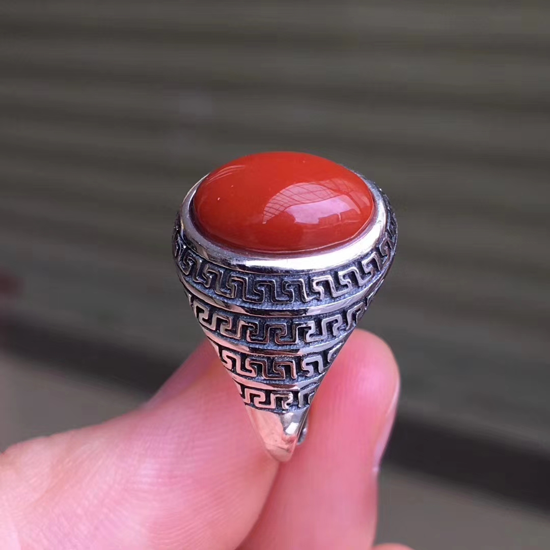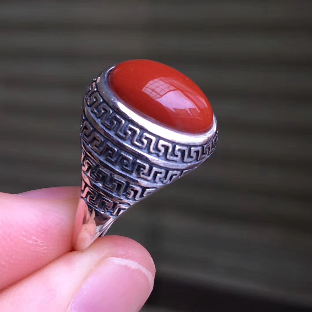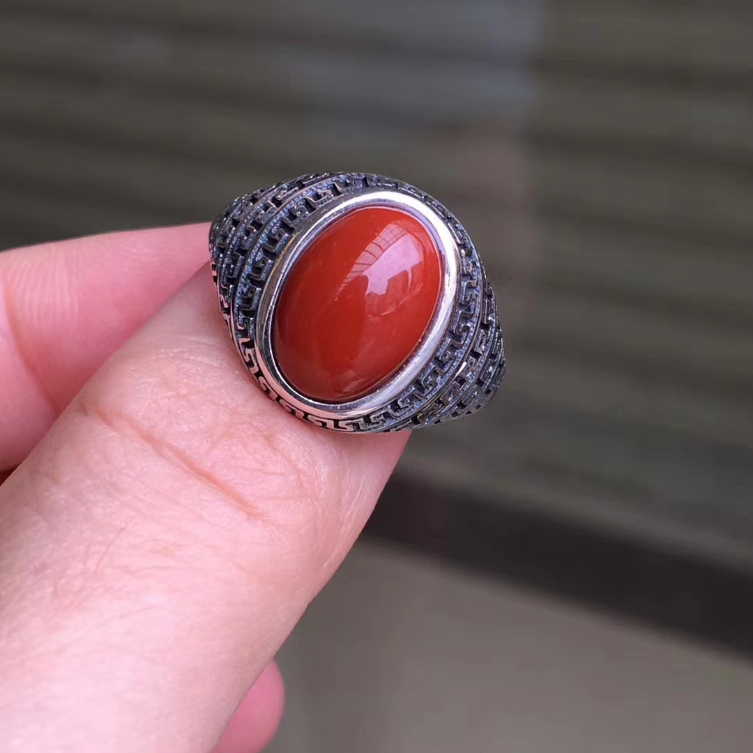 精品柿子红 戒指 红满色满肉 复古银镶嵌 满色满肉 全品无瑕疵。戒指裸面尺寸12×8.5毫米,戒托活口,附带精美礼盒和鉴定证书。