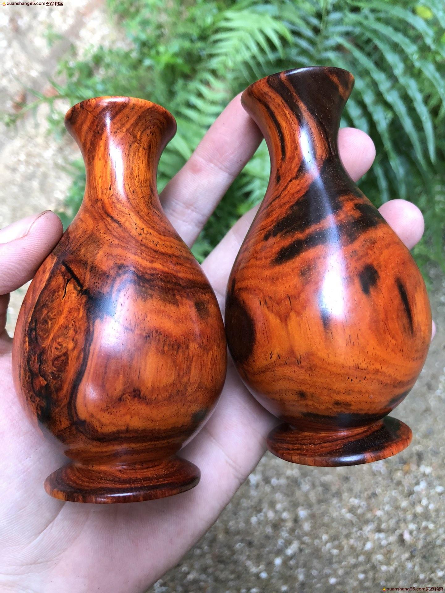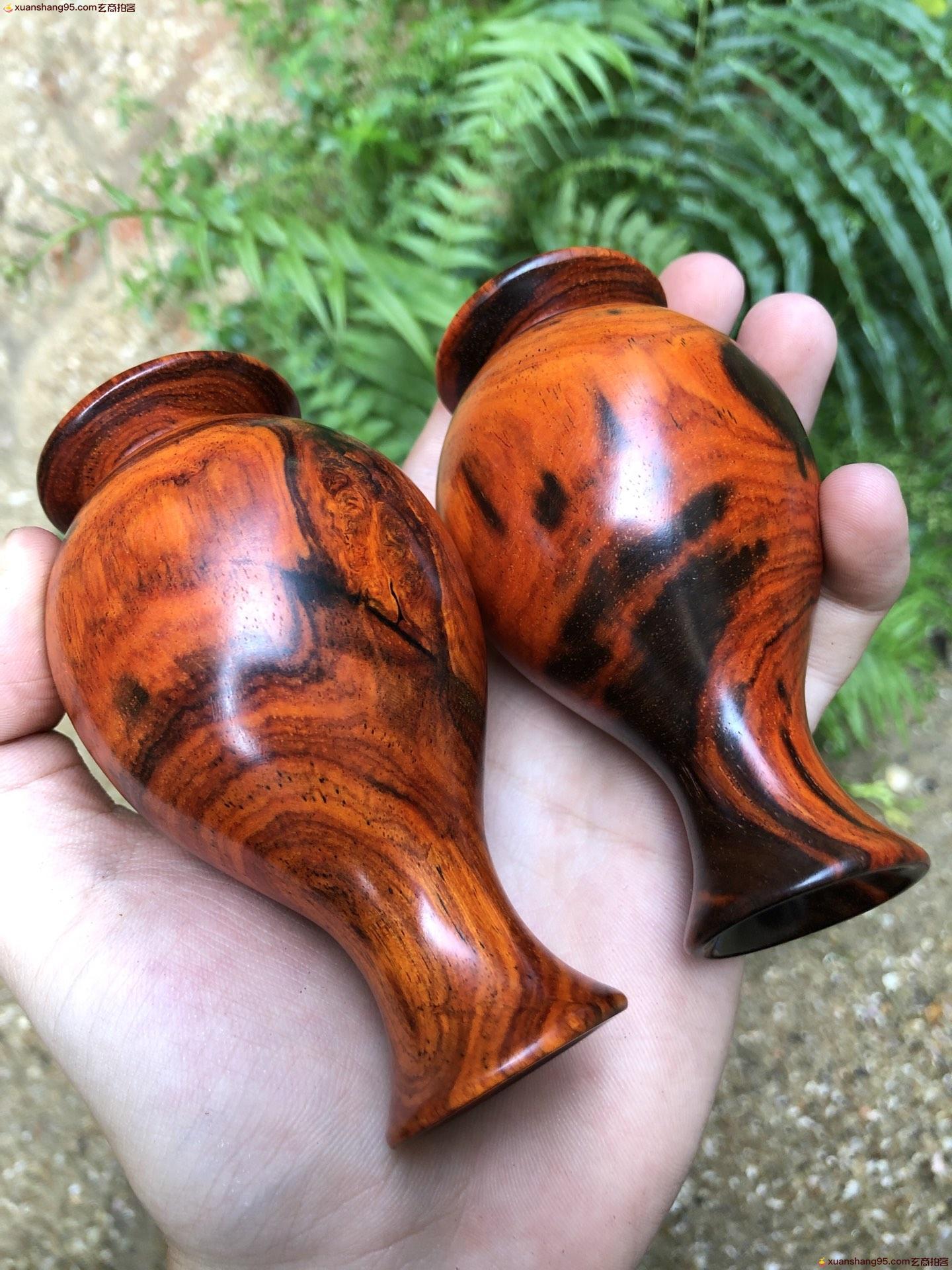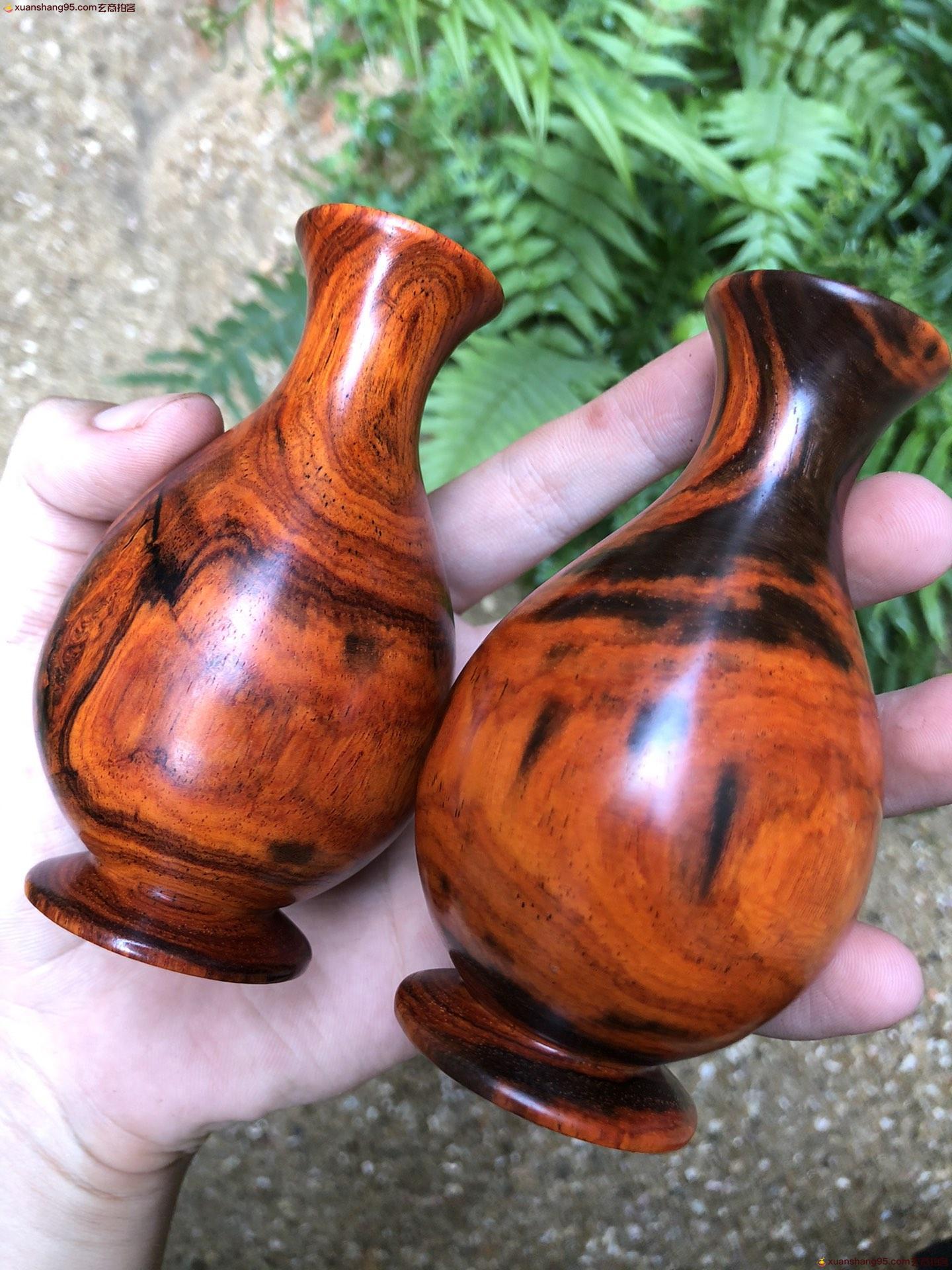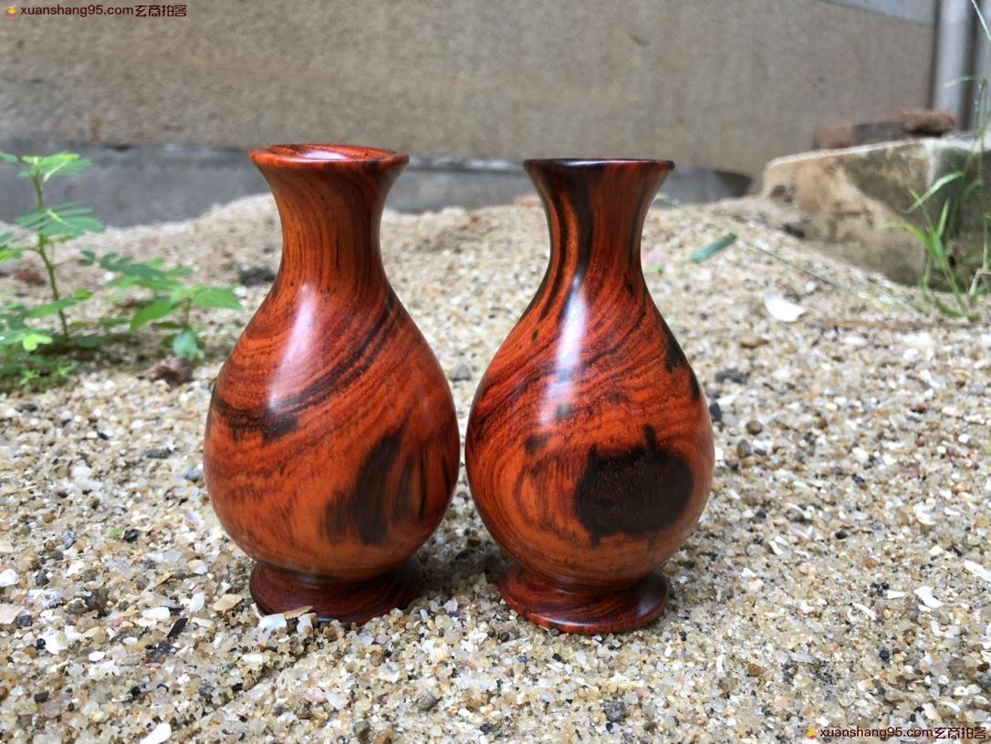 老挝 大红酸枝 花瓶一对 零瑕疵 料子油性高 密度高 一木两器 做工一流 。高10厘米 直径5.6厘米 重量0.5斤。