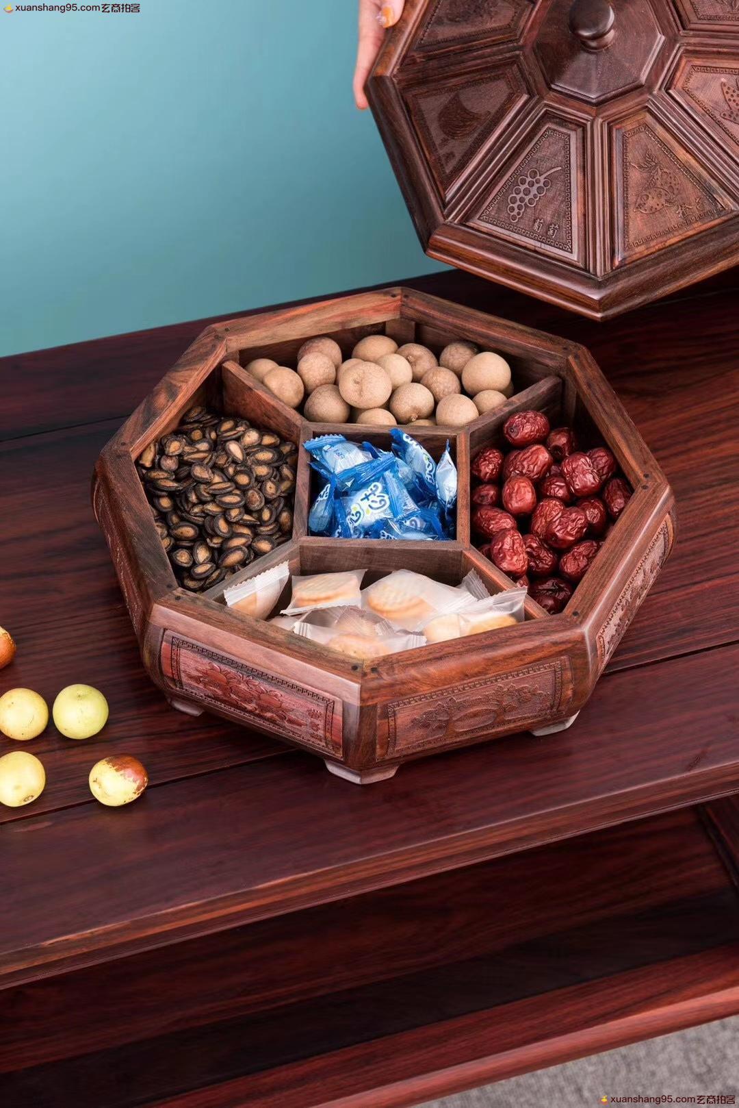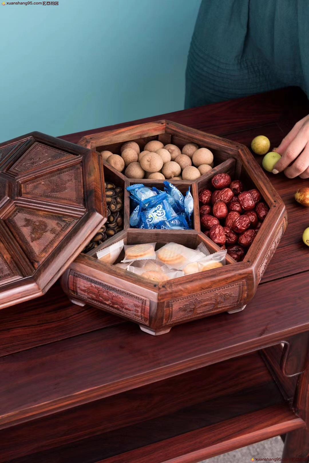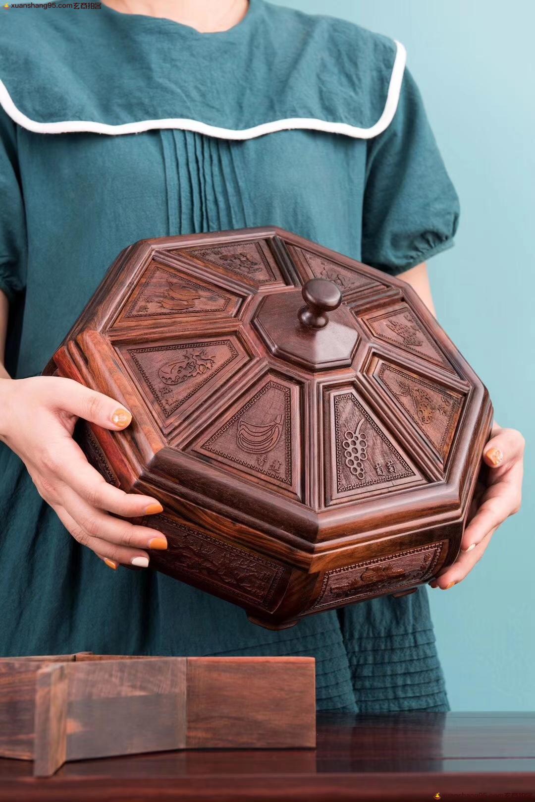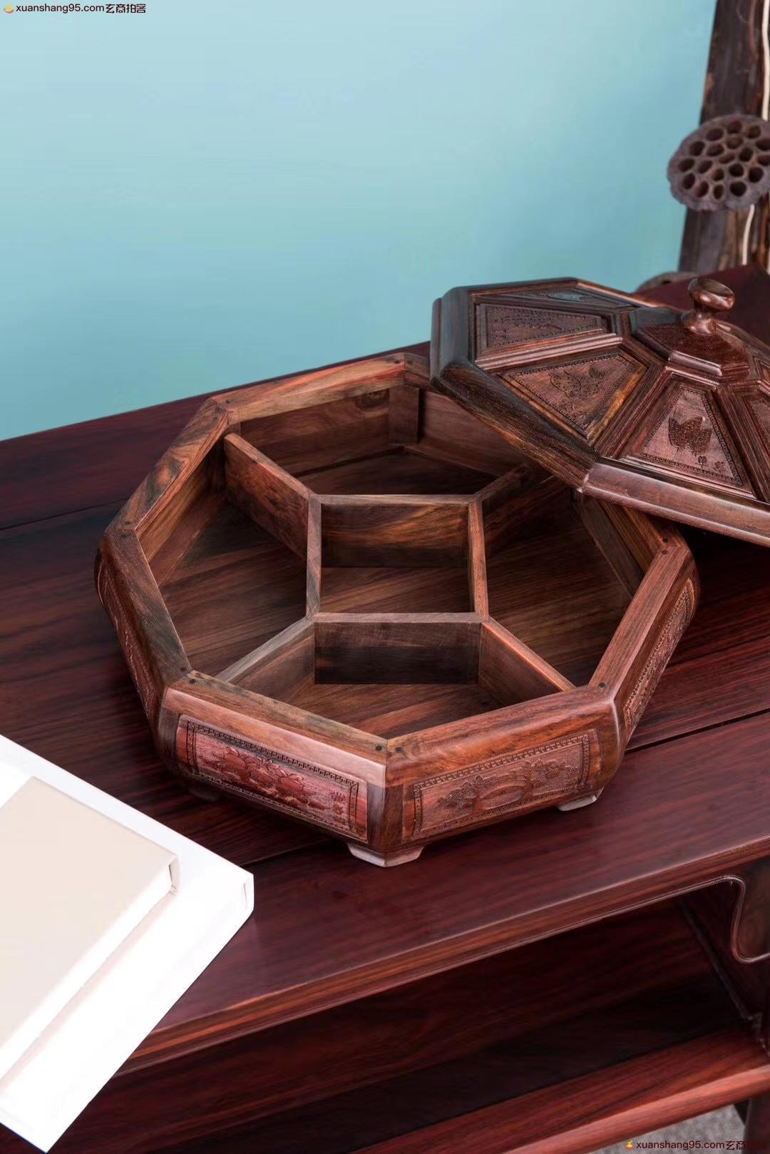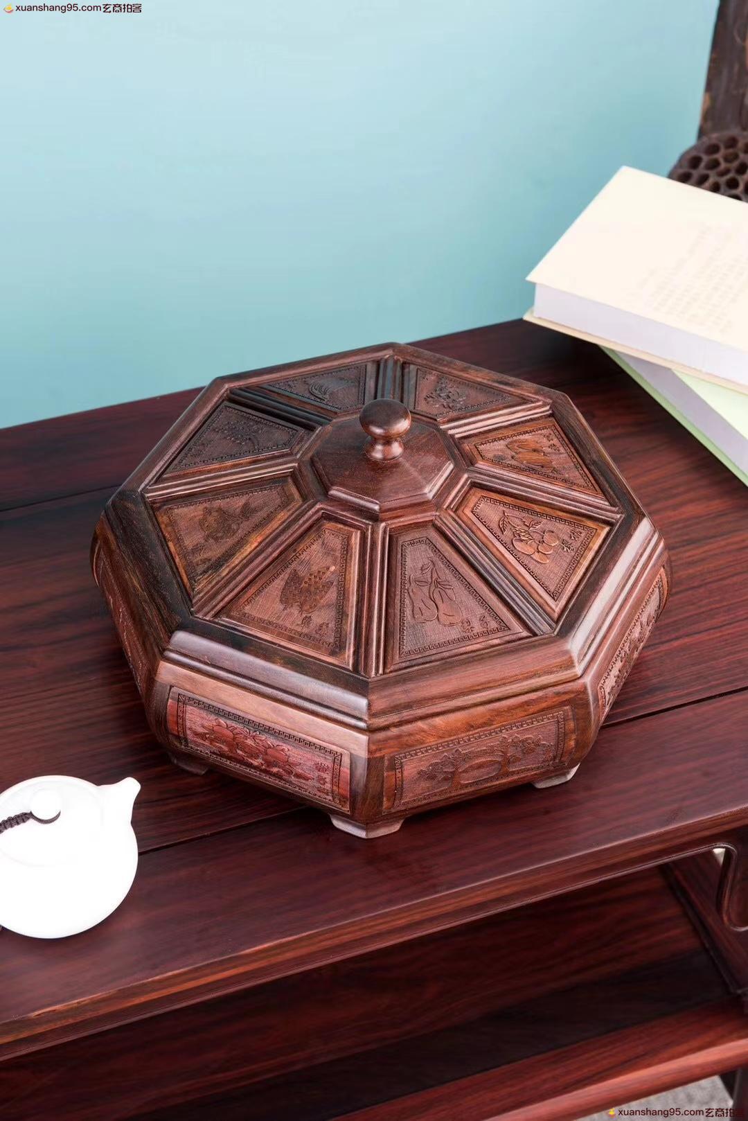 老挝 大红酸枝 八角水果盘 外围雕花 仙做工艺 榫卯结构 八角外观设计,容量更大,实用收藏佳品,尺寸32*32*17厘米。