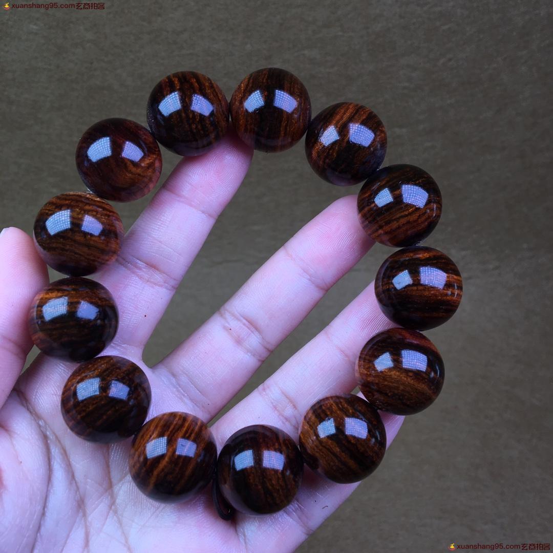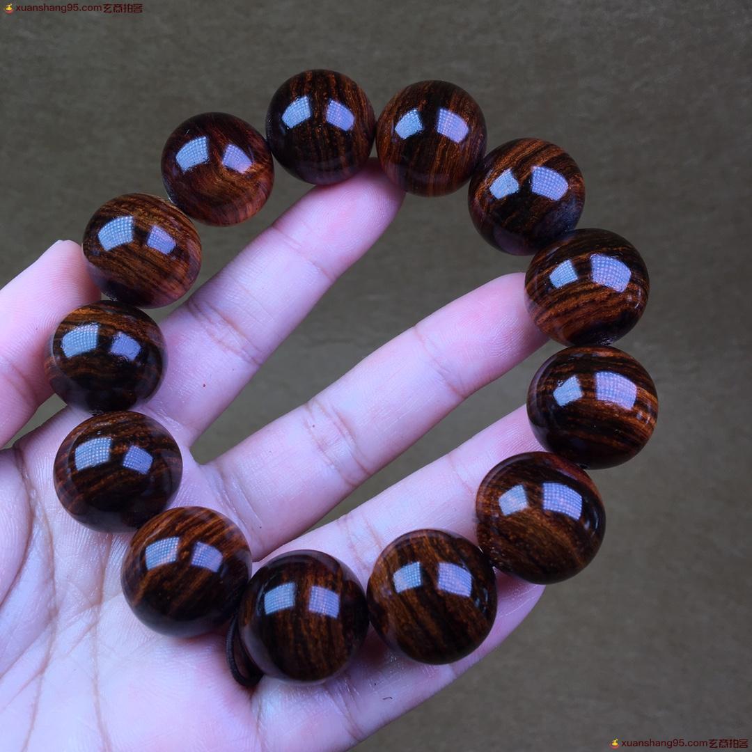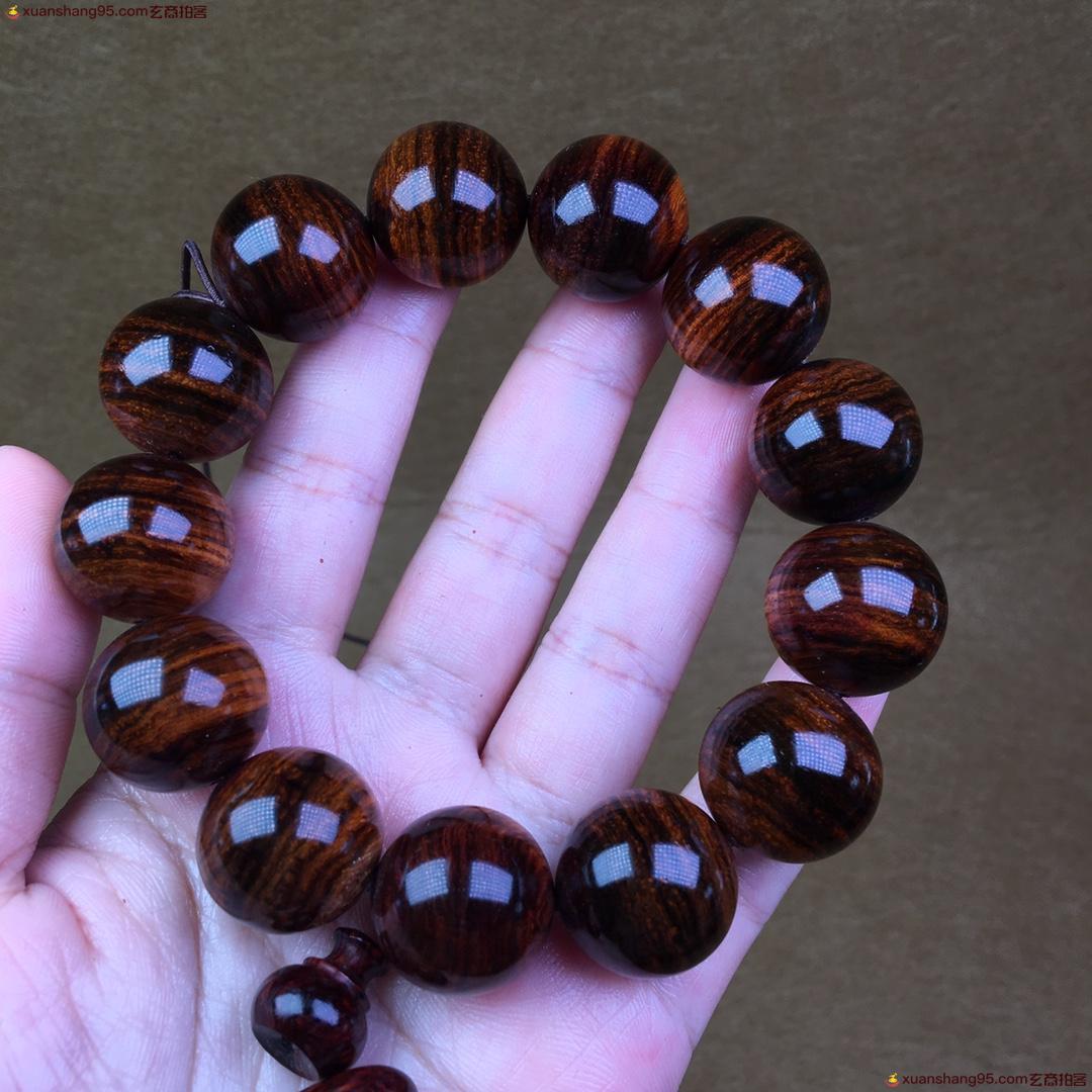 海南黄花梨 紫油梨 1.8手串 顶级材质 颗颗精选 虎皮纹 美轮美奂 底色干净 纹理清晰 自然 油性十足 盘盘就出油 。尺寸1.8厘米 重量44克。