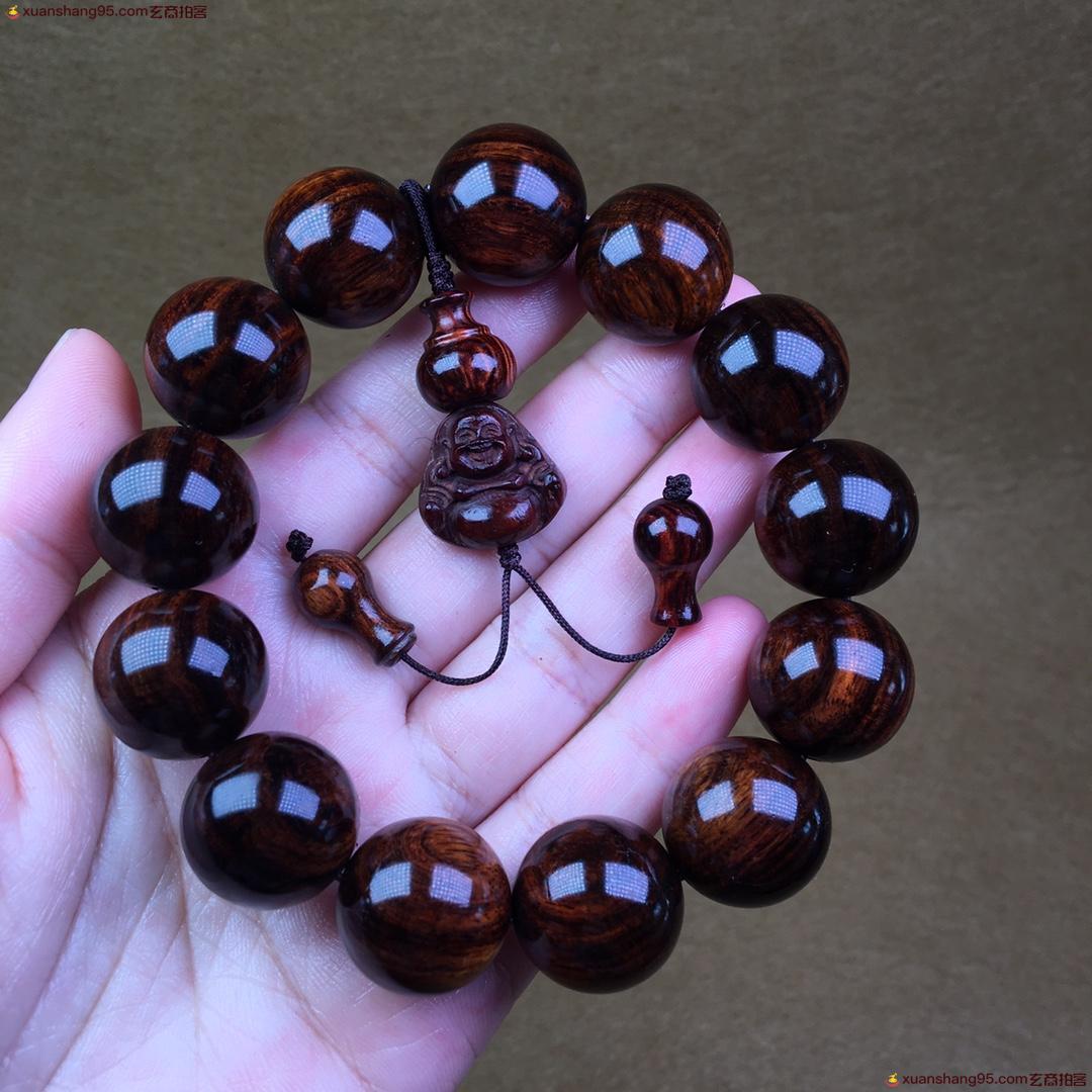 海南黄花梨 紫油梨 1.8手串 顶级材质 颗颗精选 虎皮纹 美轮美奂 底色干净 纹理清晰 自然 油性十足 盘盘就出油 。尺寸1.8厘米 重量56克。