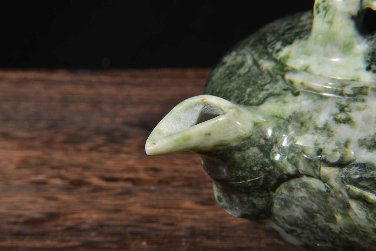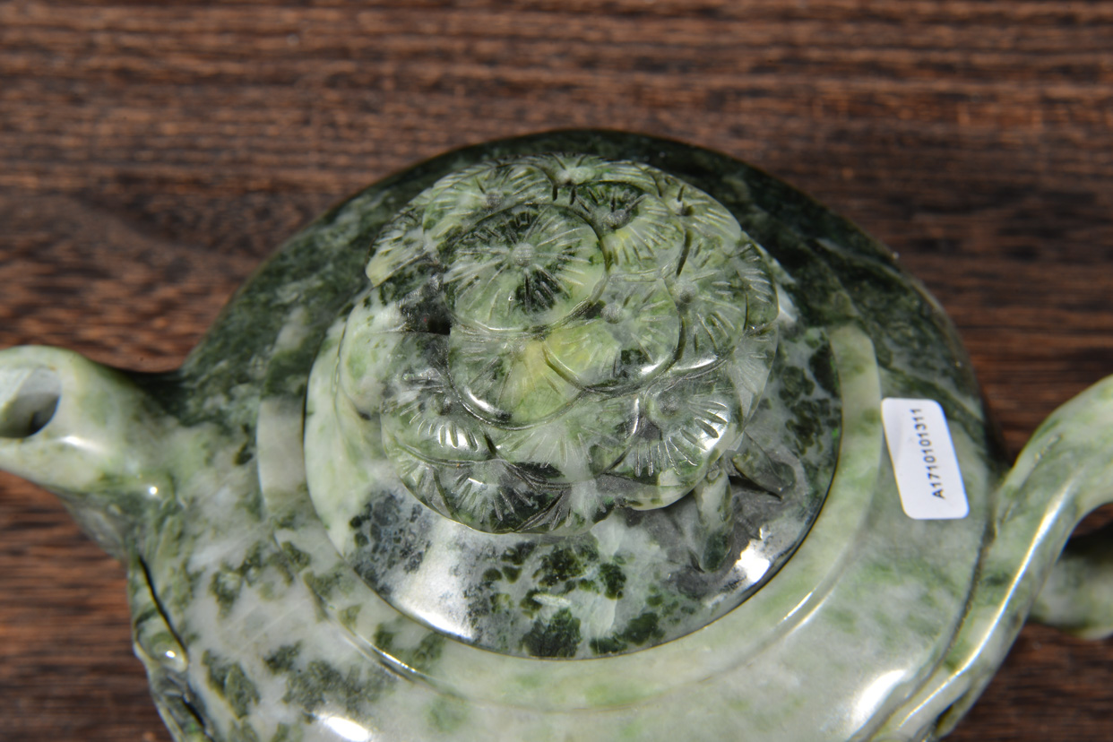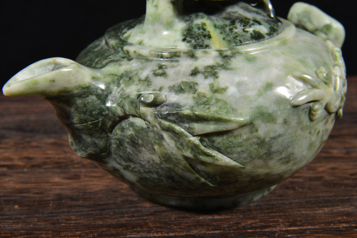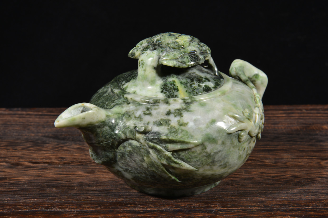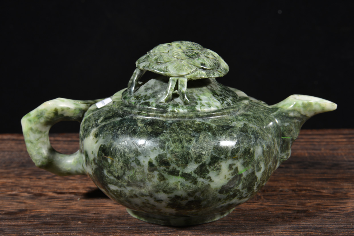 独山玉 松竹梅茶壶,原料采用纯天然的独山玉石,静心设计,手工雕刻,以竹子和梅花为装饰,做出来的壶,具有中国风,温文尔雅,收藏使用佳品。 【关于独山玉】 独山玉是中国四大名玉之一,有南阳翡翠之称。独山玉玉质坚韧微密,细腻柔润,色泽斑驳陆离,温润,有绿、蓝、黄、紫、红、白六种色素,77个色彩类型,是工艺美术雕件的重要玉石原料,成为南阳*特产,是中国四大名玉之一。独山玉雕,历史悠久,考古推算,早在5000多年前先民们就已认识和使用了独山玉。
