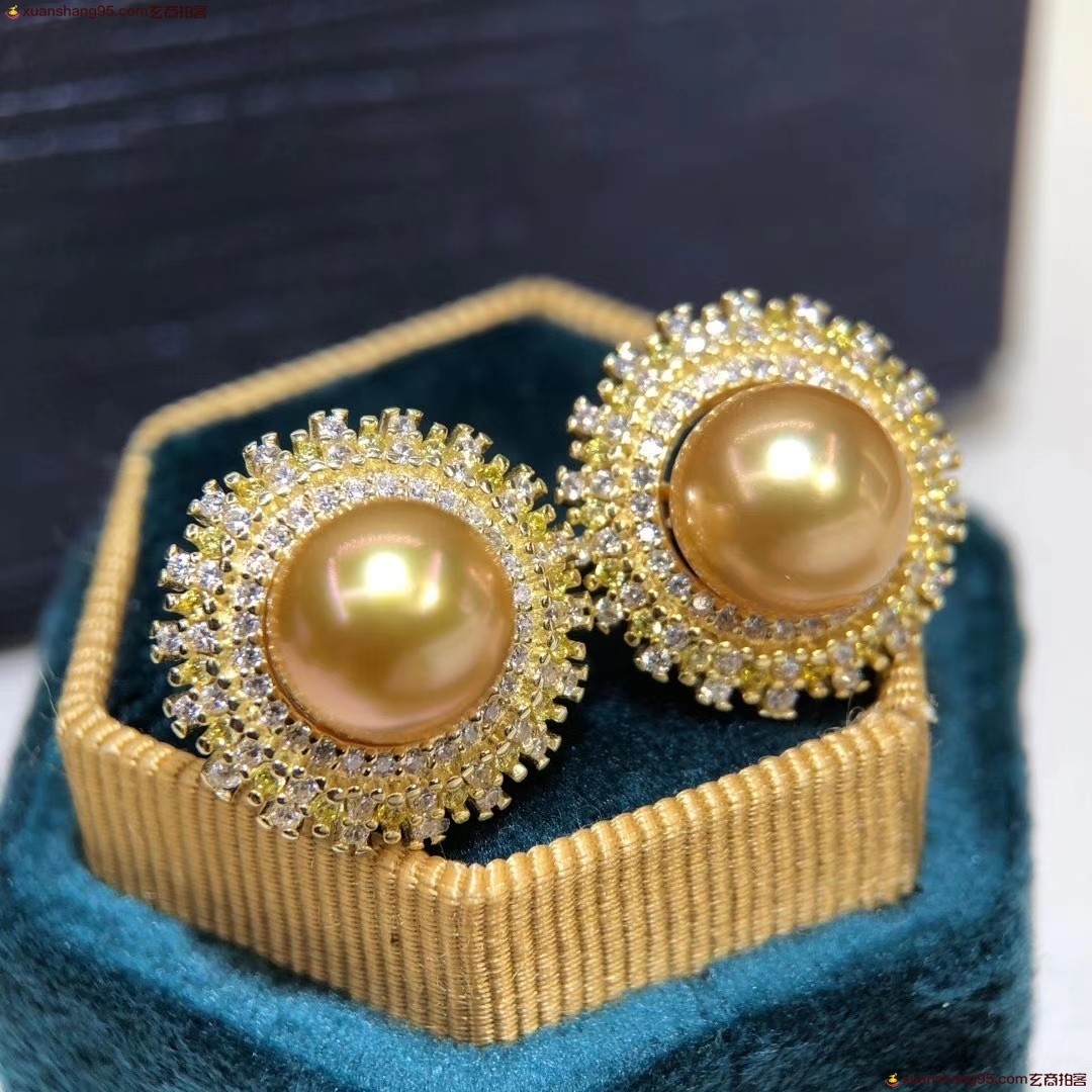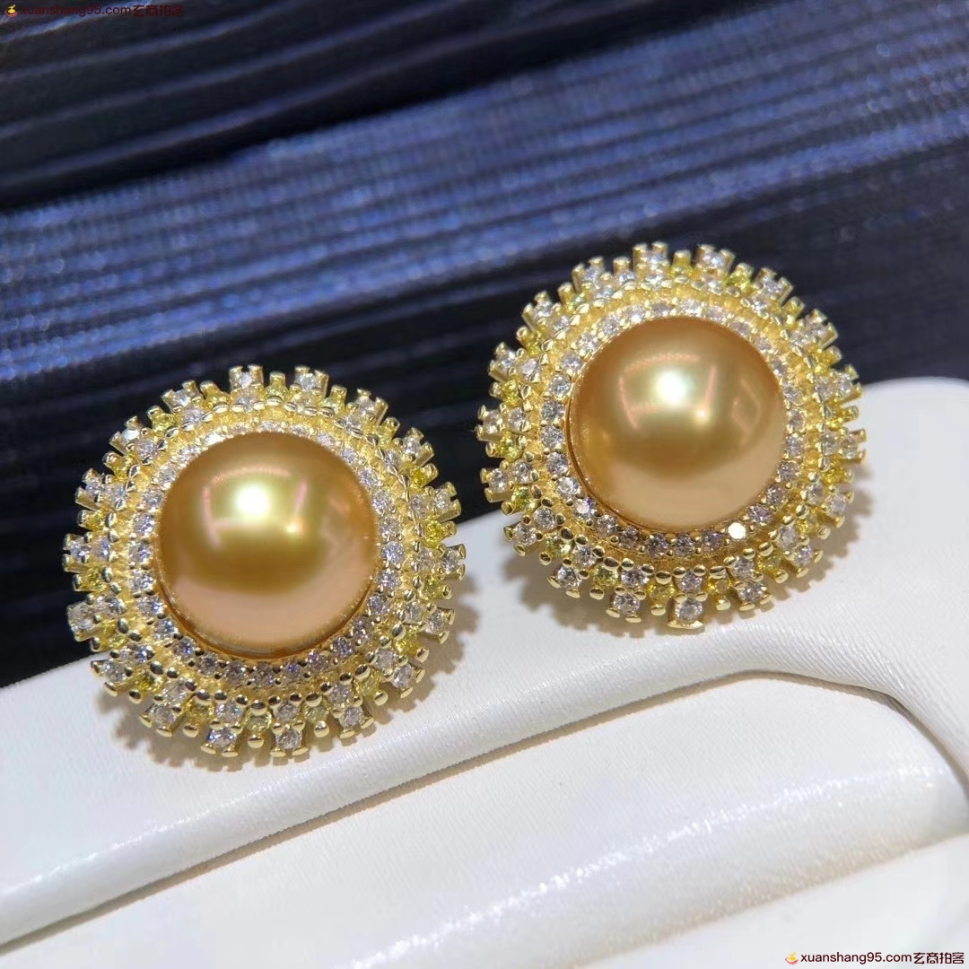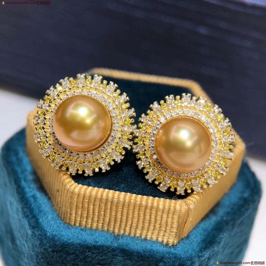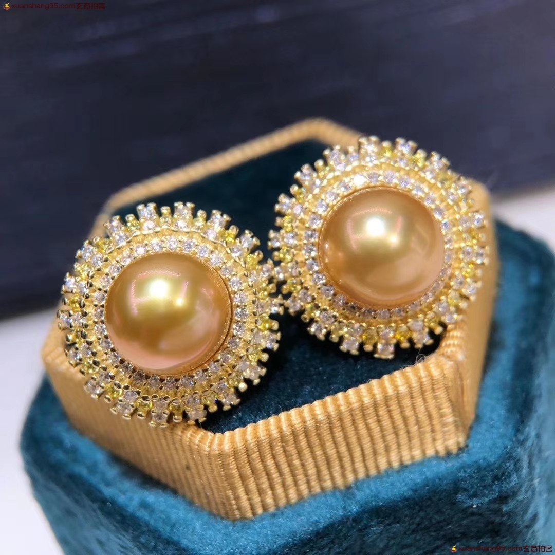 纯天然 南红金珠耳钉一对 浓金色 纯银镶嵌 钻石 大几万的视觉感 尺寸10毫米。