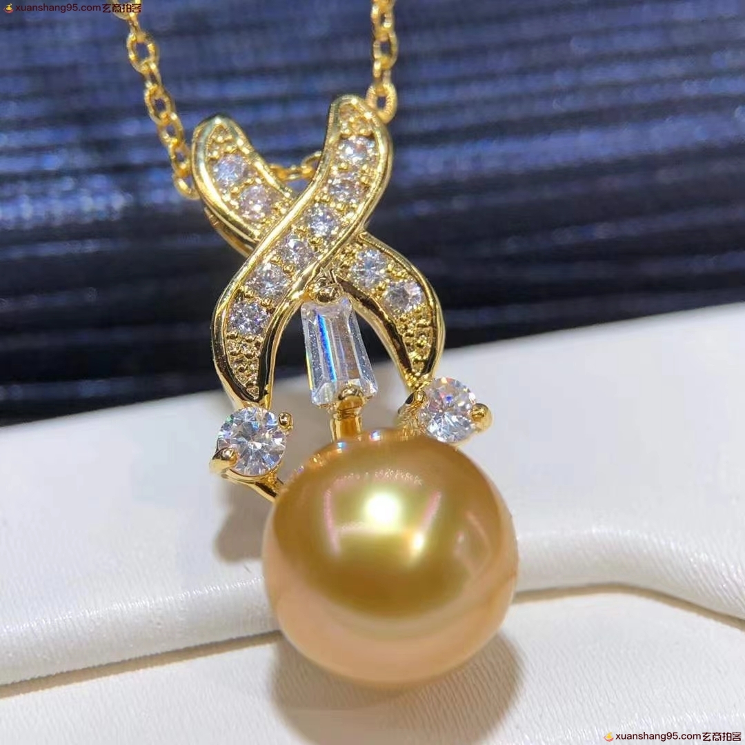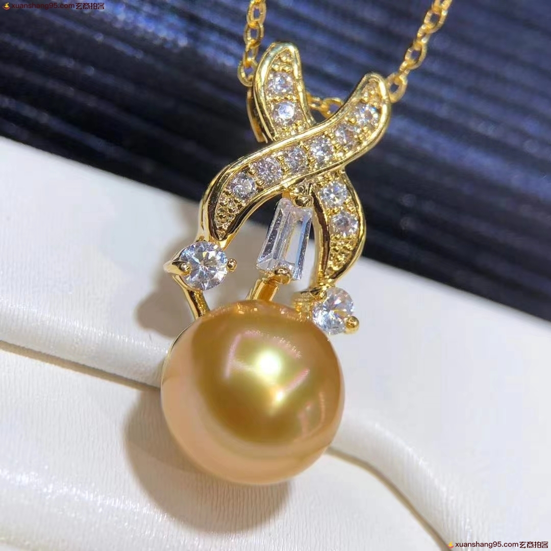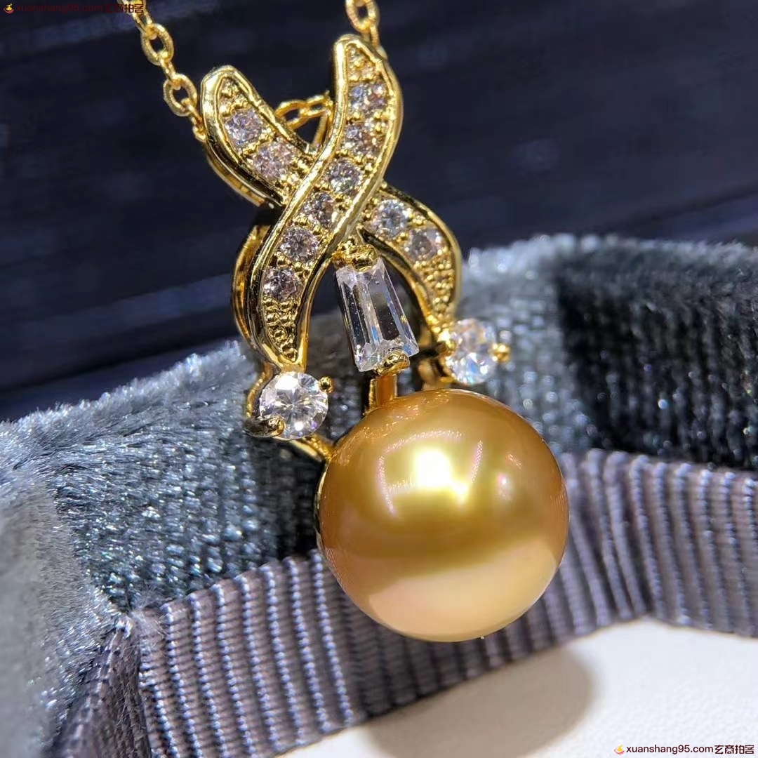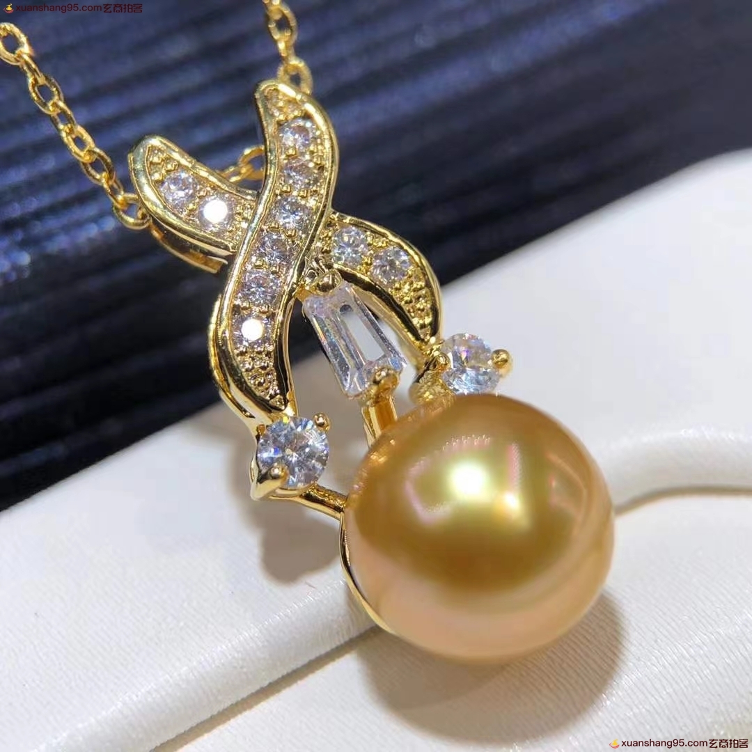 纯天然海水南洋 金珠耳钉一对 浓金色 纯银镶嵌 钻石 大几万的视觉感 尺寸10毫米。