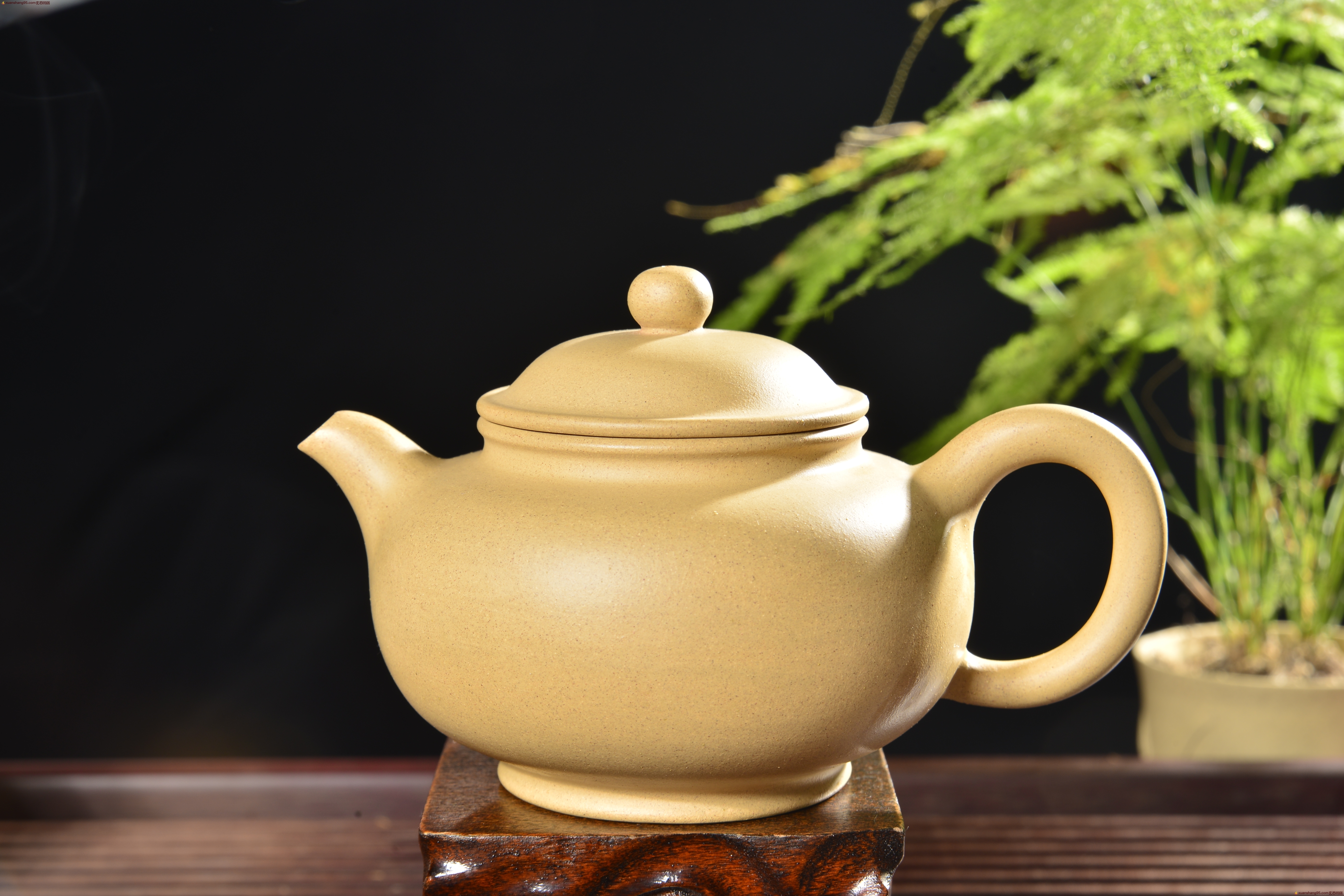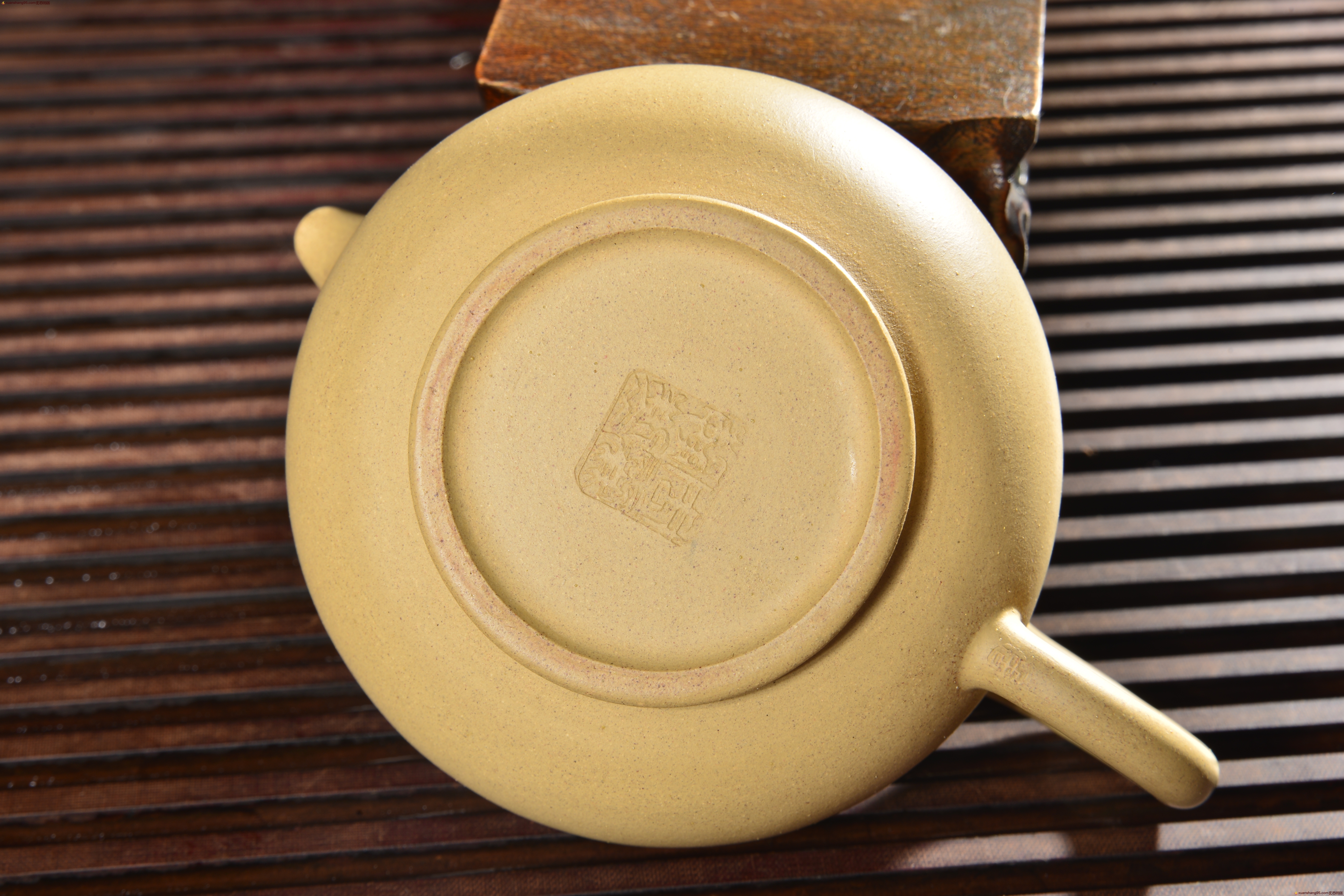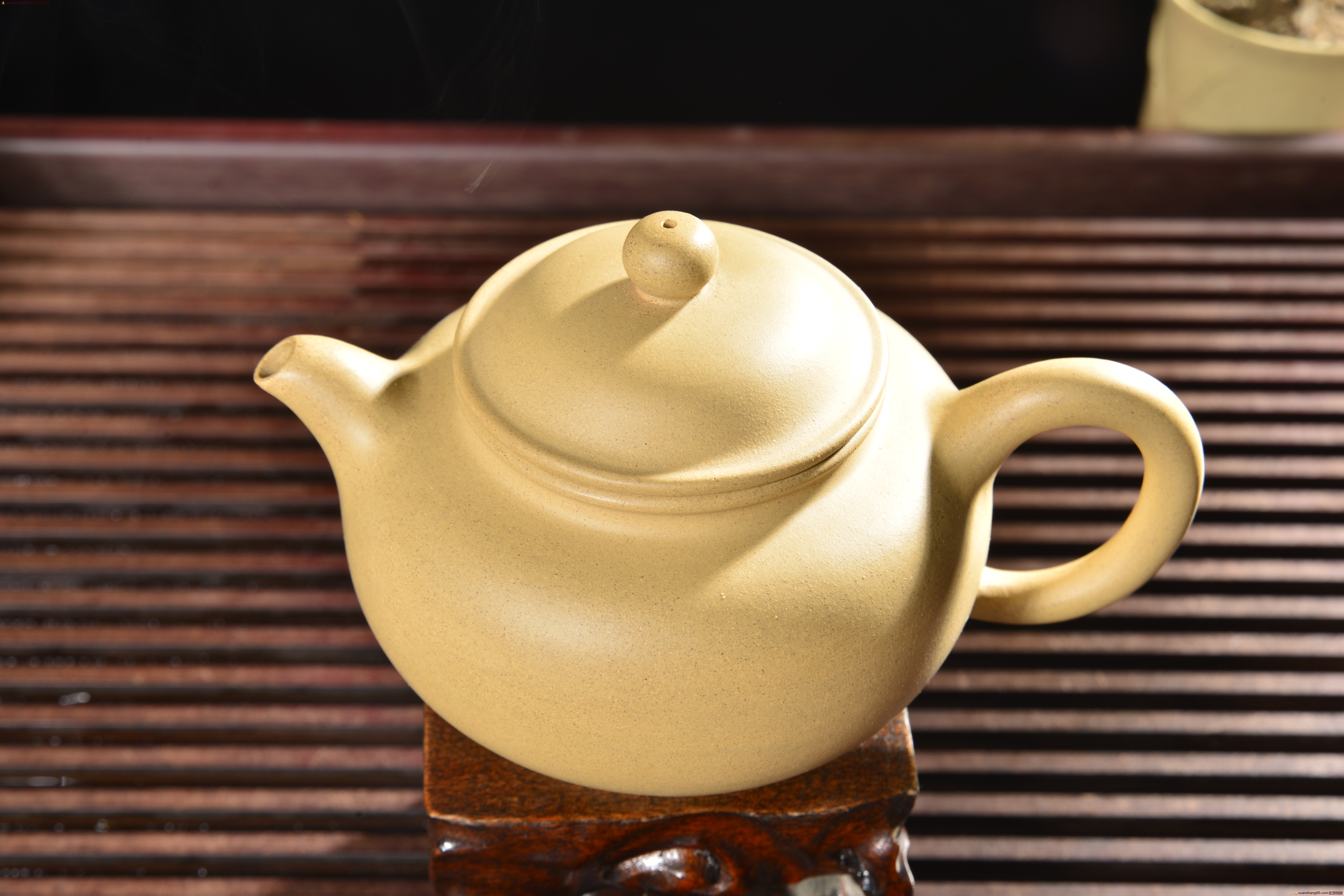 张逸人紫砂 黄金段泥 仿古壶,黄金段泥为段泥的一种,是段泥矿经风化的一层,其色泽分明,透气性佳,为段泥中佳品。成品色泽为暗金色,且颜色不显稍深。,身扁、腹鼓、颈高、盖板平滑,壶盖与口沿子母线吻合严密,合成圆线饱满,扁钮有力,虹钮有势,二弯流胥出自然 ;圆圈把匀势而起,有些款把圆下有垂,富于灵动,整体骨肉亭匀,收展有度,有一气呵成之畅。