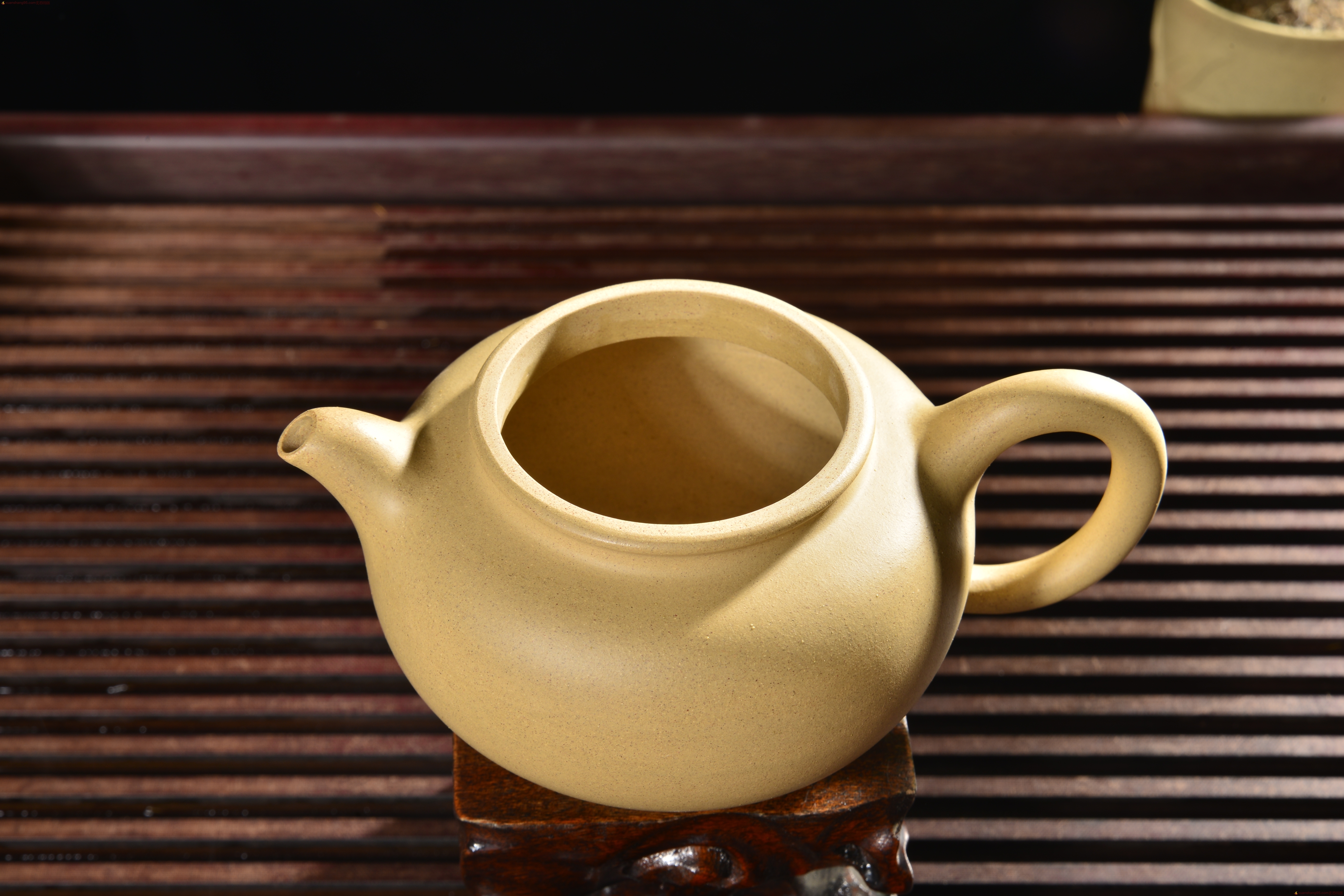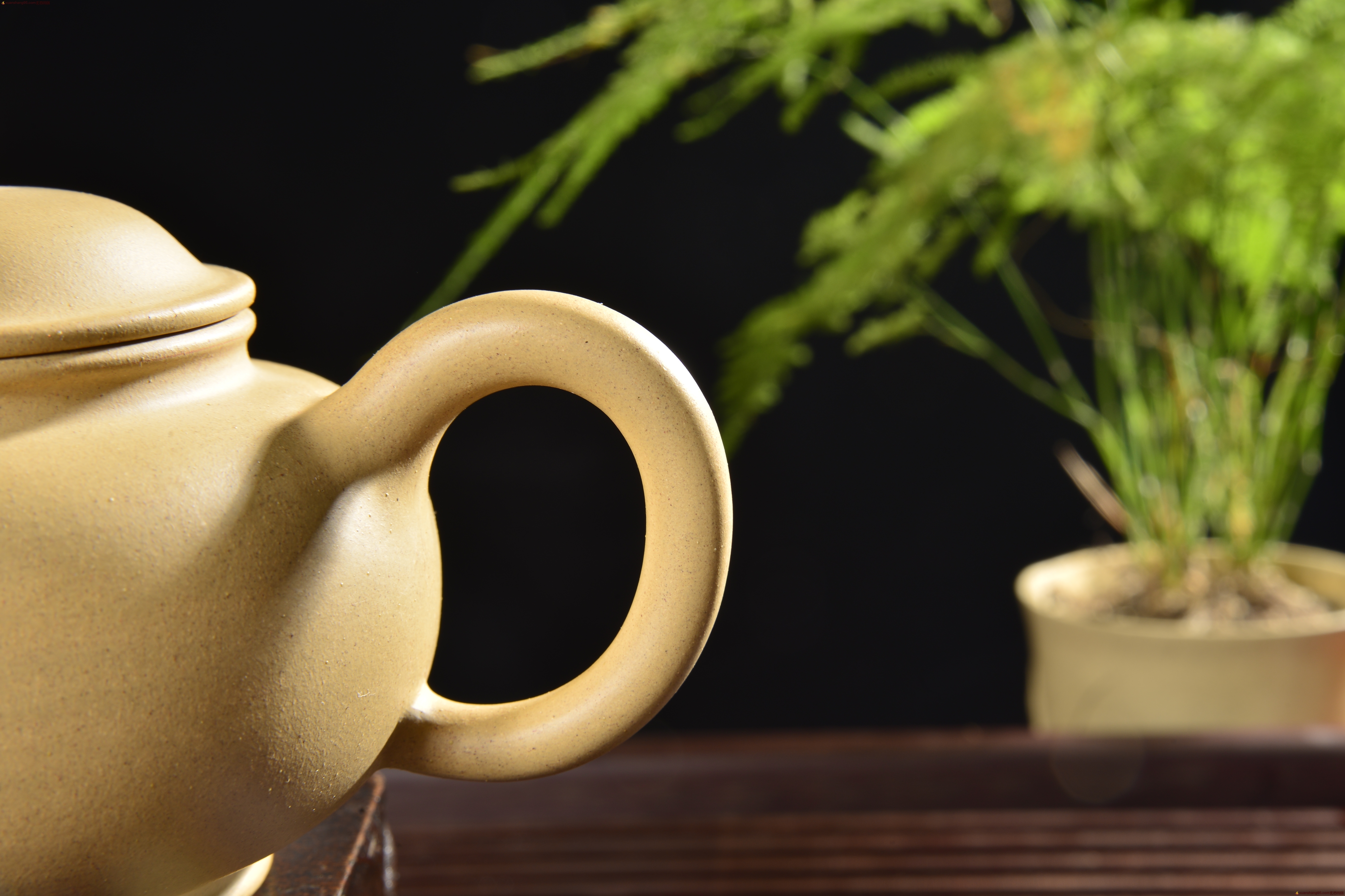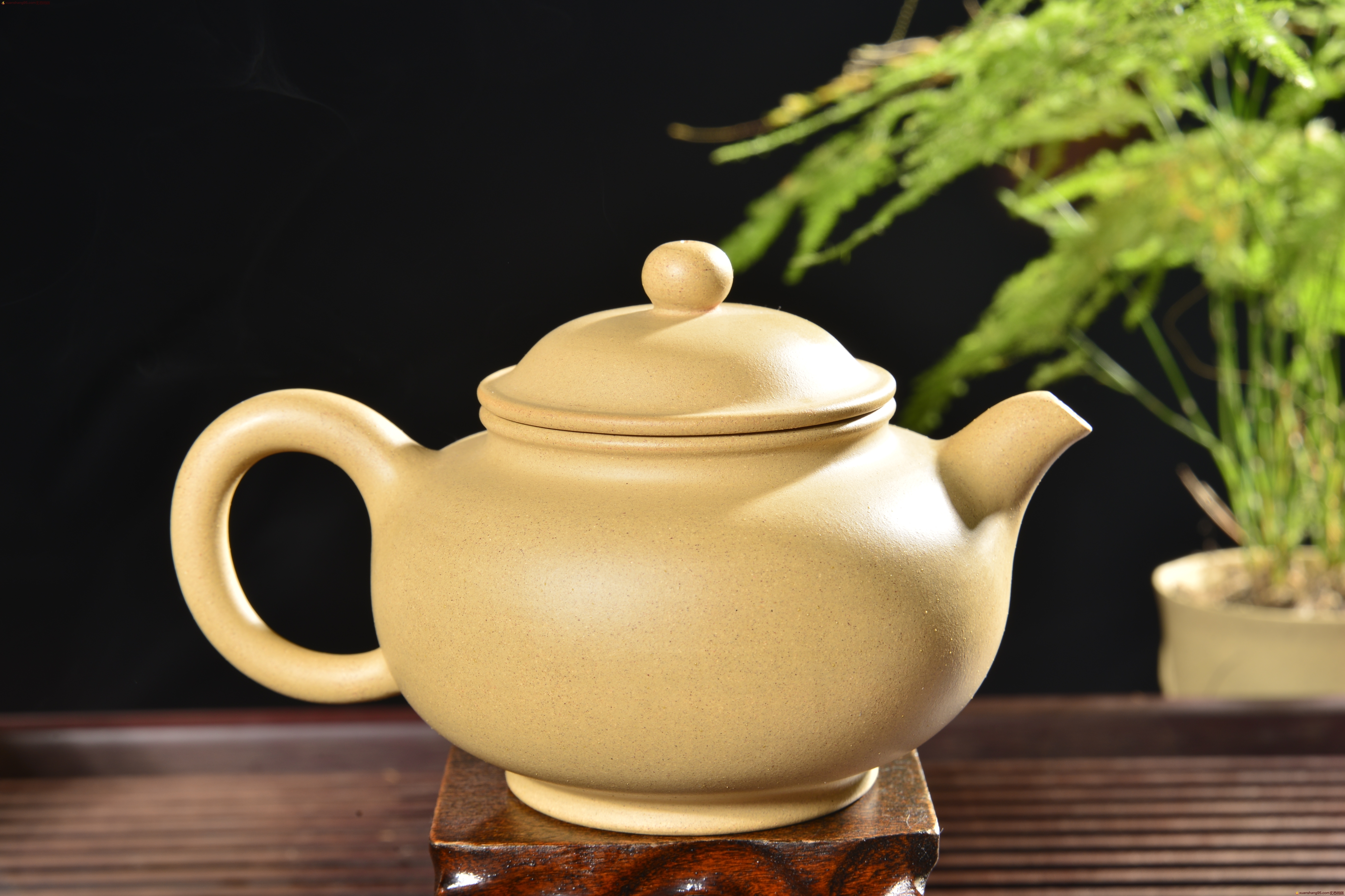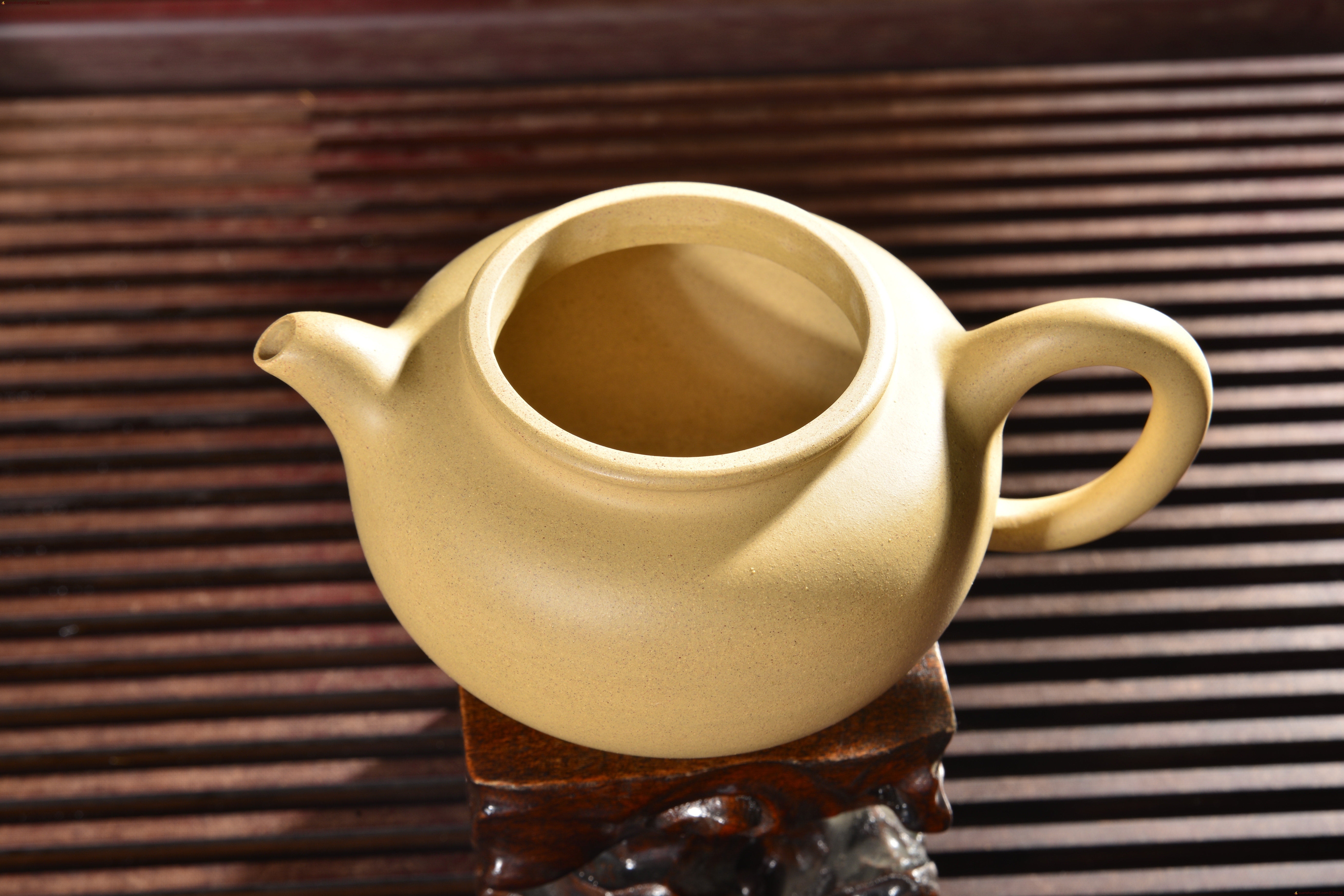 张逸人紫砂 黄金段泥 仿古壶,黄金段泥为段泥的一种,是段泥矿经风化的一层,其色泽分明,透气性佳,为段泥中佳品。成品色泽为暗金色,且颜色不显稍深。,身扁、腹鼓、颈高、盖板平滑,壶盖与口沿子母线吻合严密,合成圆线饱满,扁钮有力,虹钮有势,二弯流胥出自然 ;圆圈把匀势而起,有些款把圆下有垂,富于灵动,整体骨肉亭匀,收展有度,有一气呵成之畅。