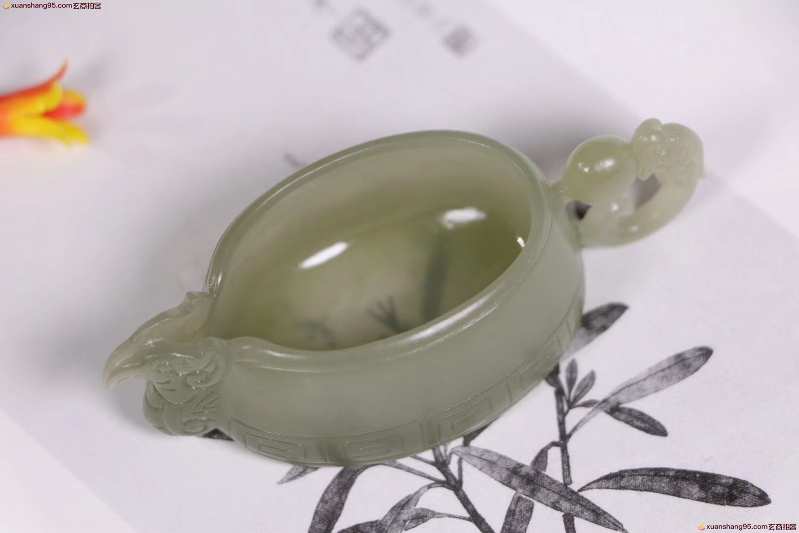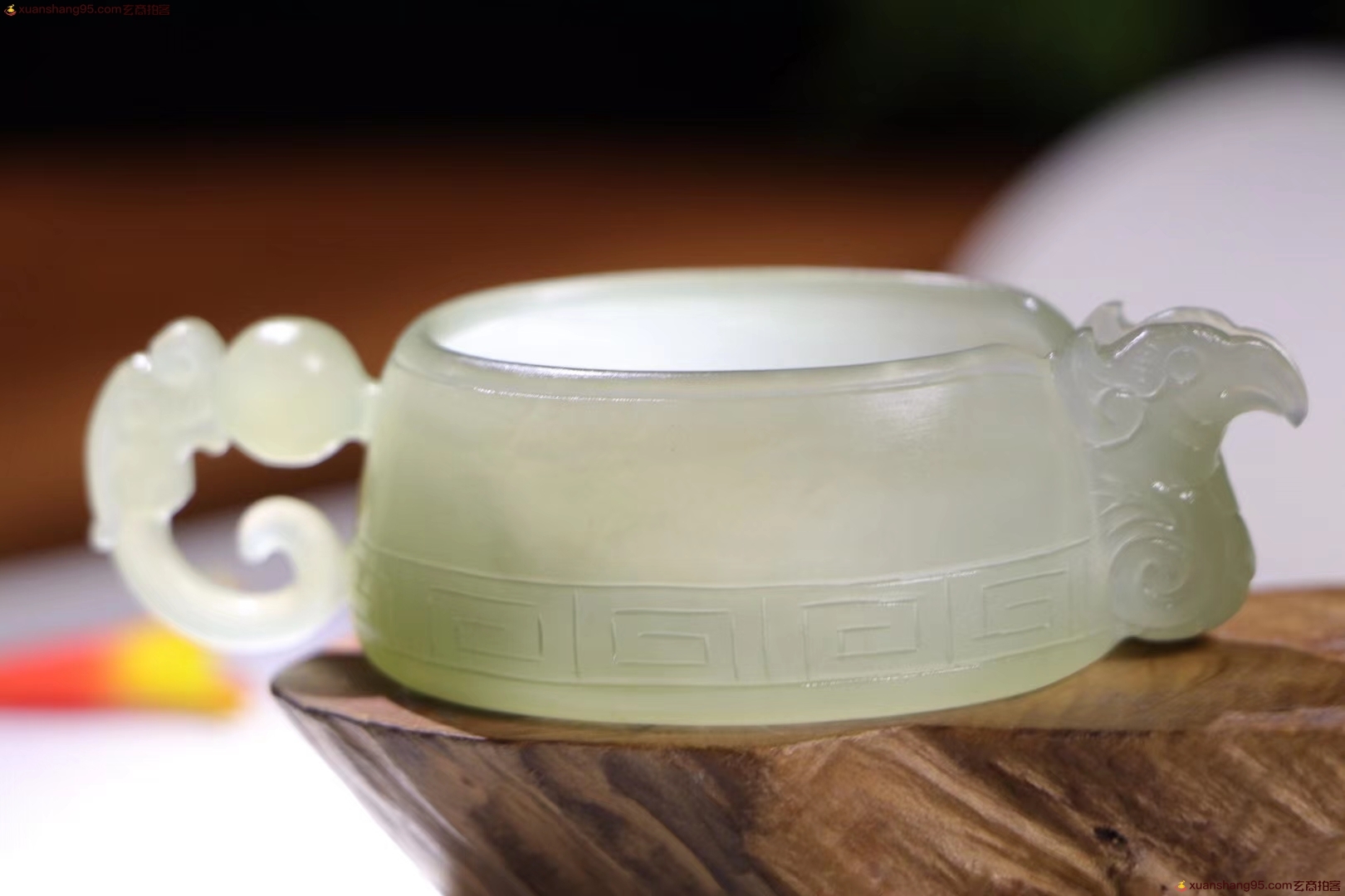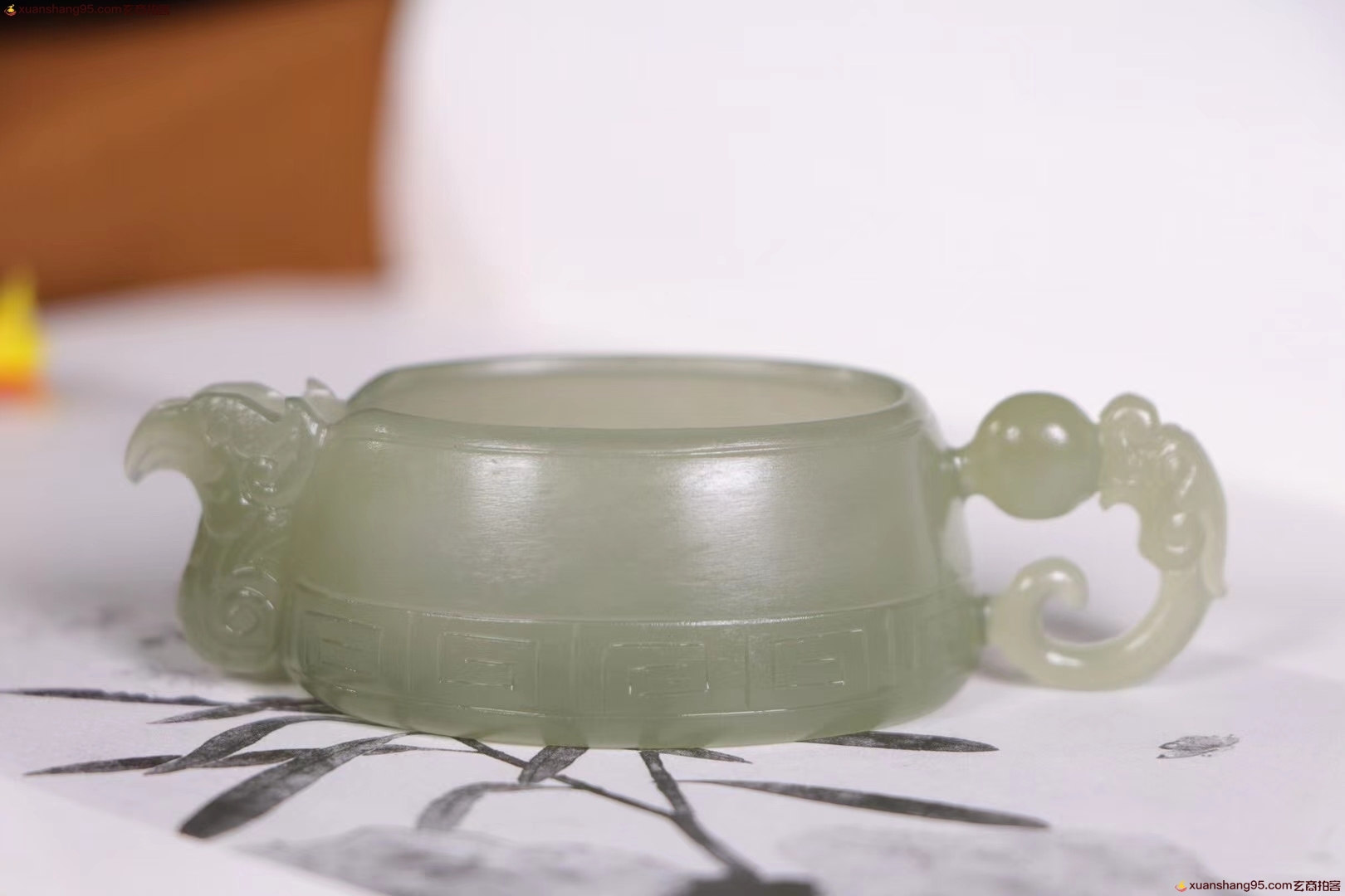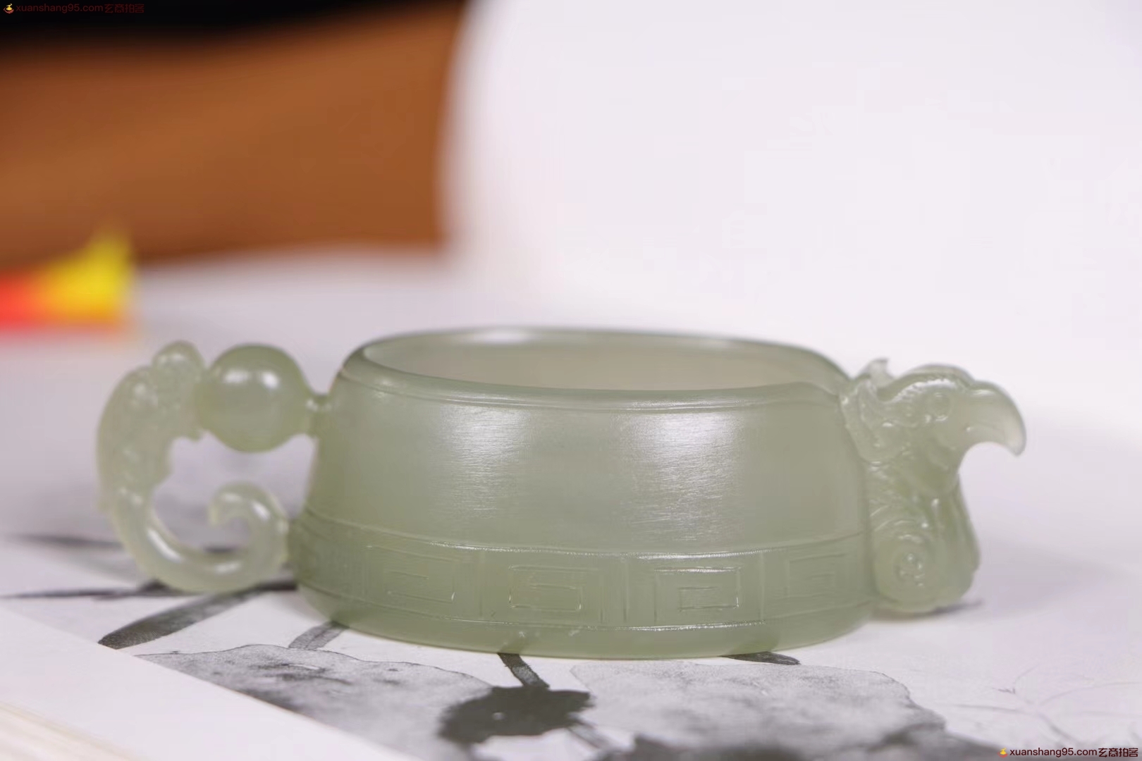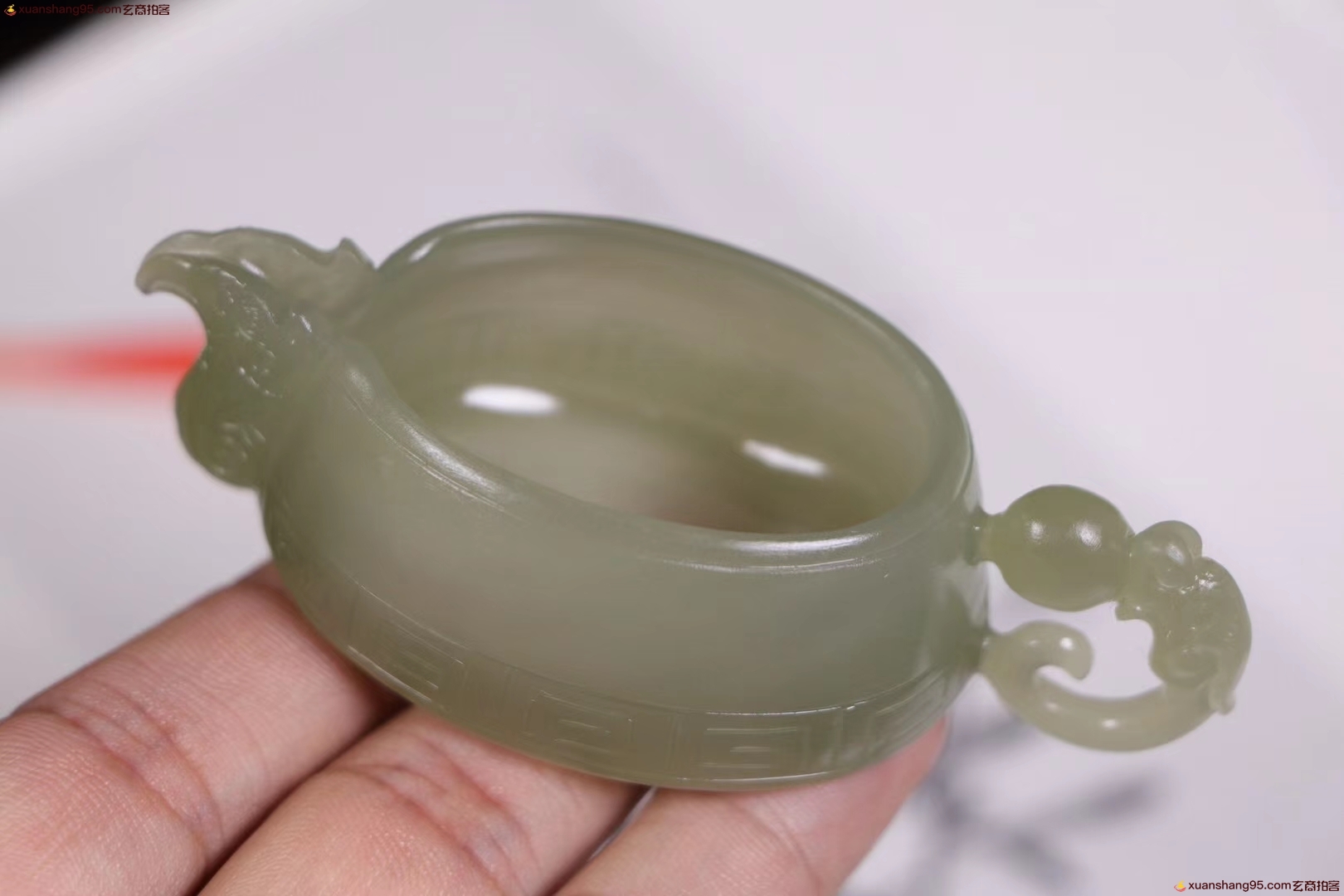 【龙凤呈祥.酒樽】精品和田玉 青白玉龙凤酒樽 玉质温润 细腻 油性十足 精工雕琢 龙凤形制古朴雅致,一个是众兽之君,一个是百鸟之王;一个变化飞腾而灵异,一个高雅美善而祥瑞。龙凤呈祥,天成富贵,吉祥如意。重45克尺寸 86.5-39.5-24mm。