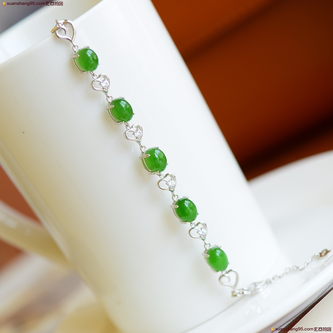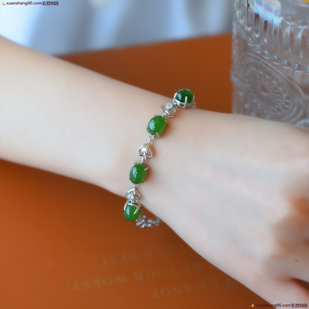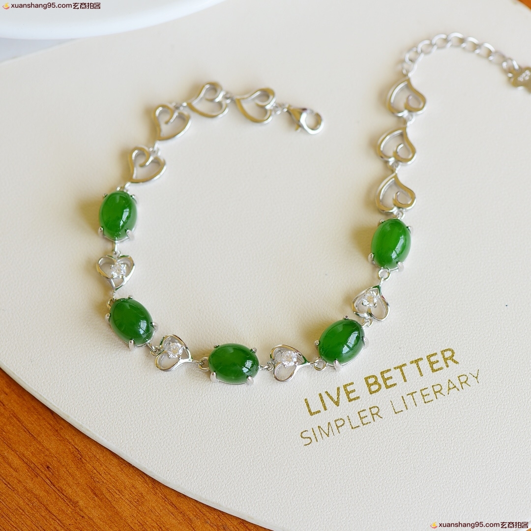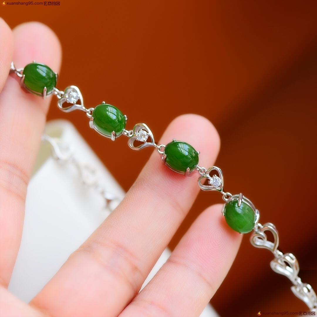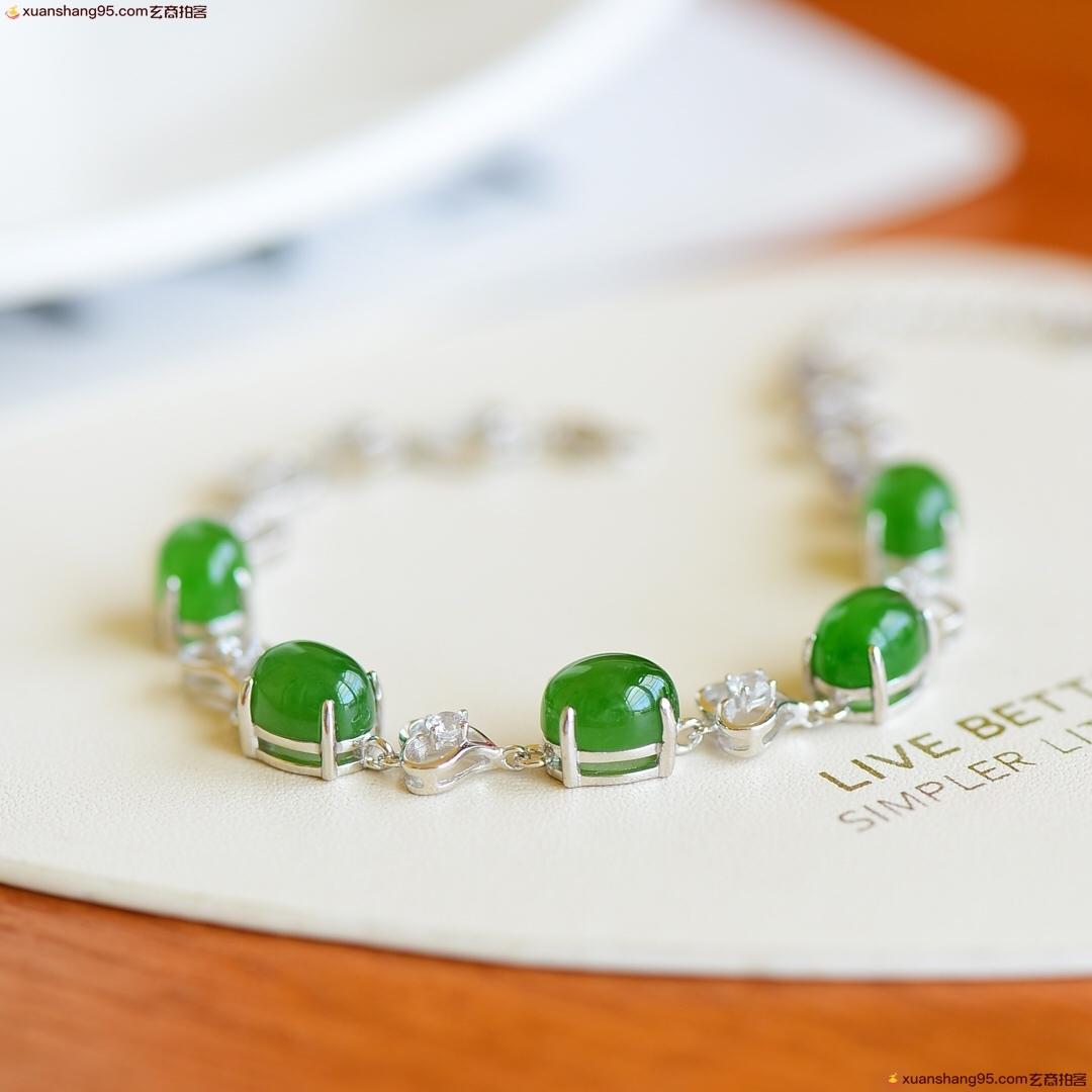 纯银镶嵌 碧玉手链 纯银镶嵌 做工精细 料子纯净 尺寸7*9毫米。