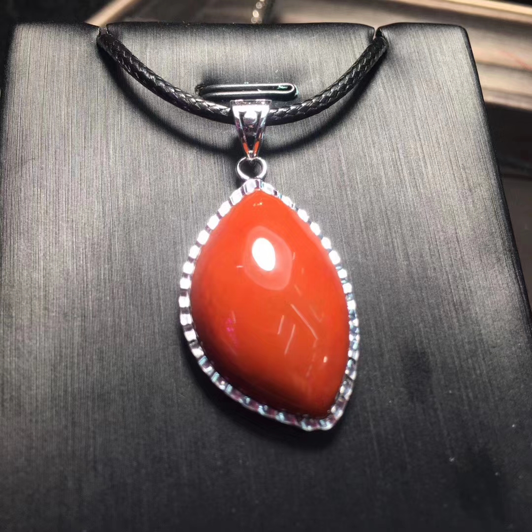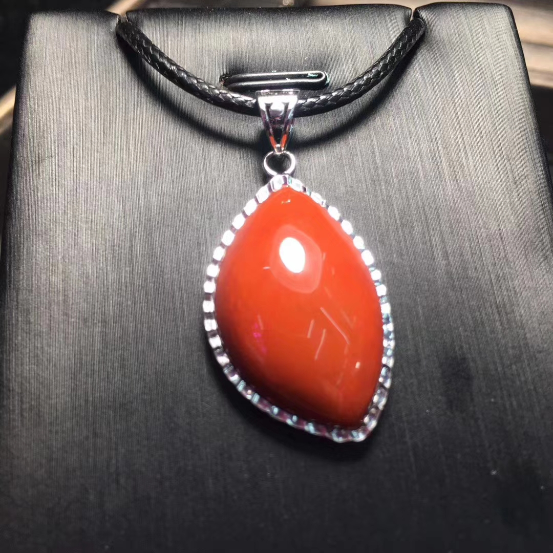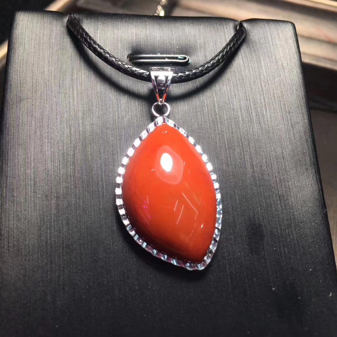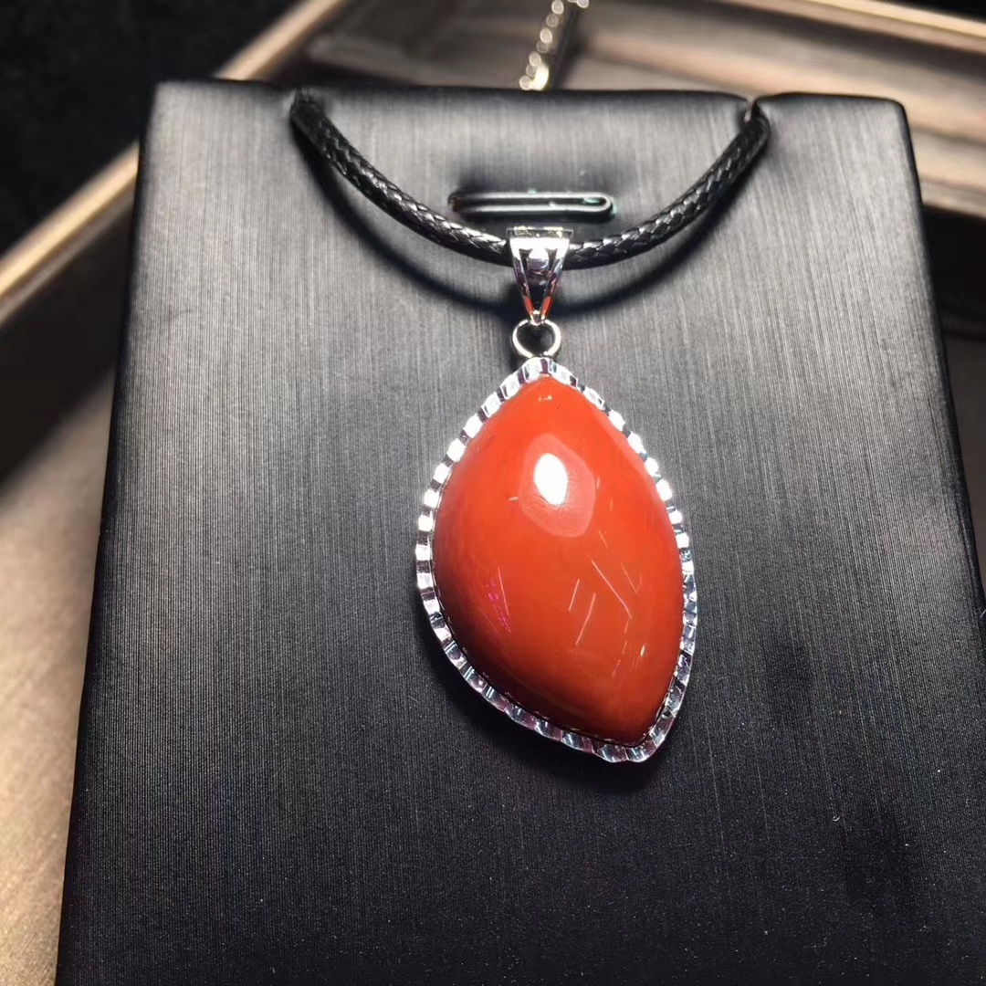 精品 瓦西料 南红吊坠,柿子红 包边镶嵌,尺寸30*19毫米 重量10克。附带鉴定证书和精美礼盒。