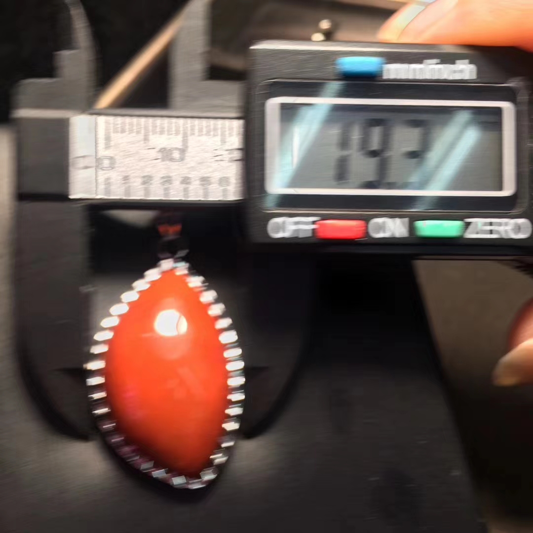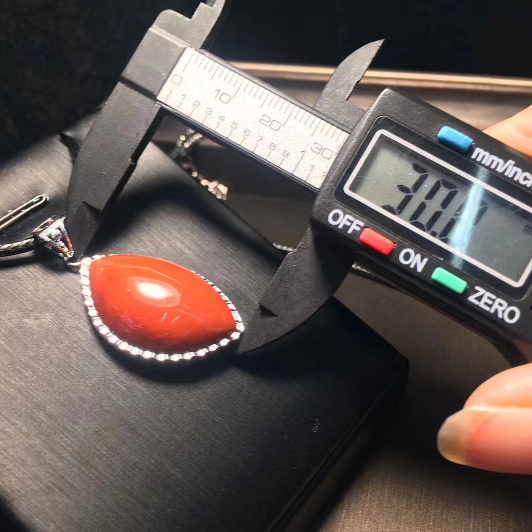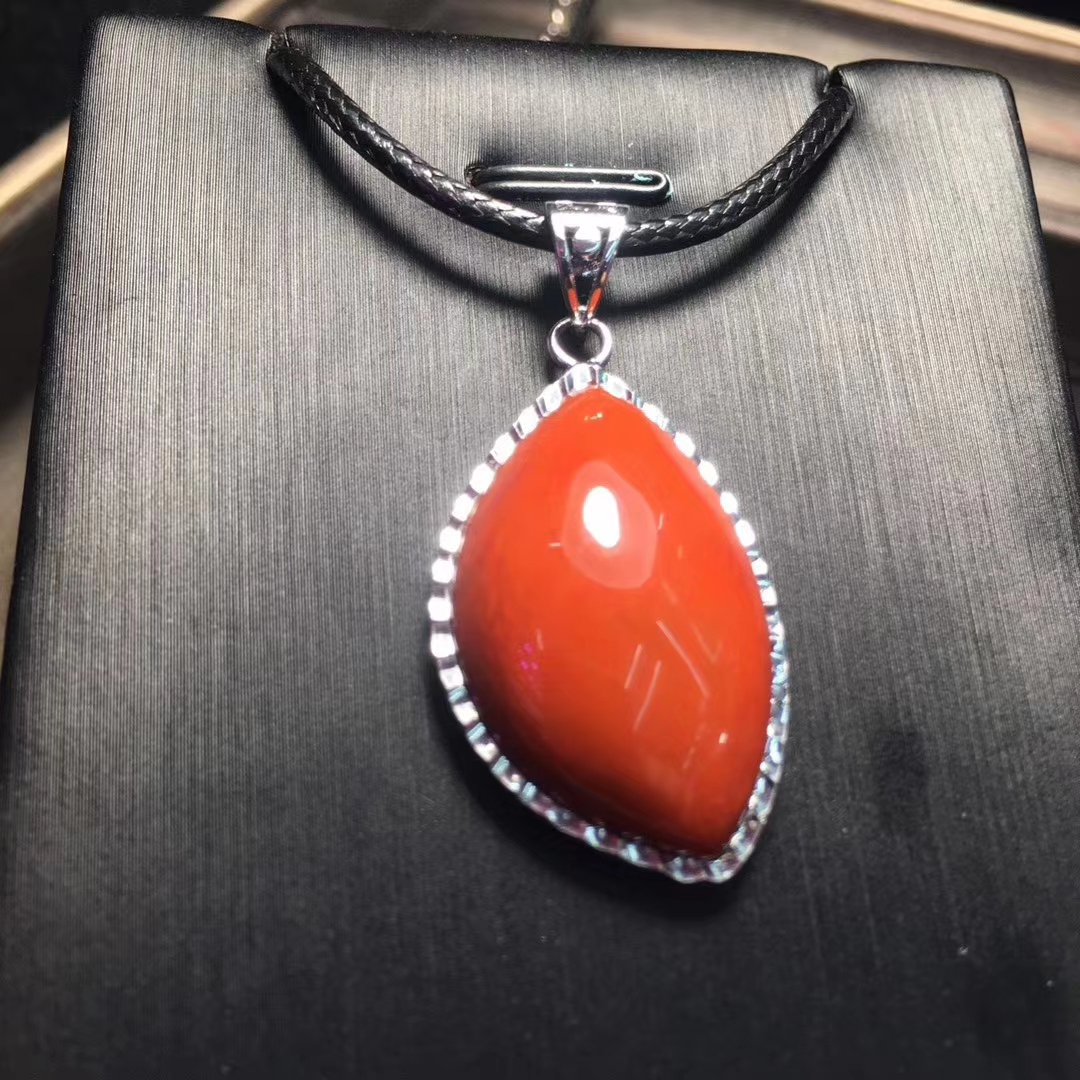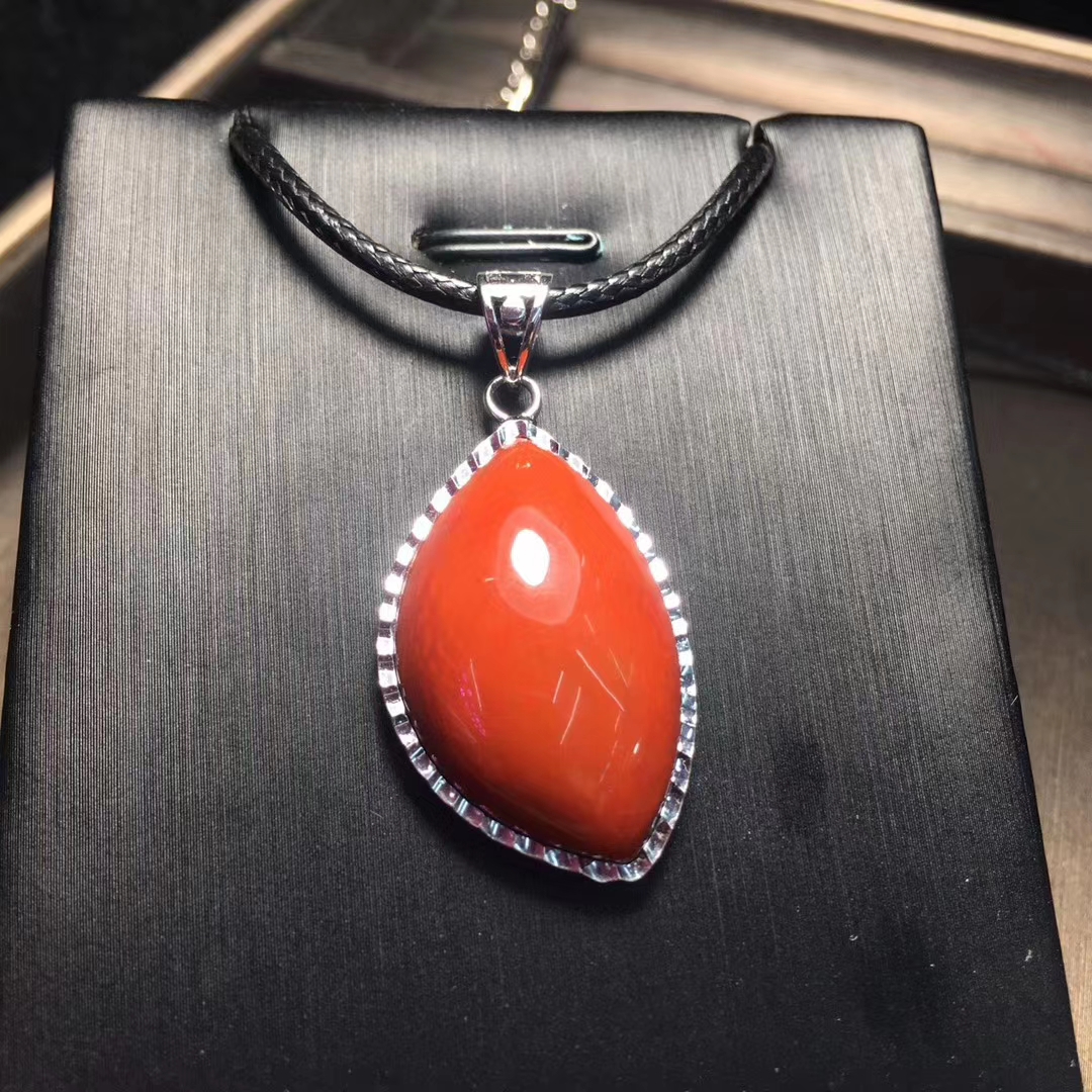 精品 瓦西料 南红吊坠,柿子红 包边镶嵌,尺寸30*19毫米 重量10克。附带鉴定证书和精美礼盒。