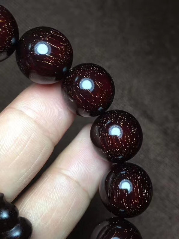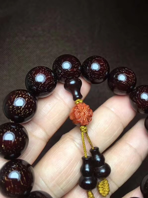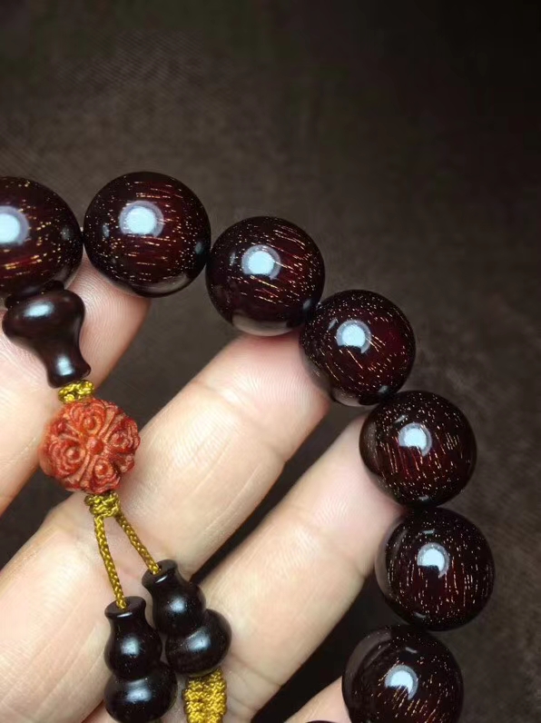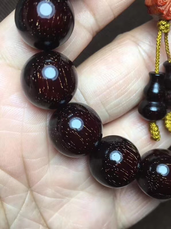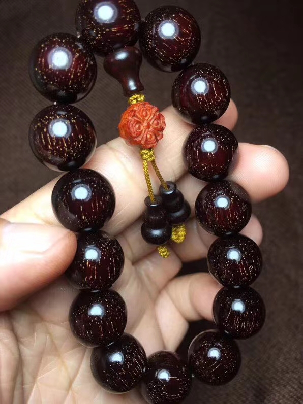 印度小叶紫檀 1.5金星手串 千年成一木,一木换一珠,一珠传千年。印度小叶紫檀,半面满星 颗颗肉中粗星,高油高密,野生林老料所开,木性稳定,可直接上手盘玩,金星保真。直径1.5厘米。