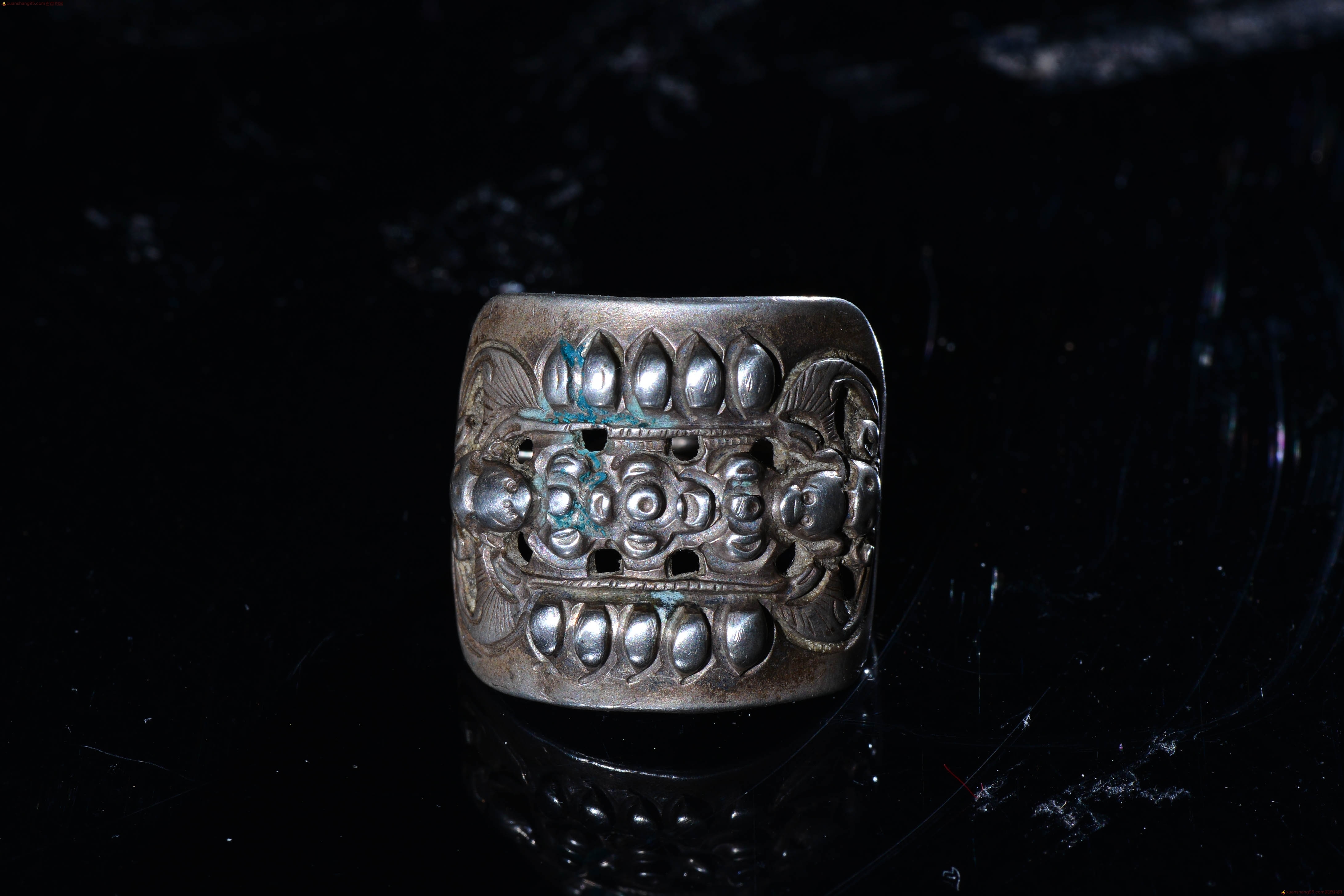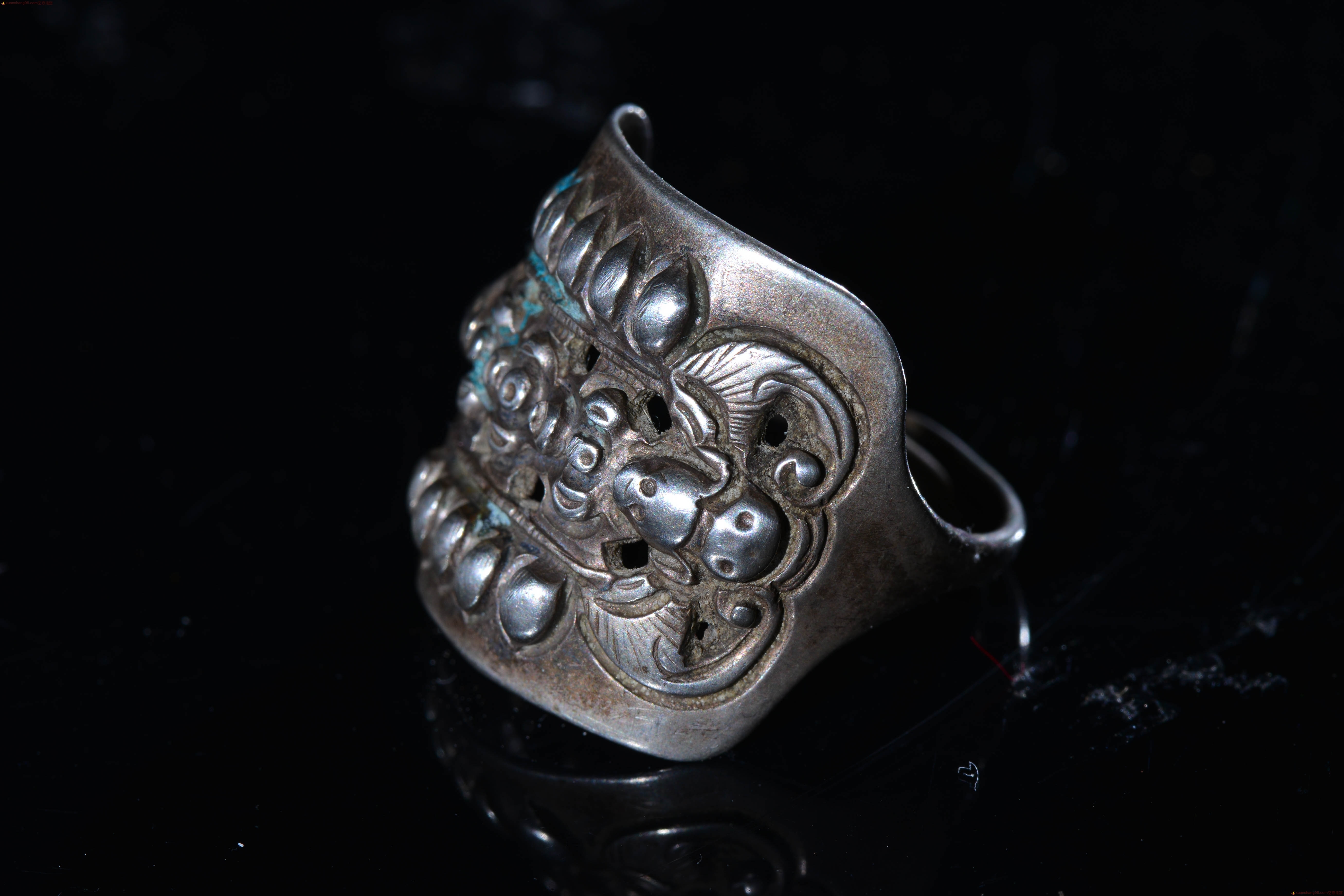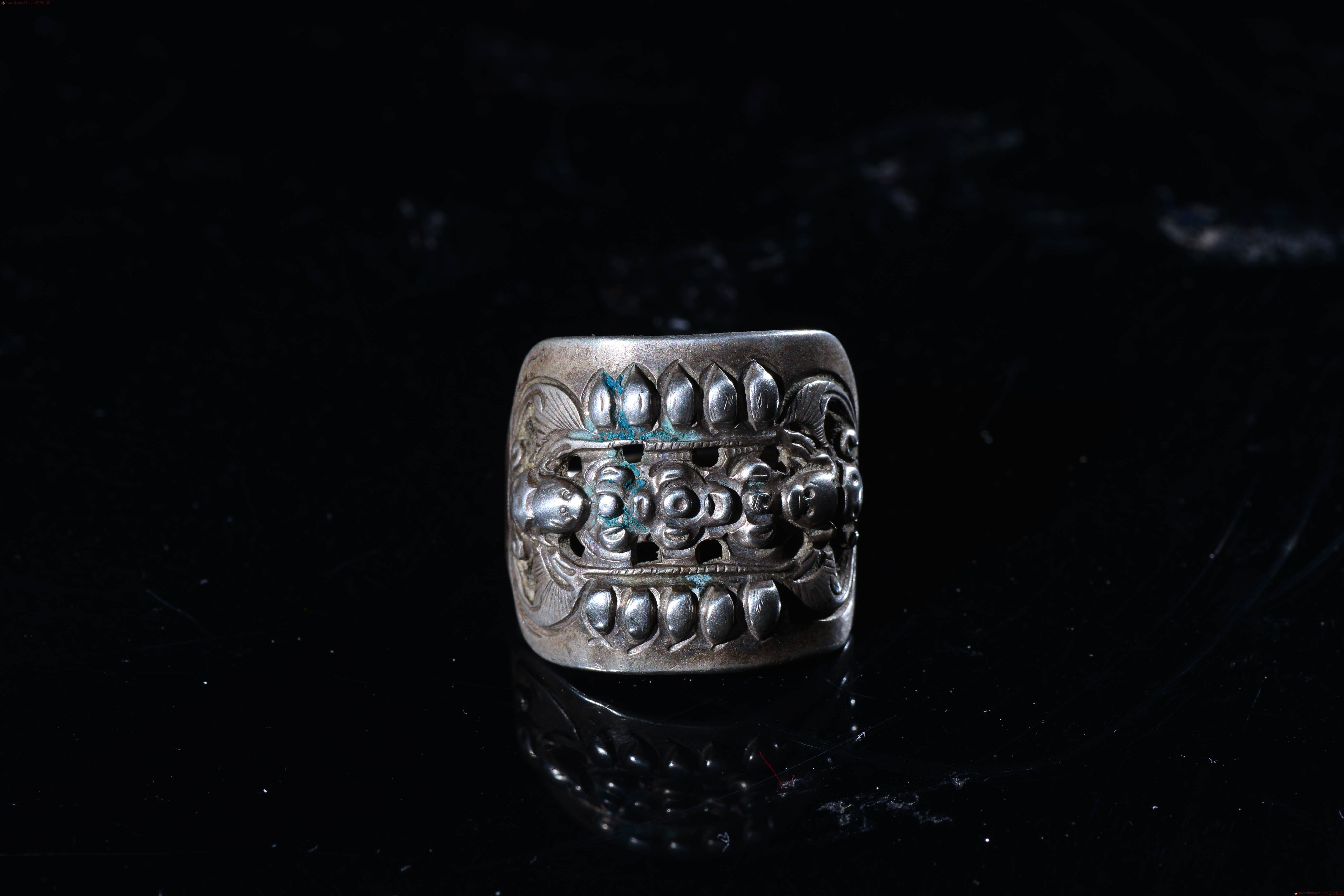 旧藏 福在眼前 银戒指 戒指正面 两个精工蝙蝠,中间精美花卉,户口,包浆厚重,老气十足,直径2.1厘米 戒指面 长2.3厘米 宽2厘米。收藏佳品。