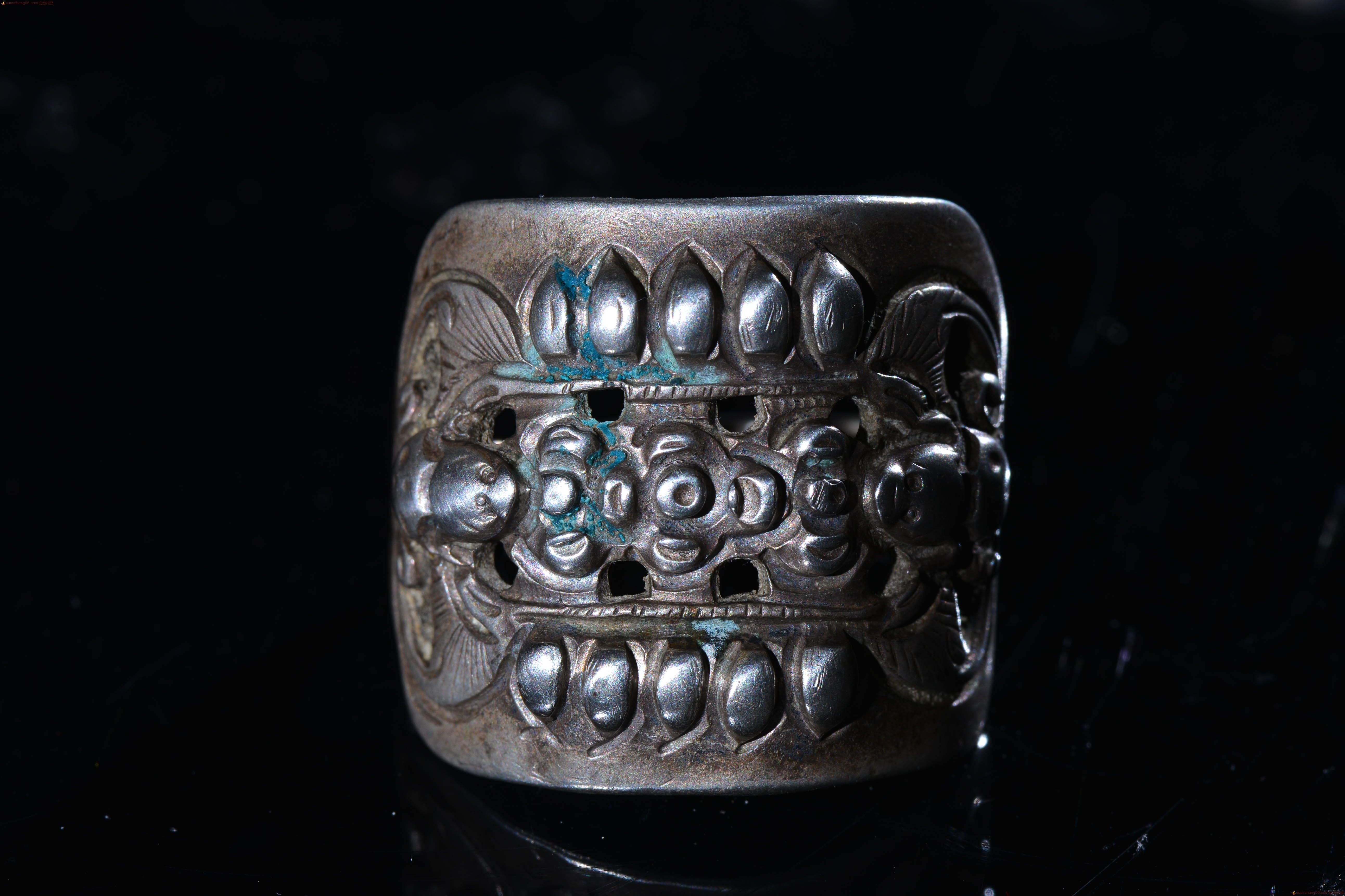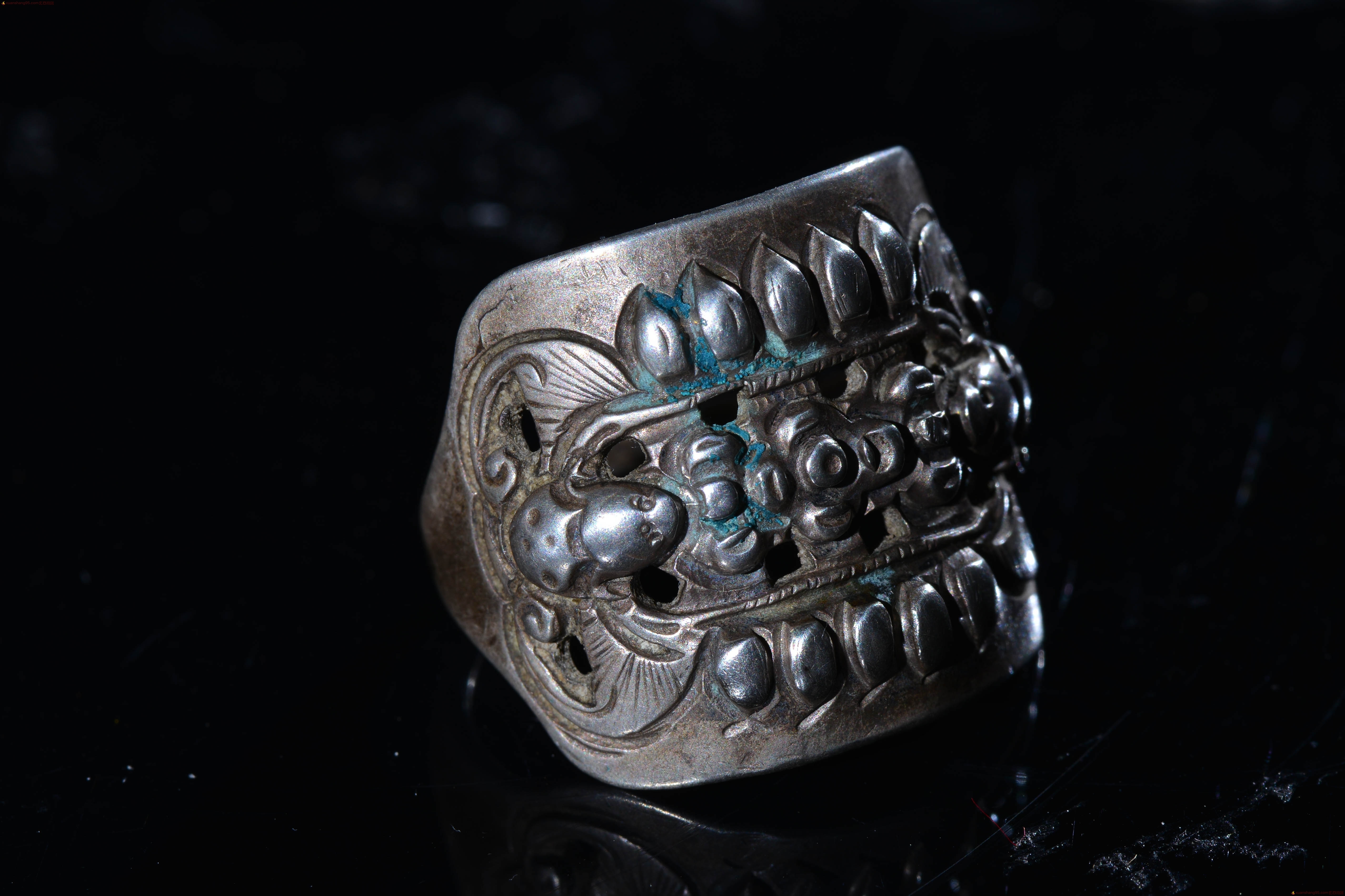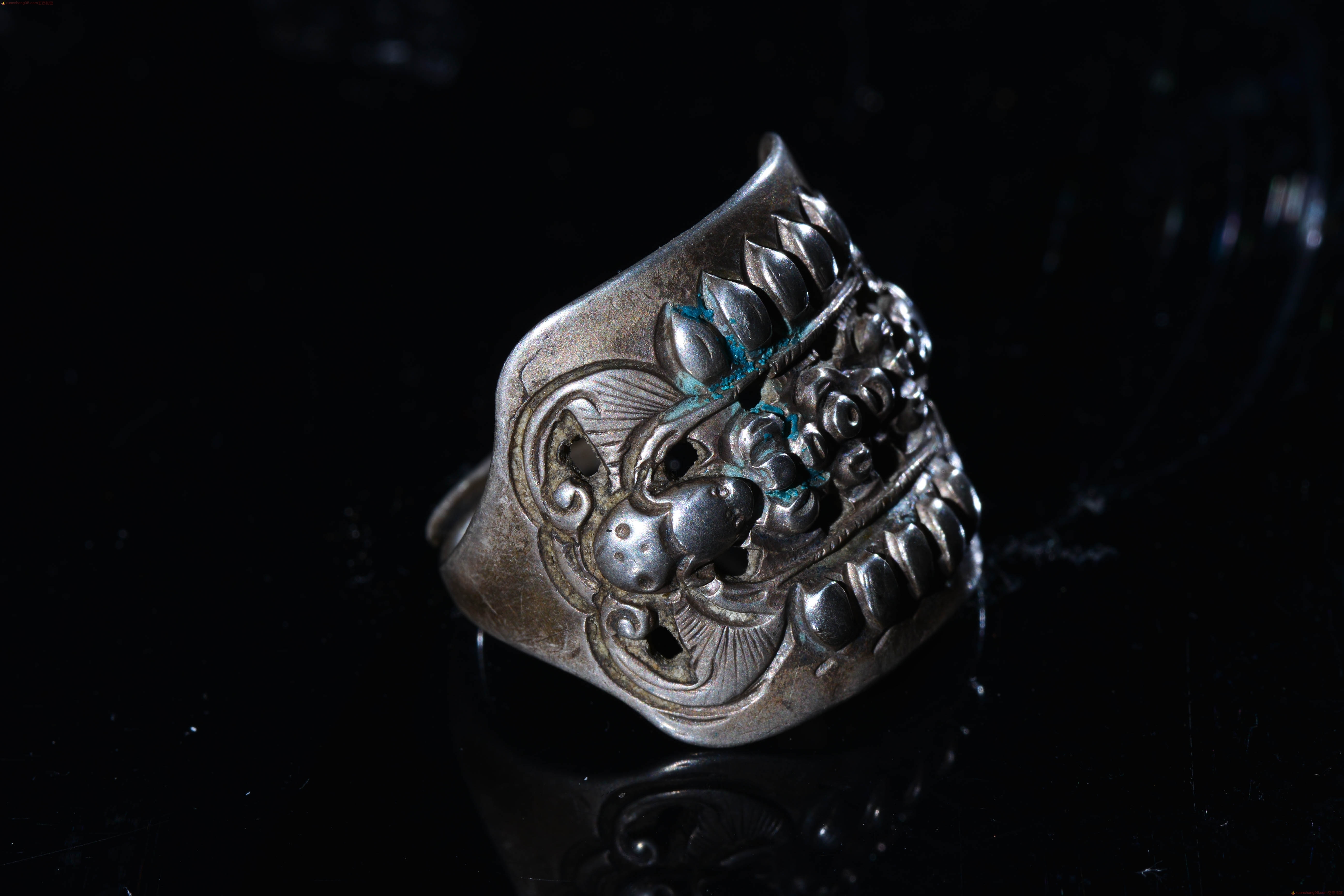 旧藏 福在眼前 银戒指 戒指正面 两个精工蝙蝠,中间精美花卉,户口,包浆厚重,老气十足,直径2.1厘米 戒指面 长2.3厘米 宽2厘米。收藏佳品。