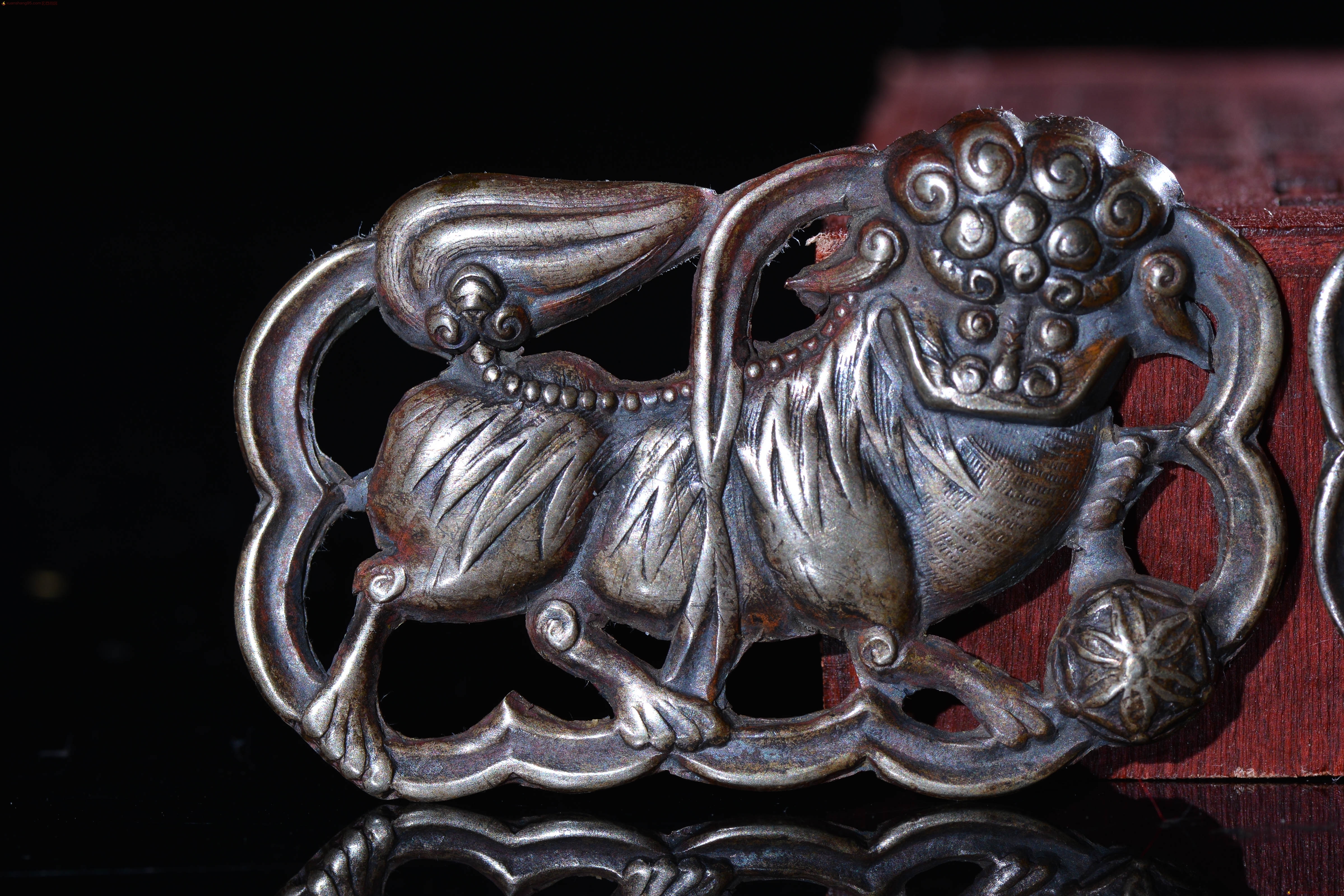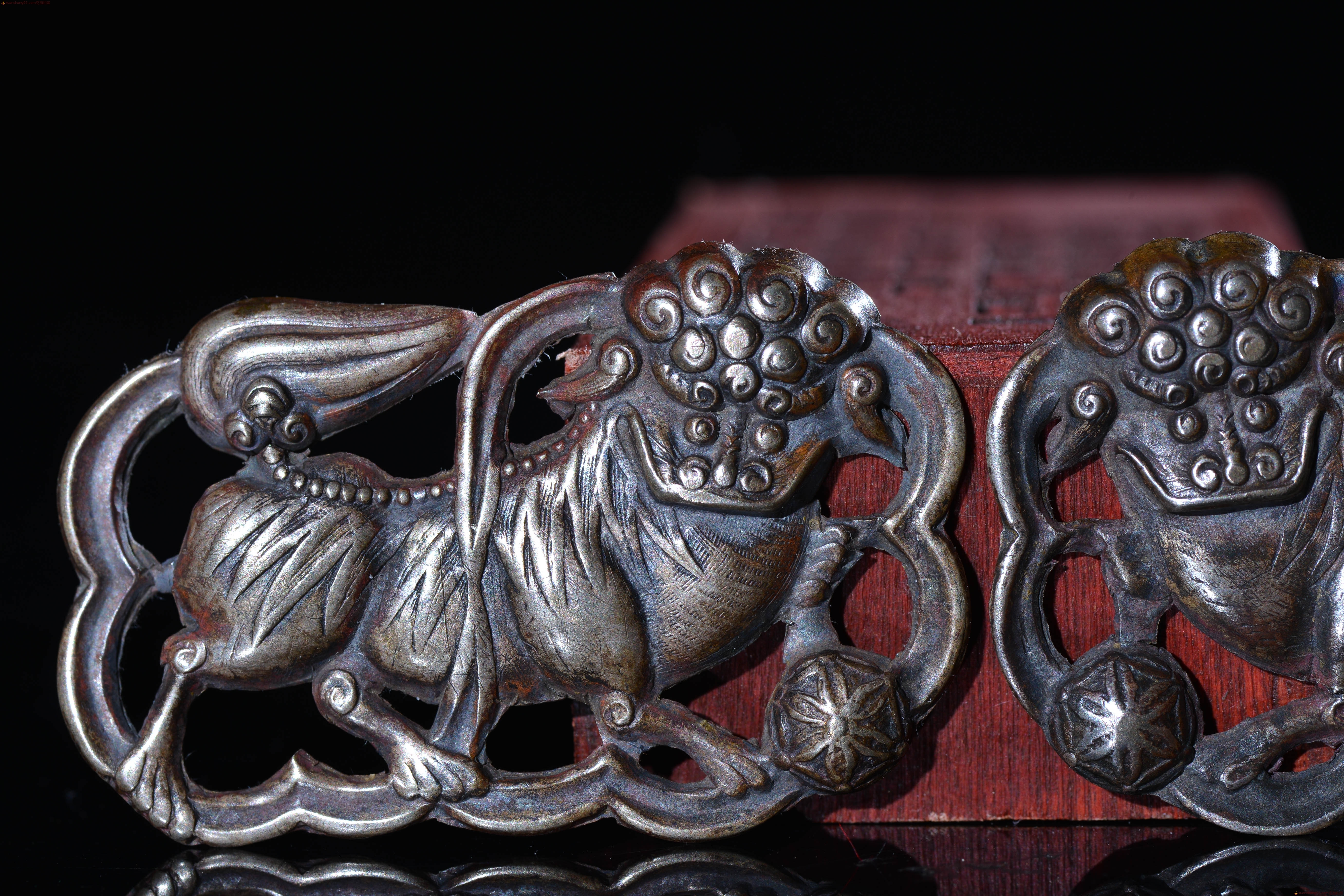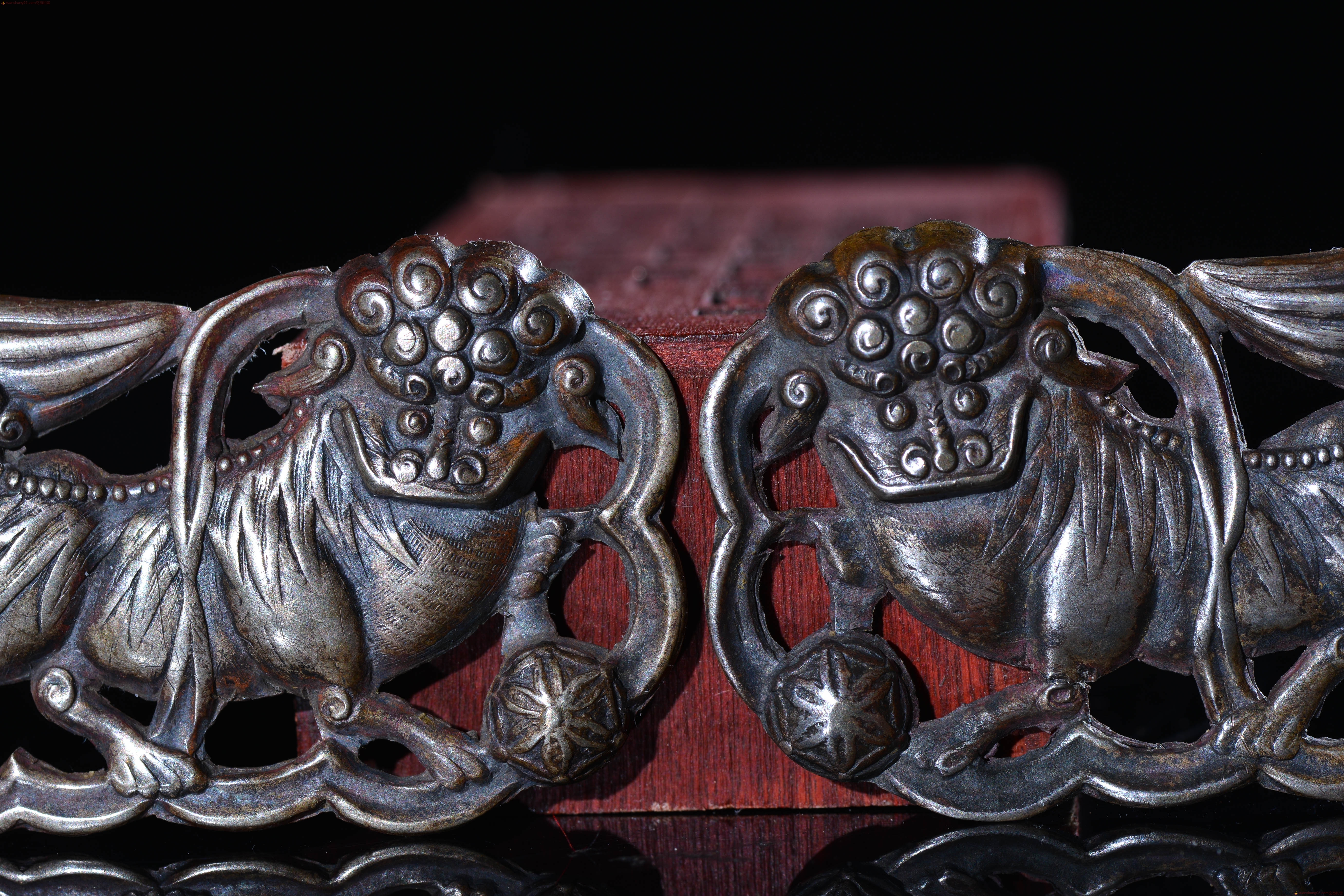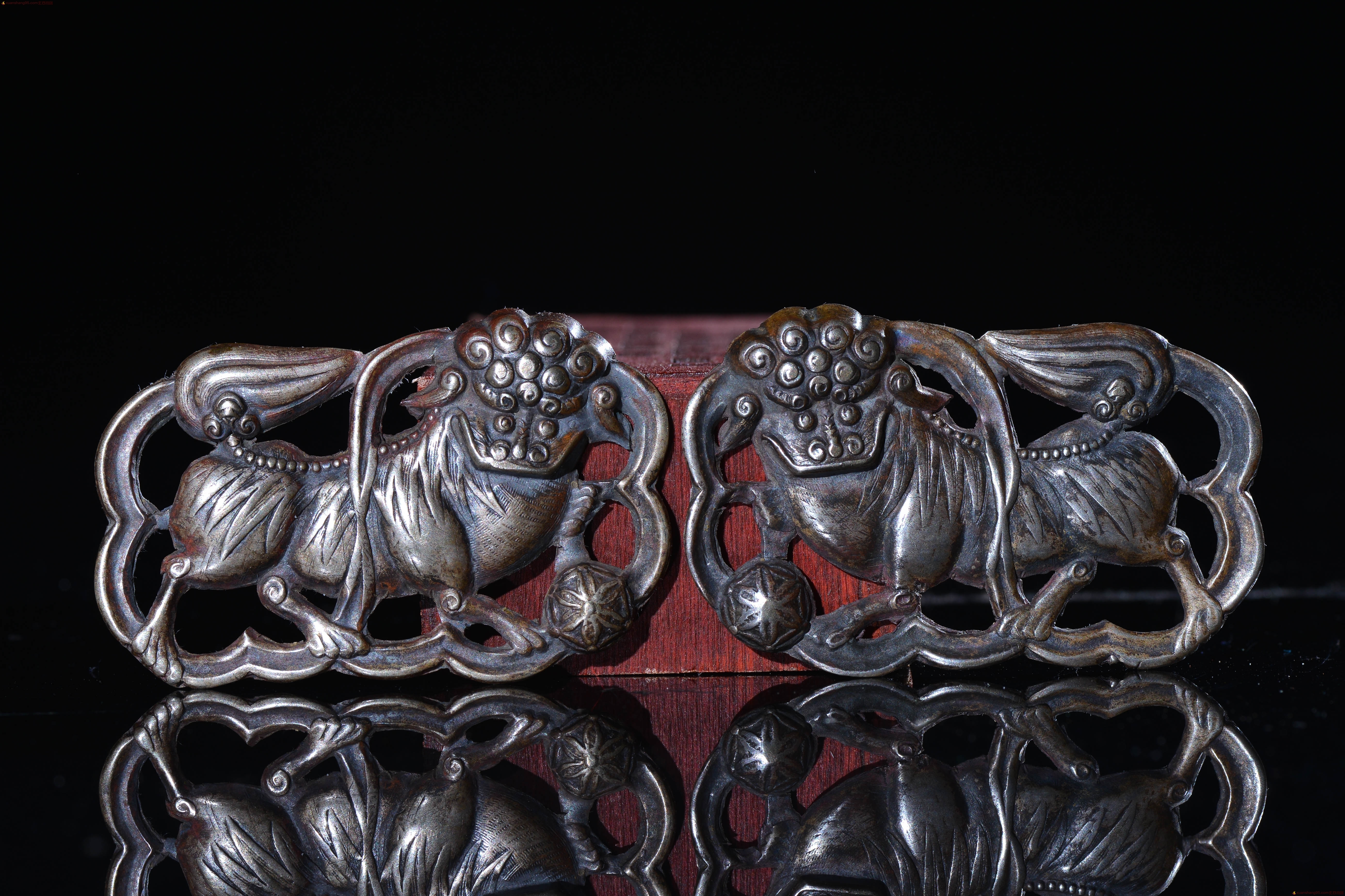 旧藏 纯银 狮子配饰 一对 做工精细 细节到位 活灵活现,品相较好,打开门,收藏佳品。取一尺寸长7厘米 宽3厘米 厚0.5厘米。