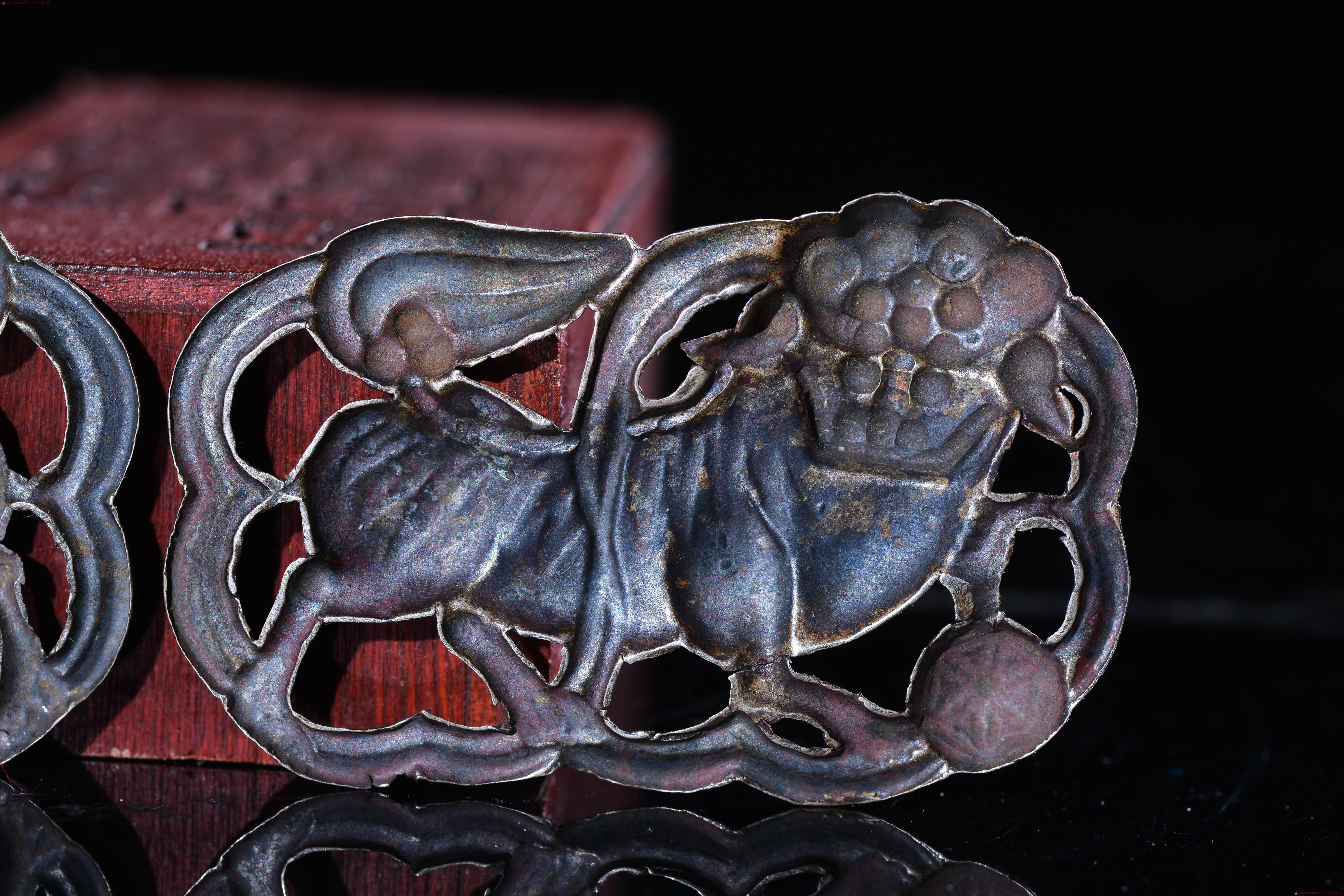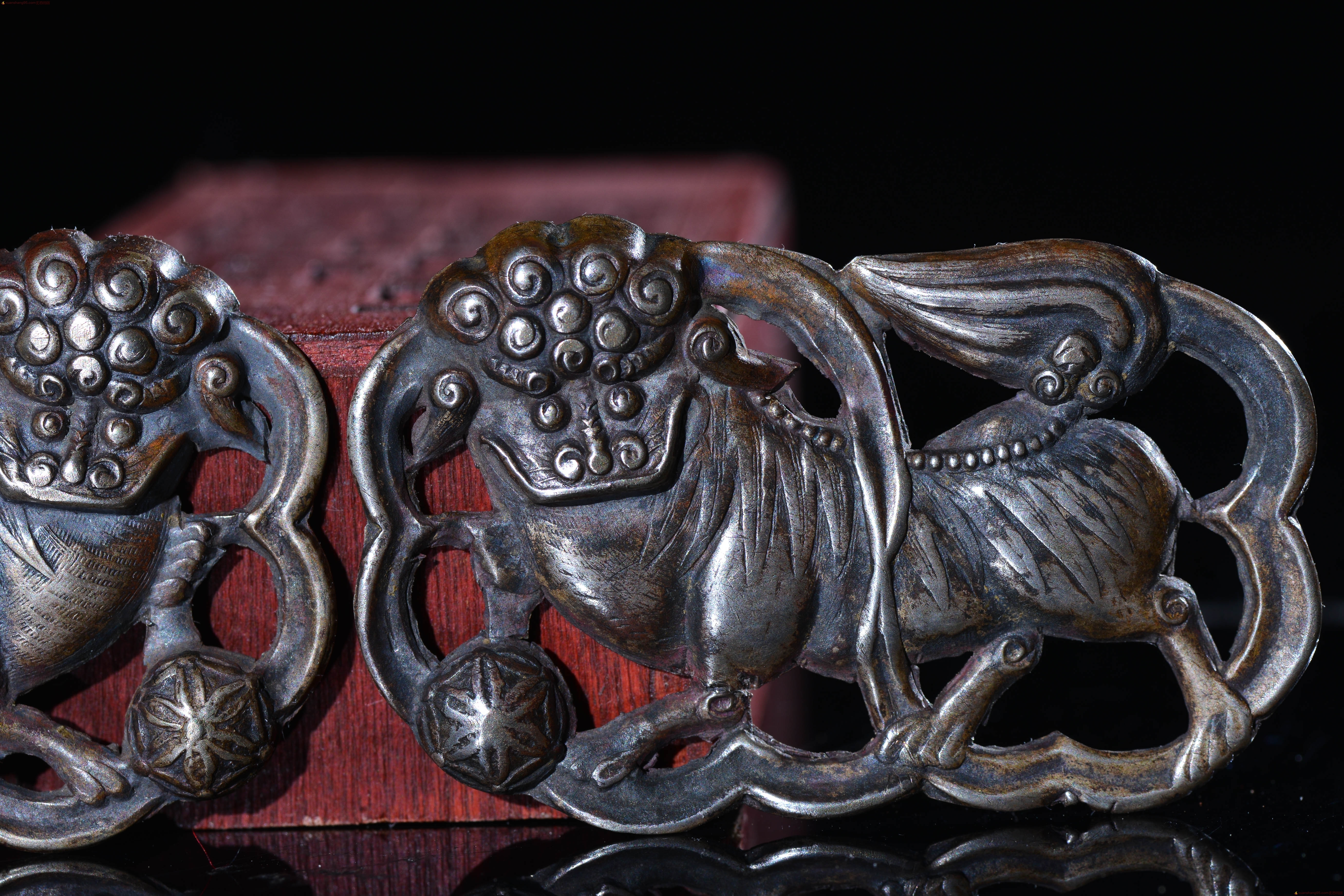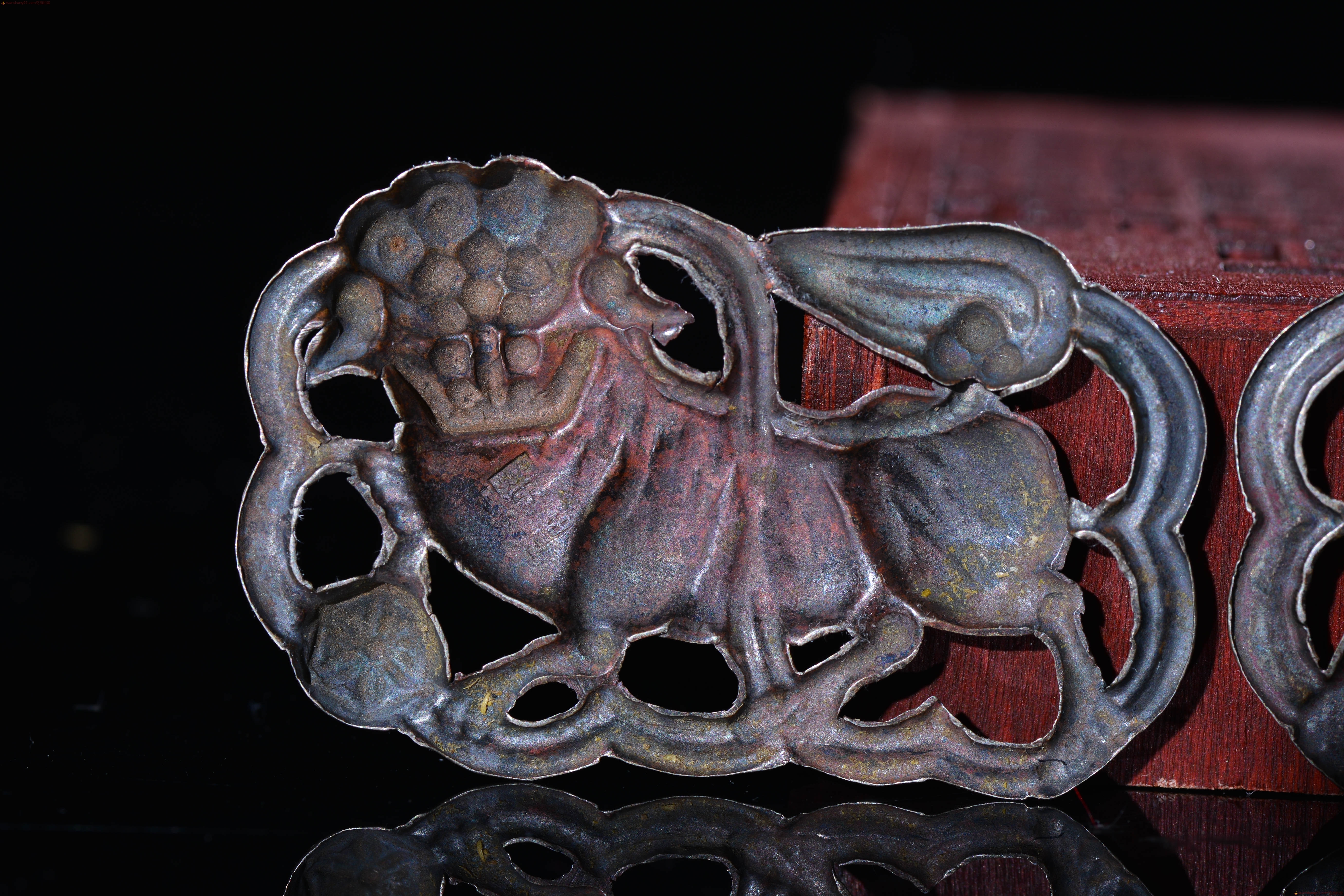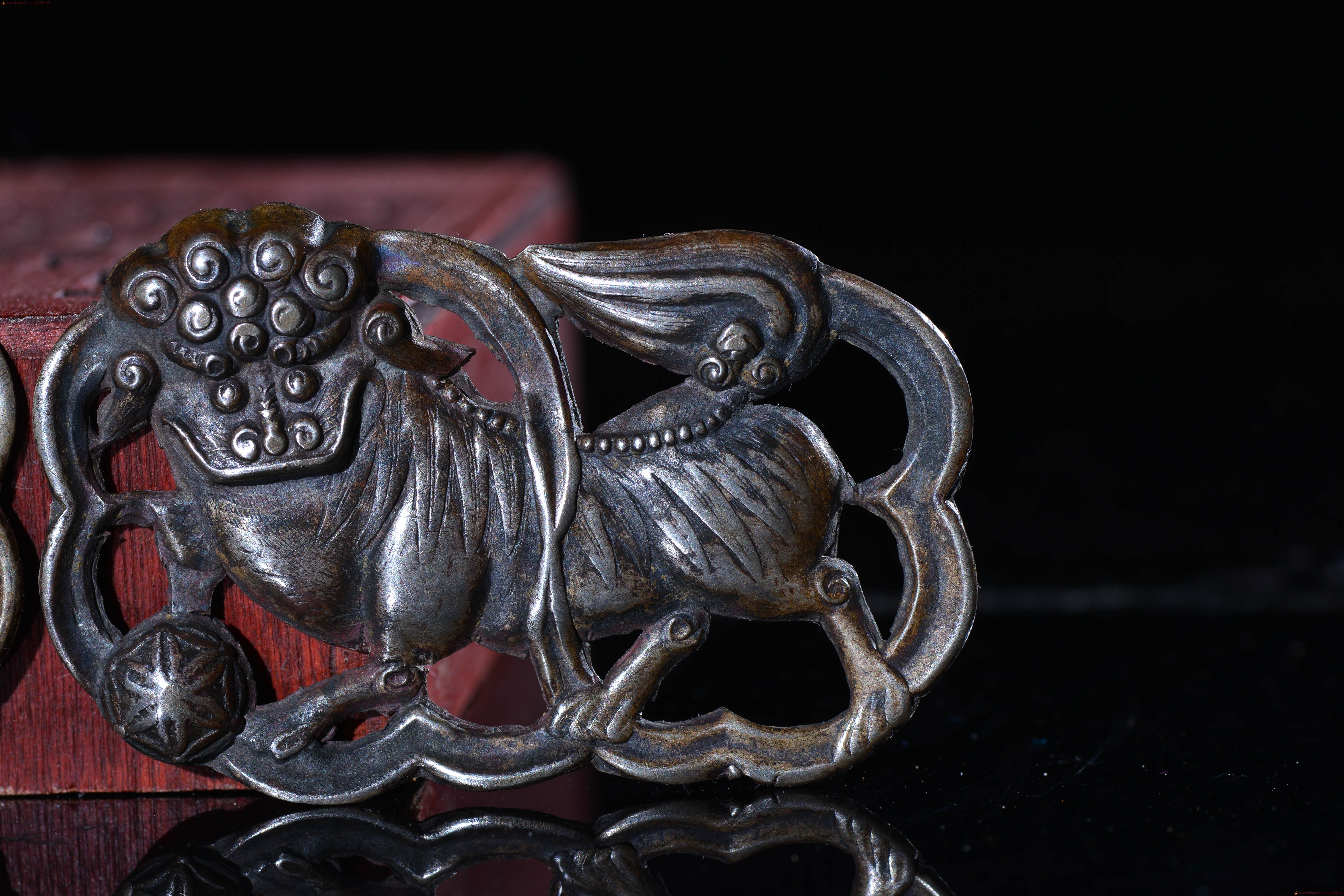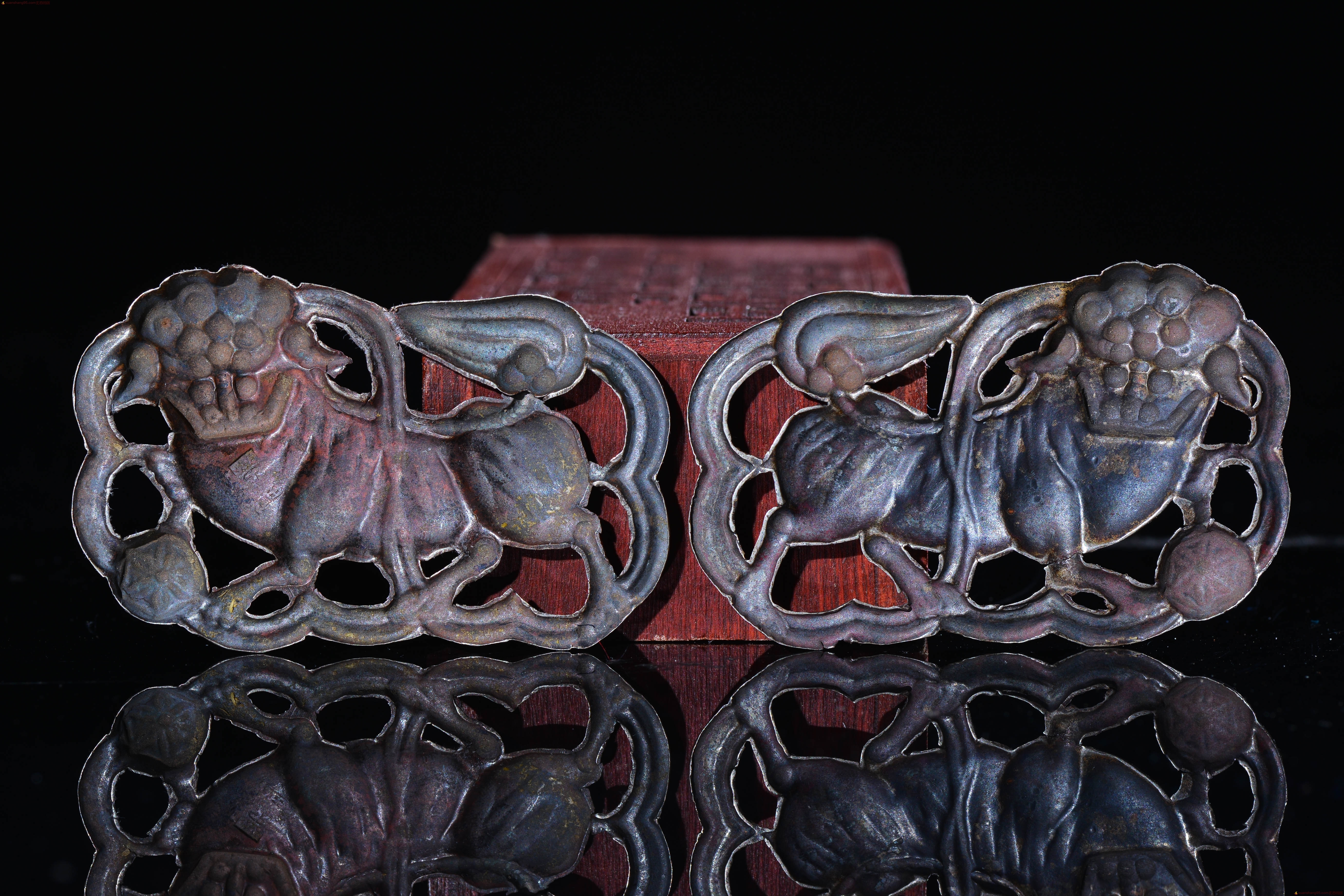 旧藏 纯银 狮子配饰 一对 做工精细 细节到位 活灵活现,品相较好,打开门,收藏佳品。取一尺寸长7厘米 宽3厘米 厚0.5厘米。
