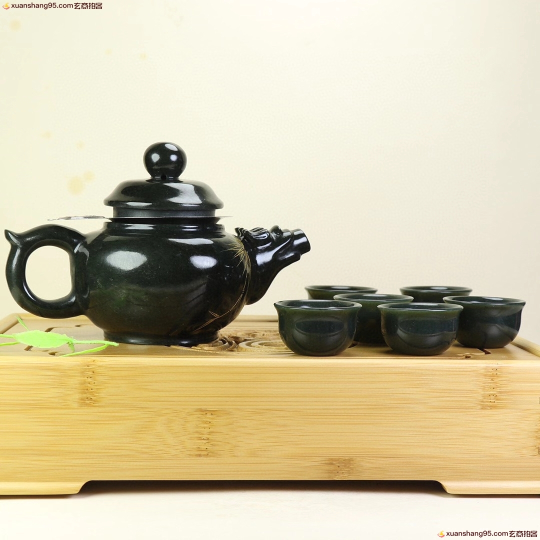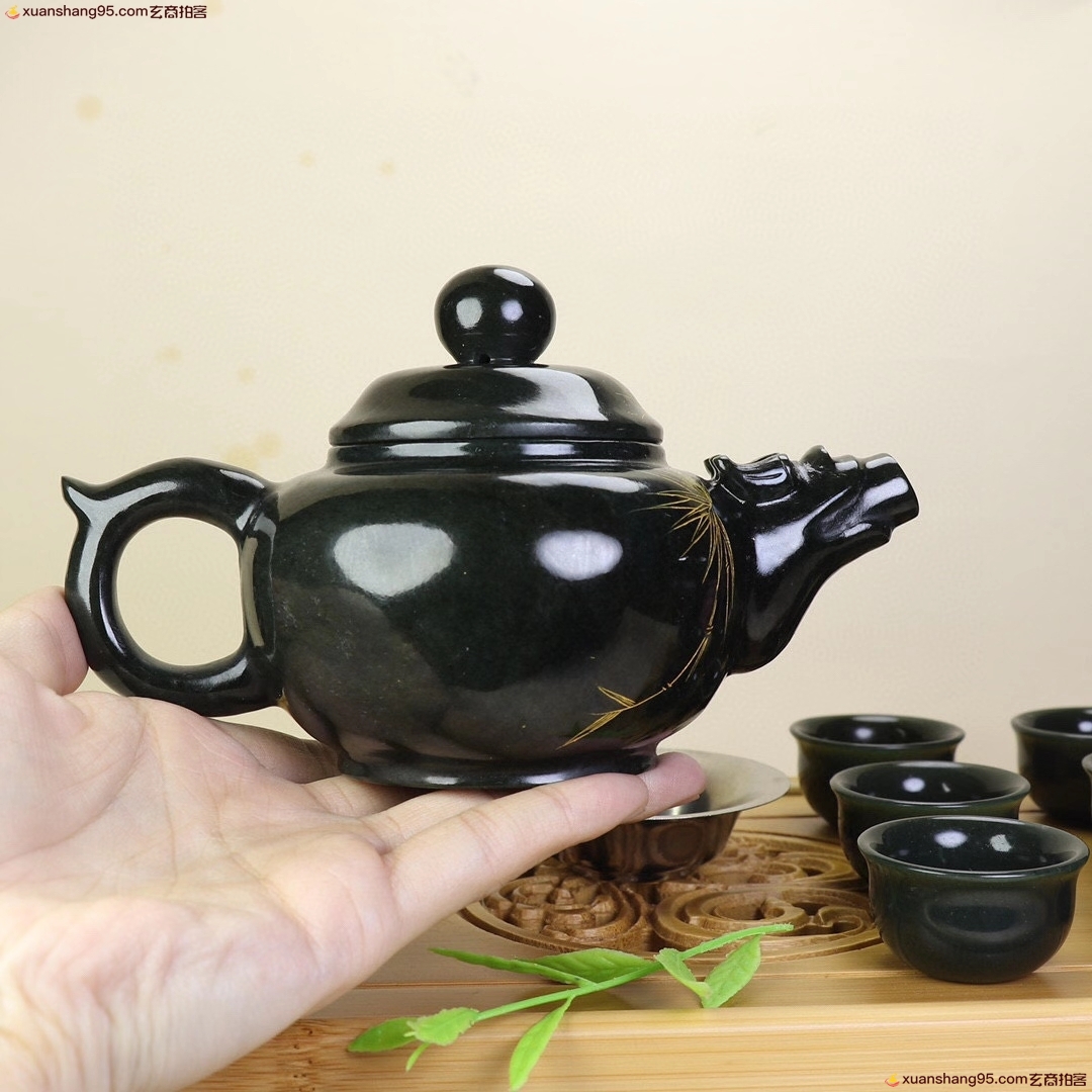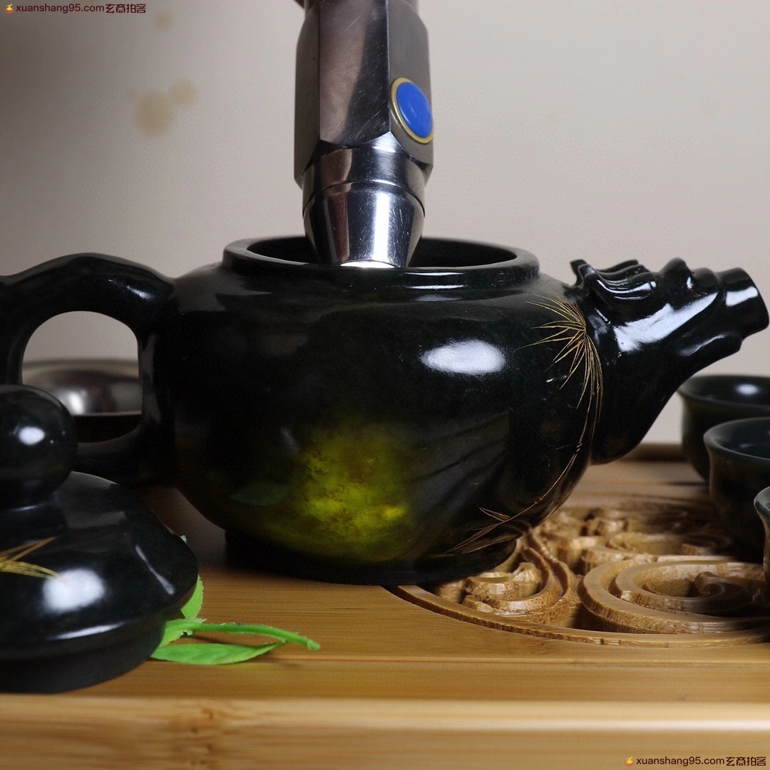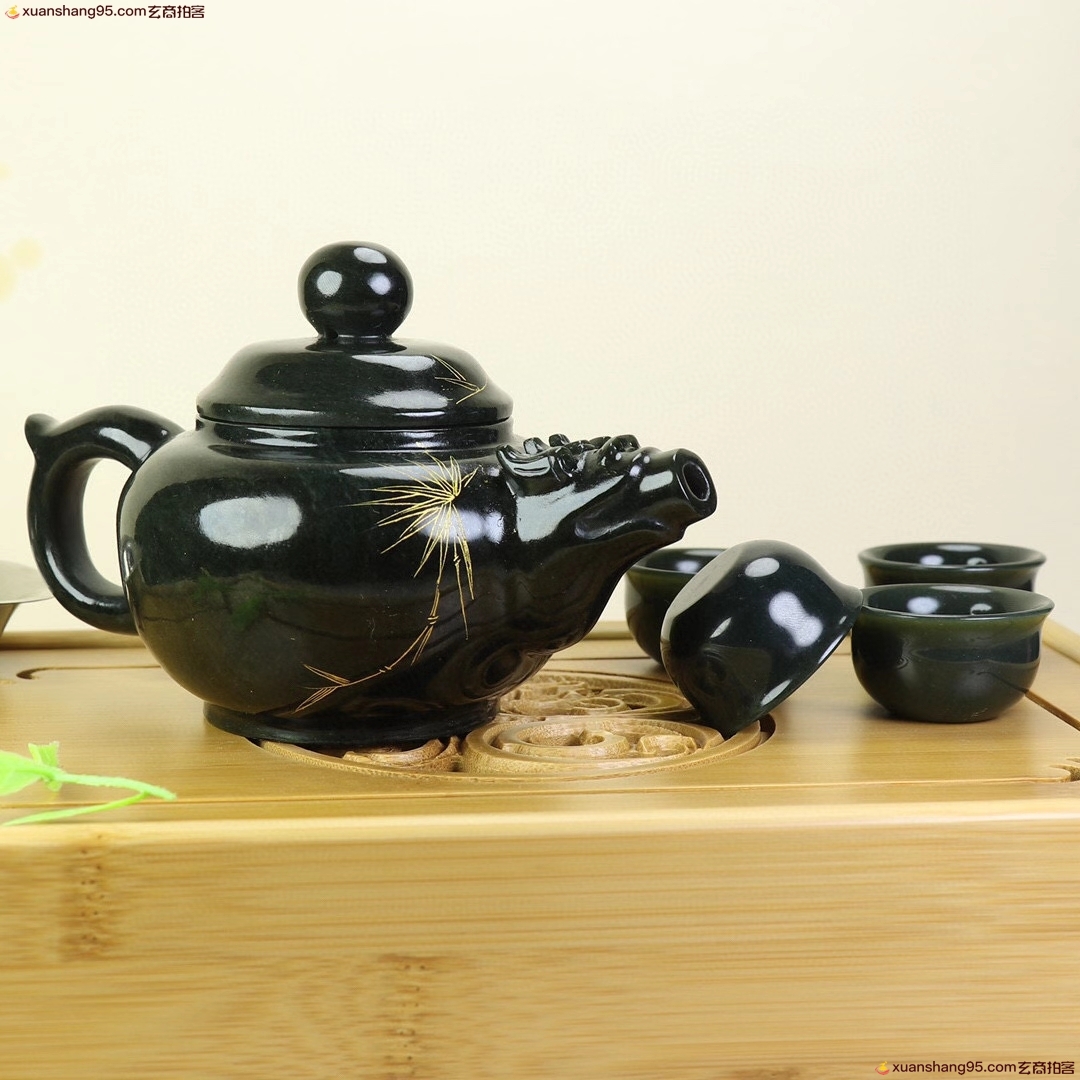 【吉祥如意.茶具套装】精品和田玉青 玉茶 壶茶碗 玉质莹润细腻,造型精致小巧 整器比例协调,灵动且曼妙,把执舒适有力,风格简约古朴,淋漓展现玉石之温、纯、柔、雅的品质,不经意间流露出返璞归真的那份优雅。闲暇之余随手把玩,细思慢品玉壶的古韵古香,仿佛已经泡好一壶新茶,清风徐来,赏杯中茶汤微漪。茶壶重321克 尺寸160-91.5-93mm 茶碗取一重27克 尺寸41-22mm。