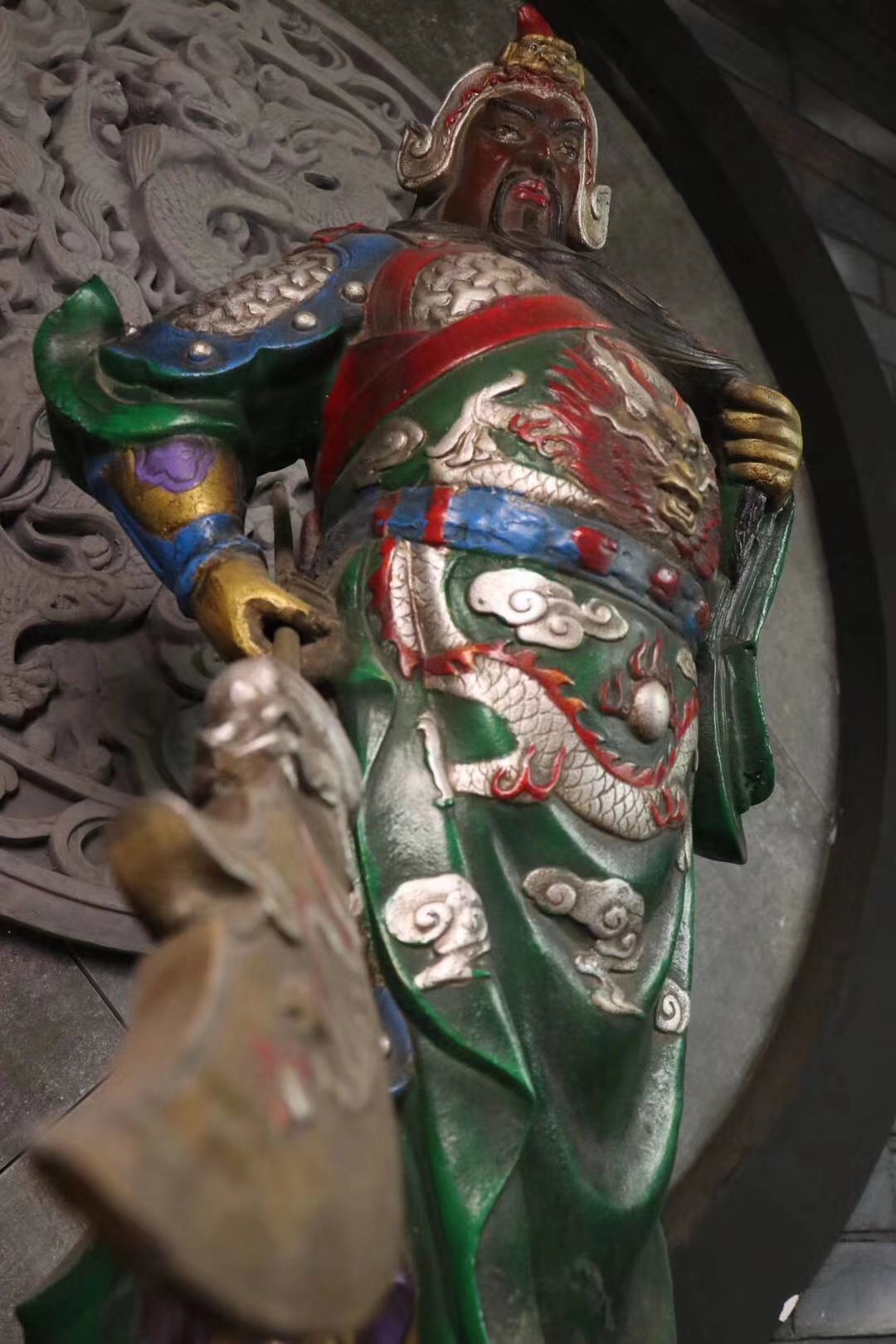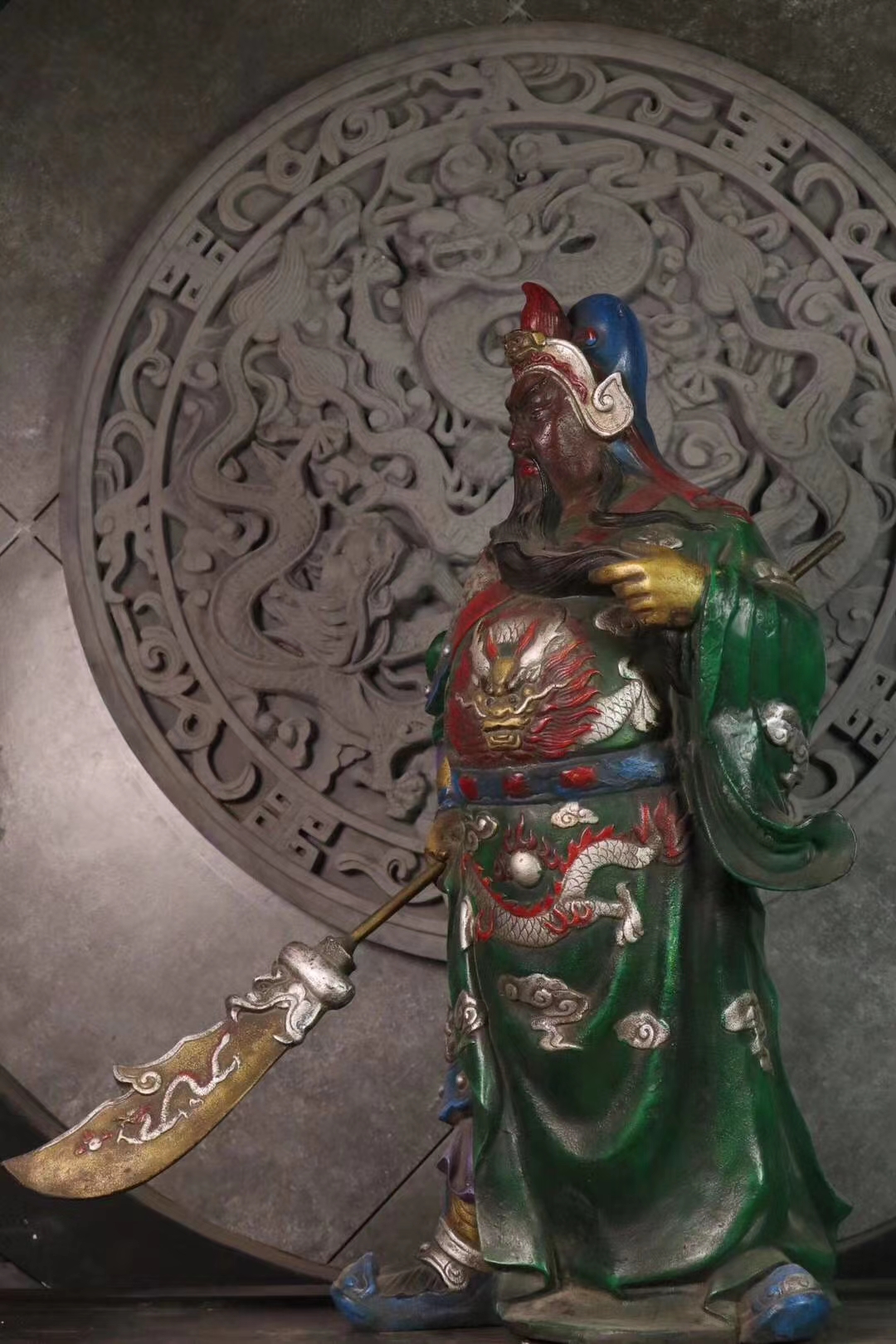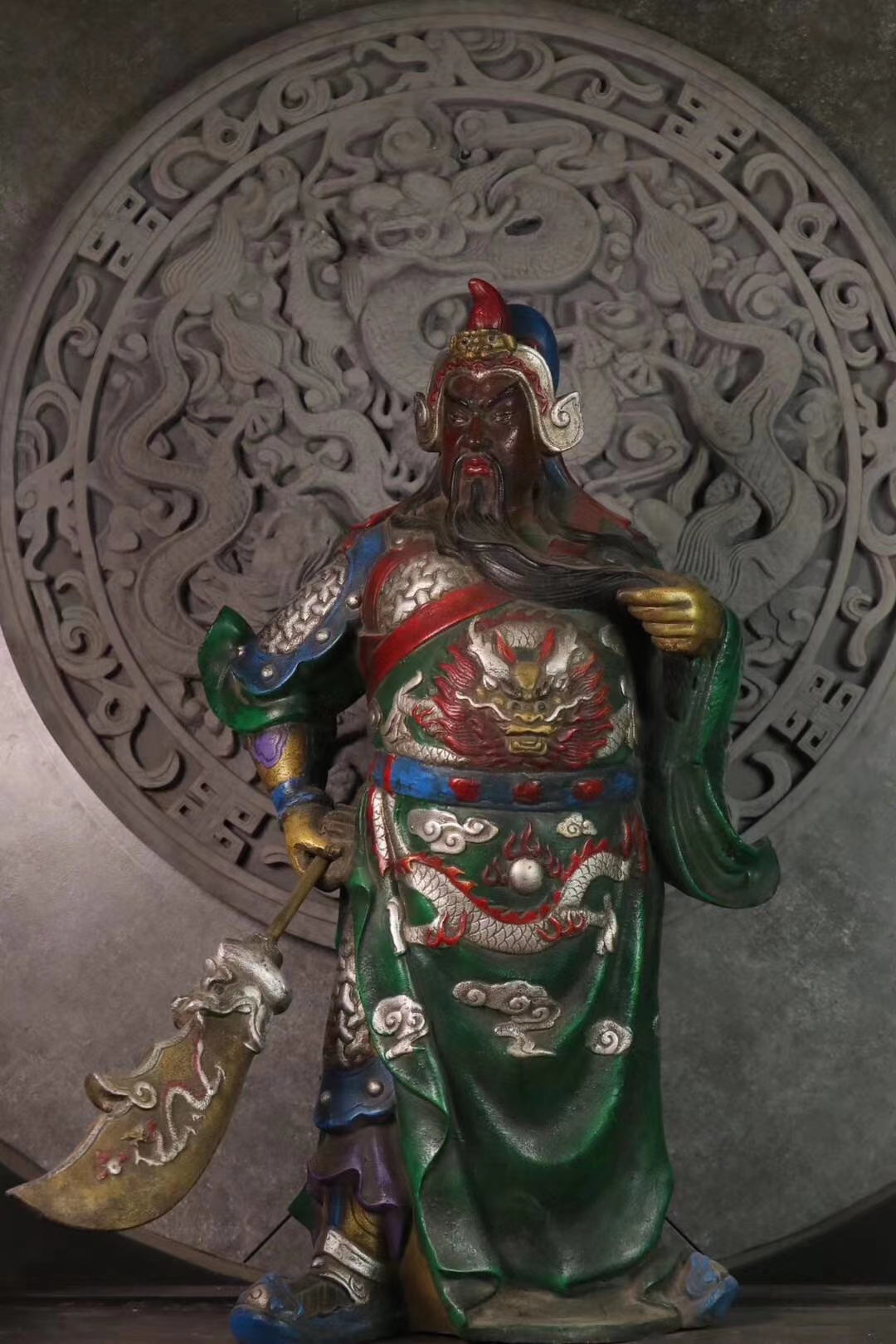 手绘描彩关 二爷一尊,武财神关二爷,铁制,武圣君关公凛然泰山定,旌旗招摇镇五军。武圣威仪,大义凛然,霸气十足。胡须飘飘,眼神微微。铠甲龙神以显,自然传神。家居供奉招财镇宅摆件。尺寸:58×40厘米,重:40多斤。
