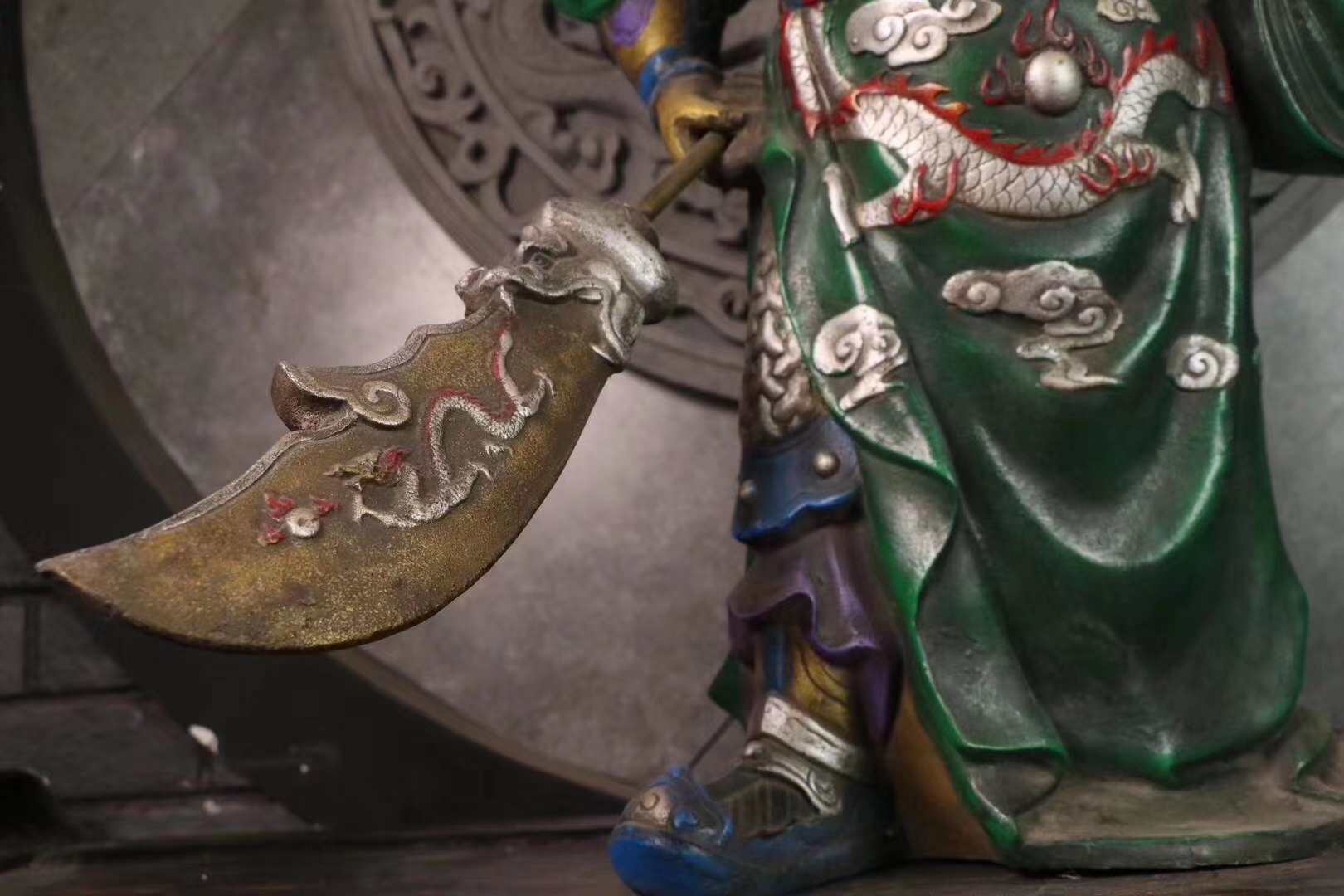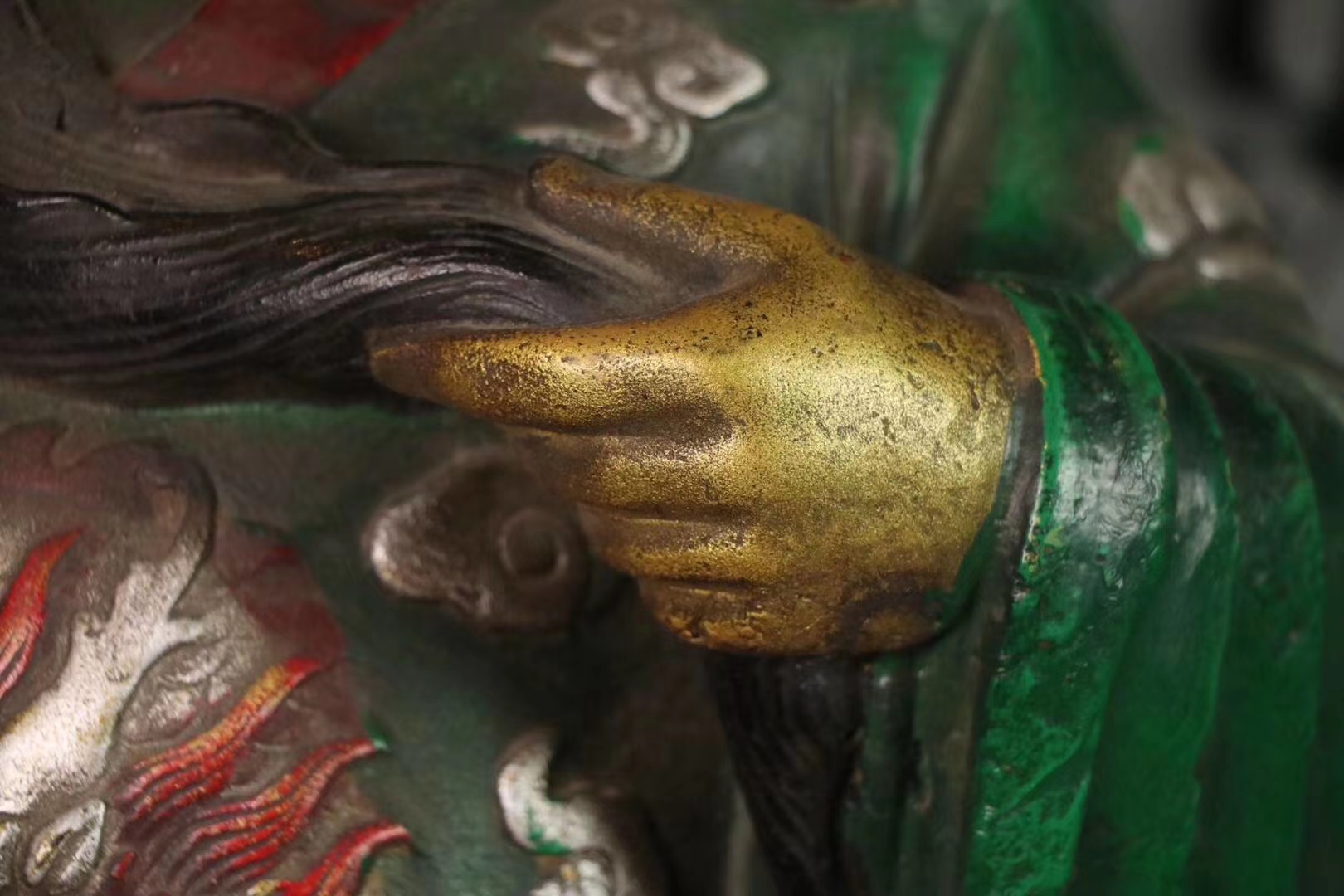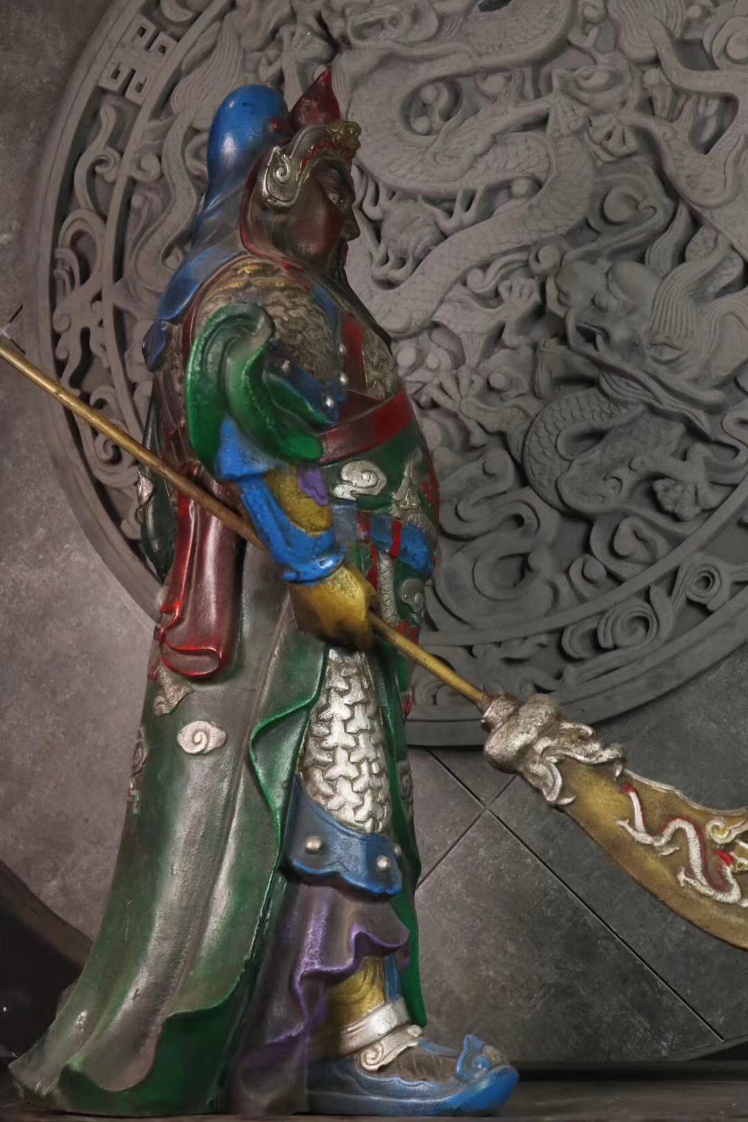 手绘描彩关 二爷一尊,武财神关二爷,铁制,武圣君关公凛然泰山定,旌旗招摇镇五军。武圣威仪,大义凛然,霸气十足。胡须飘飘,眼神微微。铠甲龙神以显,自然传神。家居供奉招财镇宅摆件。尺寸:58×40厘米,重:40多斤。